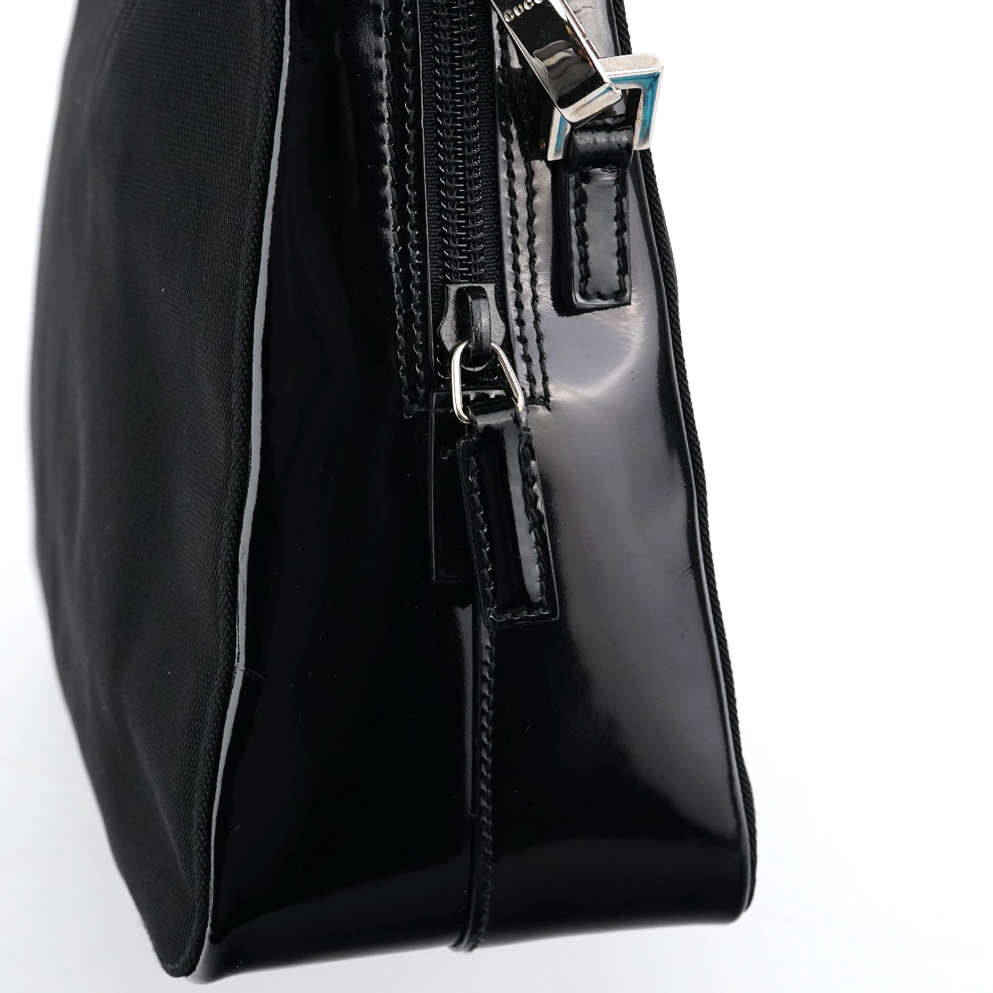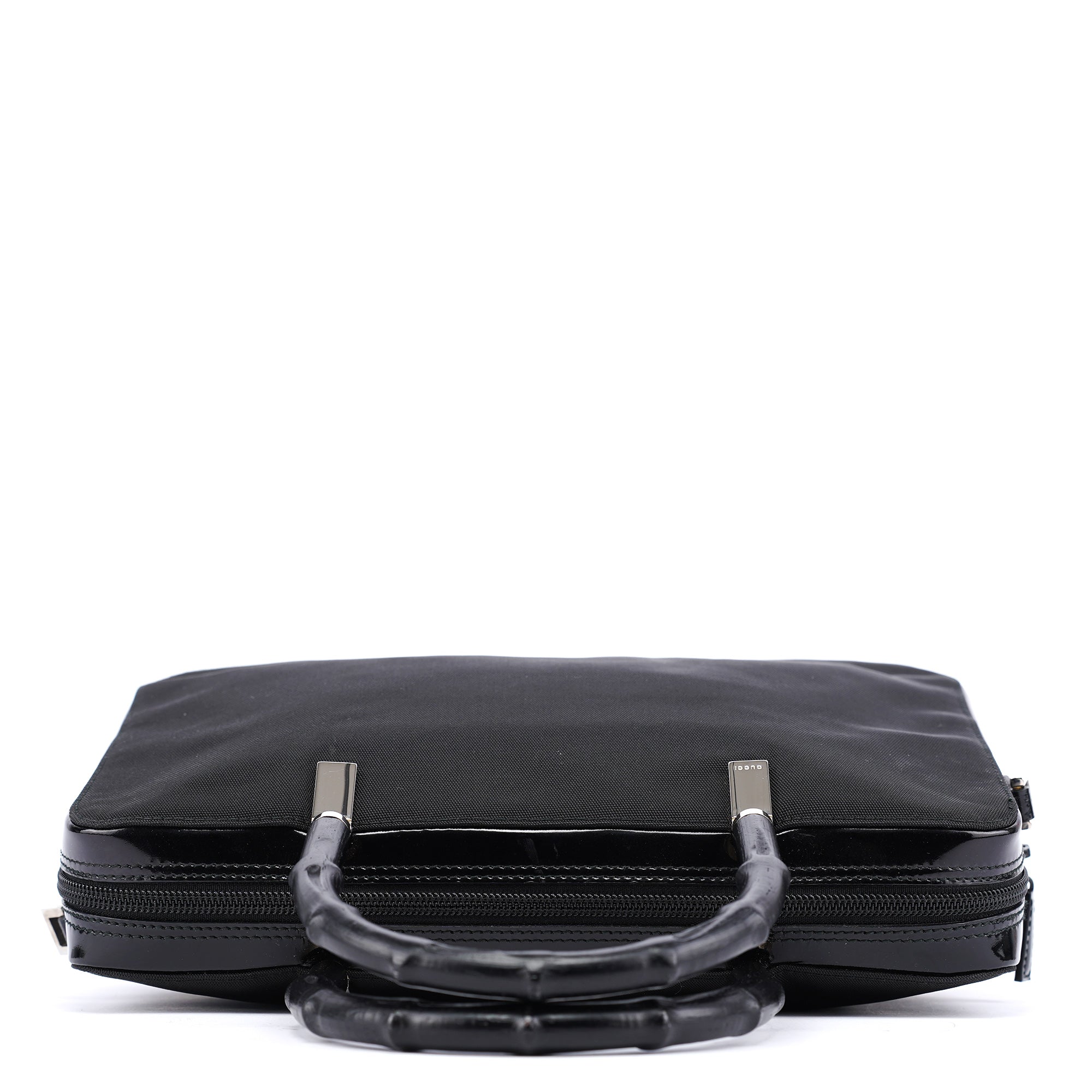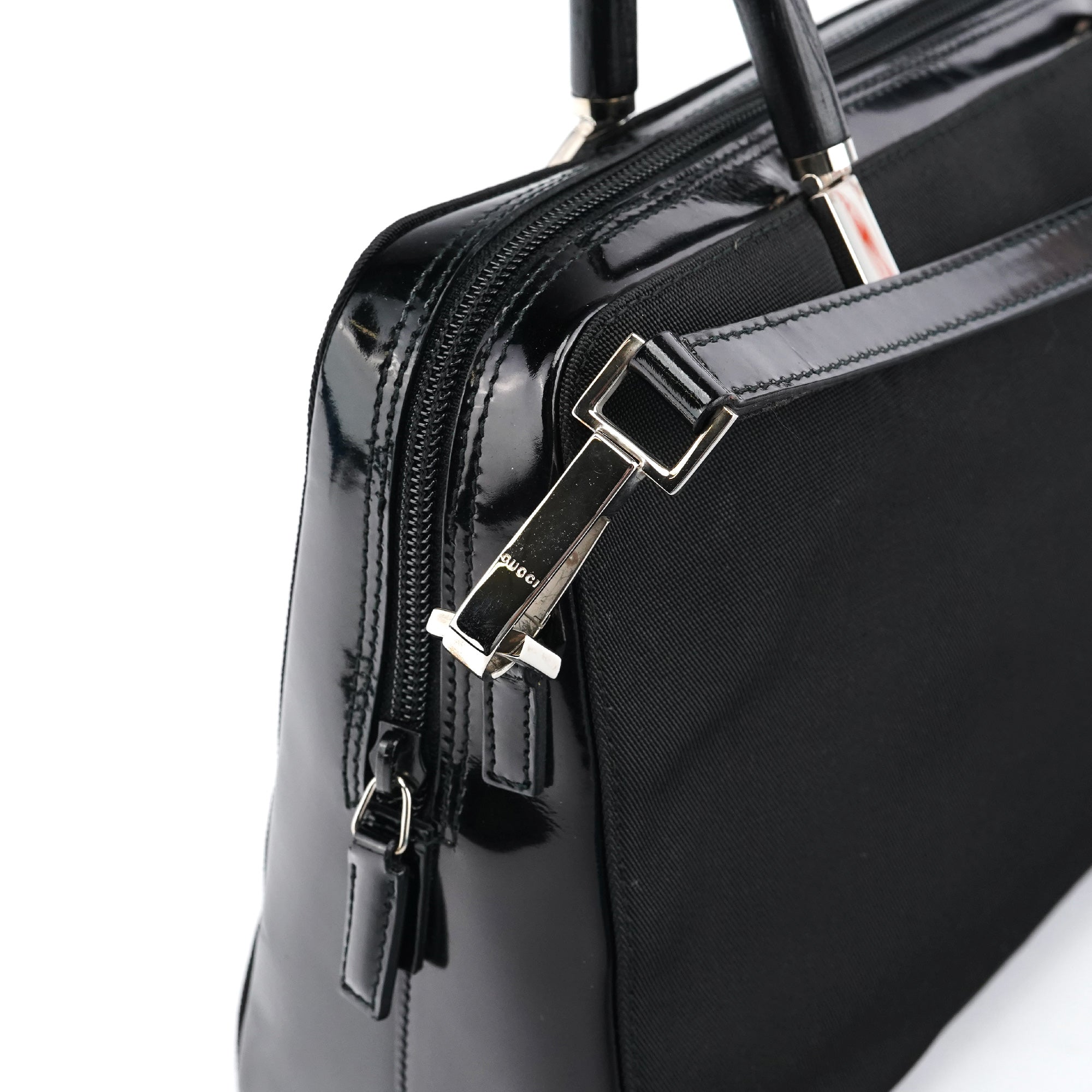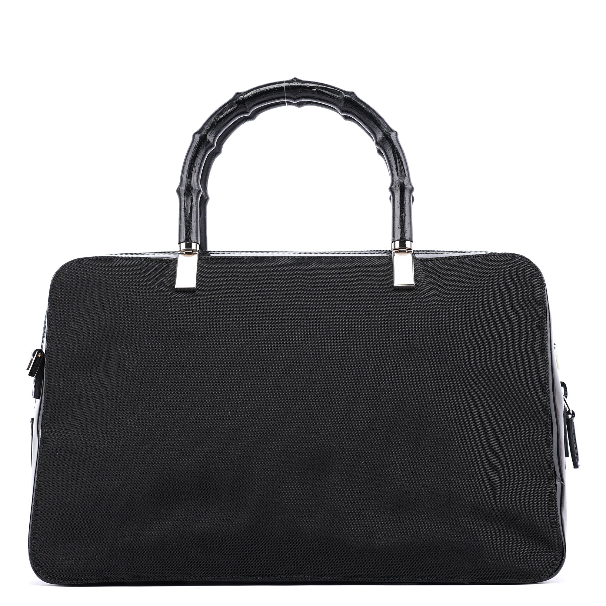 Designed in the late 1990's, this vintage Gucci Bamboo 2-way bag features black canvas with patent leather trim and iconic bamboo handles. The structured tote silhouette includes dual bamboo top handles with leather accents, a removable shoulder strap for versatile carry, and a zip-top closure with inner pocket. The nylon-lined interior offers practical storage for everyday essentials.