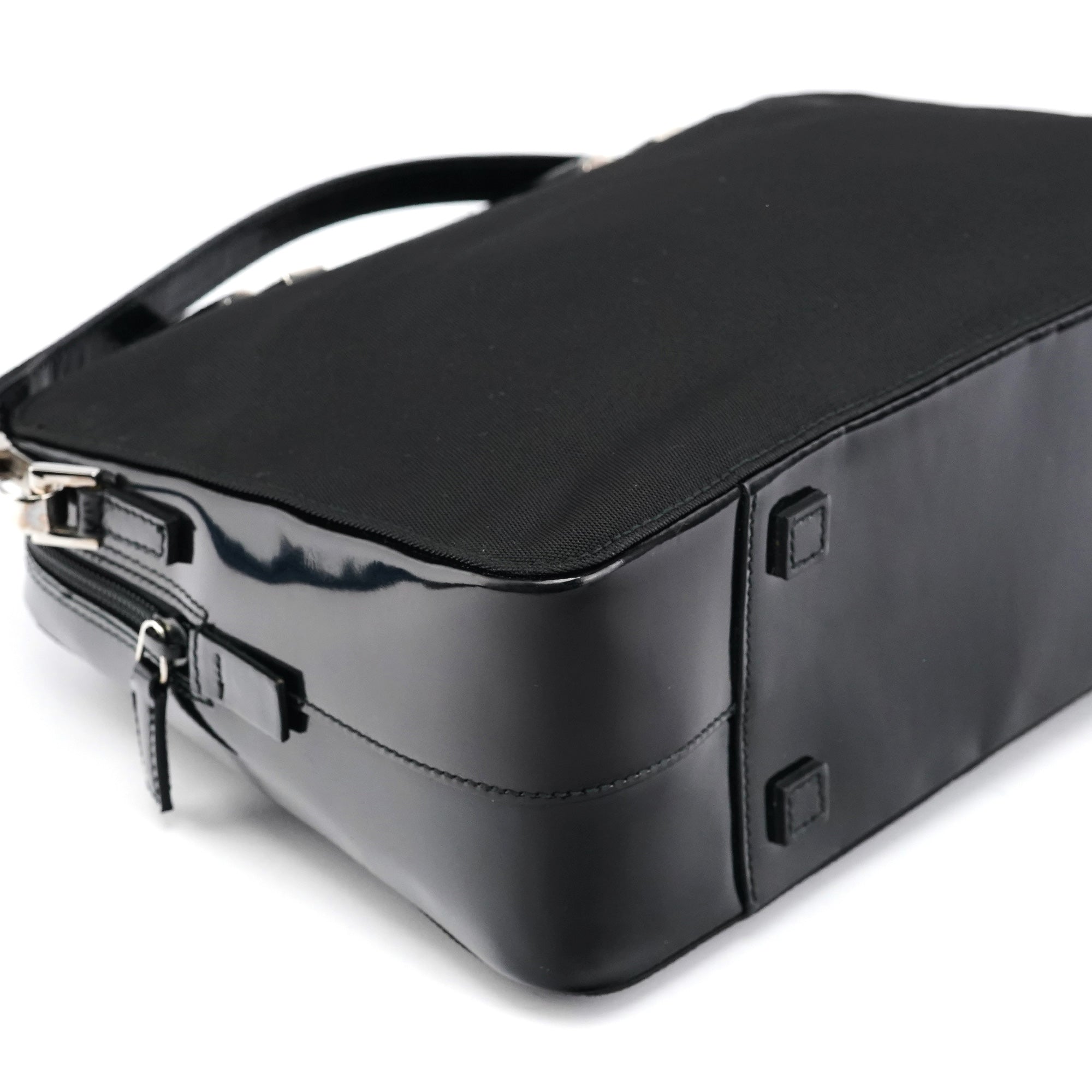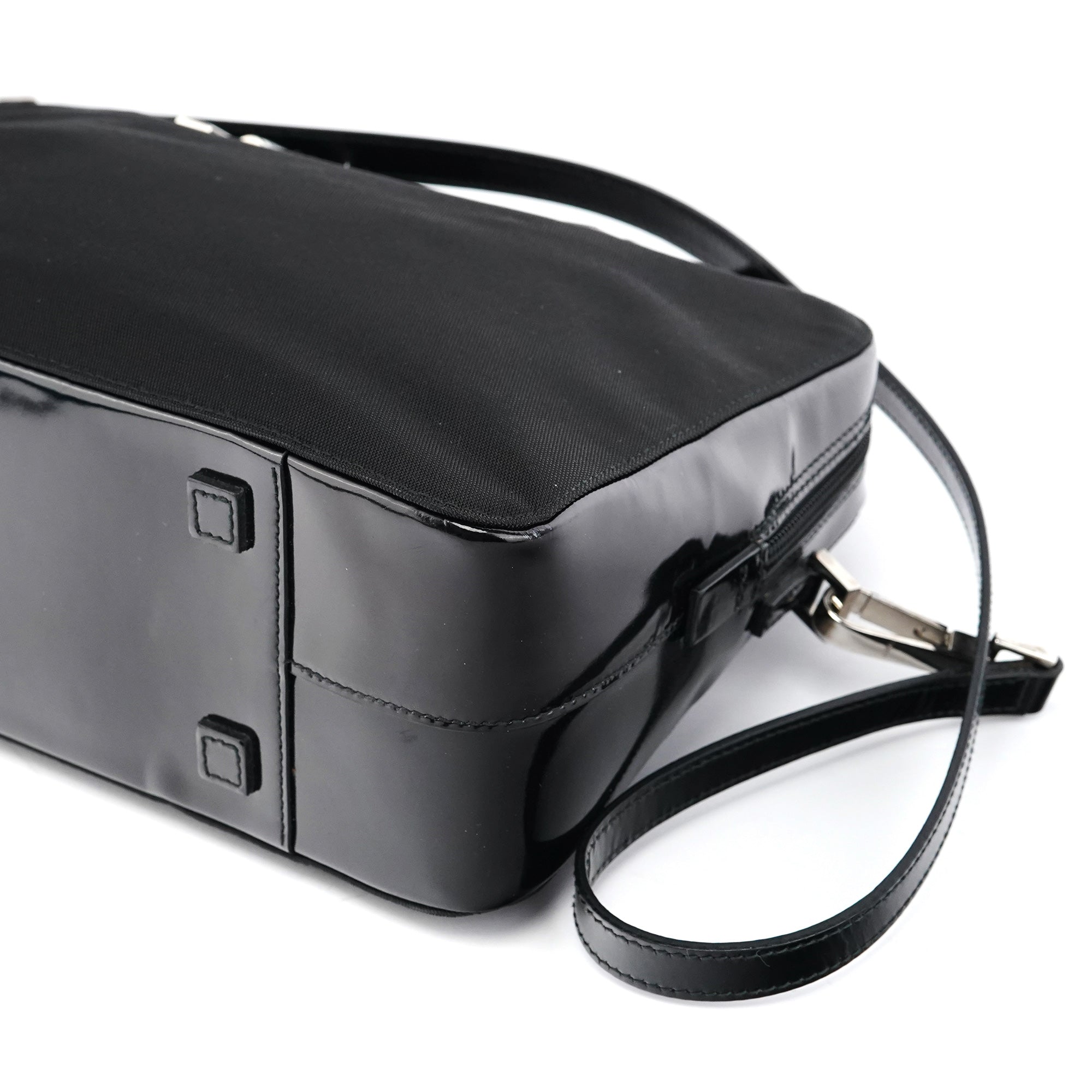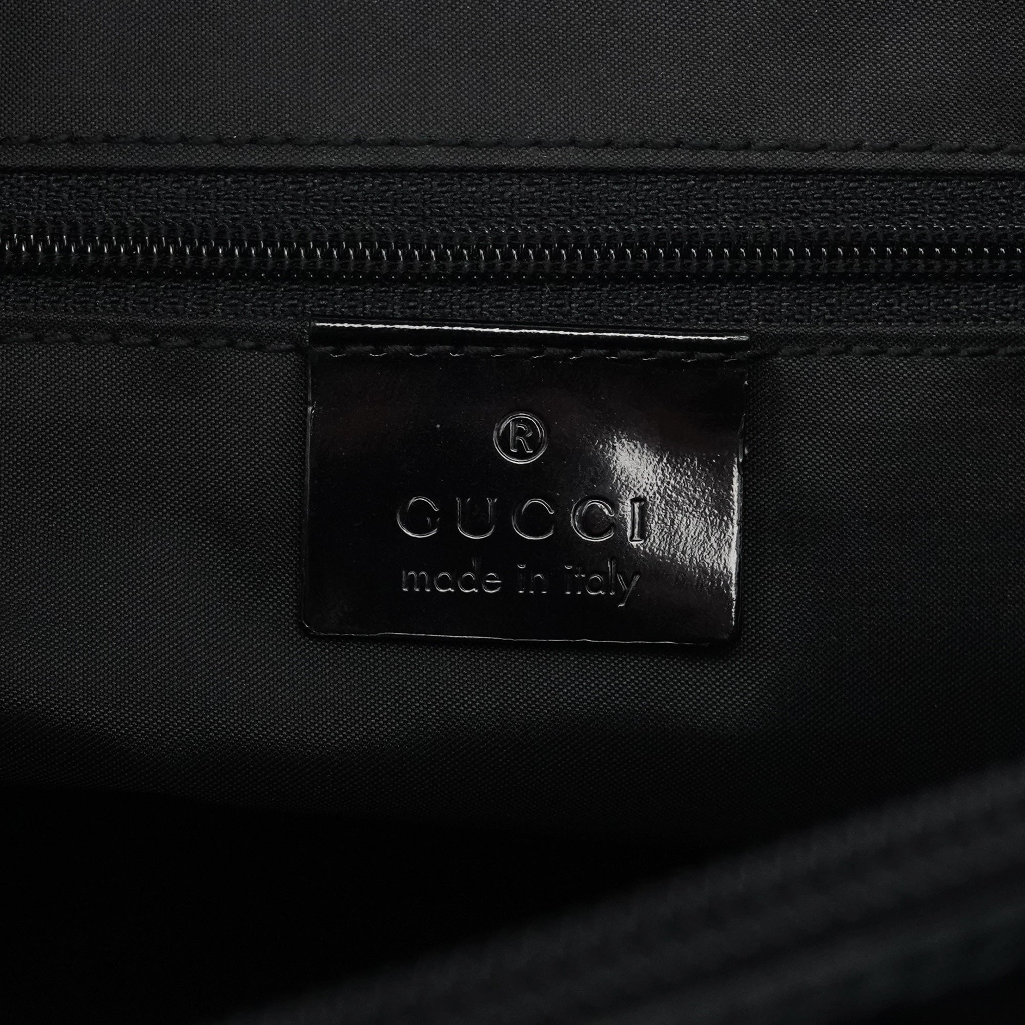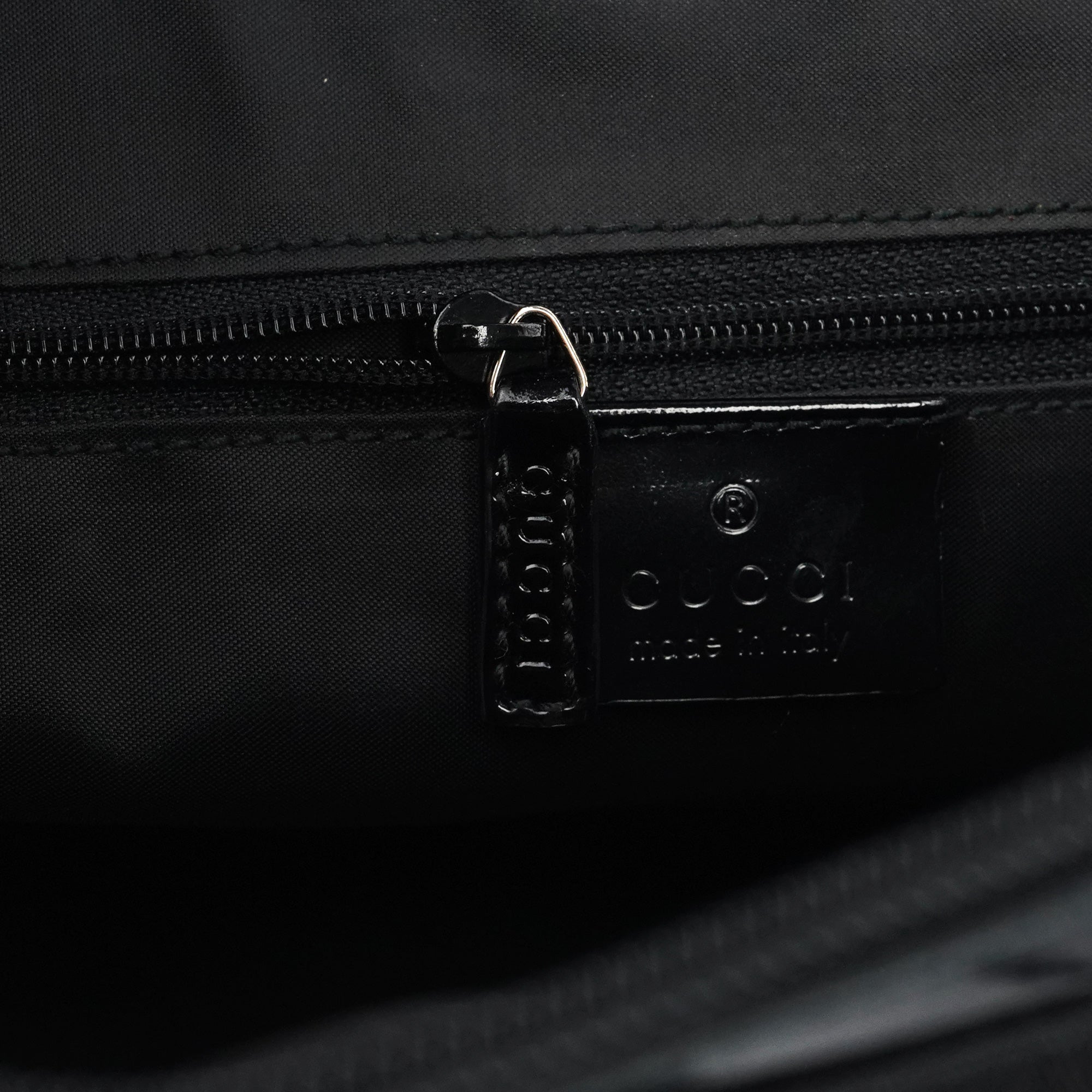 Designed in the late 1990's, this vintage Gucci Bamboo 2-way bag features black canvas with patent leather trim and iconic bamboo handles. The structured tote silhouette includes dual bamboo top handles with leather accents, a removable shoulder strap for versatile carry, and a zip-top closure with inner pocket. The nylon-lined interior offers practical storage for everyday essentials.