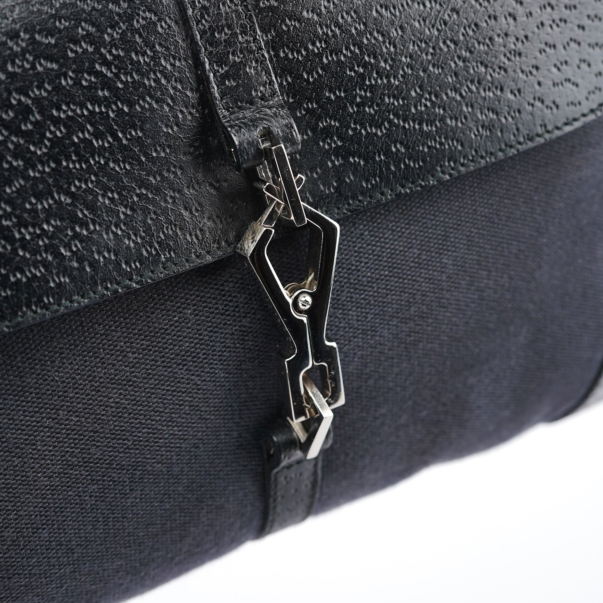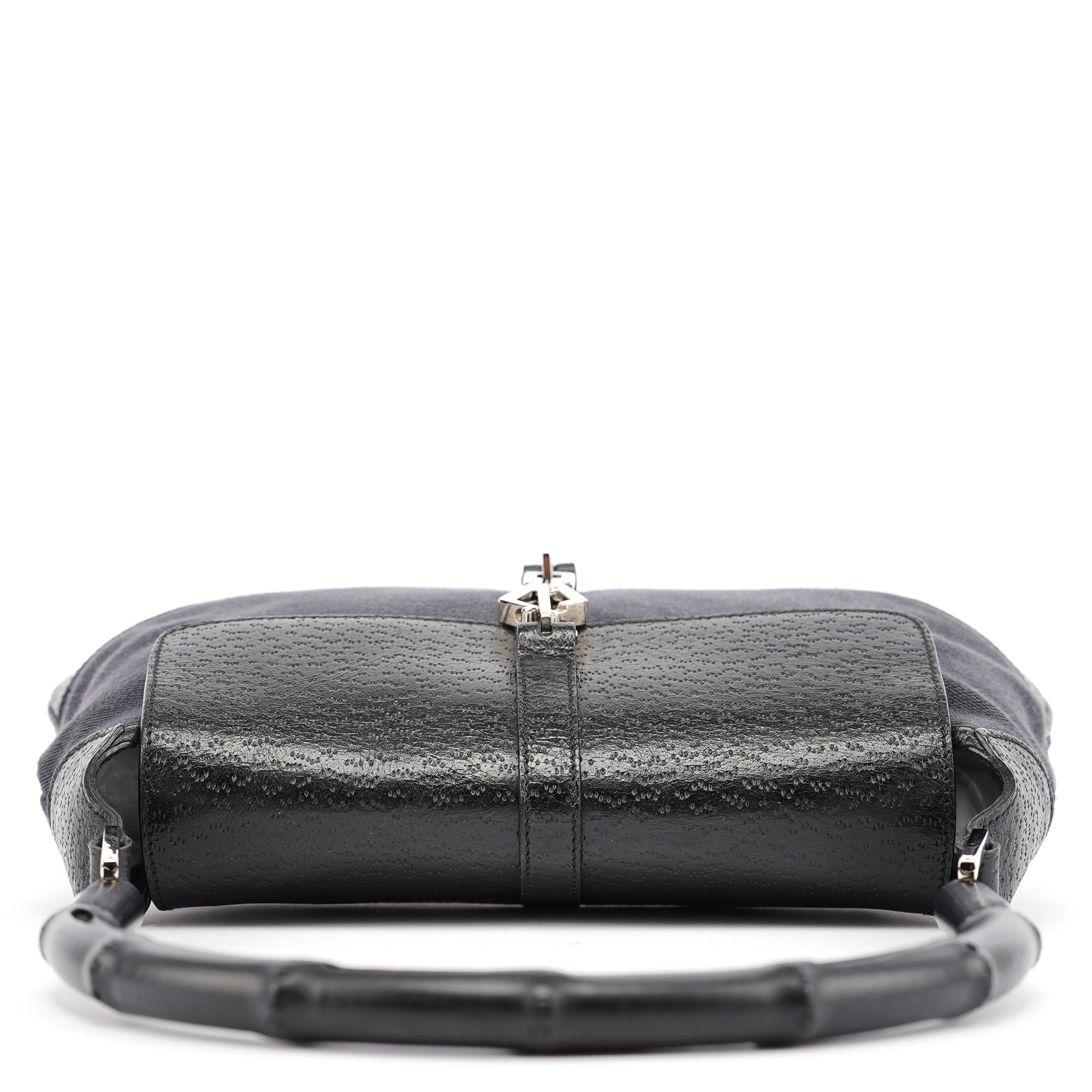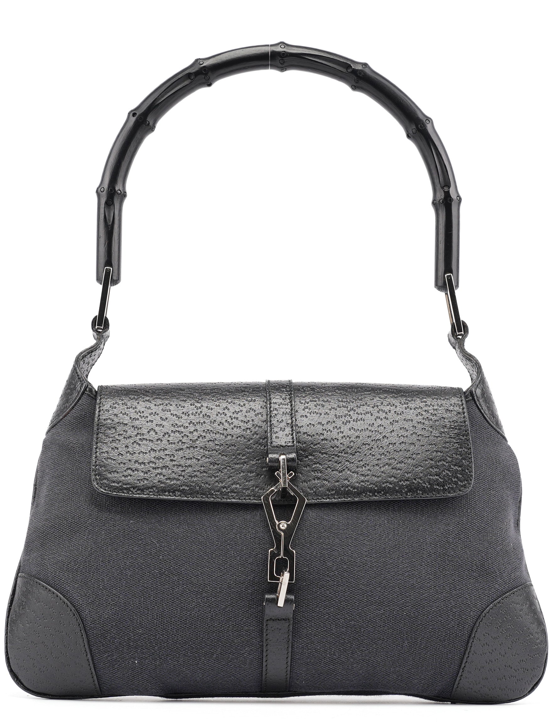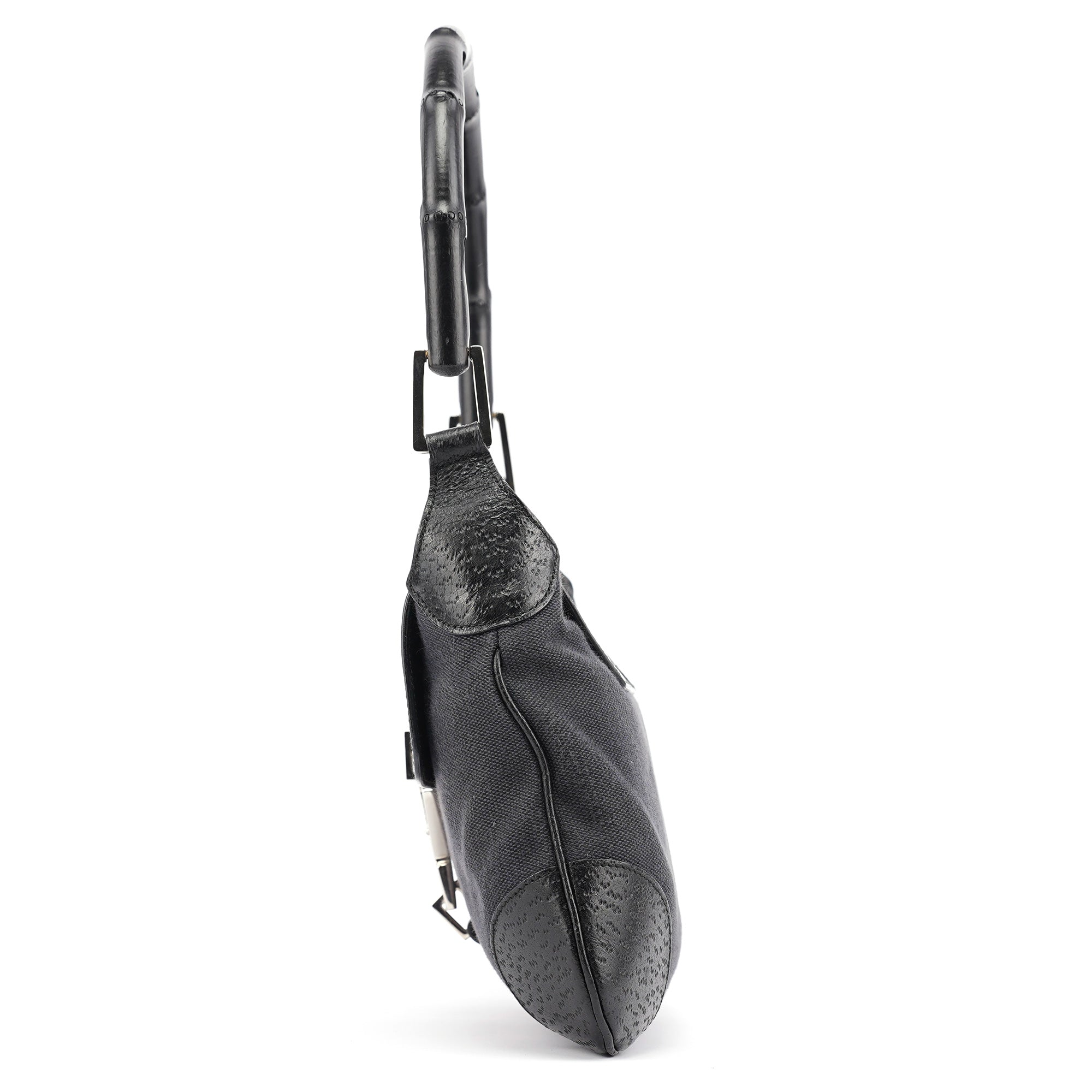 Designed in the early 2000s by Tom Ford, this vintage Gucci Jackie Bamboo shoulder bag combines black canvas with leather trim and the house's signature bamboo handle detail. The classic hobo silhouette features the iconic Jackie hardware with silver-tone piston closure and an adjustable shoulder strap for comfortable wear.