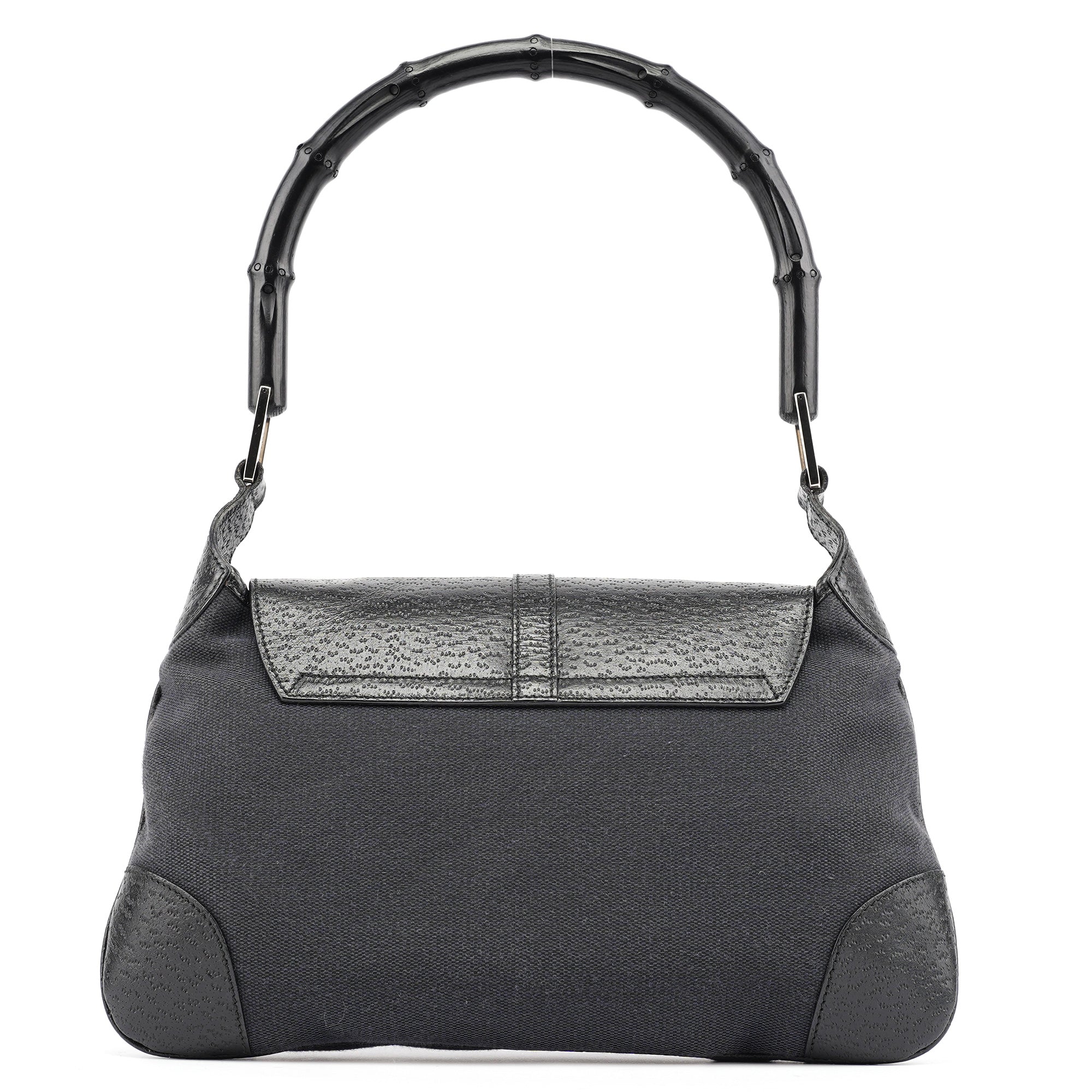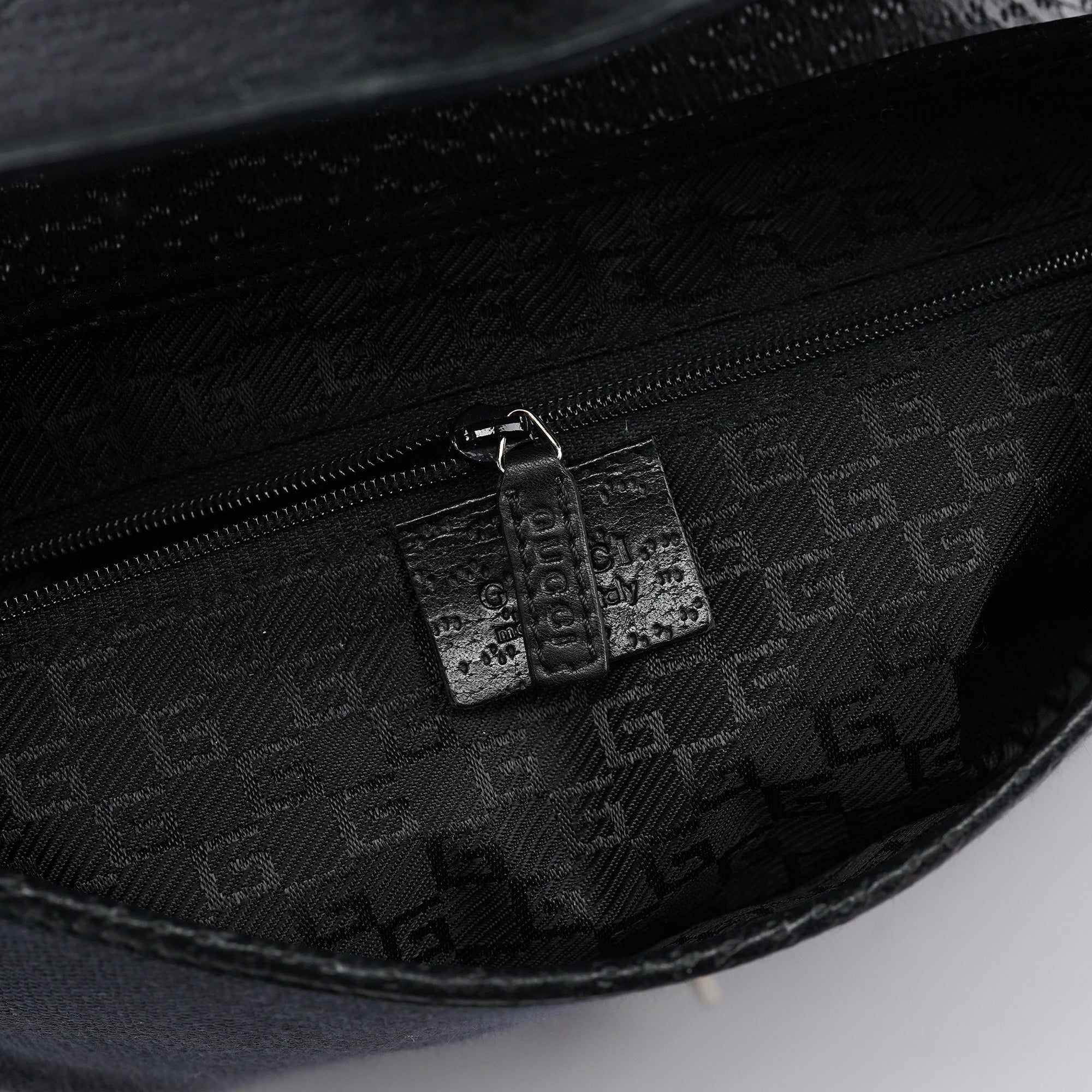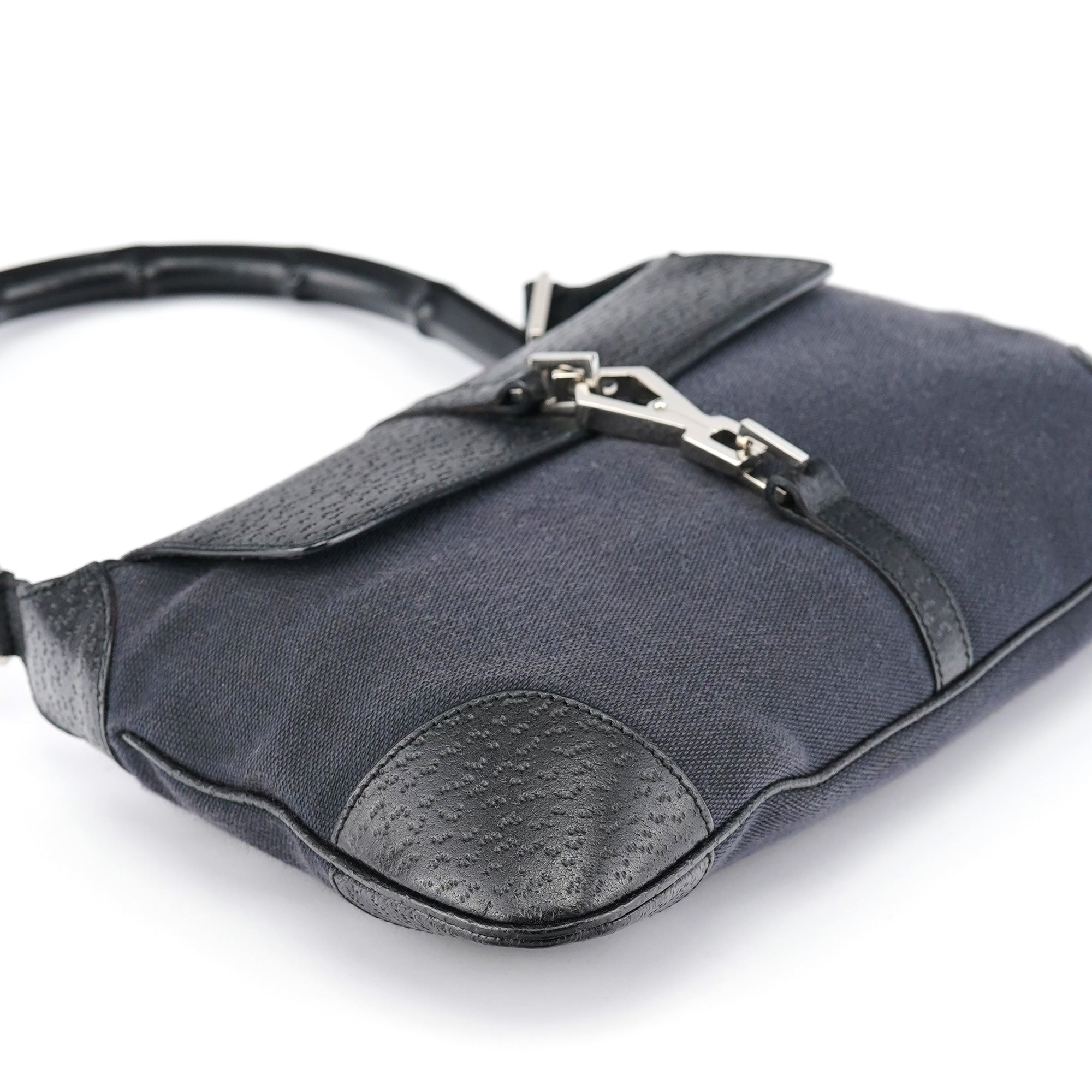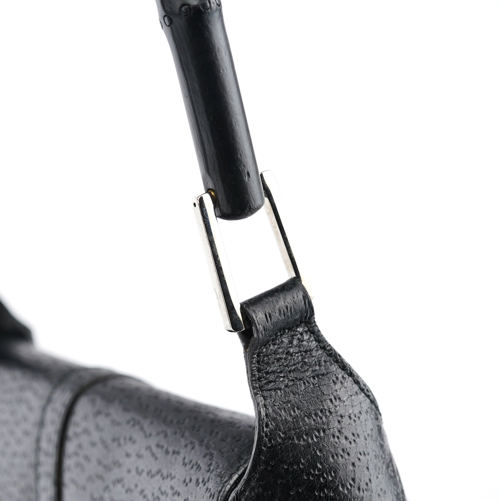 Designed in the early 2000s by Tom Ford, this vintage Gucci Jackie Bamboo shoulder bag combines black canvas with leather trim and the house's signature bamboo handle detail. The classic hobo silhouette features the iconic Jackie hardware with silver-tone piston closure and an adjustable shoulder strap for comfortable wear.