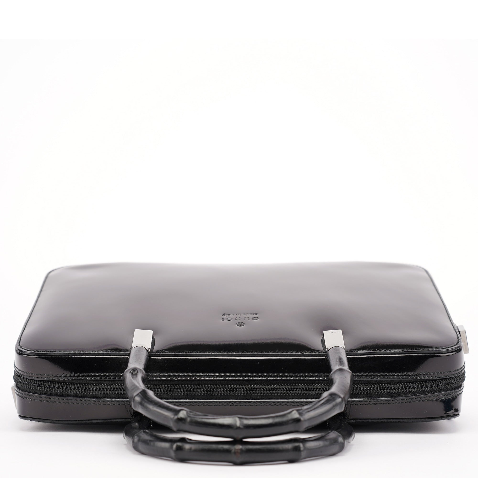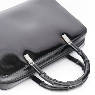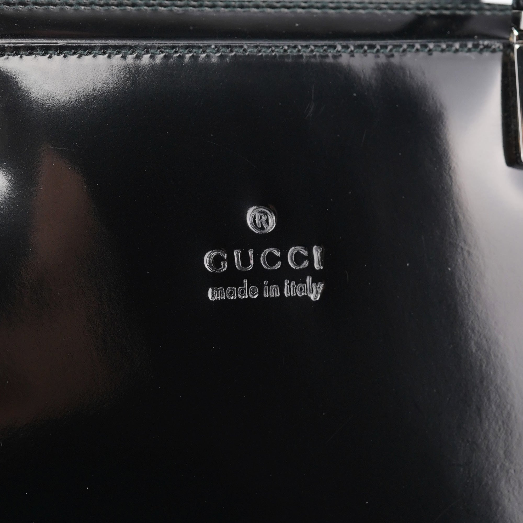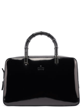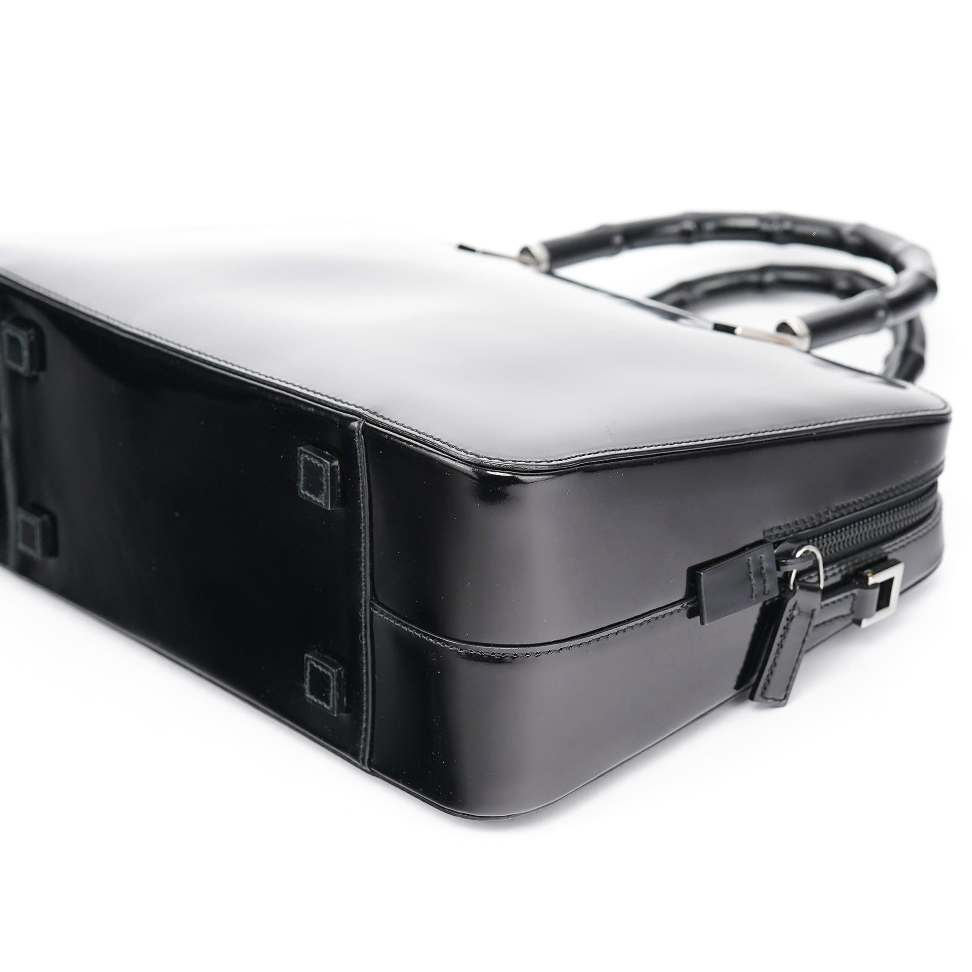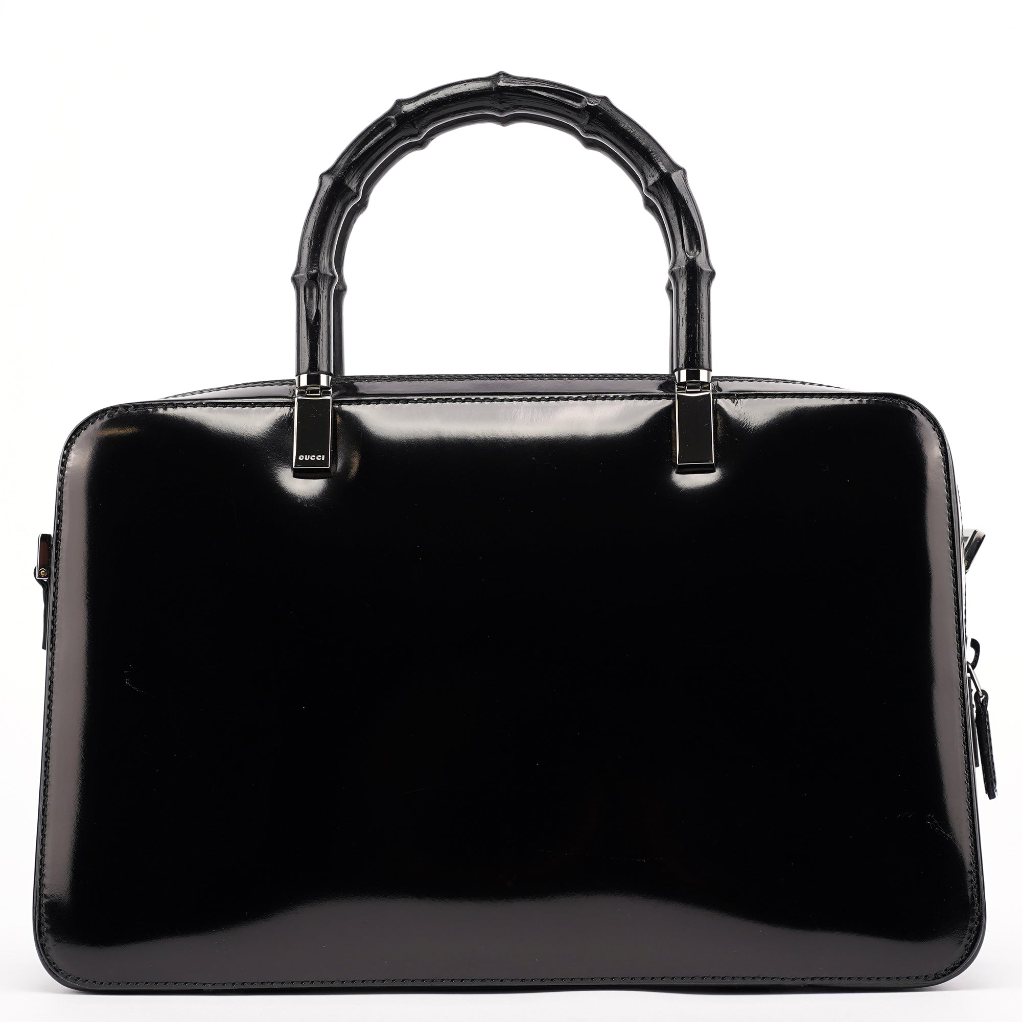 Designed in the late 1990s by Tom Ford, this Gucci tote bag is crafted from high-shine black patent leather with signature bamboo top handles. Accented with silver-tone hardware and a discreet debossed logo, it features a structured silhouette with a full zip closure and a spacious fabric-lined interior.