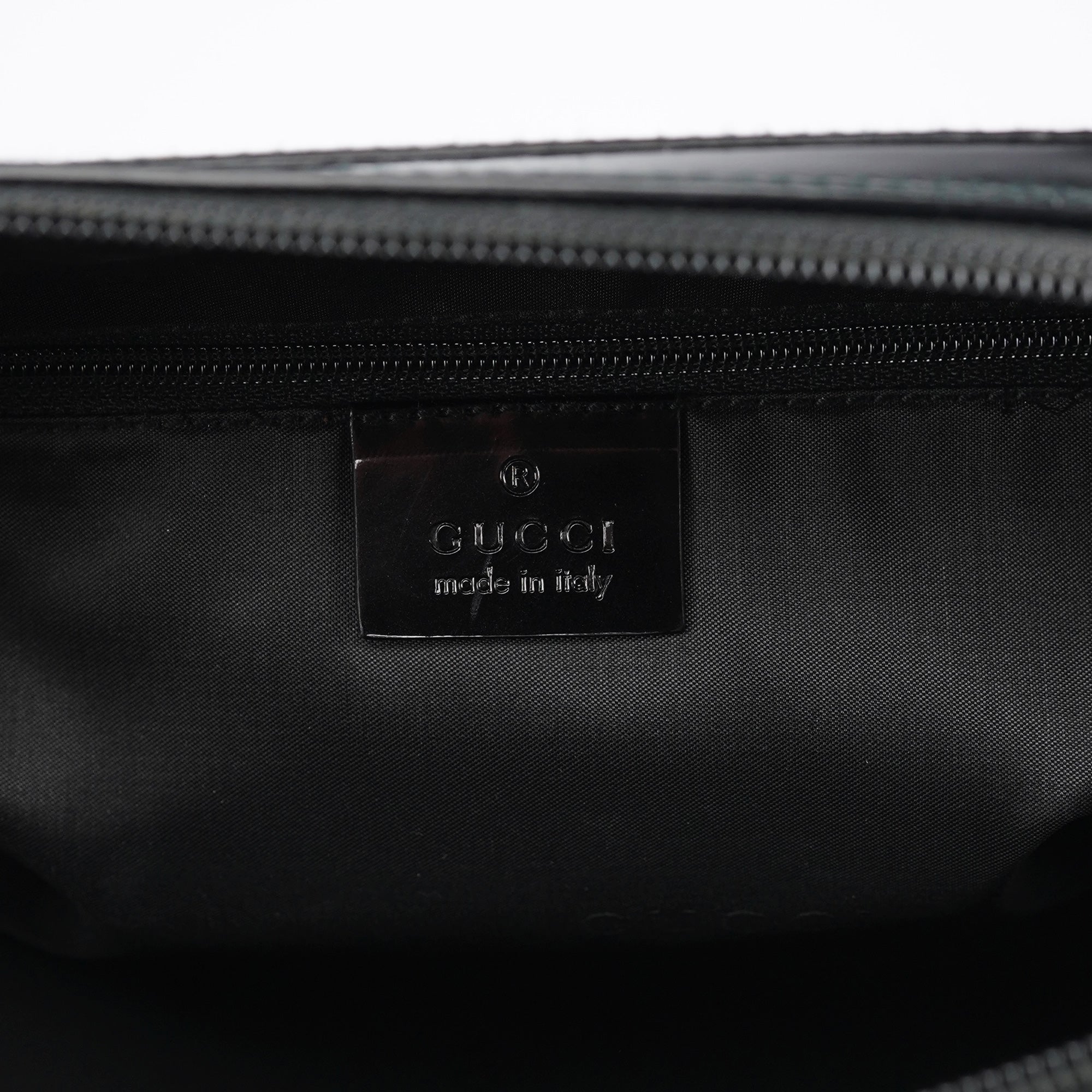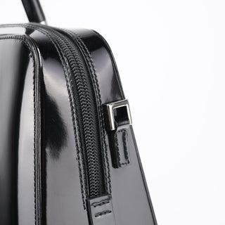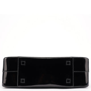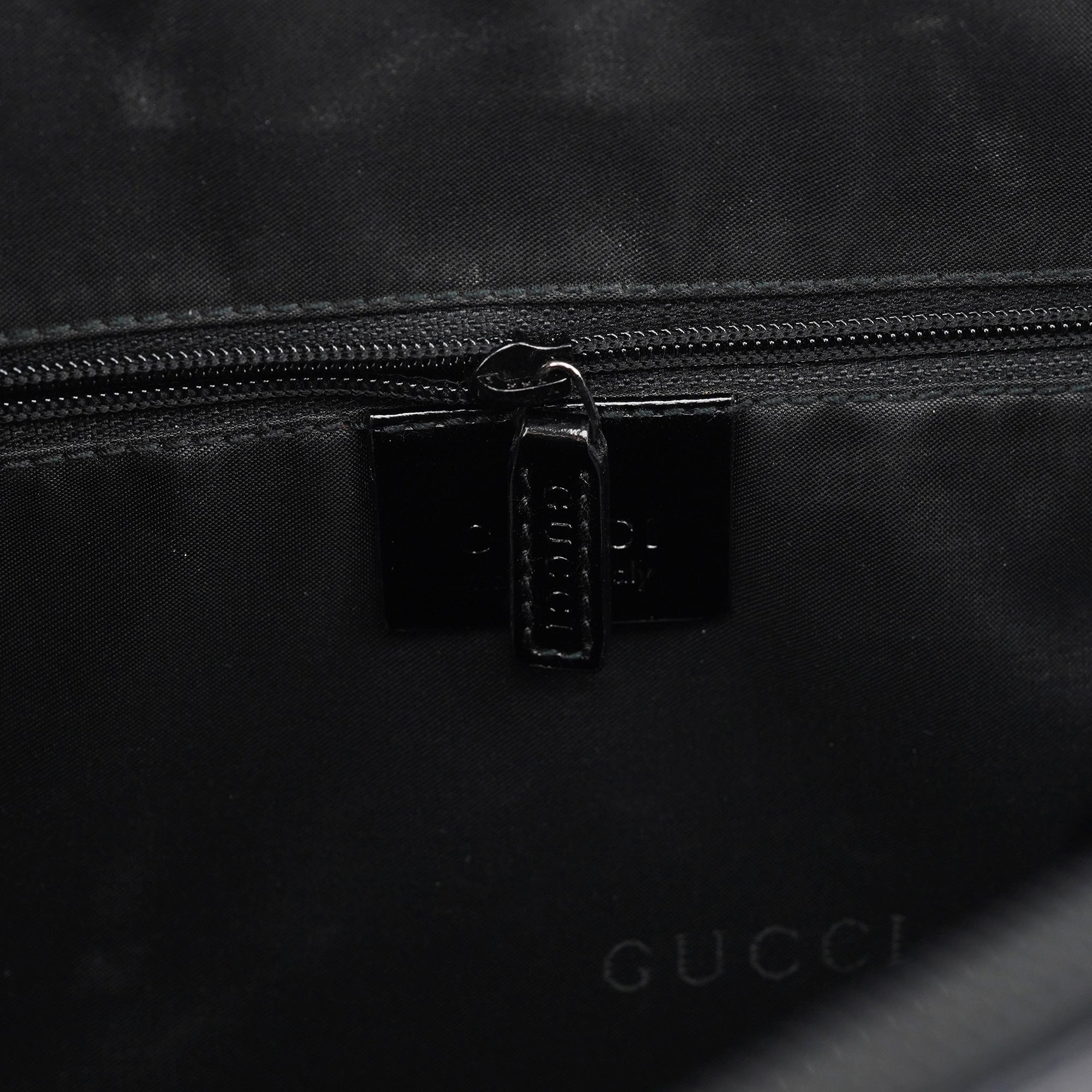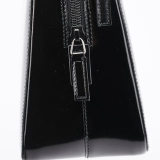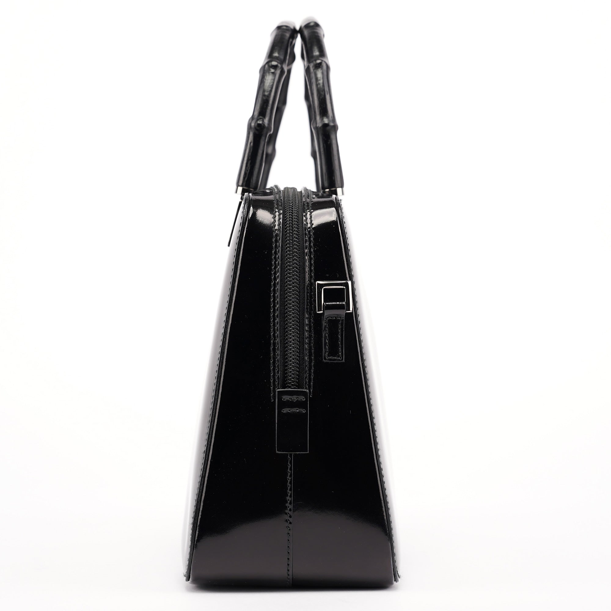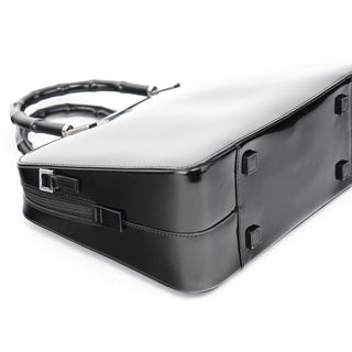 Designed in the late 1990s by Tom Ford, this Gucci tote bag is crafted from high-shine black patent leather with signature bamboo top handles. Accented with silver-tone hardware and a discreet debossed logo, it features a structured silhouette with a full zip closure and a spacious fabric-lined interior.