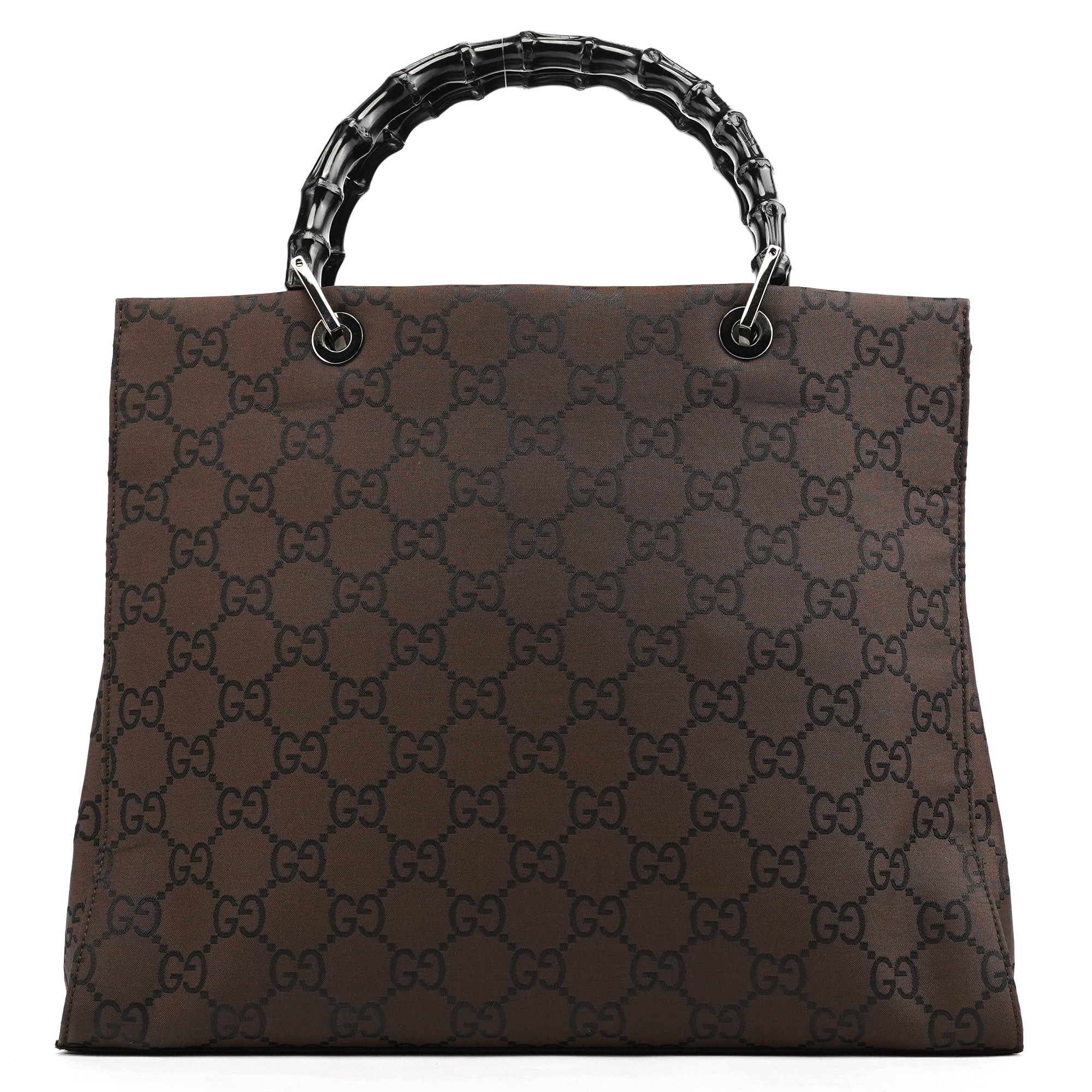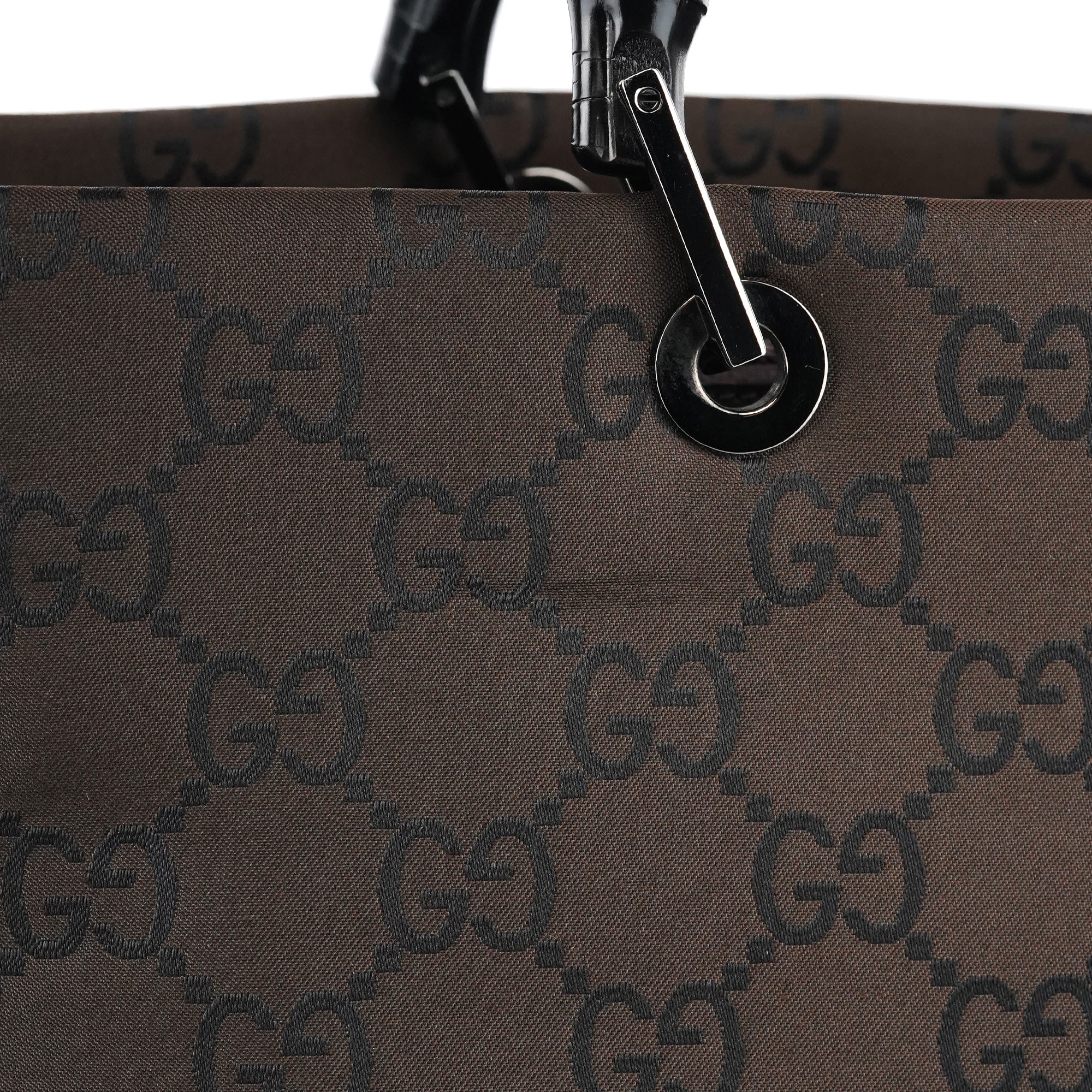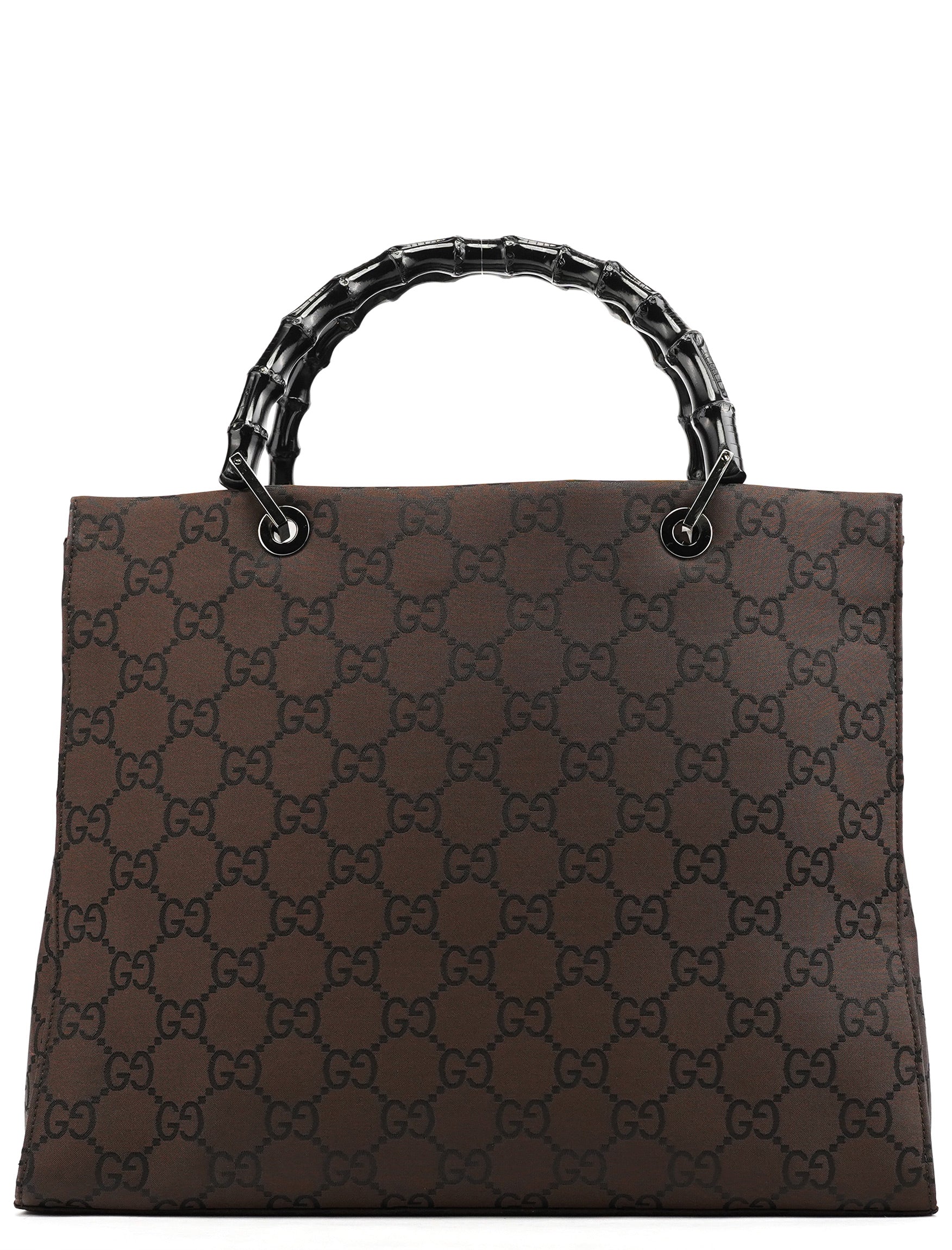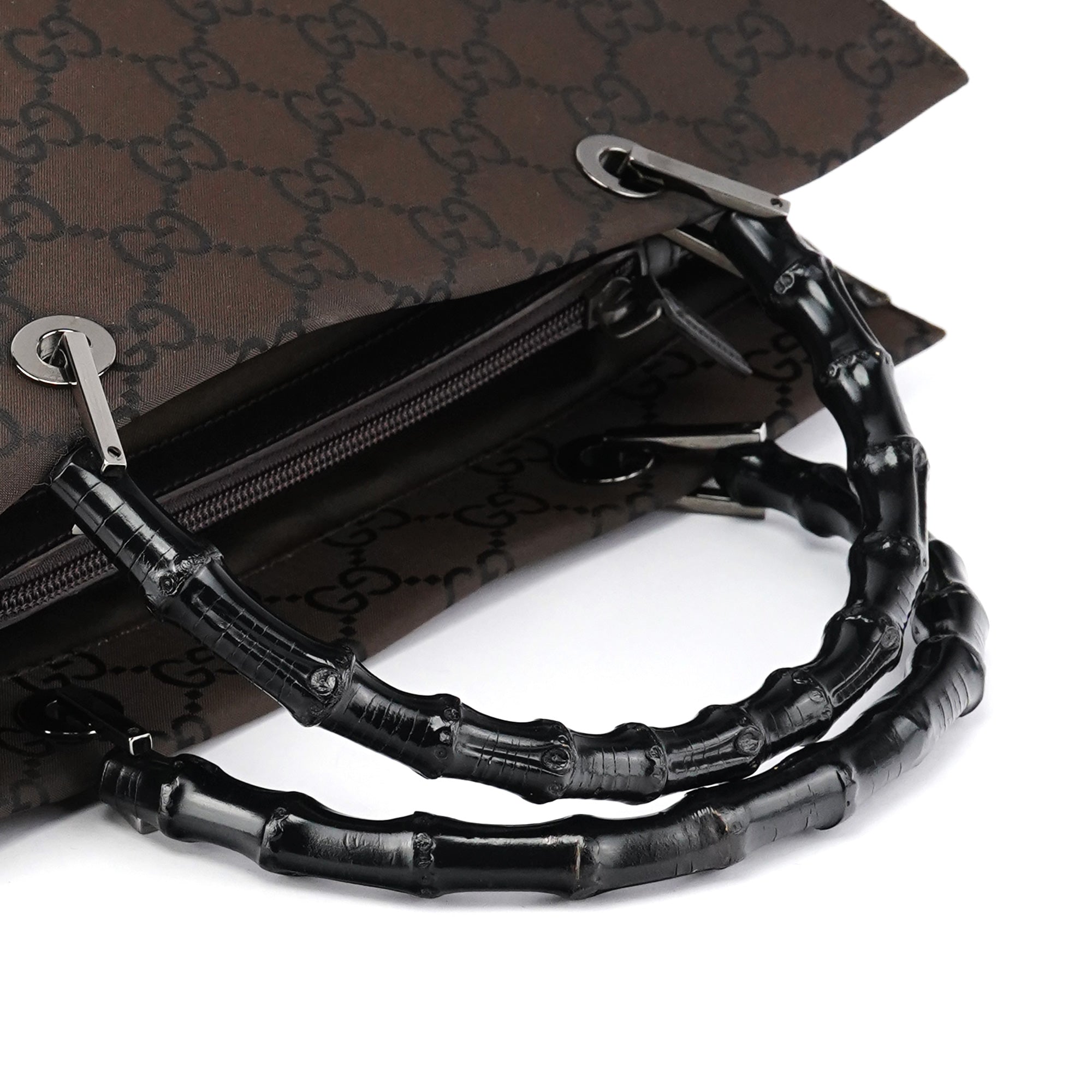 Designed in the late 1990s under Tom Ford, this Gucci GG Bamboo tote features dark brown GG canvas with black lacquered bamboo handles and silver-tone hardware. The structured silhouette opens to a fabric-lined interior with three compartments, including a central zip pocket for valuables.