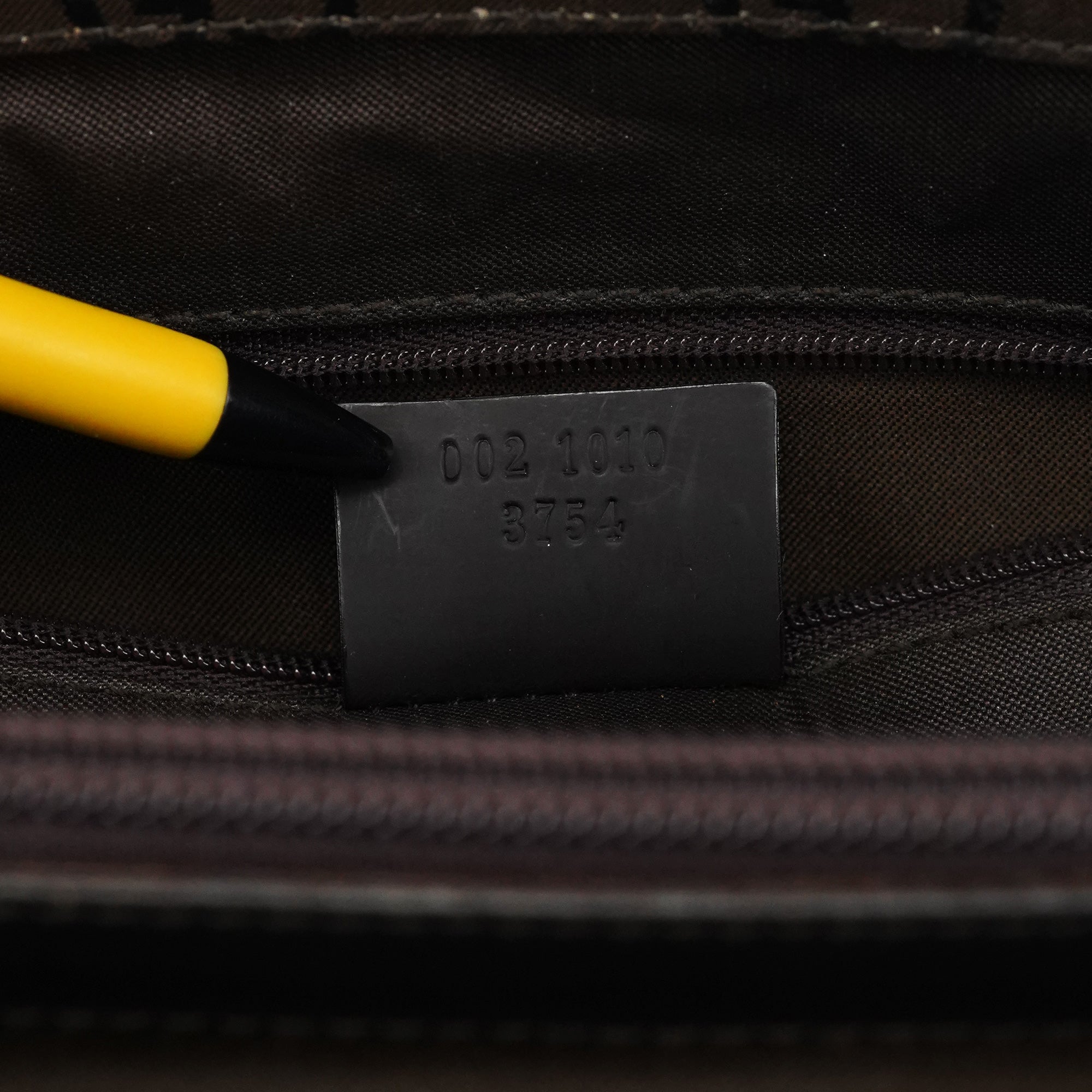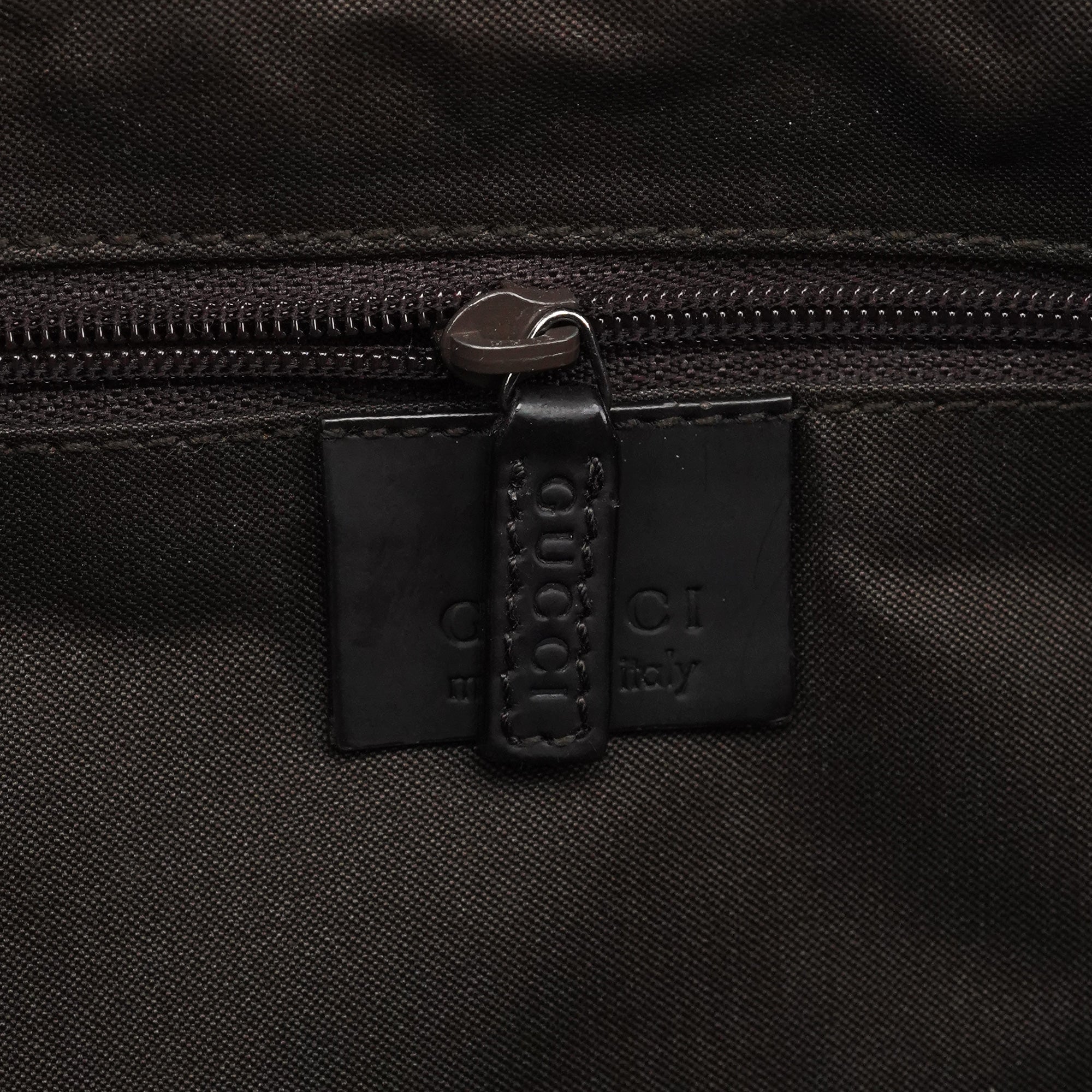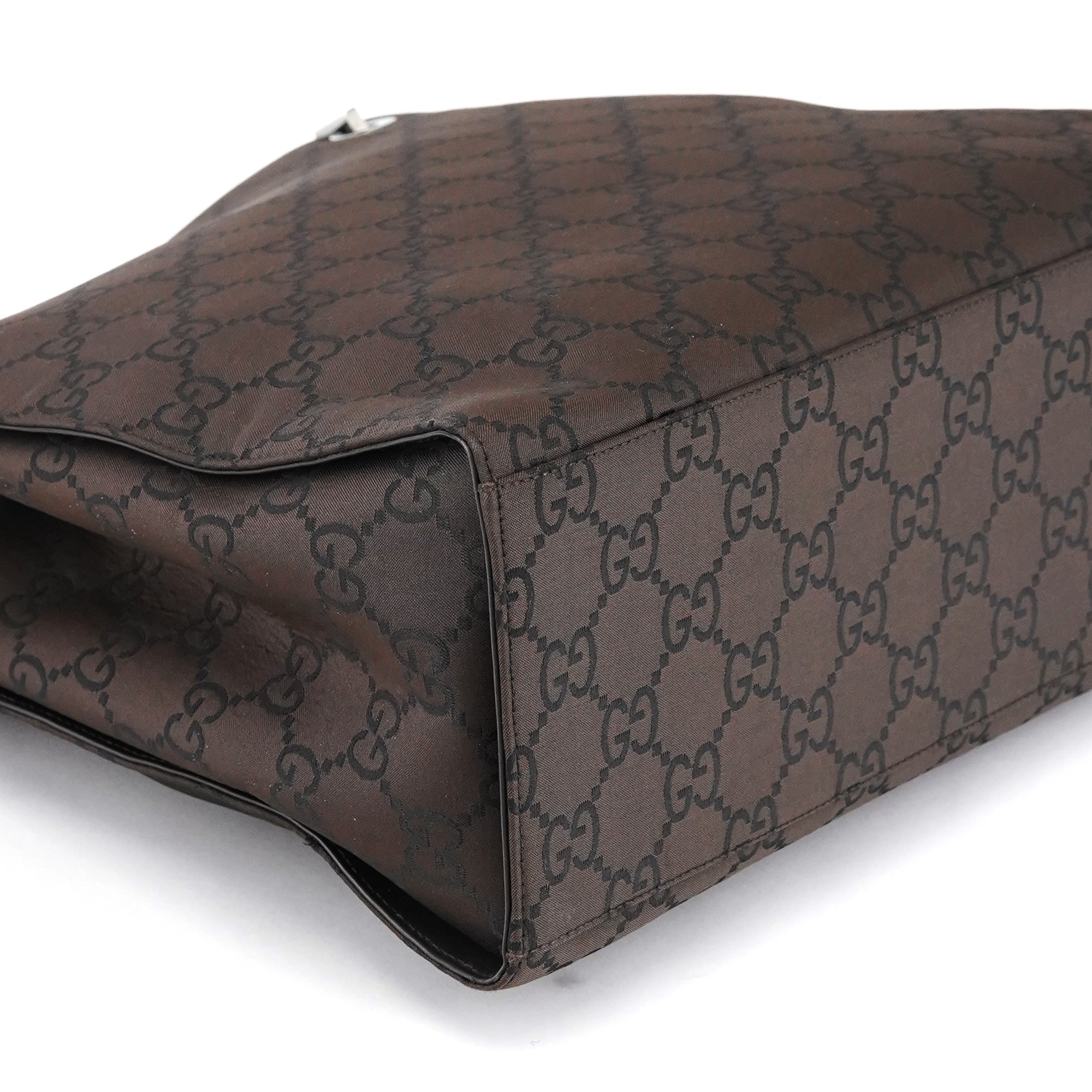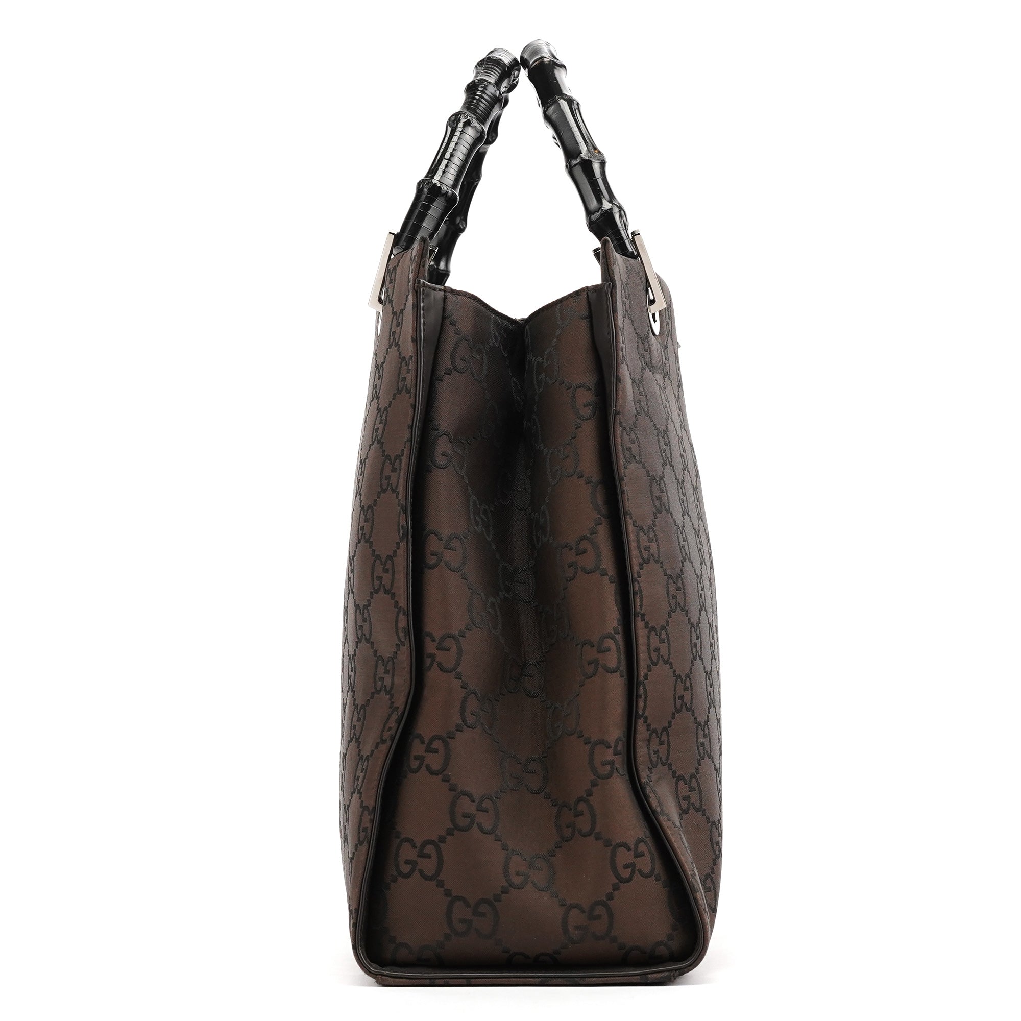 Designed in the late 1990s under Tom Ford, this Gucci GG Bamboo tote features dark brown GG canvas with black lacquered bamboo handles and silver-tone hardware. The structured silhouette opens to a fabric-lined interior with three compartments, including a central zip pocket for valuables.