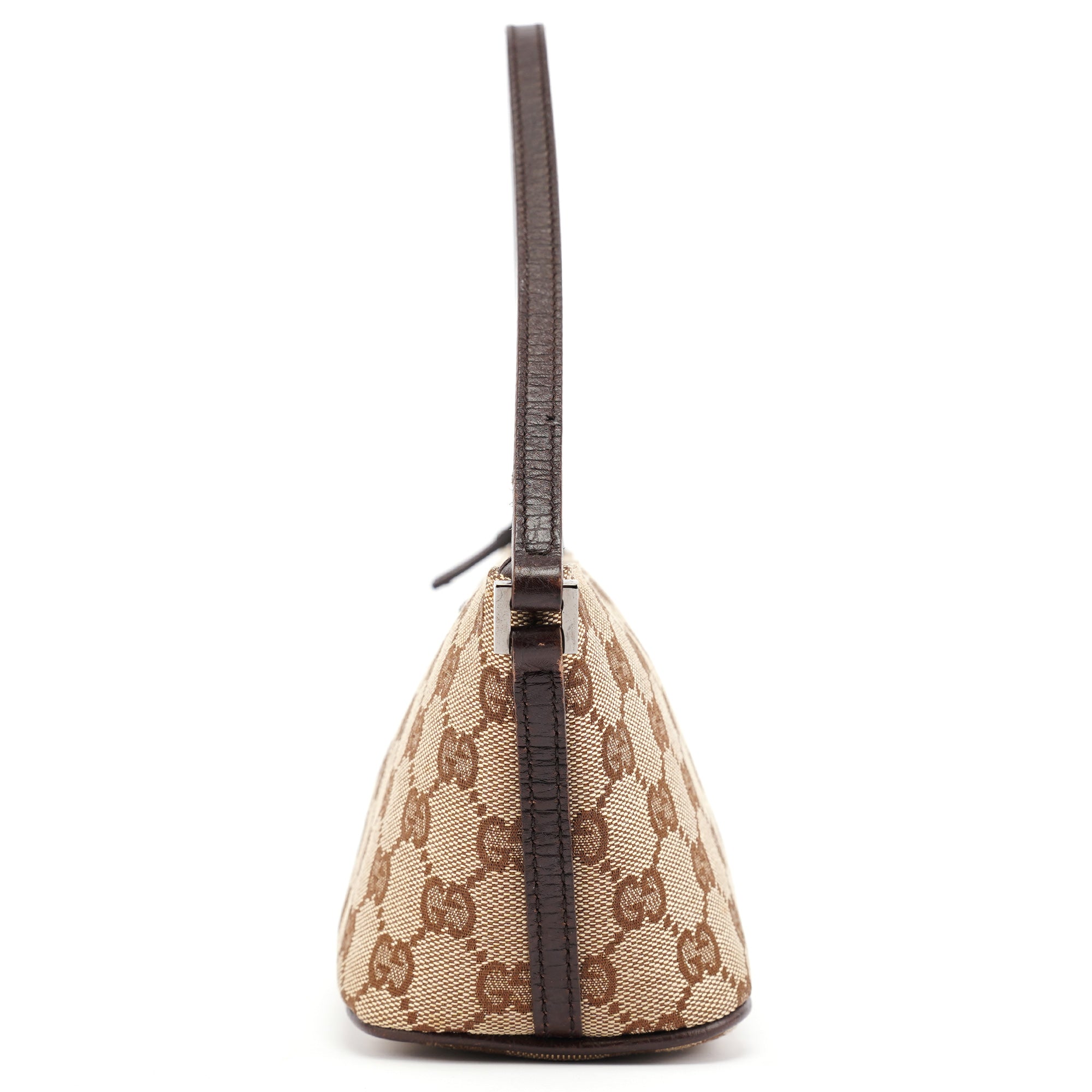 Designed in the early 2000s by Tom Ford, this vintage Gucci boat pochette features the classic beige and brown GG canvas with silver-tone hardware and a zip-top closure. The streamlined silhouette with minimal leather trim exemplifies Ford's refined approach to Gucci's heritage monogram accessories.