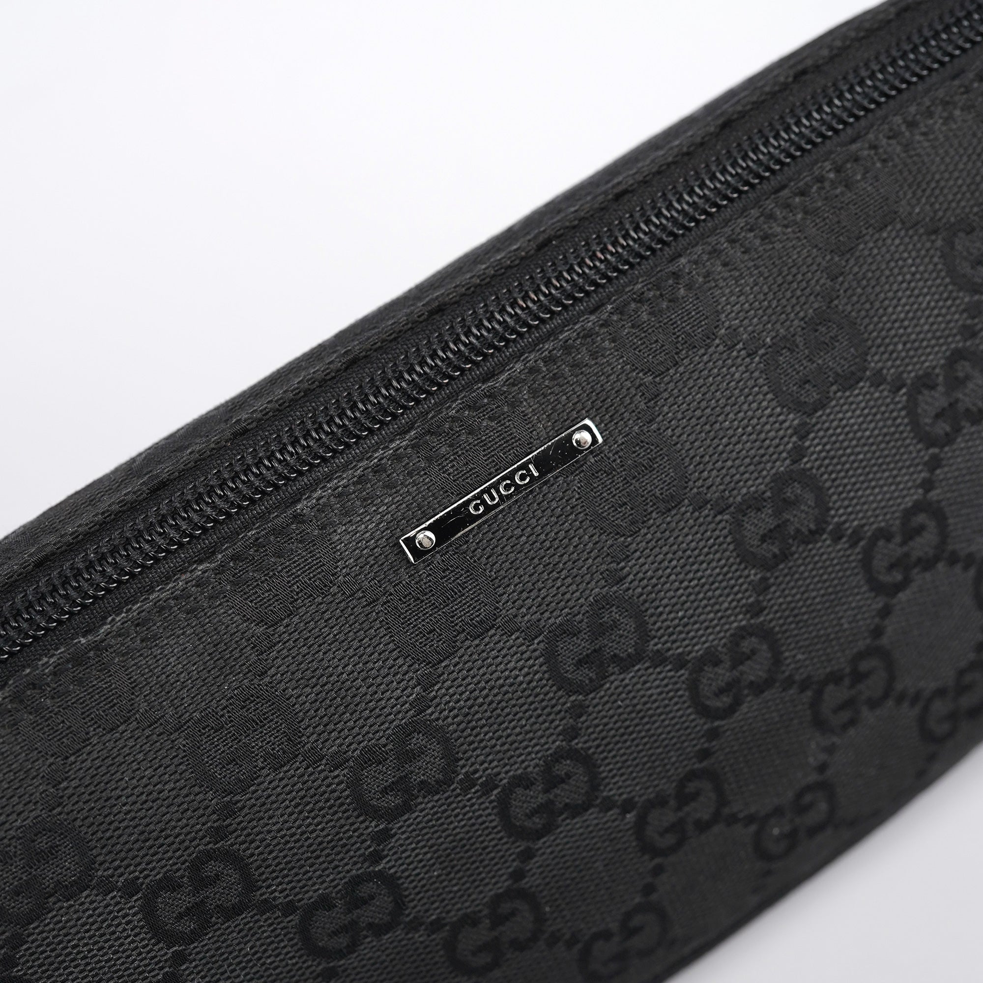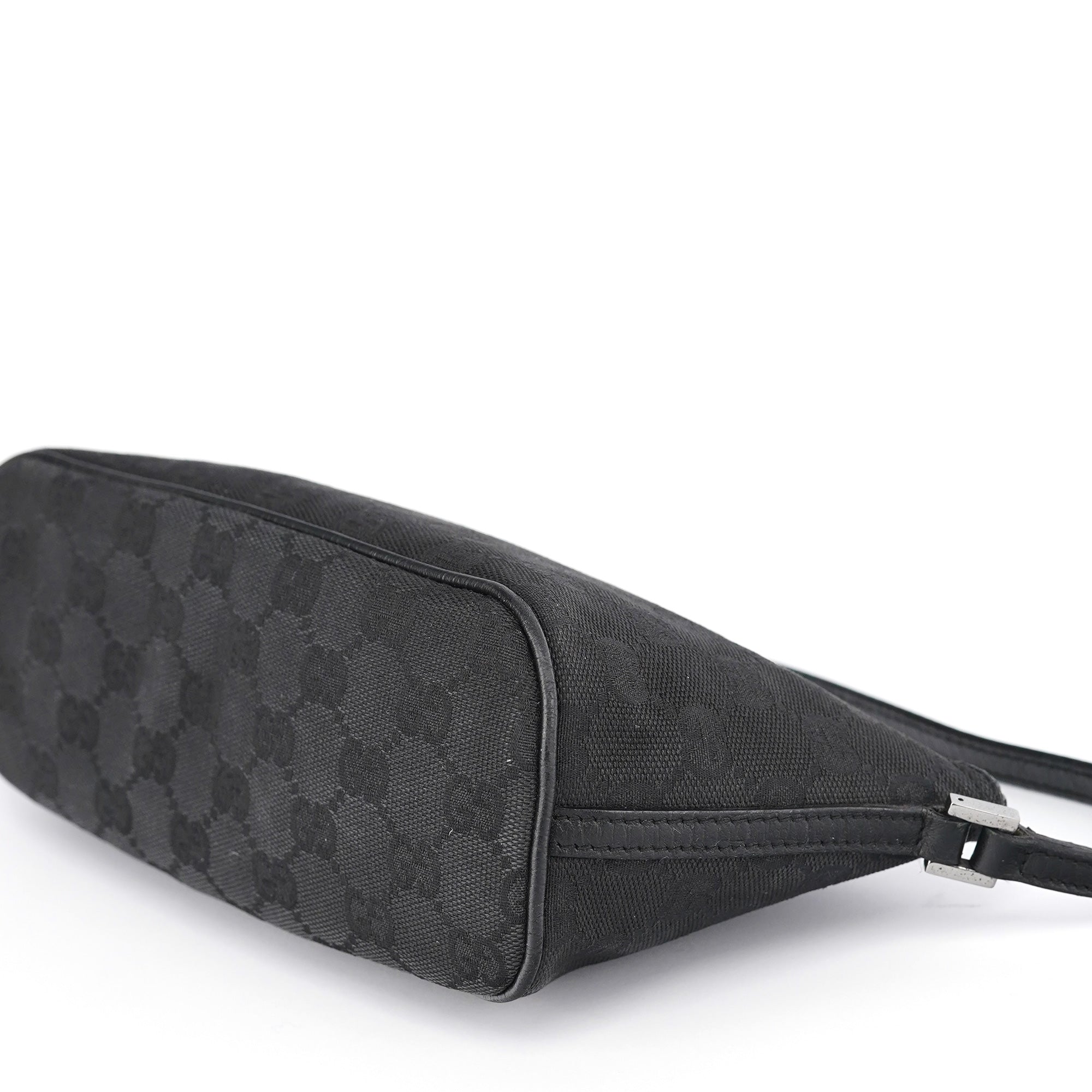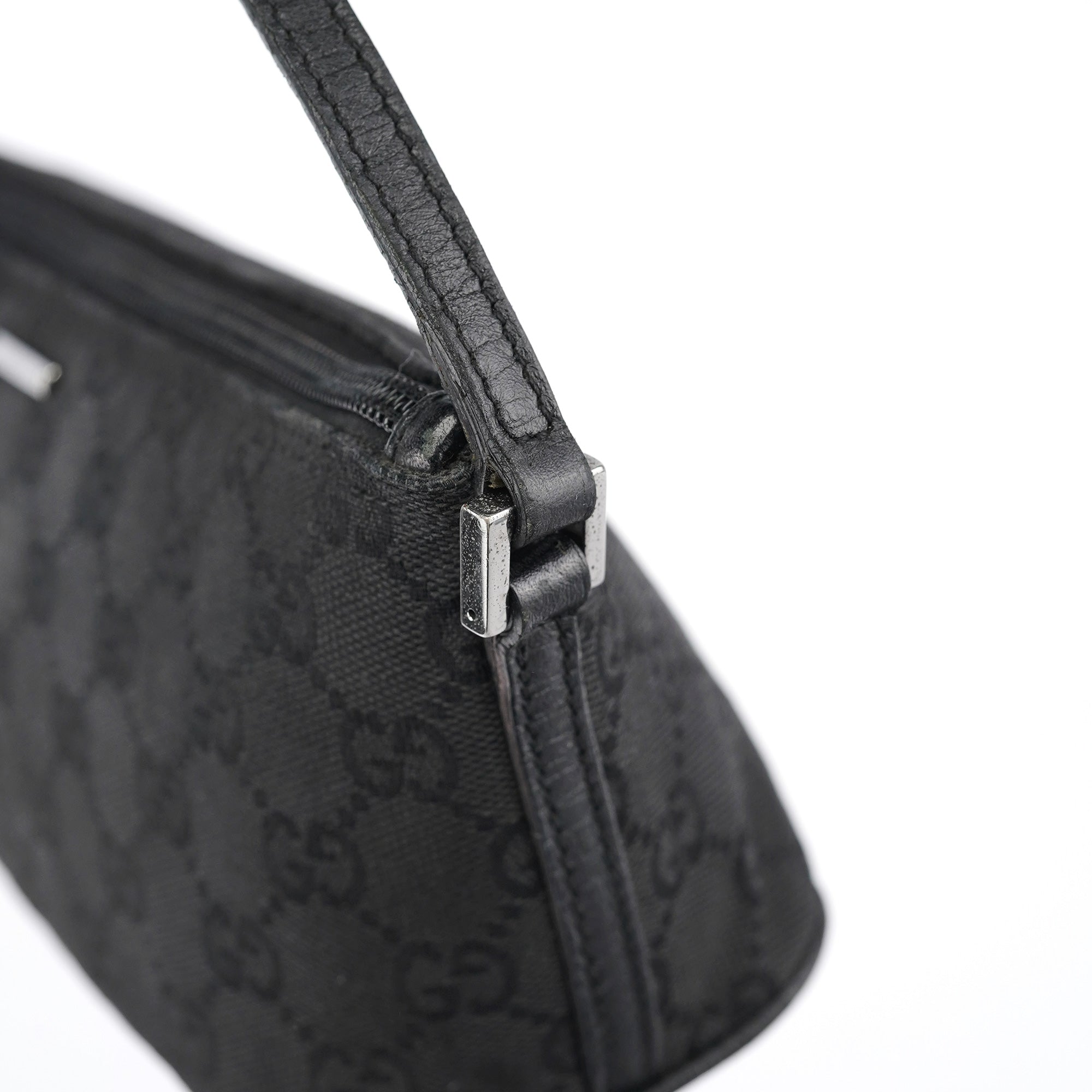 Designed in the early 2000s by Tom Ford, this vintage Gucci GG Boat Pochette features black GG monogram canvas with black leather trim. The streamlined silhouette includes a zipper closure, single handle, and lined interior.