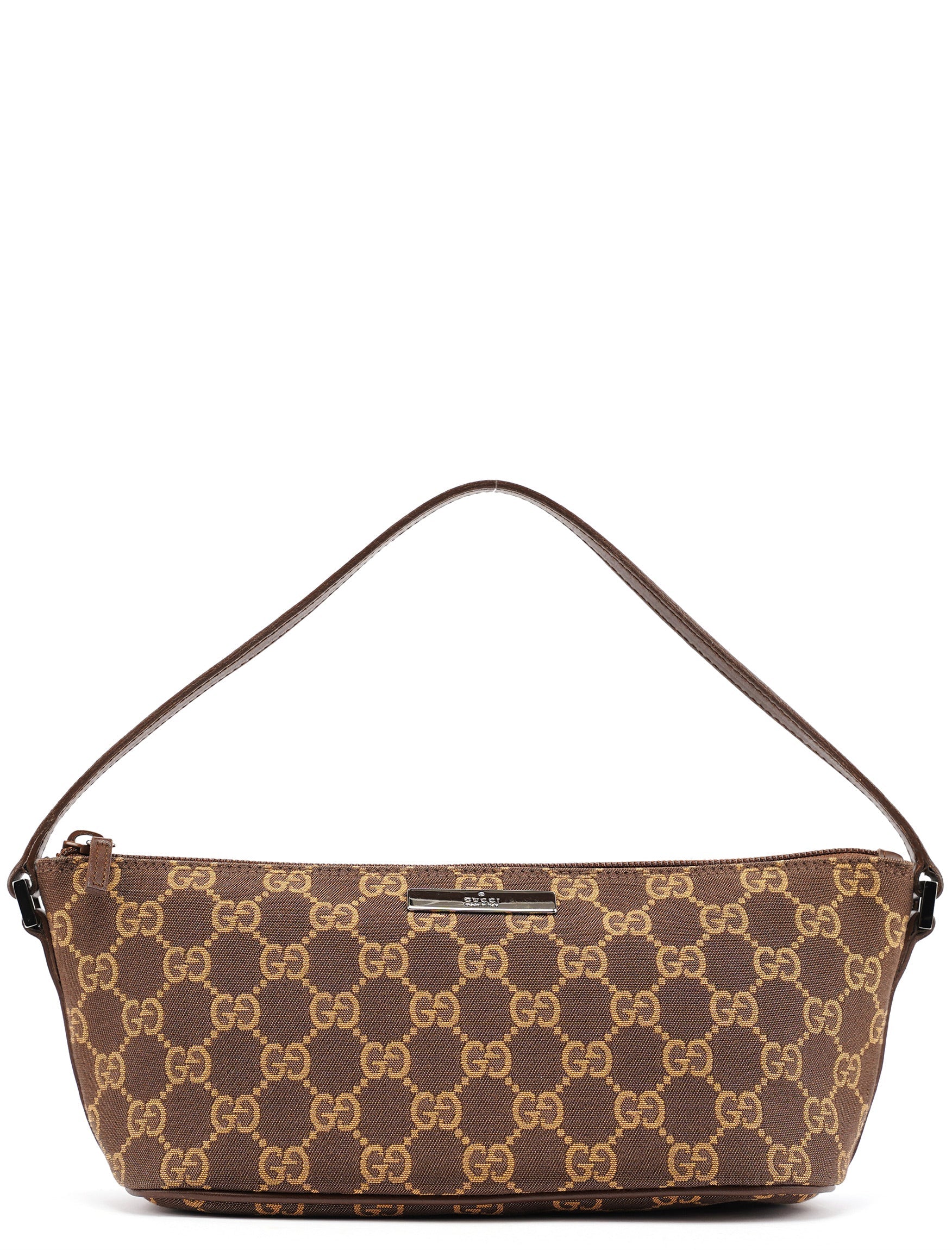 Designed in the late 1990s by Tom Ford, this vintage Gucci GG Boat pochette features the classic GG monogram canvas in brown with tan leather trim. The streamlined boat-shaped silhouette showcases gold-tone hardware and a top zip closure. The interior is lined in dark green canvas with the Gucci made in Italy label, offering a compact space perfect for essentials.