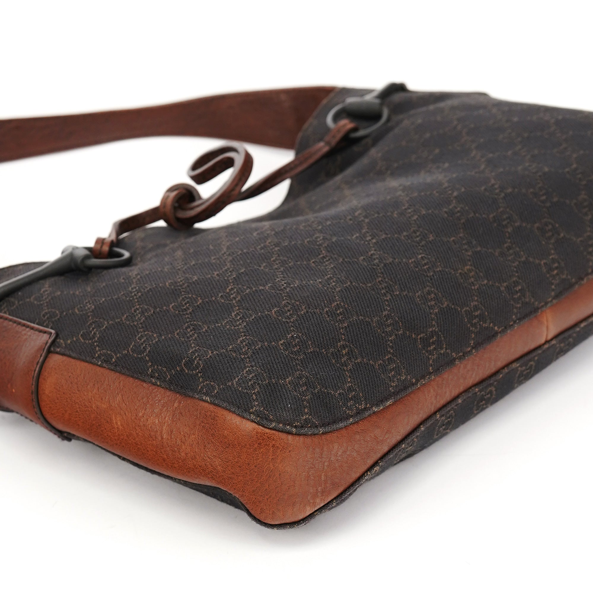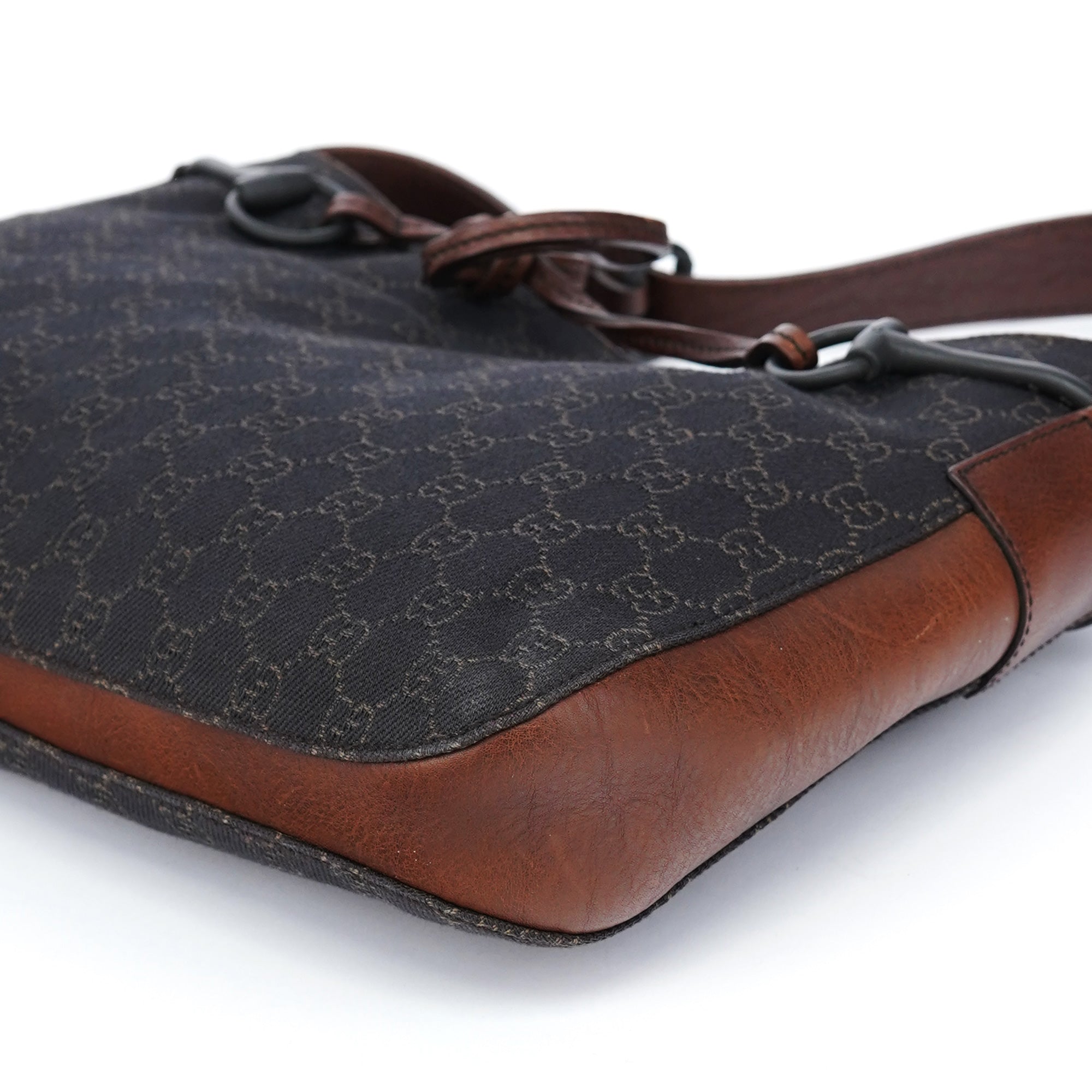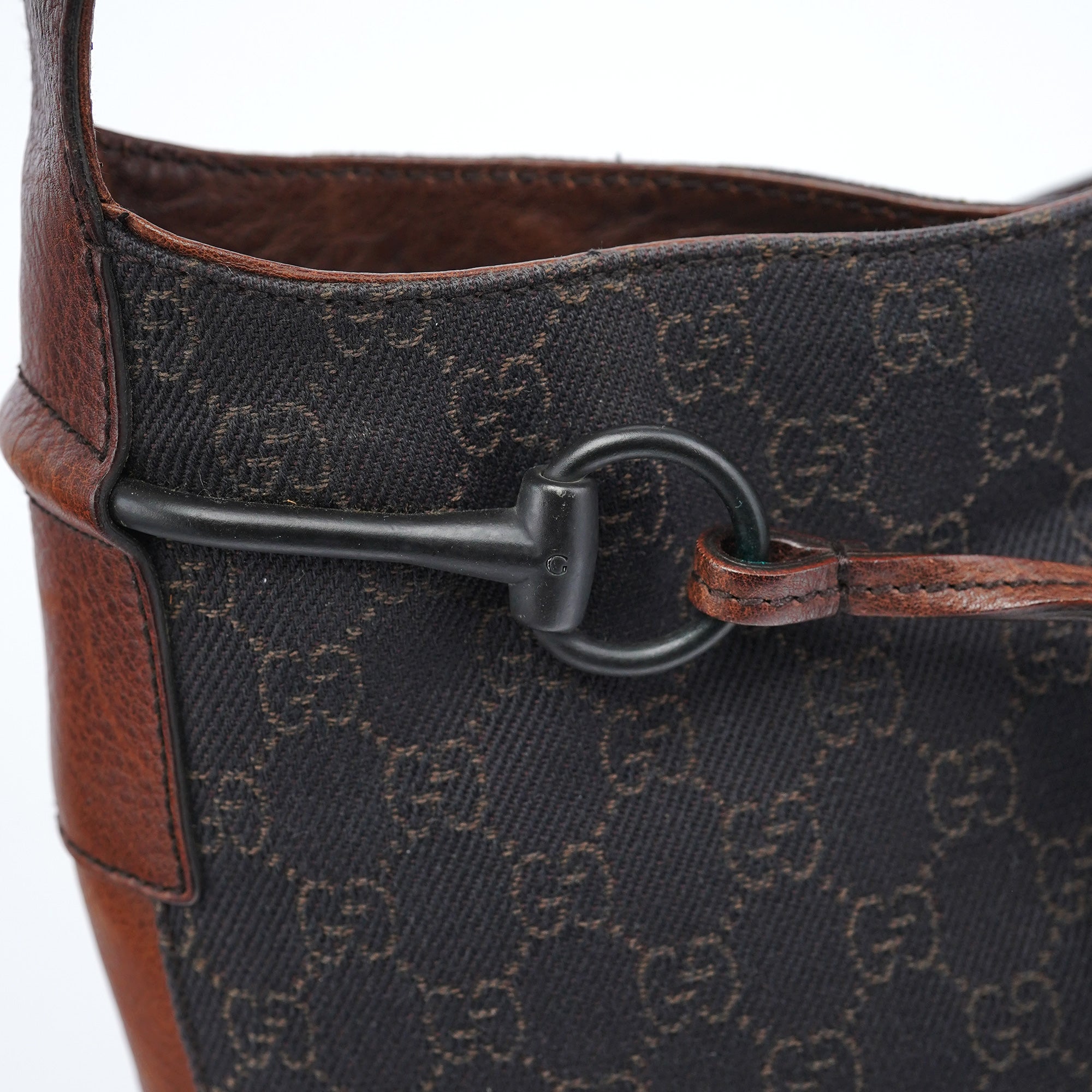 Designed in the early 2000s by Tom Ford, this vintage Gucci Horsebit shoulder bag combines the brand's signature elements in an unexpected denim interpretation. Crafted in brown GG monogram fabric with brown leather trim, the bag features the iconic horsebit hardware detail across the front in a drawstring configuration with anthracite-tone rings. The curved hobo silhouette closes with a magnetic snap.
