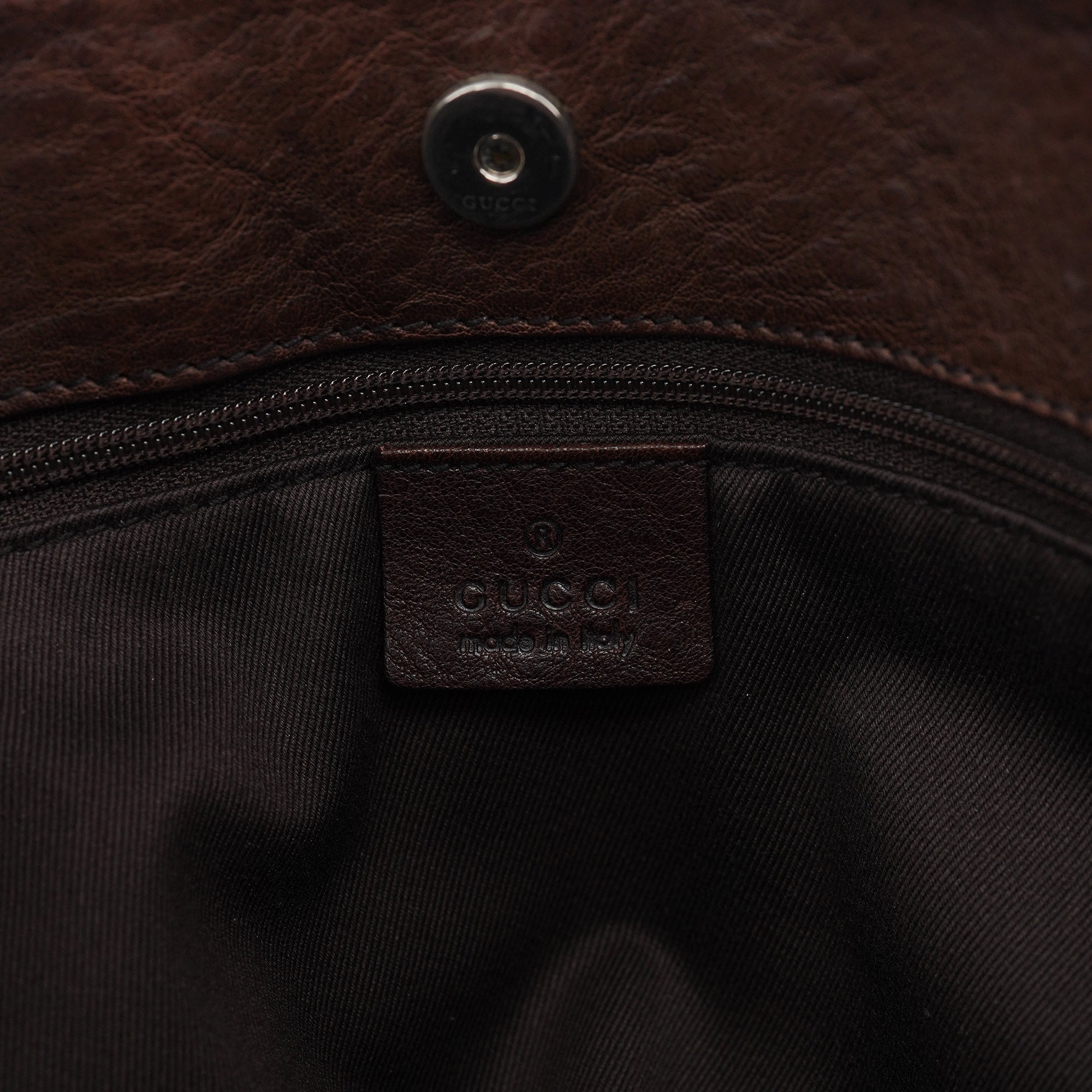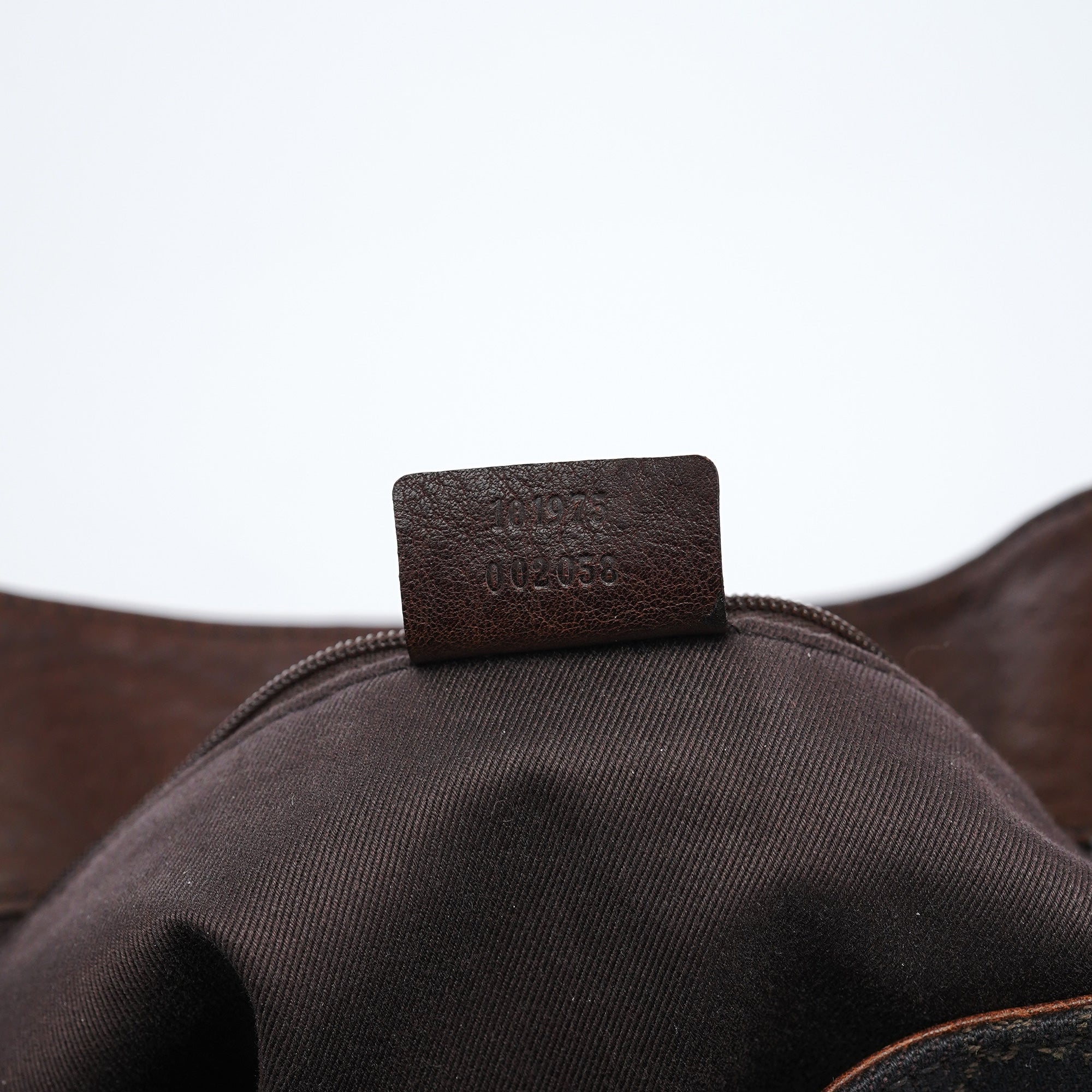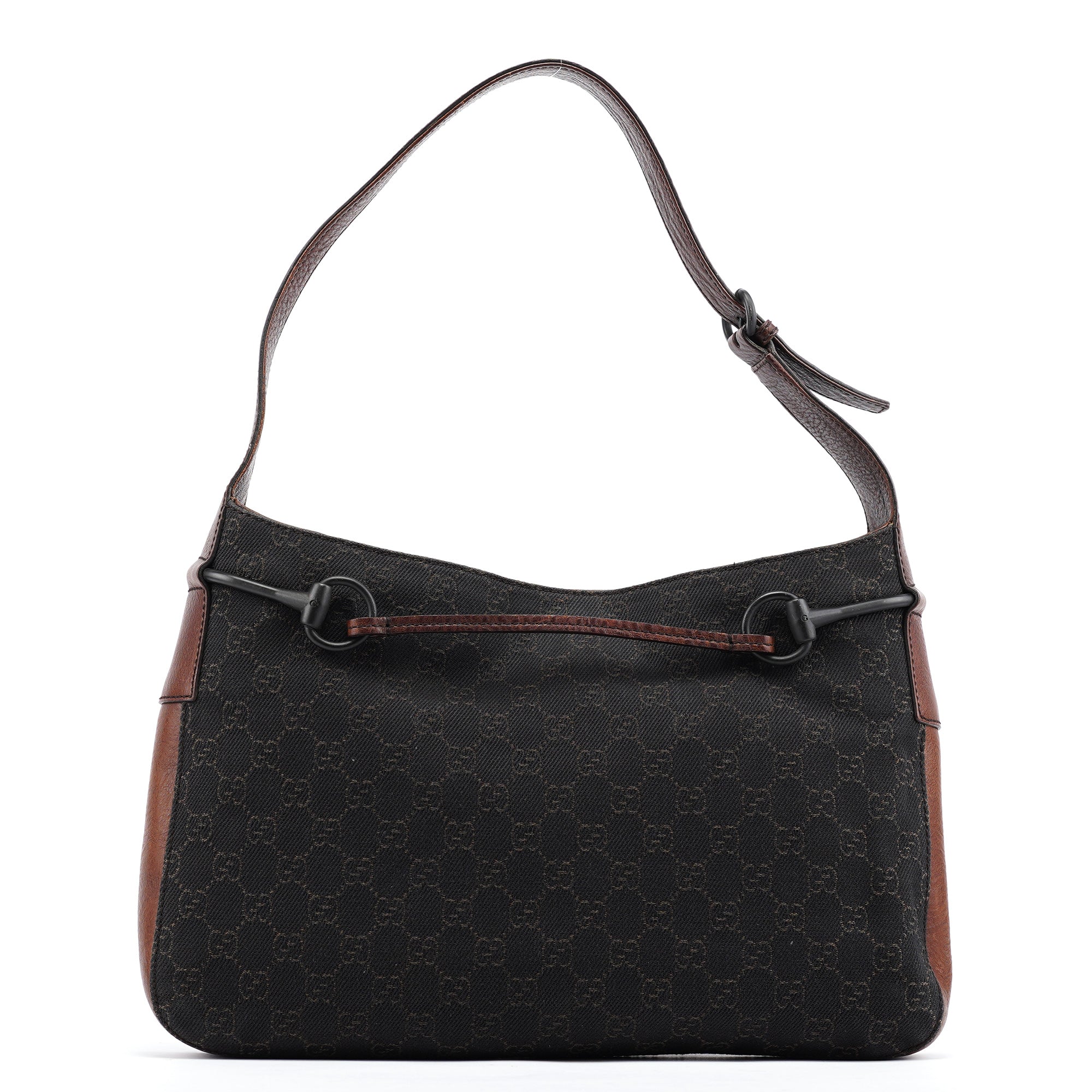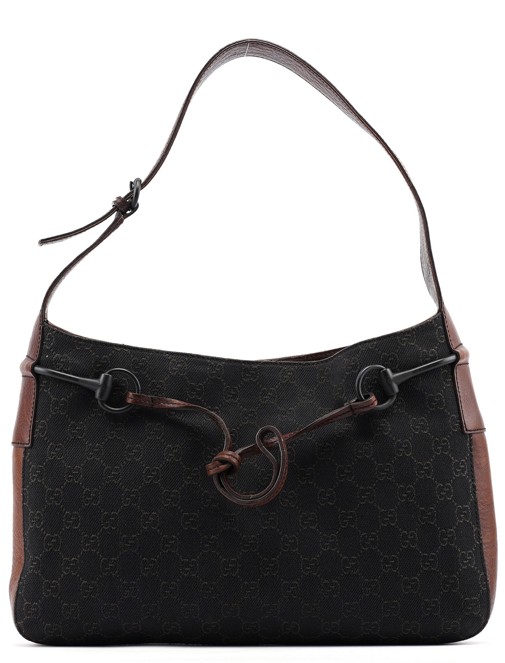 Designed in the early 2000s by Tom Ford, this vintage Gucci Horsebit shoulder bag combines the brand's signature elements in an unexpected denim interpretation. Crafted in brown GG monogram fabric with brown leather trim, the bag features the iconic horsebit hardware detail across the front in a drawstring configuration with anthracite-tone rings. The curved hobo silhouette closes with a magnetic snap.