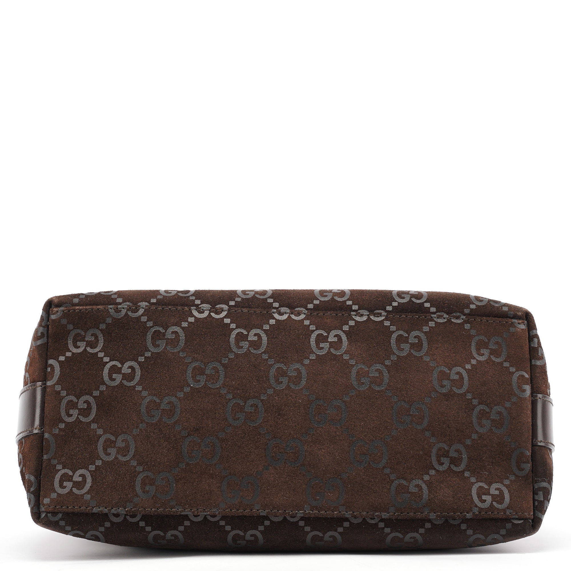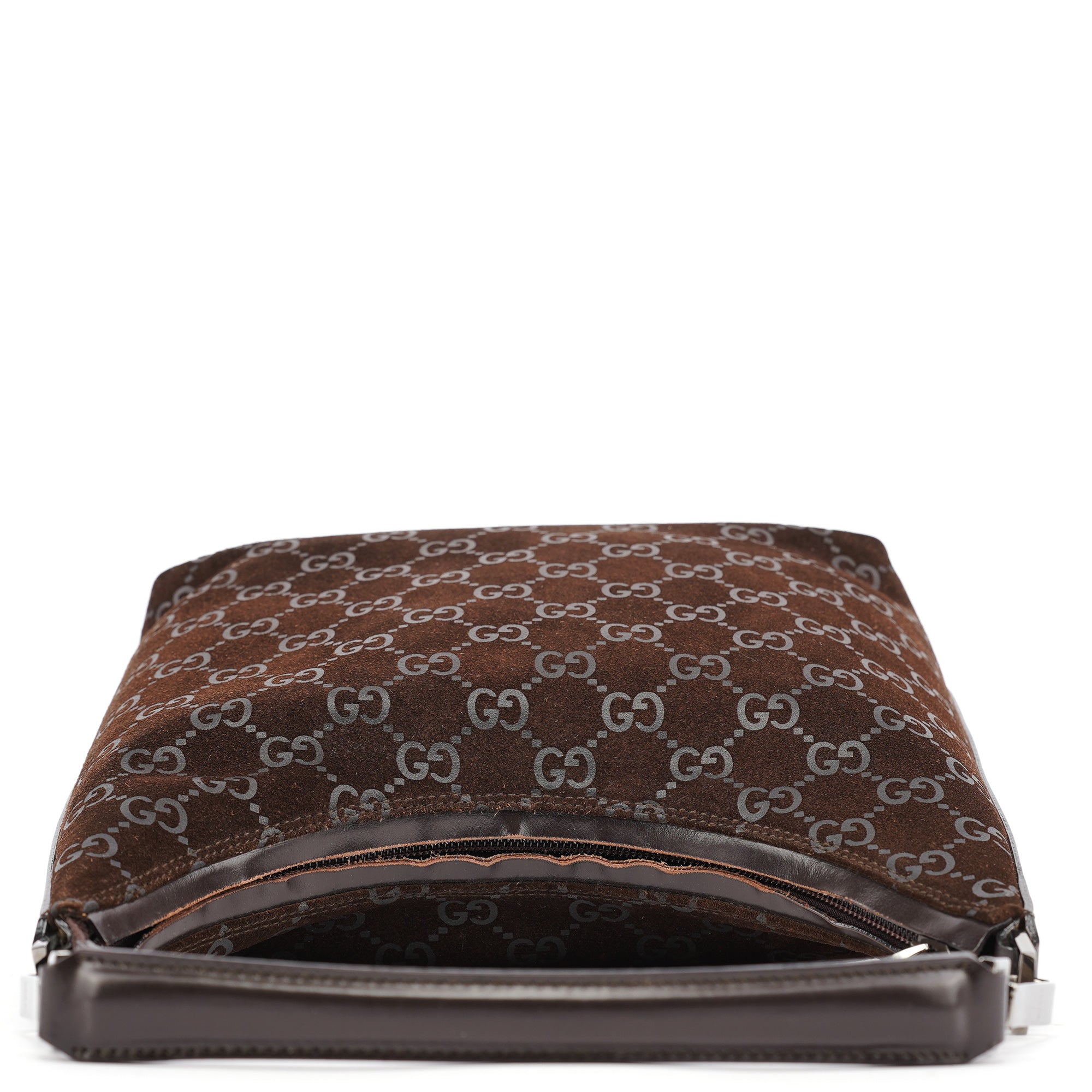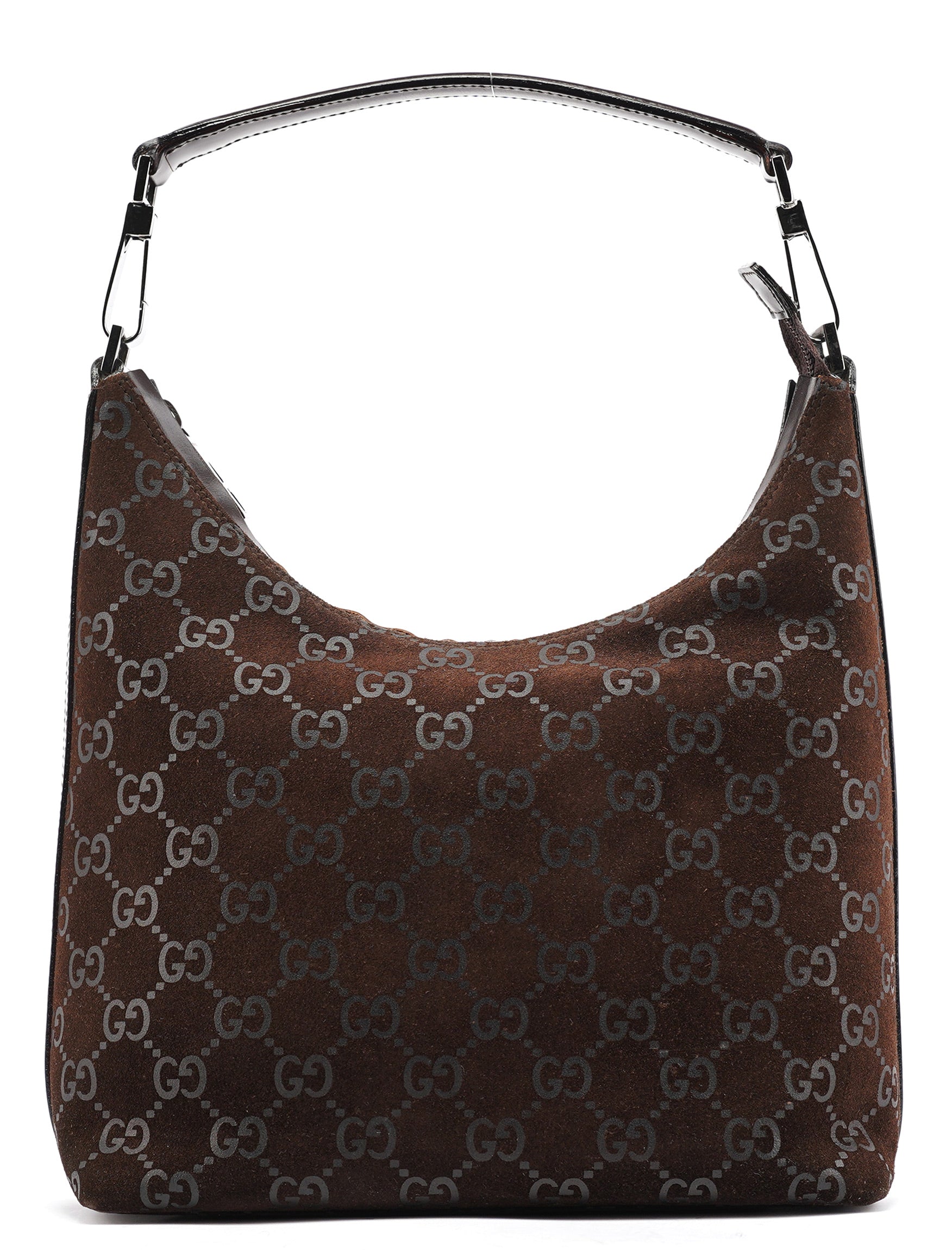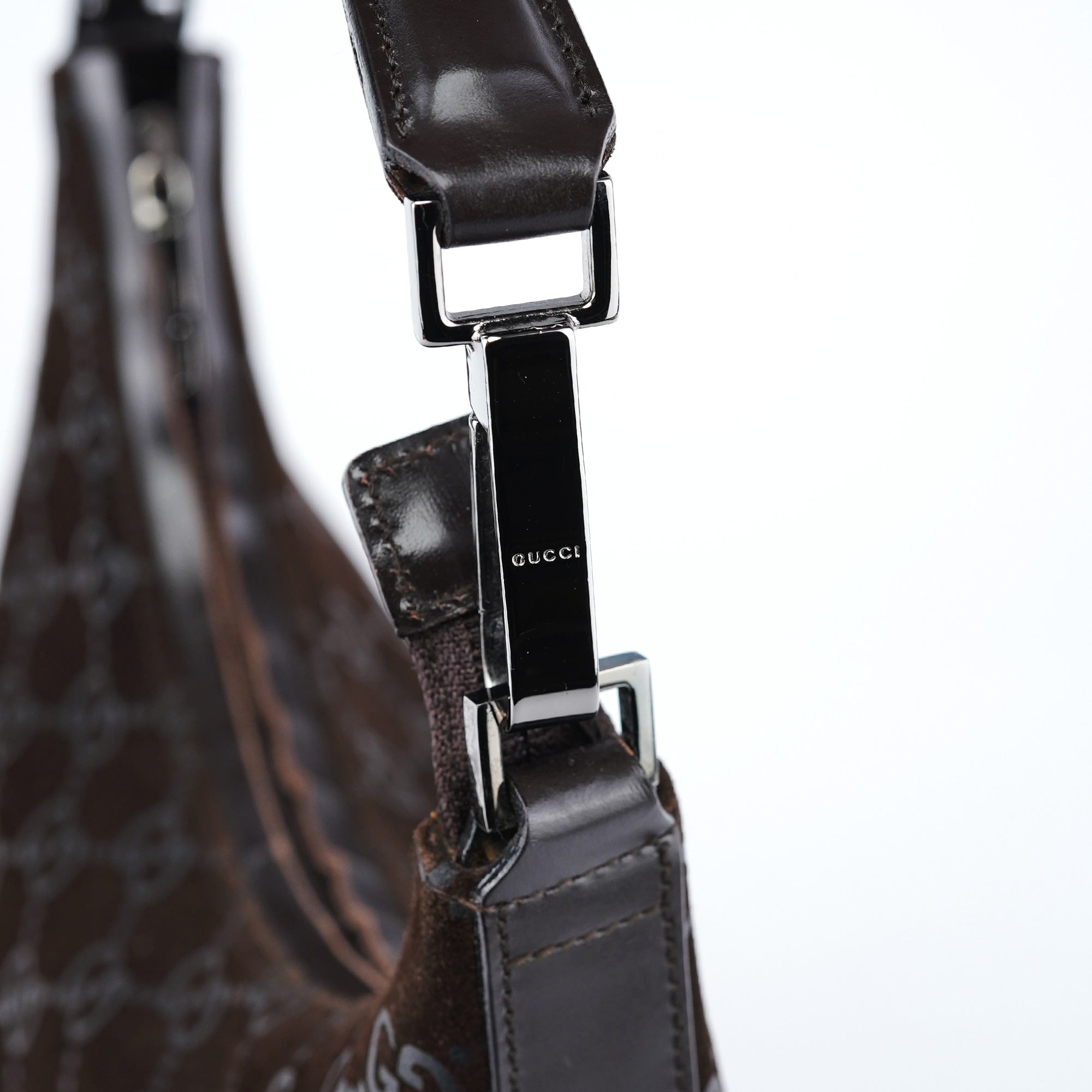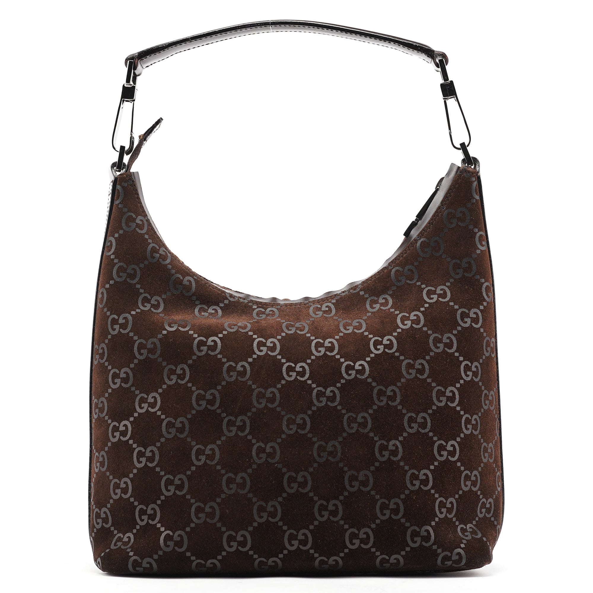 Designed in 1997 by Tom Ford, this vintage Gucci GG suede shoulder bag features brown suede with an all-over GG monogram pattern and contrasting smooth leather trim with silver-tone hardware. The hobo-style silhouette includes a single curved handle with metal attachments and a fabric-lined interior.