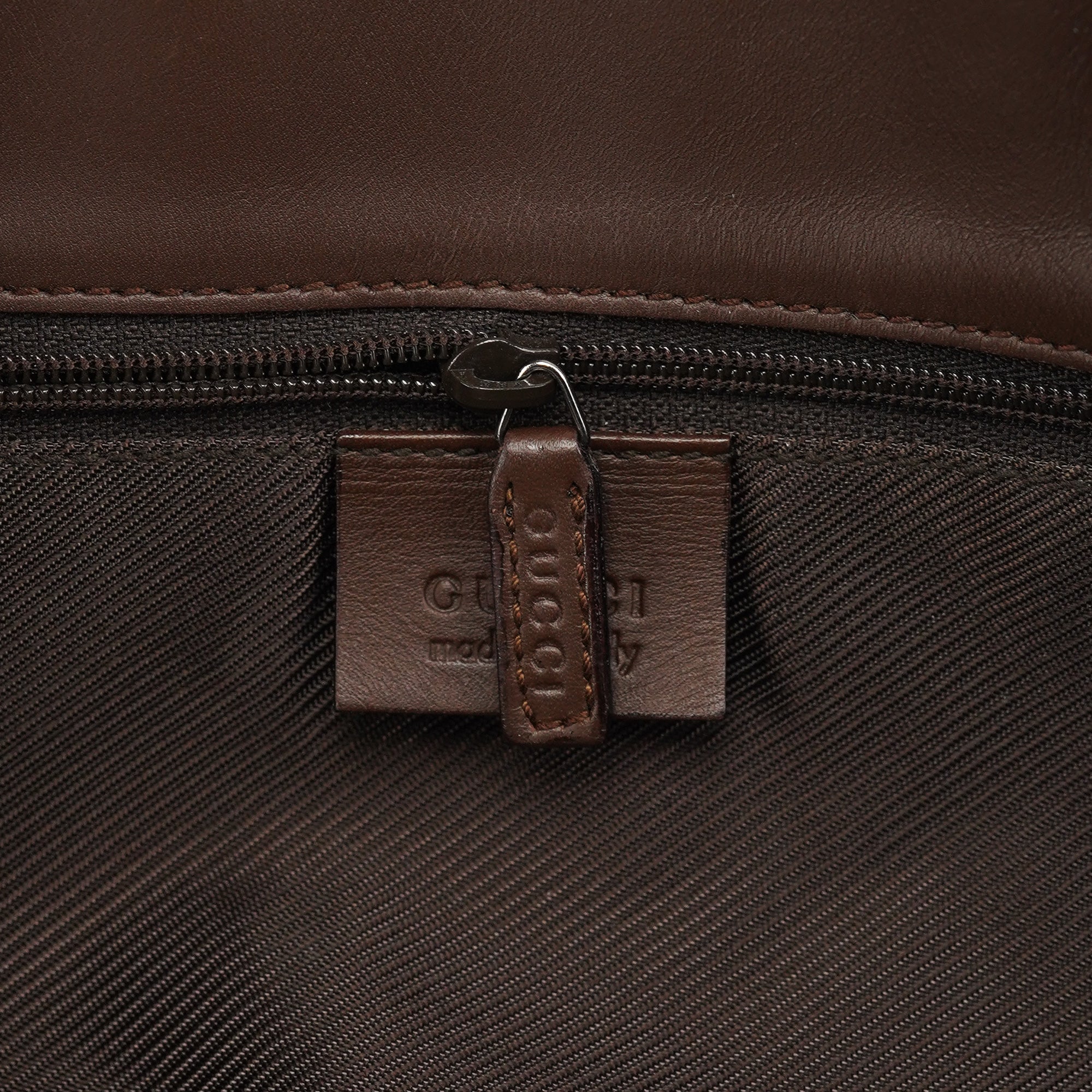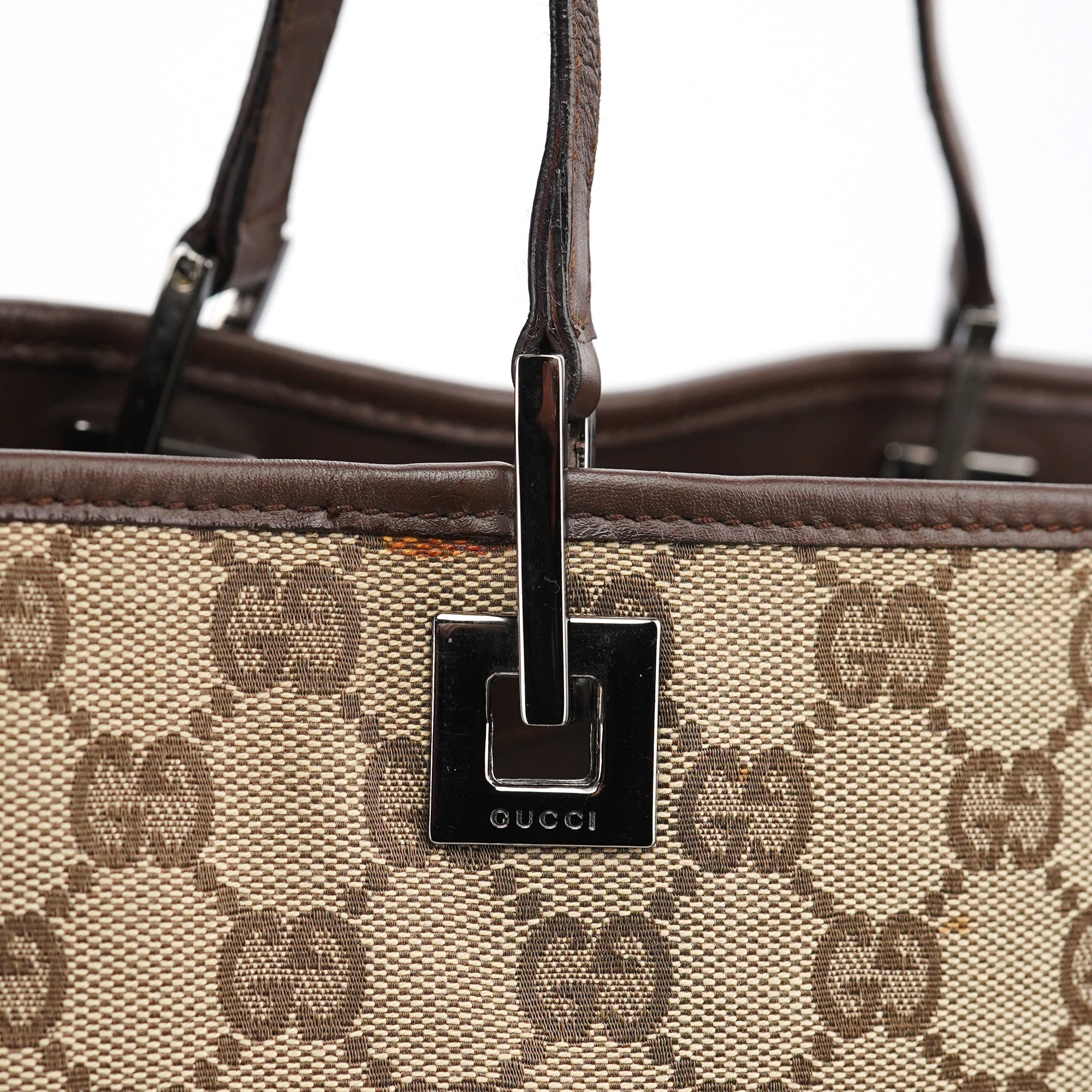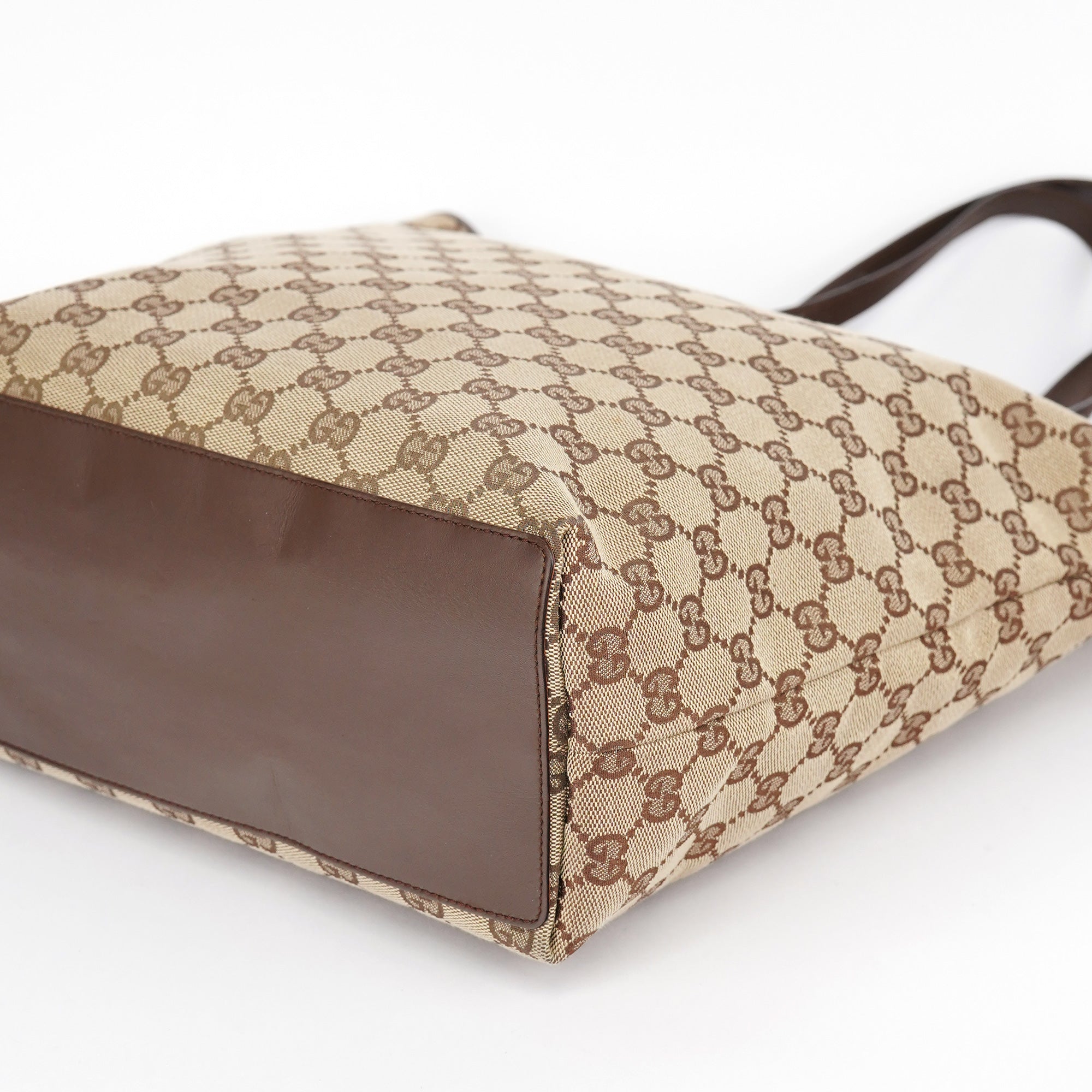 Designed in the late 1990s by Tom Ford, this Gucci tote bag is crafted in beige GG monogram canvas with chocolate‑brown calfskin leather trim and twin flat leather shoulder straps. The tall open‑top silhouette is finished with a secure zipper closure and opens to a cotton‑lined interior featuring one zippered pocket
