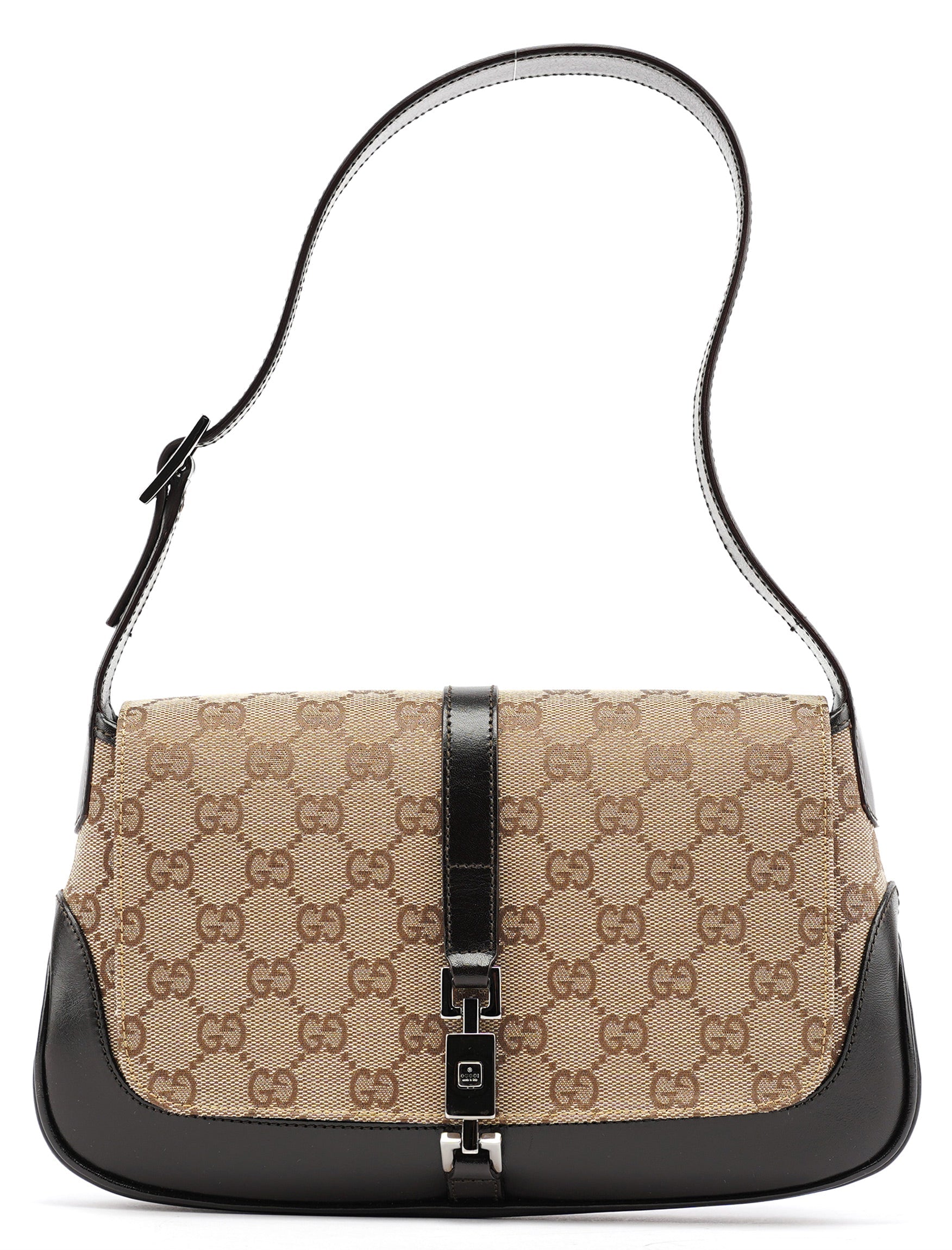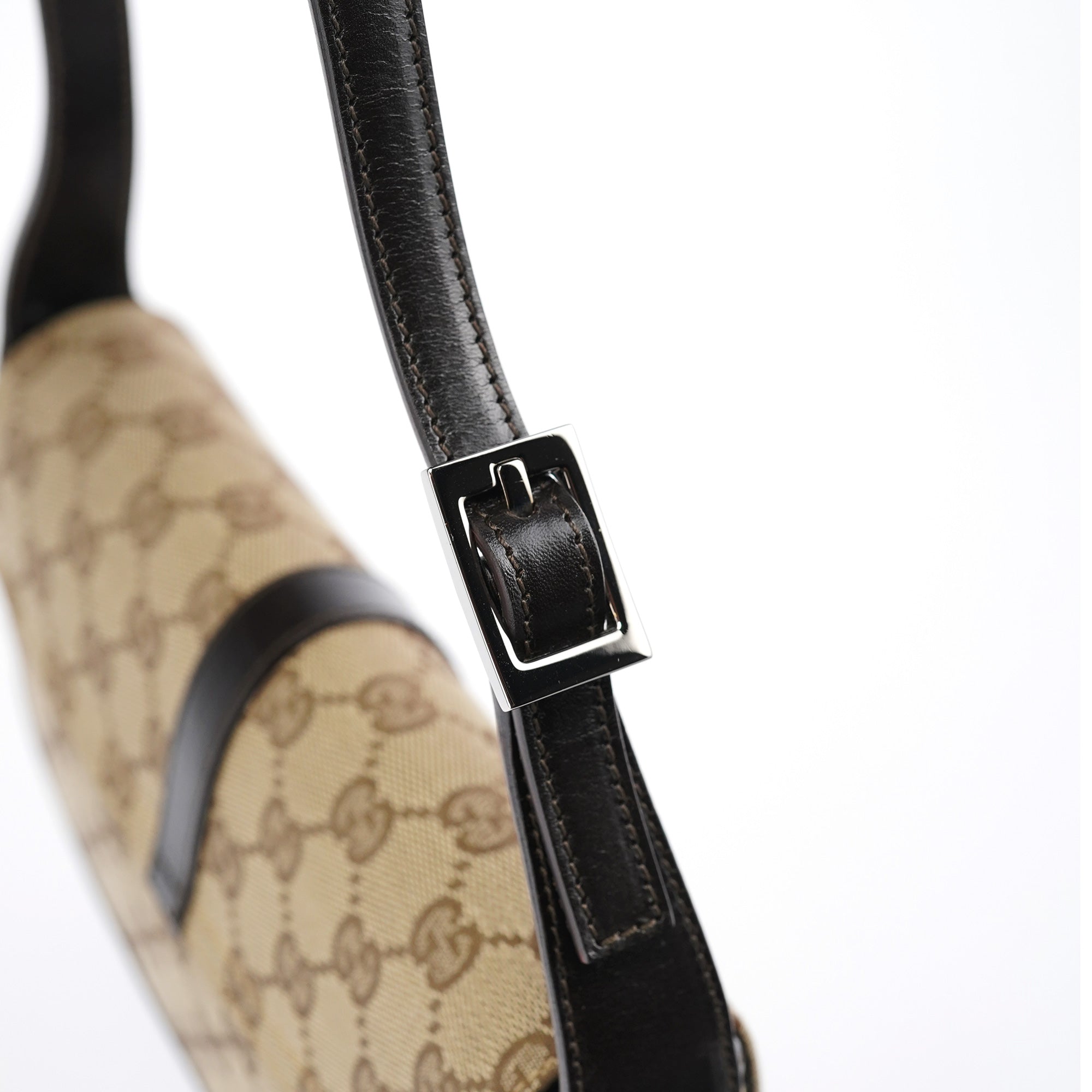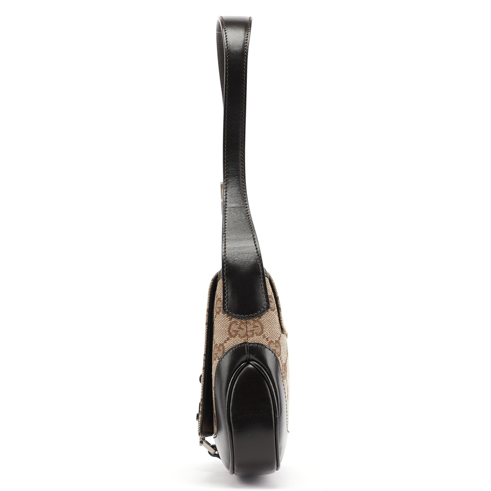 Designed in the late 1990s by Tom Ford, this vintage Gucci shoulder bag features the classic beige and brown GG monogram canvas with dark brown leather trim and the understated elegance that predated Tom Ford's glamorous reinvention of the house. The adjustable leather shoulder strap, magnetic snap closure, and compact silhouette with interior zip pocket reflect the traditional craftsmanship and timeless functionality of pre-millennium Gucci accessories.