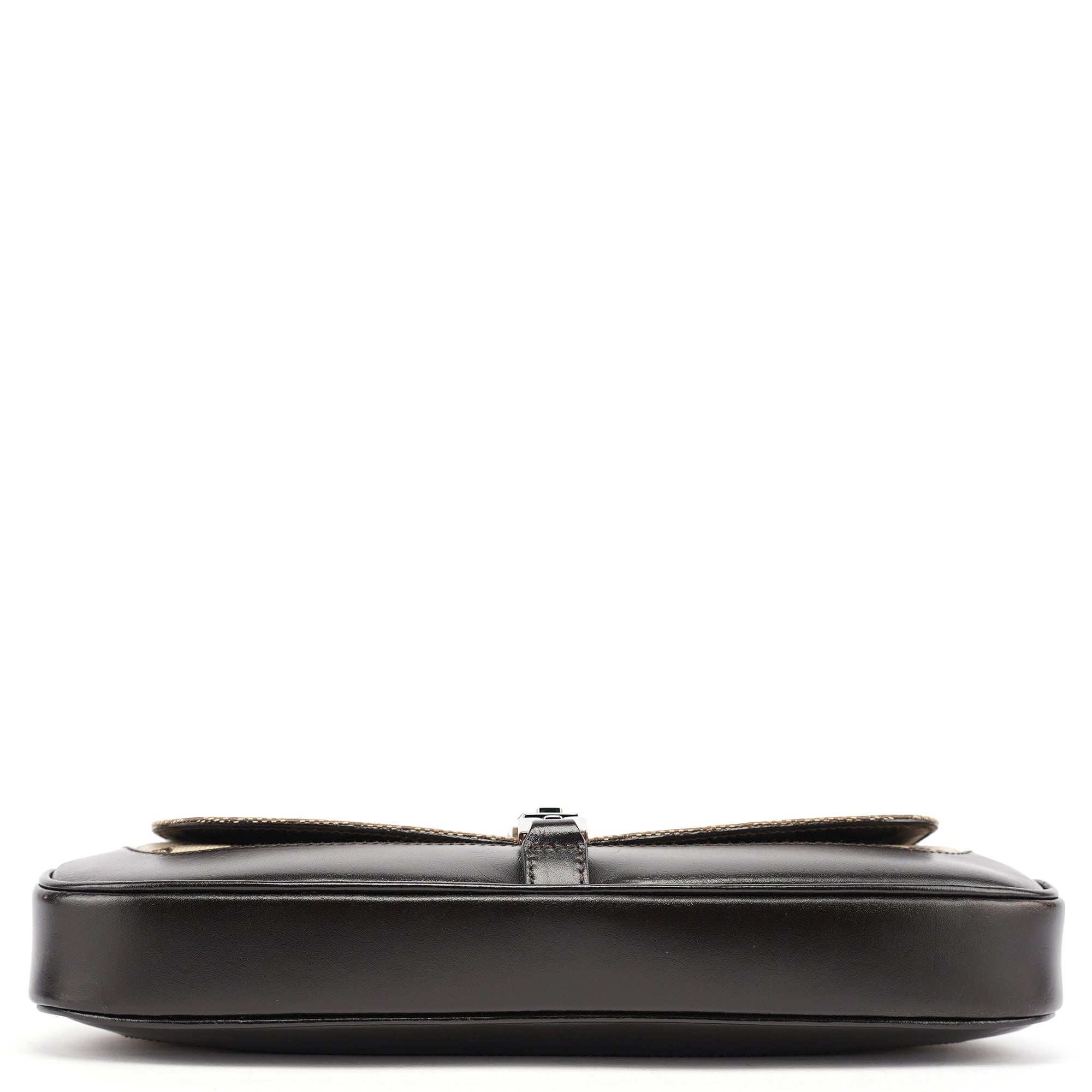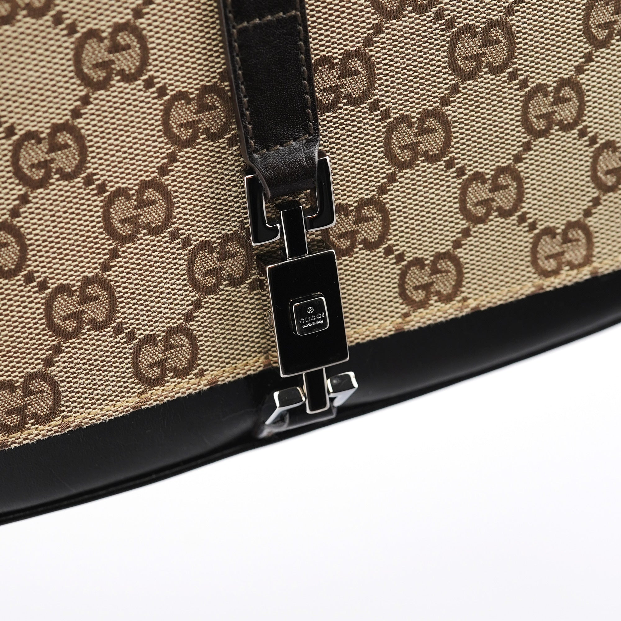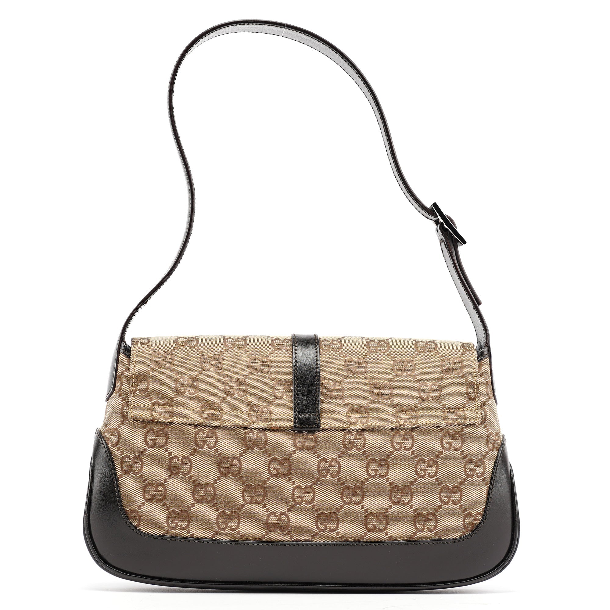 Designed in the late 1990s by Tom Ford, this vintage Gucci shoulder bag features the classic beige and brown GG monogram canvas with dark brown leather trim and the understated elegance that predated Tom Ford's glamorous reinvention of the house. The adjustable leather shoulder strap, magnetic snap closure, and compact silhouette with interior zip pocket reflect the traditional craftsmanship and timeless functionality of pre-millennium Gucci accessories.