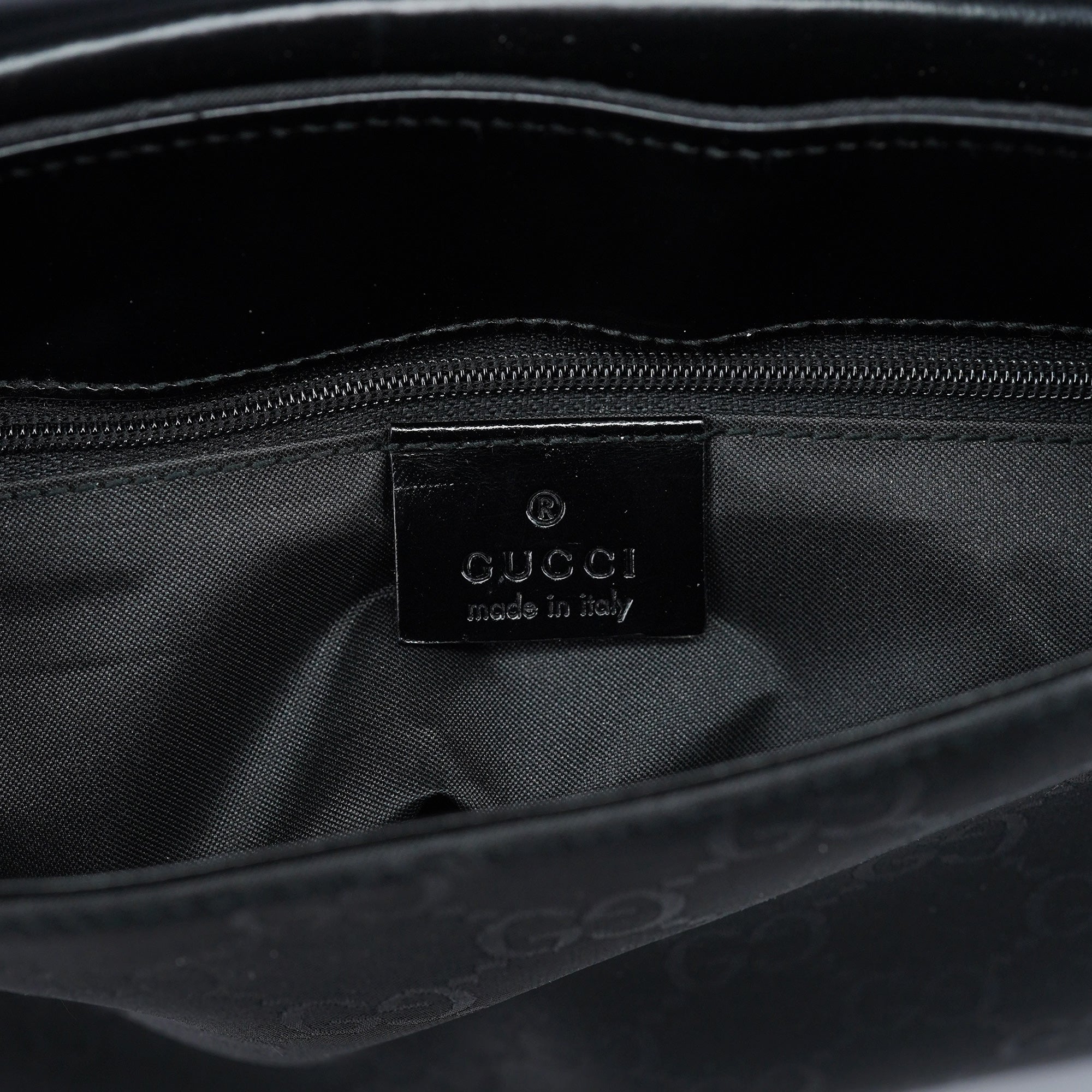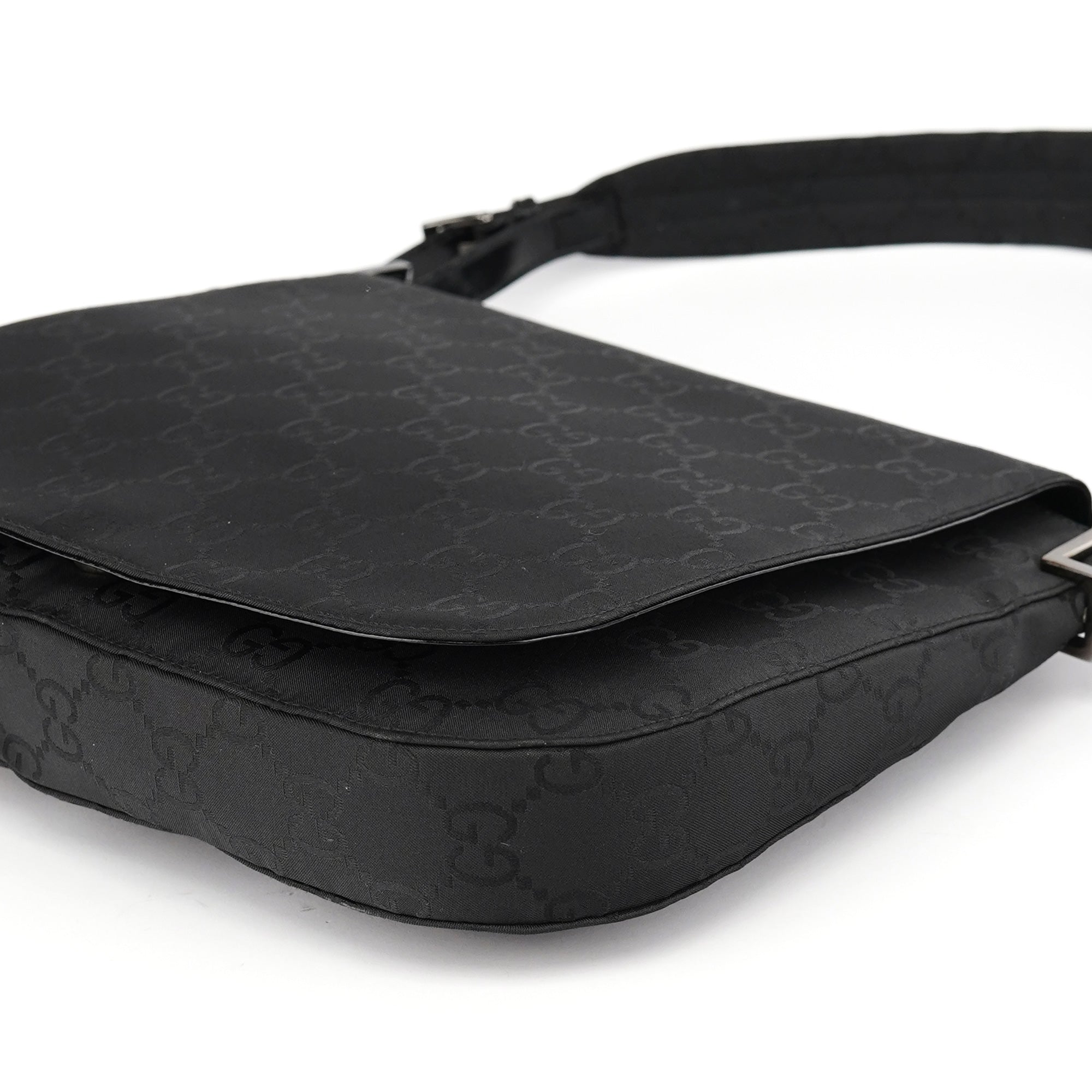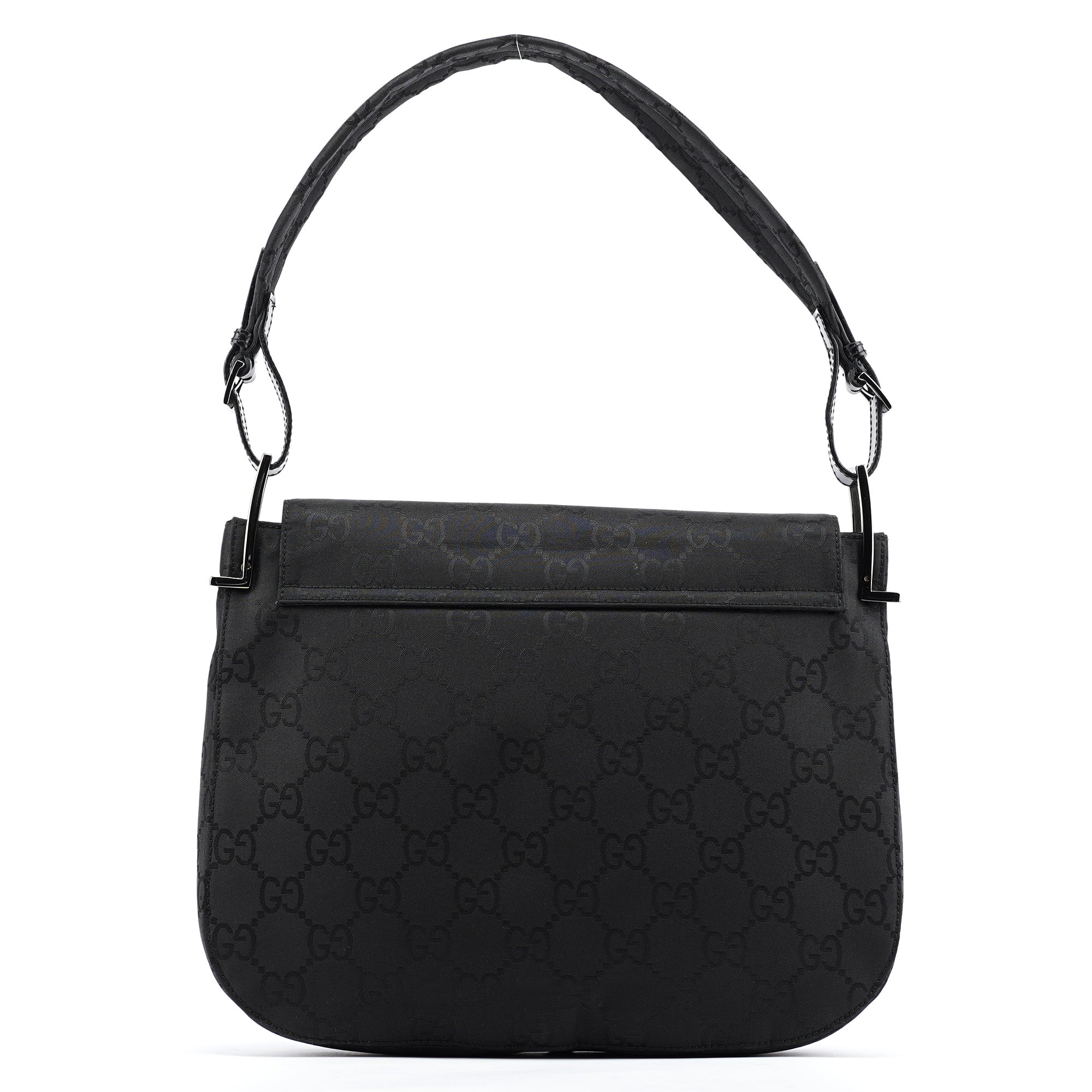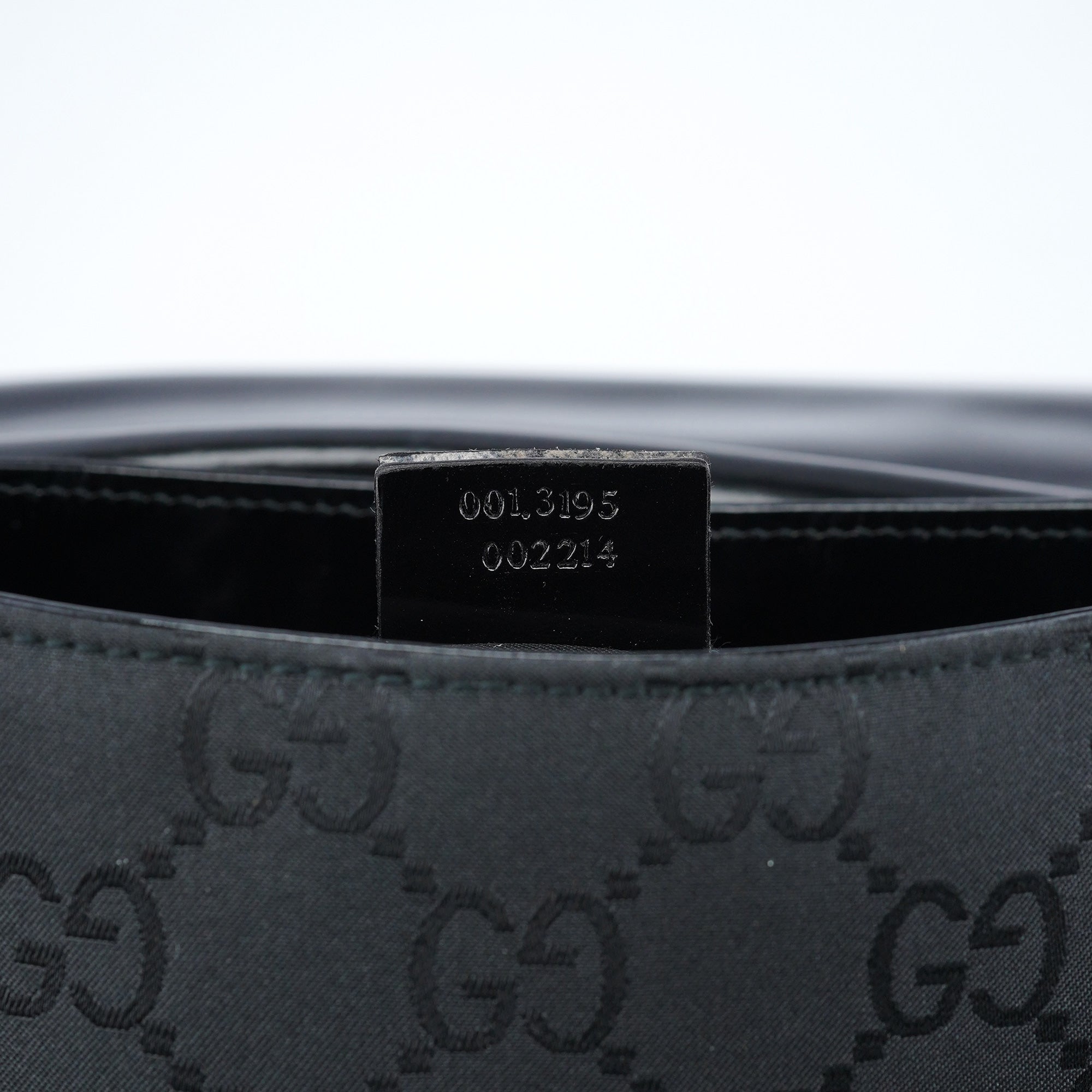 Designed in the late 1990s by Tom Ford, this vintage Gucci GG hobo shoulder bag showcases the timeless GG monogram pattern that defined the house's accessories before Tom Ford's arrival. Crafted in black GG canvas with a curved hobo silhouette, the bag features a flap closure with magnetic snap, silver-tone hardware, and a single adjustable shoulder strap. The interior is lined in black satin including an interior zipper pocket.