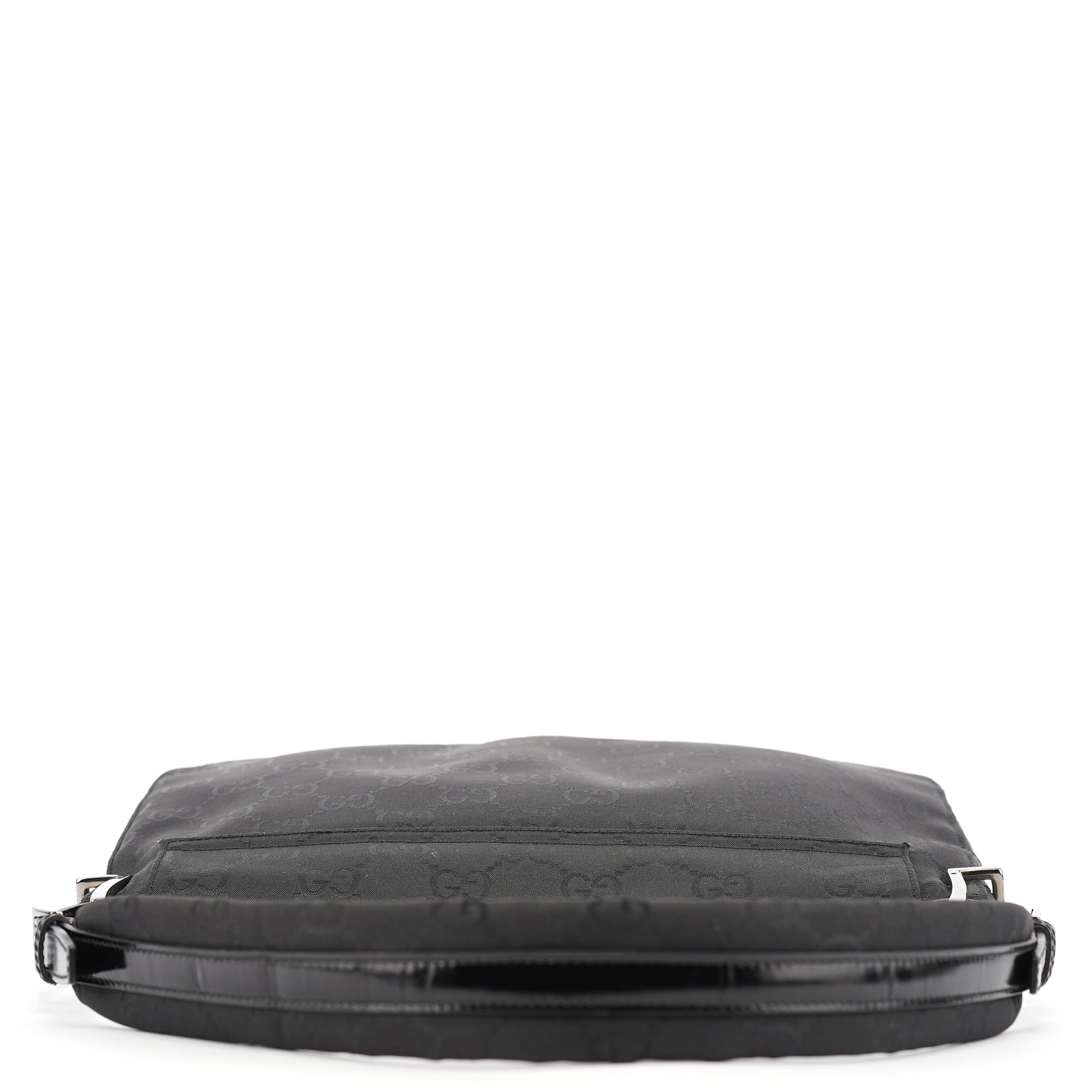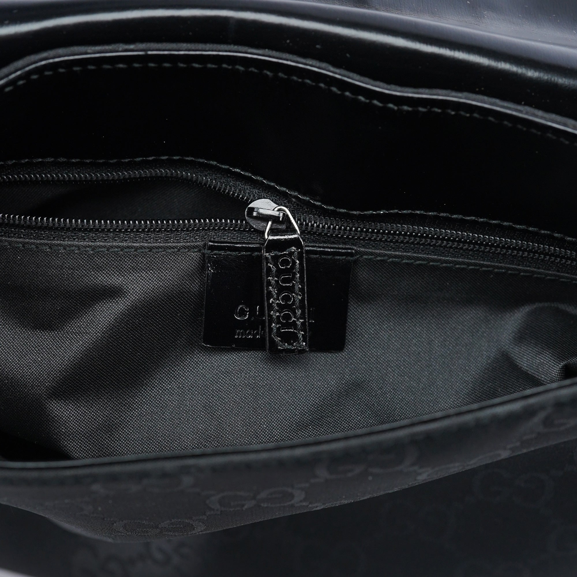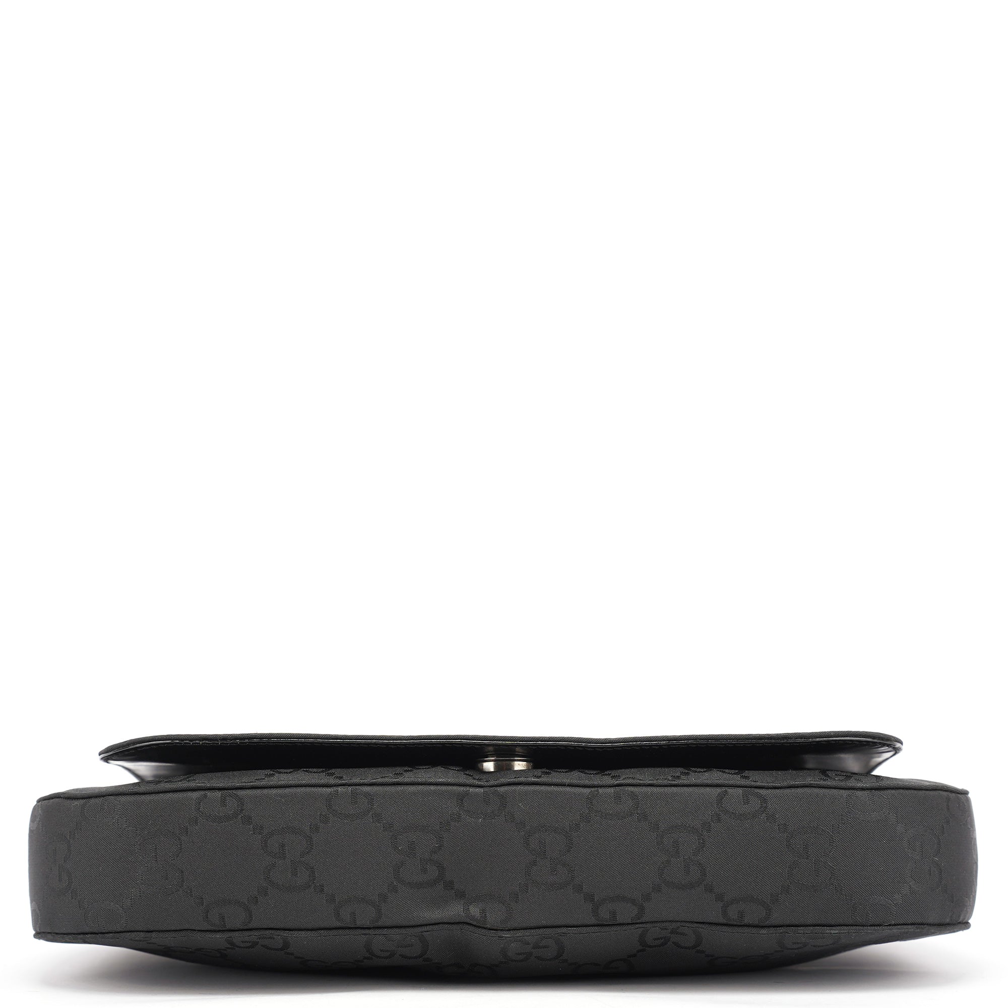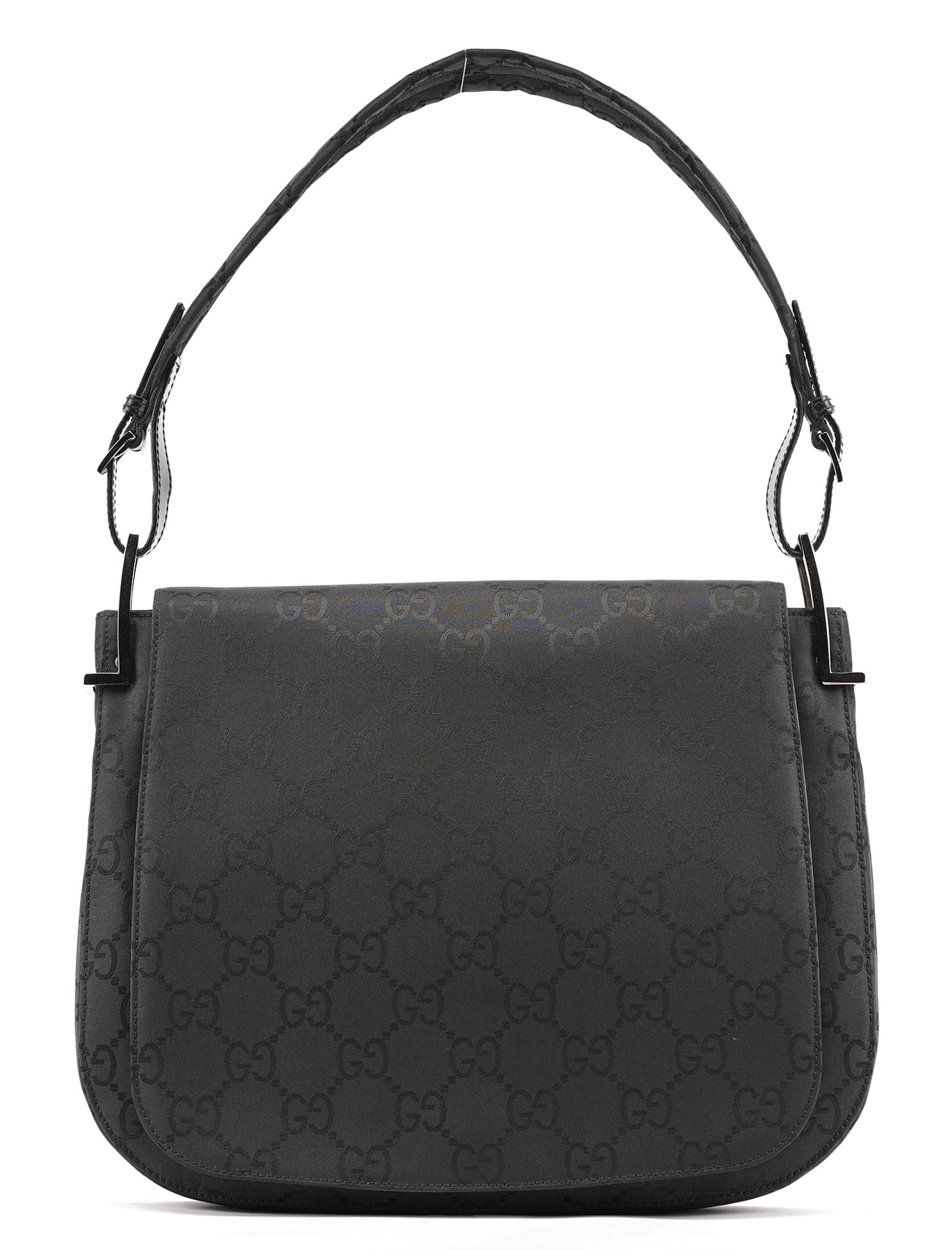Designed in the late 1990s by Tom Ford, this vintage Gucci GG hobo shoulder bag showcases the timeless GG monogram pattern that defined the house's accessories before Tom Ford's arrival. Crafted in black GG canvas with a curved hobo silhouette, the bag features a flap closure with magnetic snap, silver-tone hardware, and a single adjustable shoulder strap. The interior is lined in black satin including an interior zipper pocket.