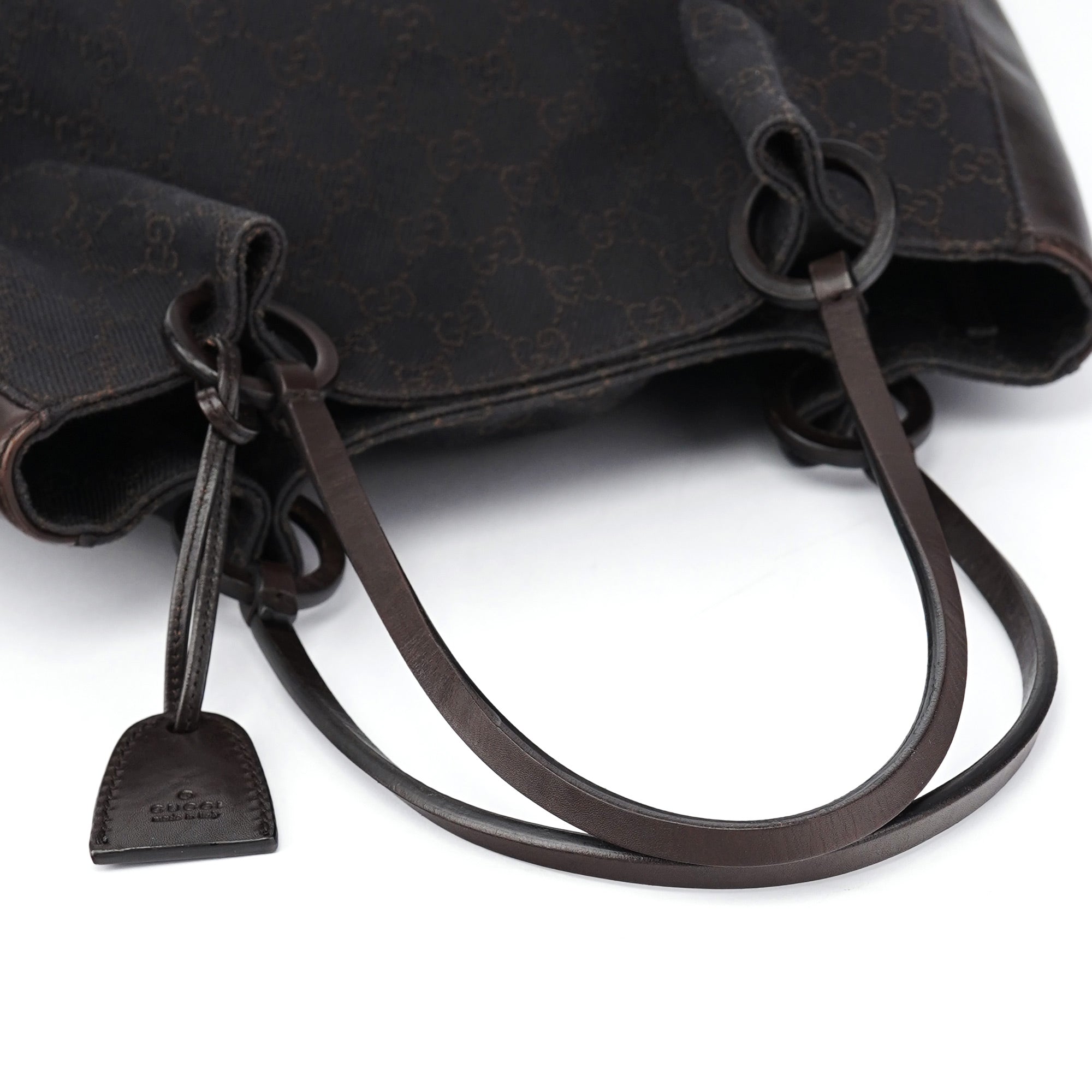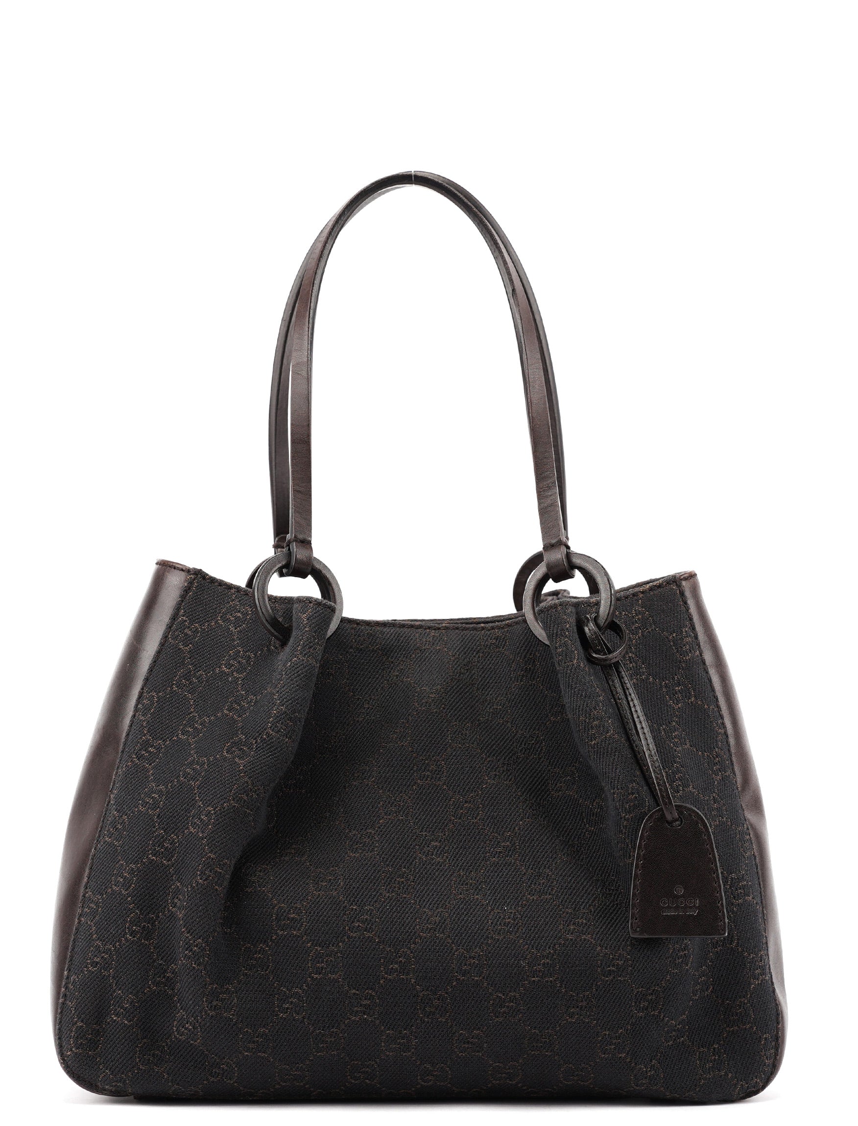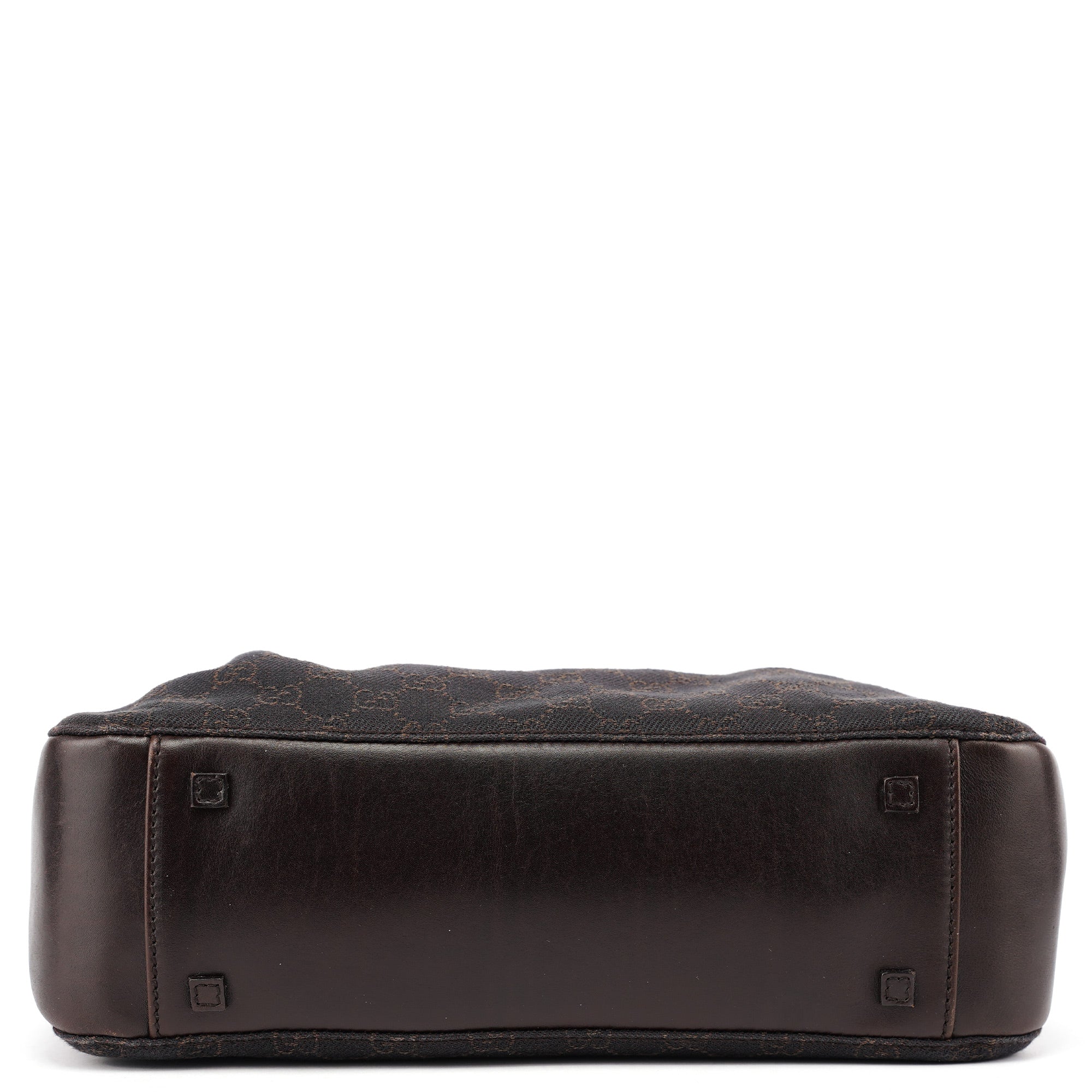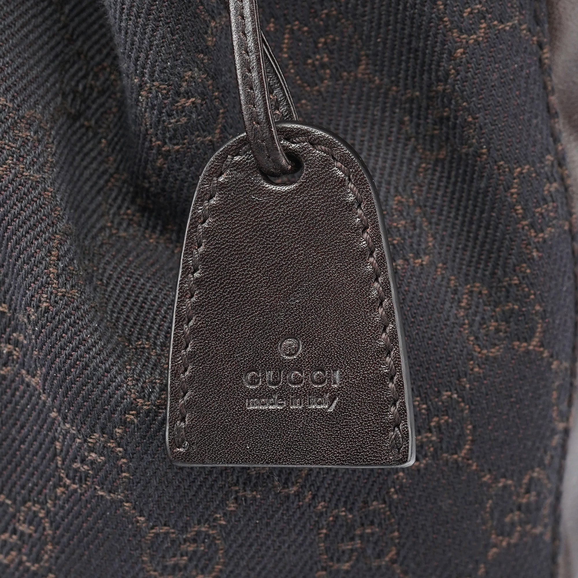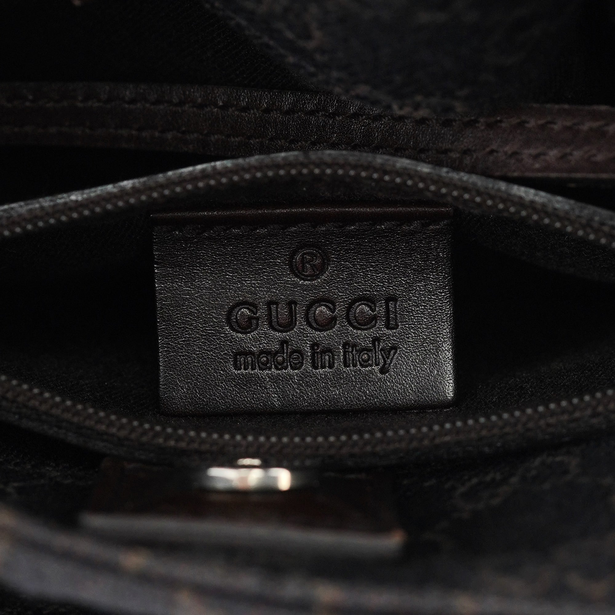 Designed by Tom Ford in the early 2000s, this rare Gucci GG hobo bag is handcrafted from dark brown GG monogram canvas and tonal calfskin leather trim. The open-top silhouette includes a matching leather zip pouch and a canvas-lined interior with a single slip pocket. A tonal leather luggage tag embossed with the Gucci logo adds a signature finish.