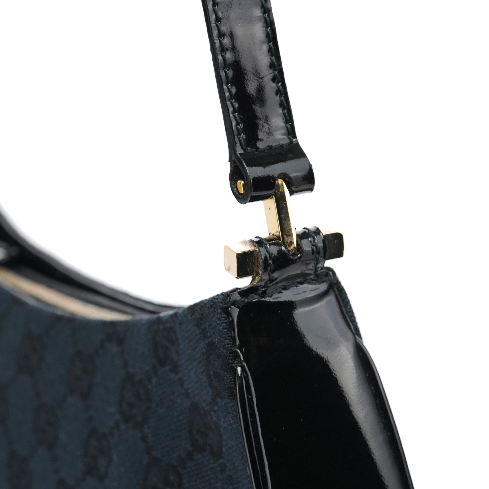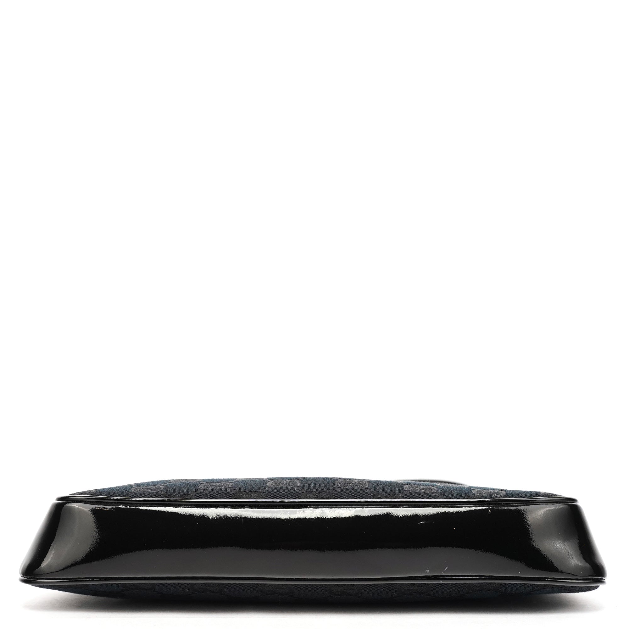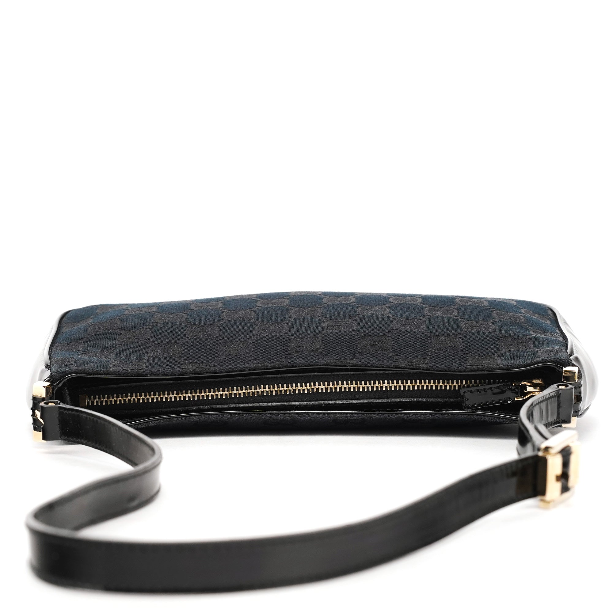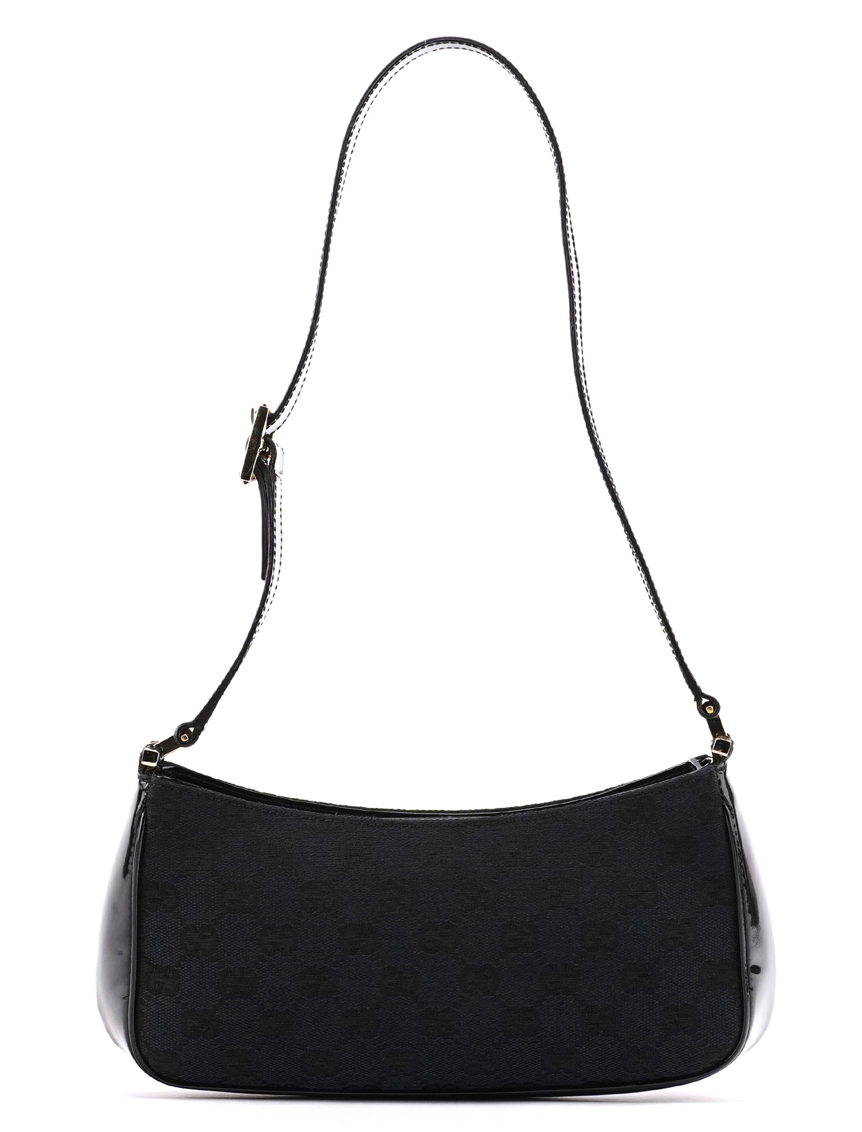 Designed in the late 1990s by Tom Ford, this Gucci shoulder bag features black GG monogram canvas with glossy patent leather trim. The curved baguette silhouette has a sleek adjustable patent leather shoulder strap and gold-tone hardware. The top is secured by a zipper closure, opening to a black fabric-lined interior compartment.