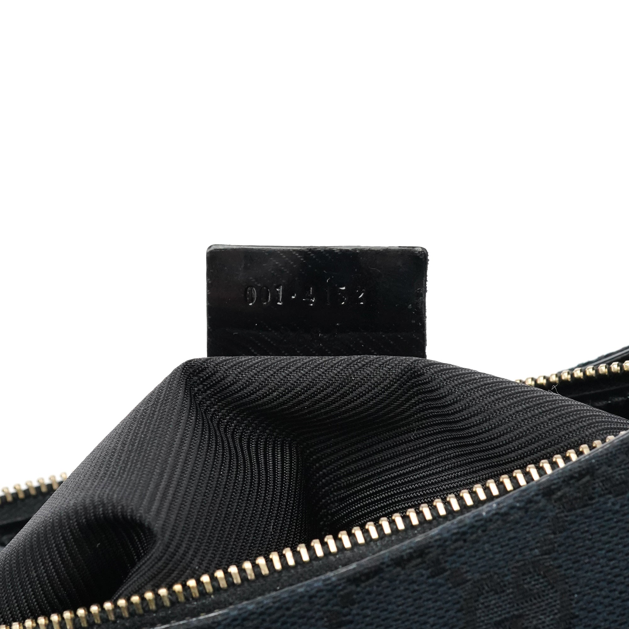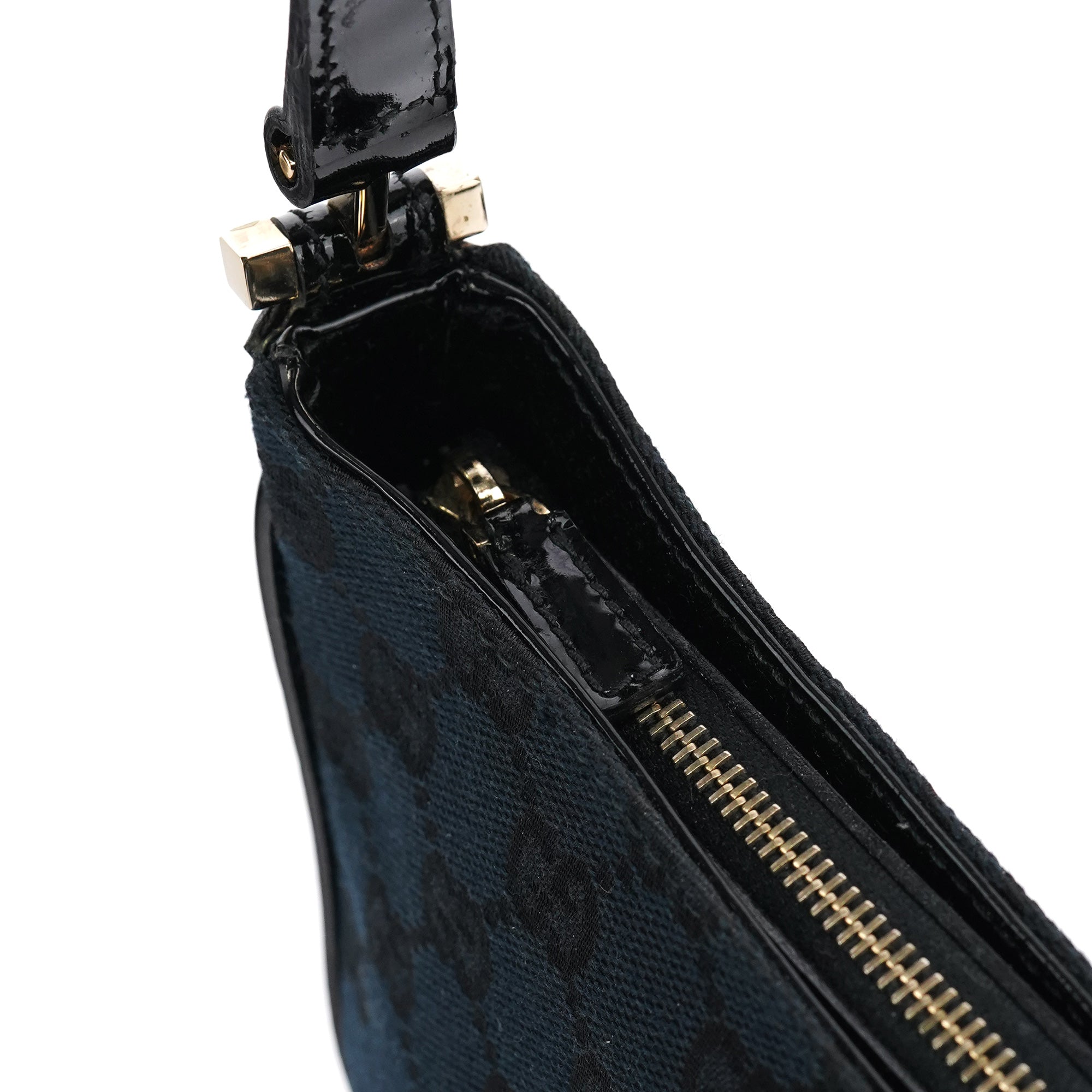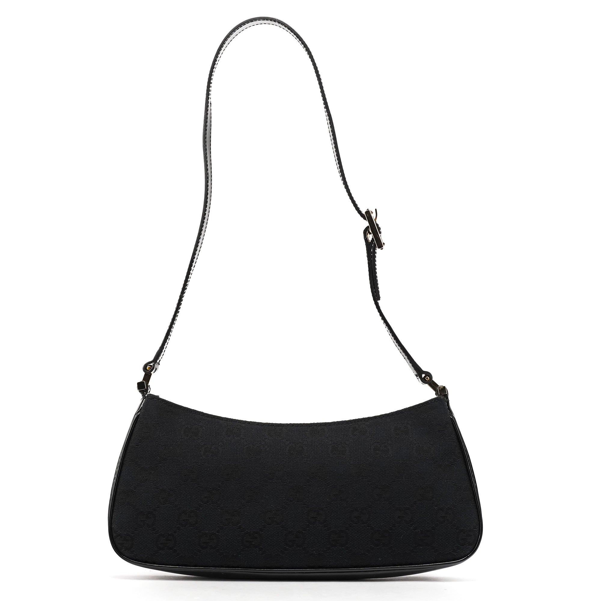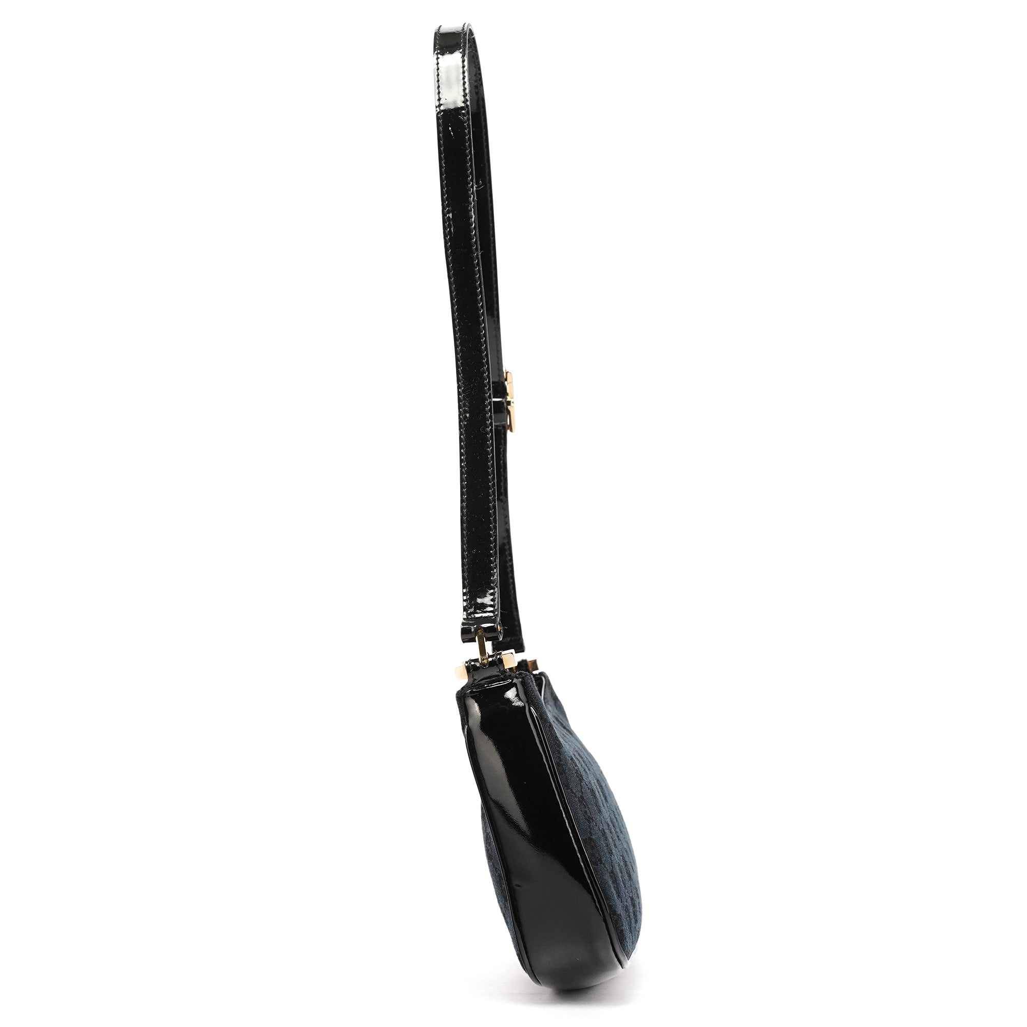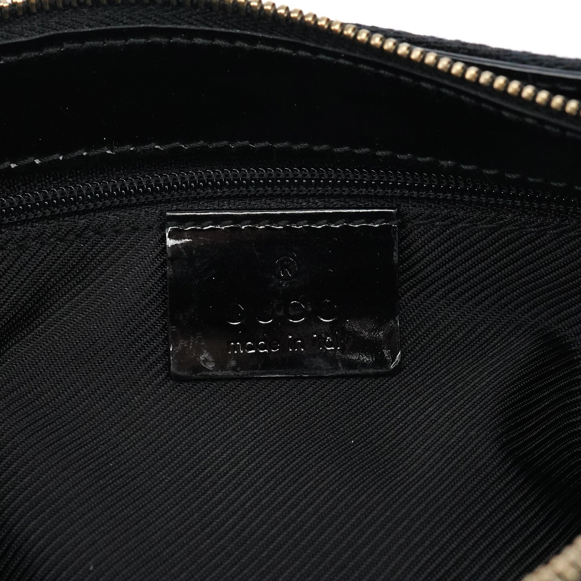 Designed in the late 1990s by Tom Ford, this Gucci shoulder bag features black GG monogram canvas with glossy patent leather trim. The curved baguette silhouette has a sleek adjustable patent leather shoulder strap and gold-tone hardware. The top is secured by a zipper closure, opening to a black fabric-lined interior compartment.