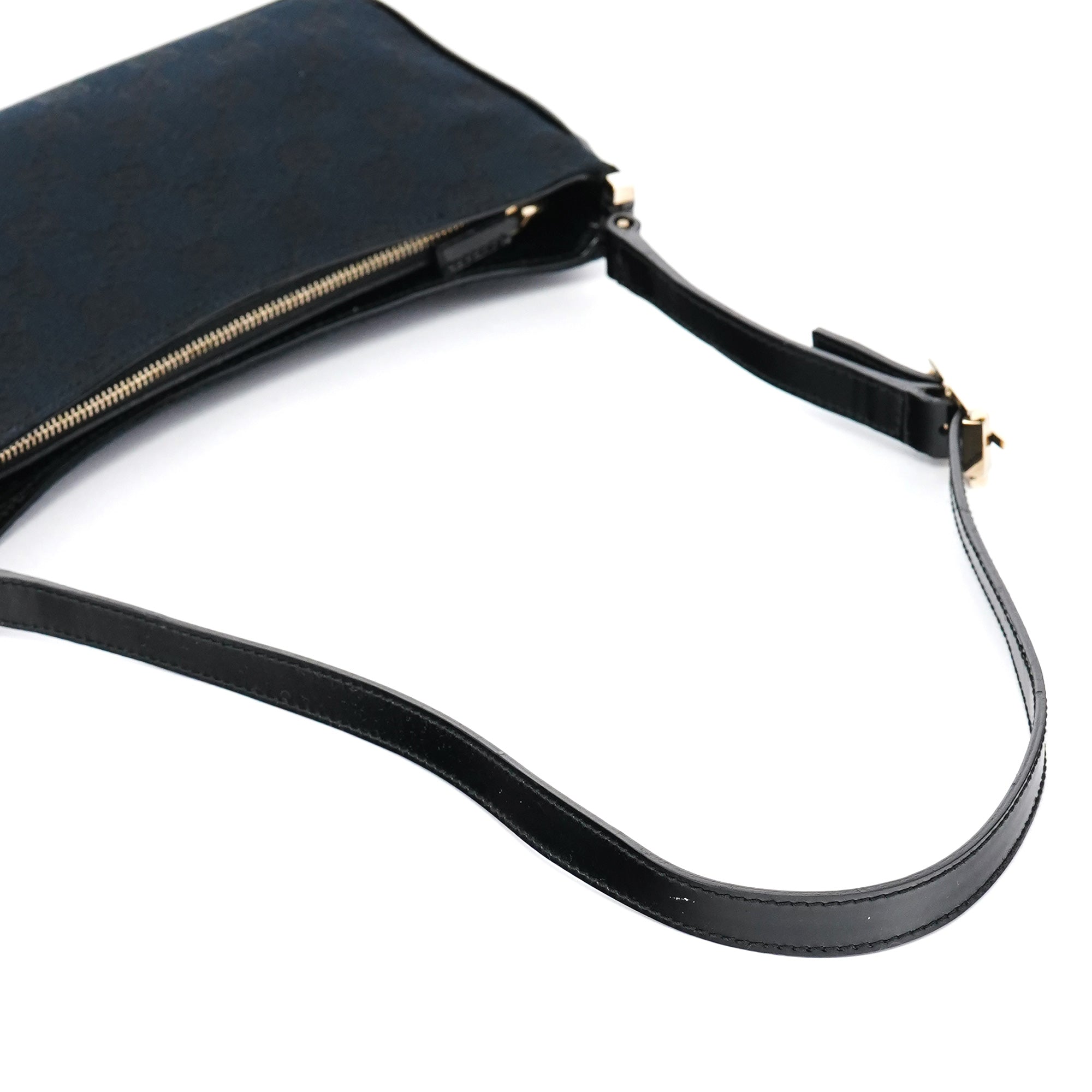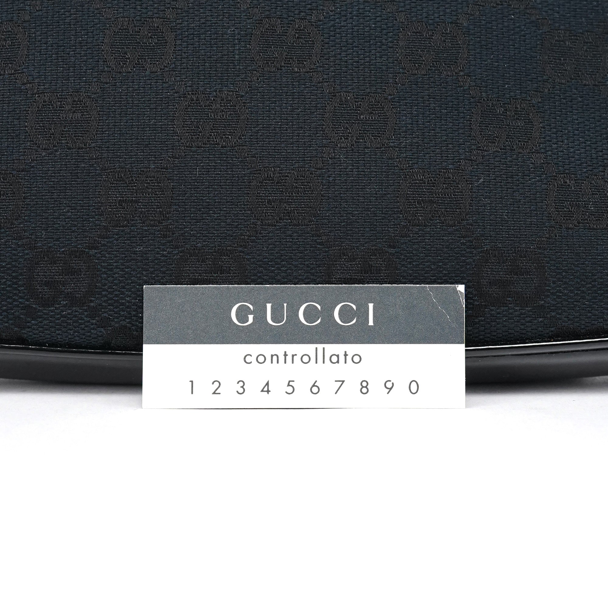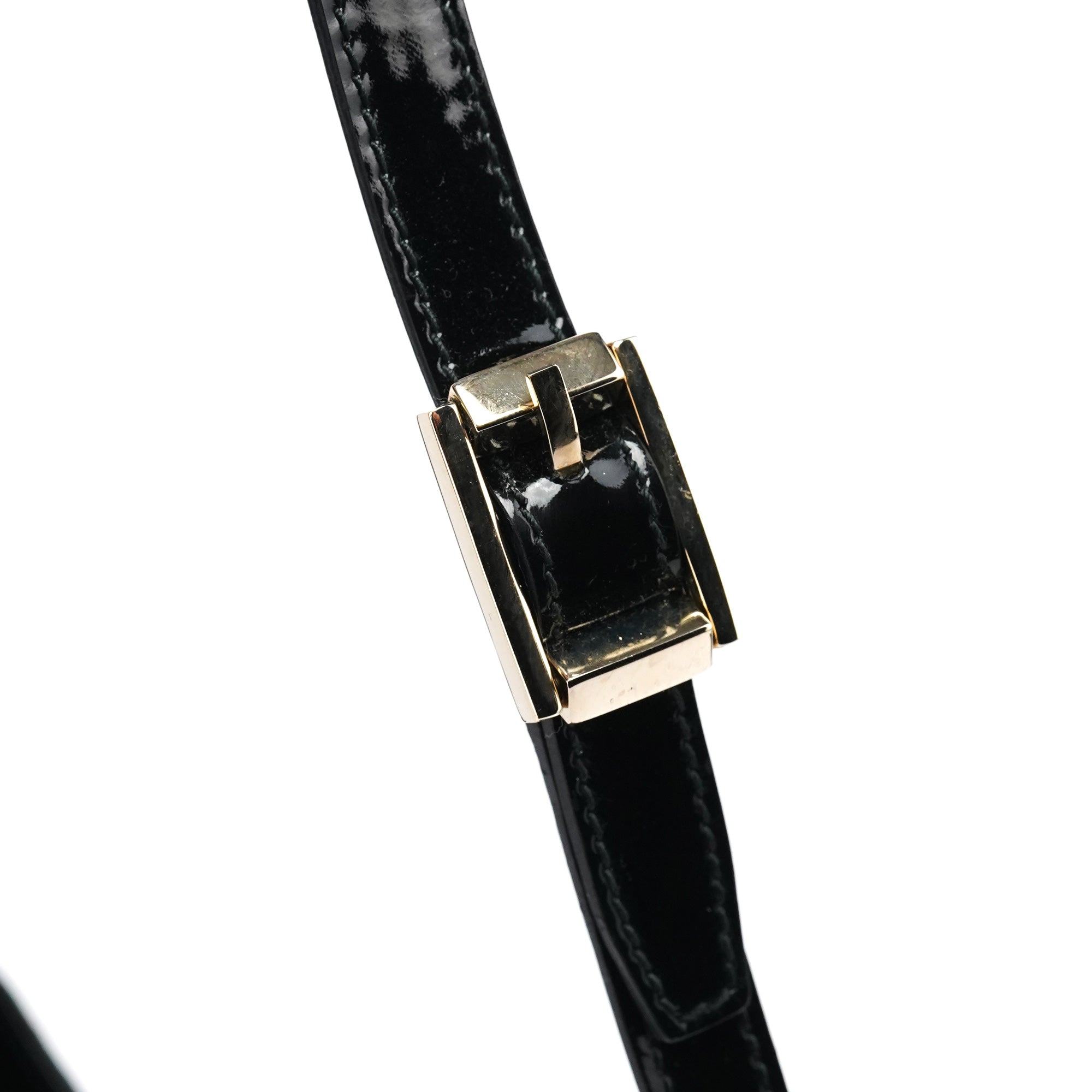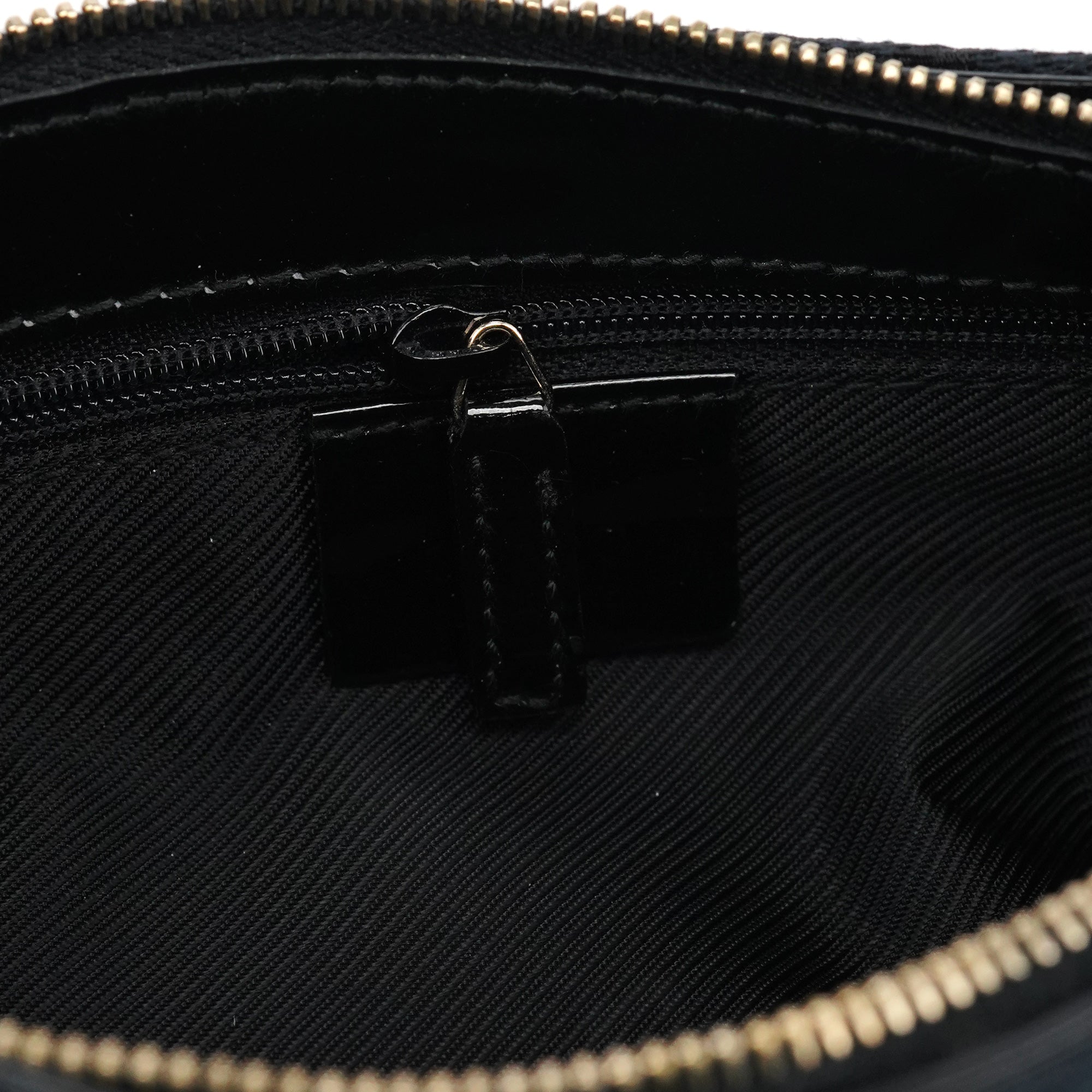 Designed in the late 1990s by Tom Ford, this Gucci shoulder bag features black GG monogram canvas with glossy patent leather trim. The curved baguette silhouette has a sleek adjustable patent leather shoulder strap and gold-tone hardware. The top is secured by a zipper closure, opening to a black fabric-lined interior compartment.