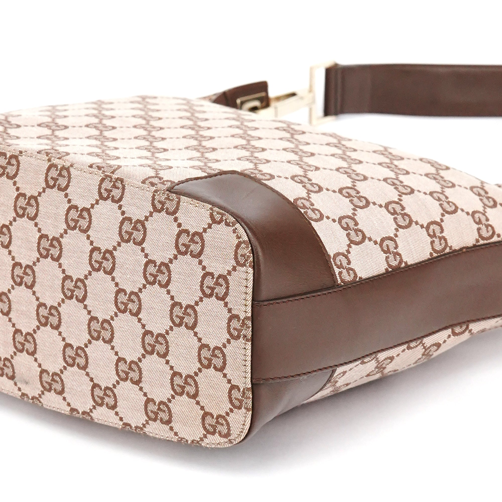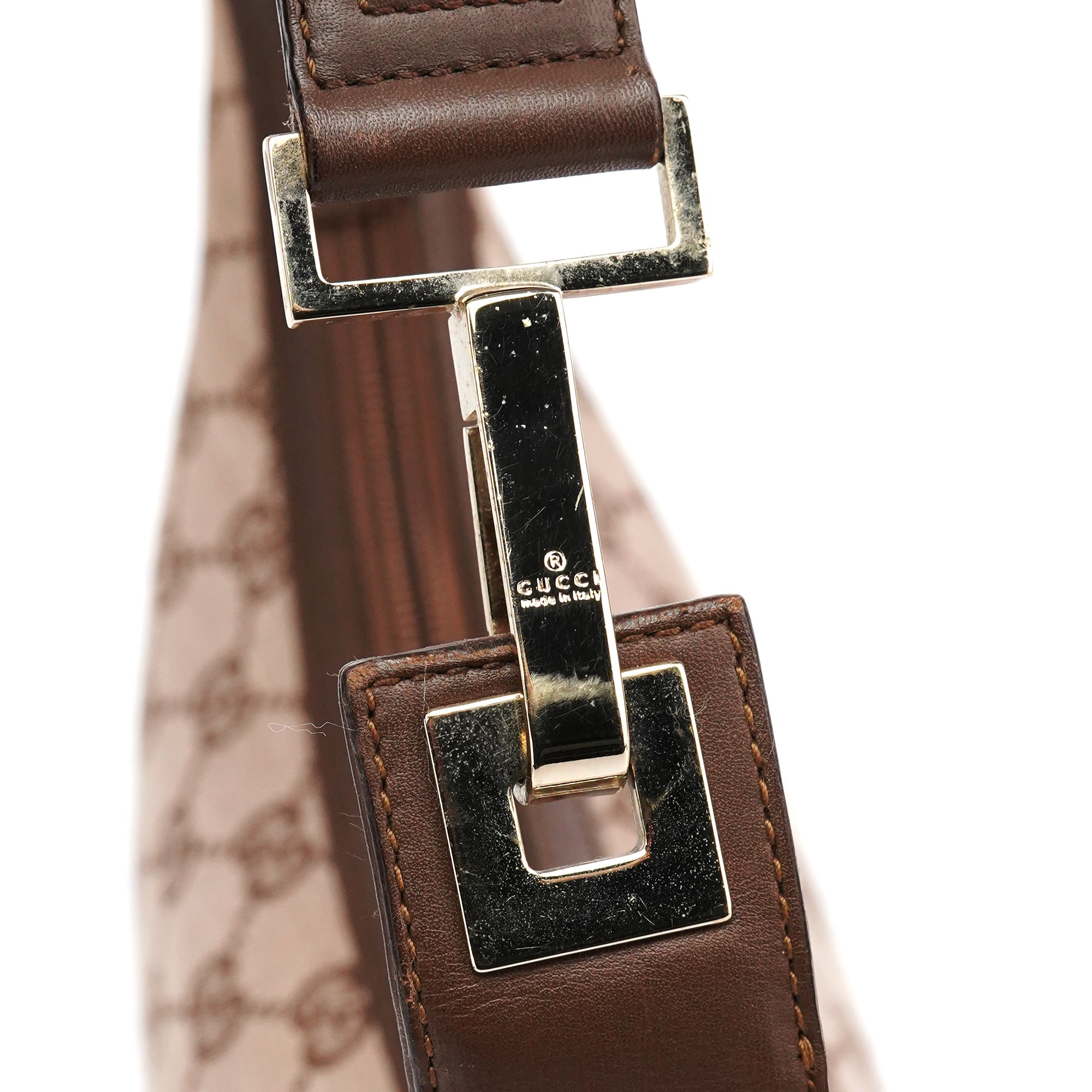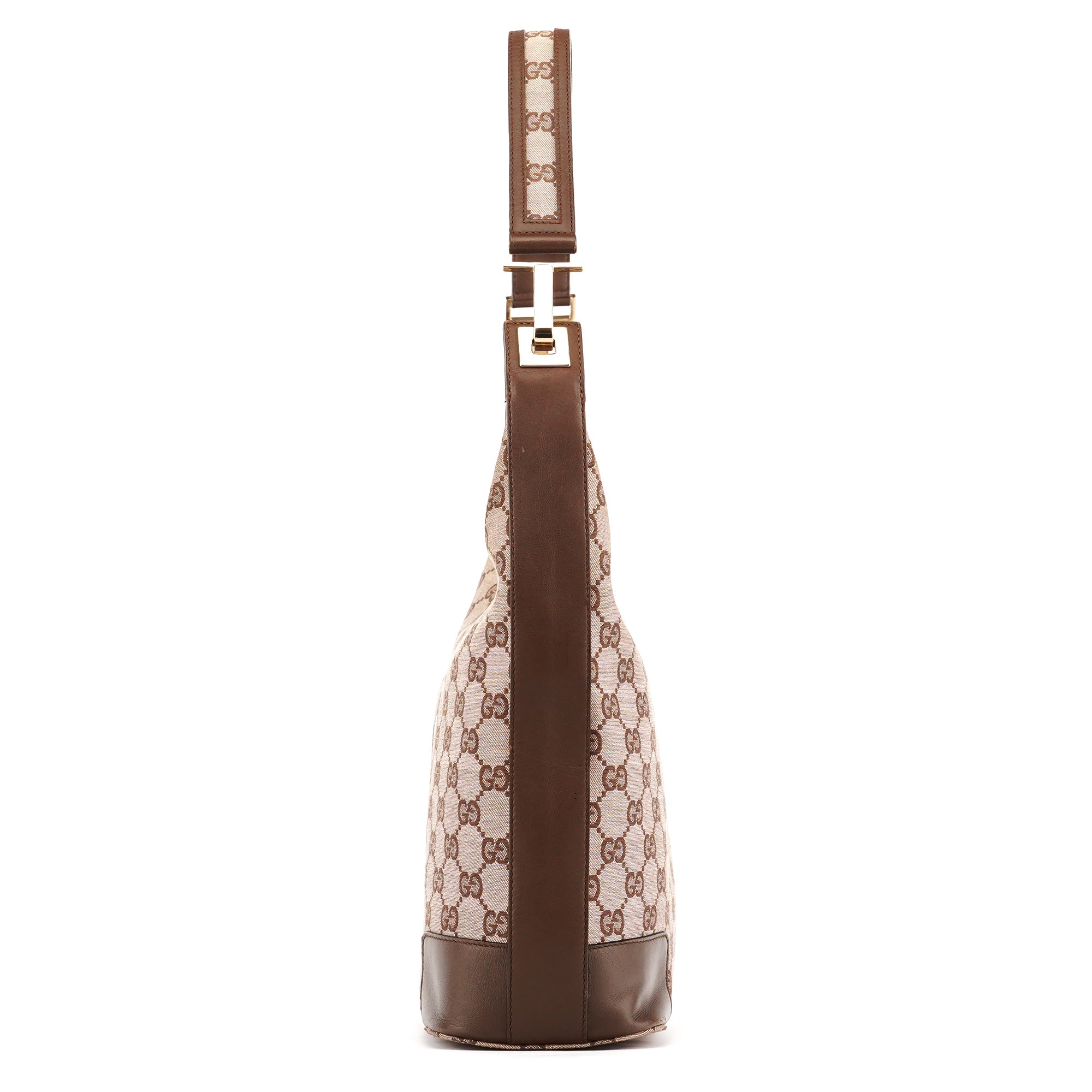 Designed in the late 1990s by Tom Ford, this Gucci shoulder bag is crafted in beige GG monogram canvas with smooth brown leather trim. The softly structured silhouette features a single shoulder strap with polished silver-tone hardware and a top zip closure.