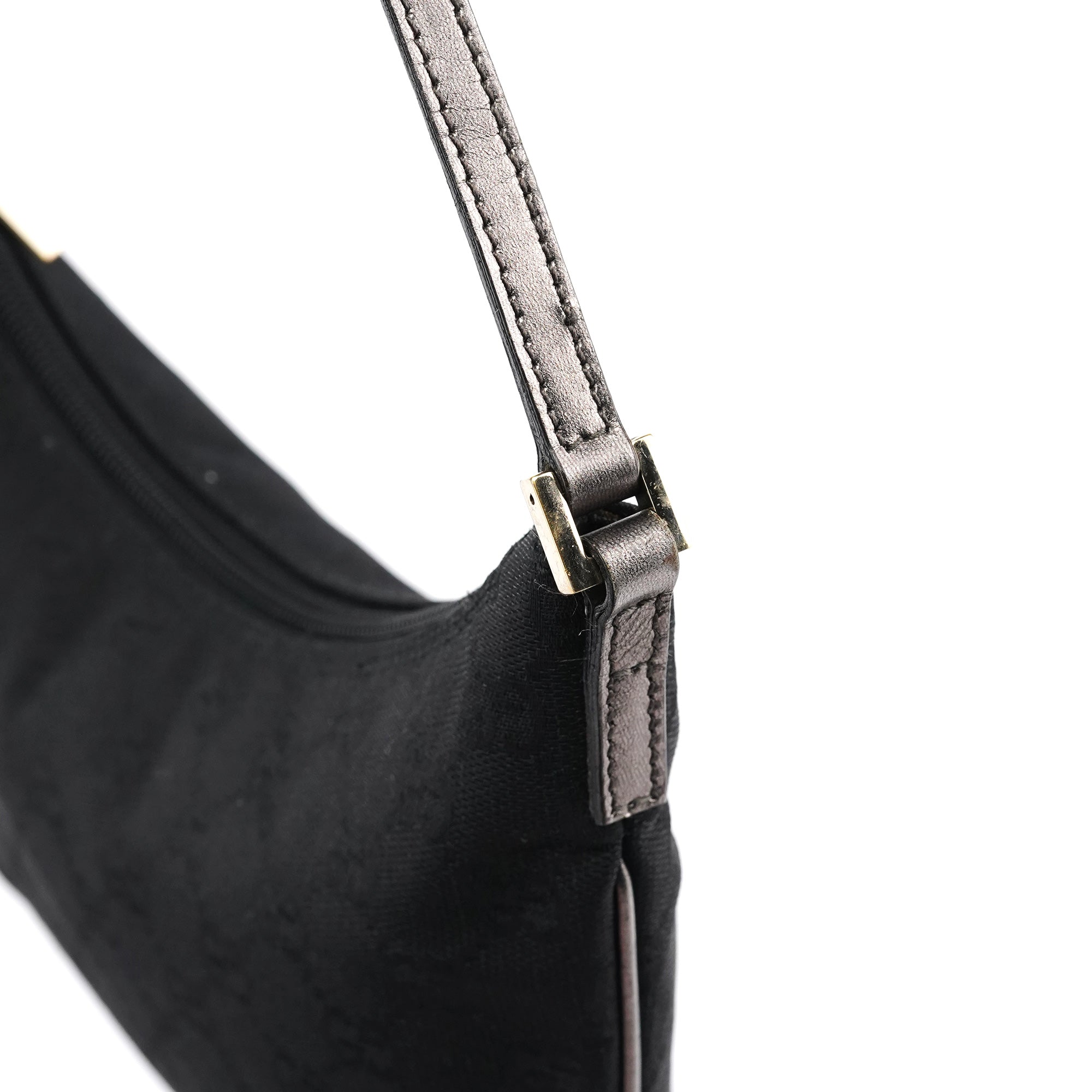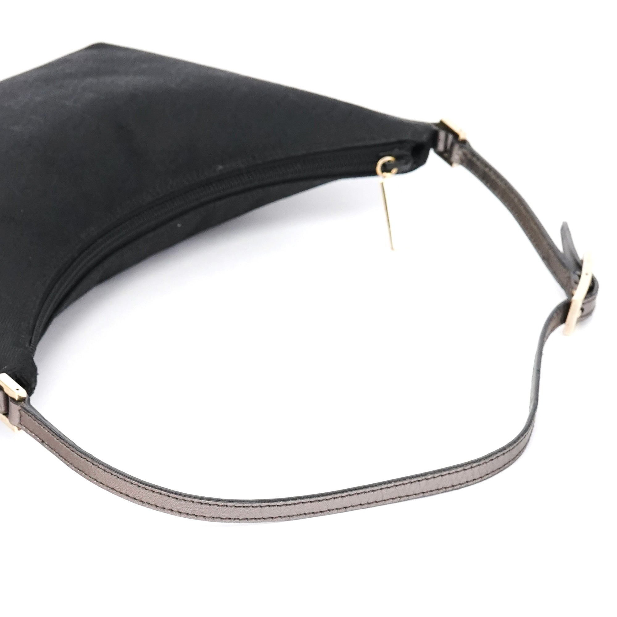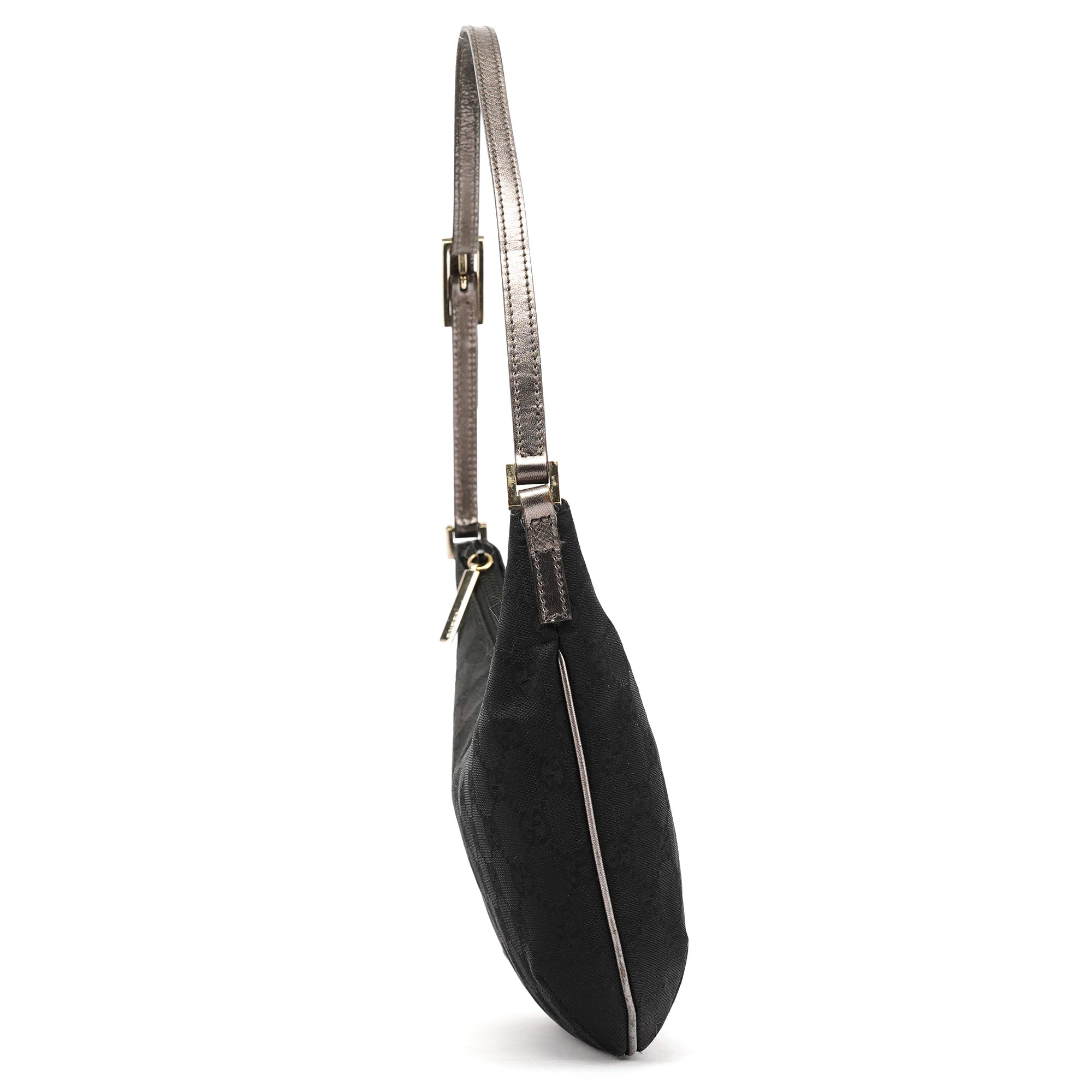 Designed in the late 1990s by Tom Ford, this Gucci shoulder bag is crafted from black GG monogram canvas with metallic leather trim. The crescent-shaped silhouette features an adjustable shoulder strap and a top zipper closure with a Gucci-engraved pull. The interior is lined in black canvas with one slip pocket.