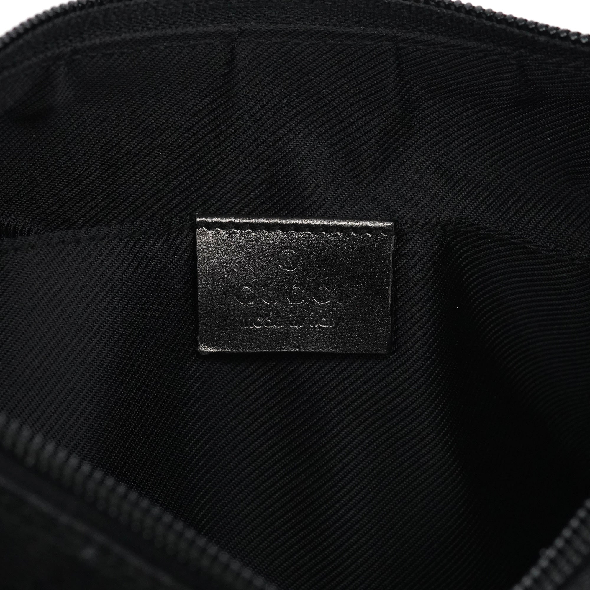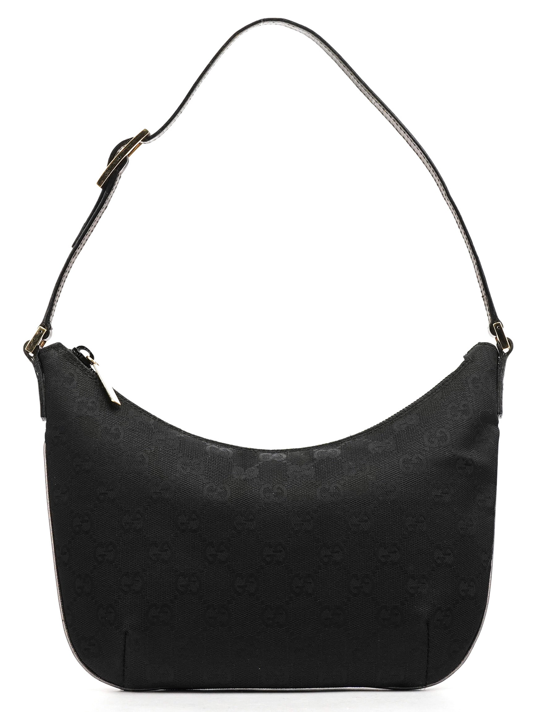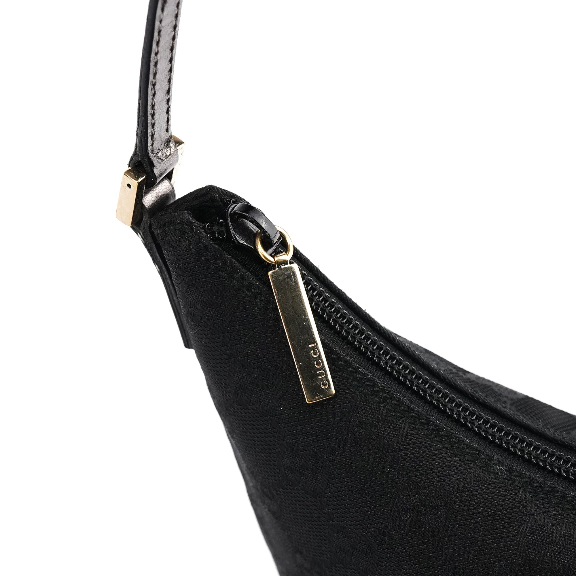 Designed in the late 1990s by Tom Ford, this Gucci shoulder bag is crafted from black GG monogram canvas with metallic leather trim. The crescent-shaped silhouette features an adjustable shoulder strap and a top zipper closure with a Gucci-engraved pull. The interior is lined in black canvas with one slip pocket.