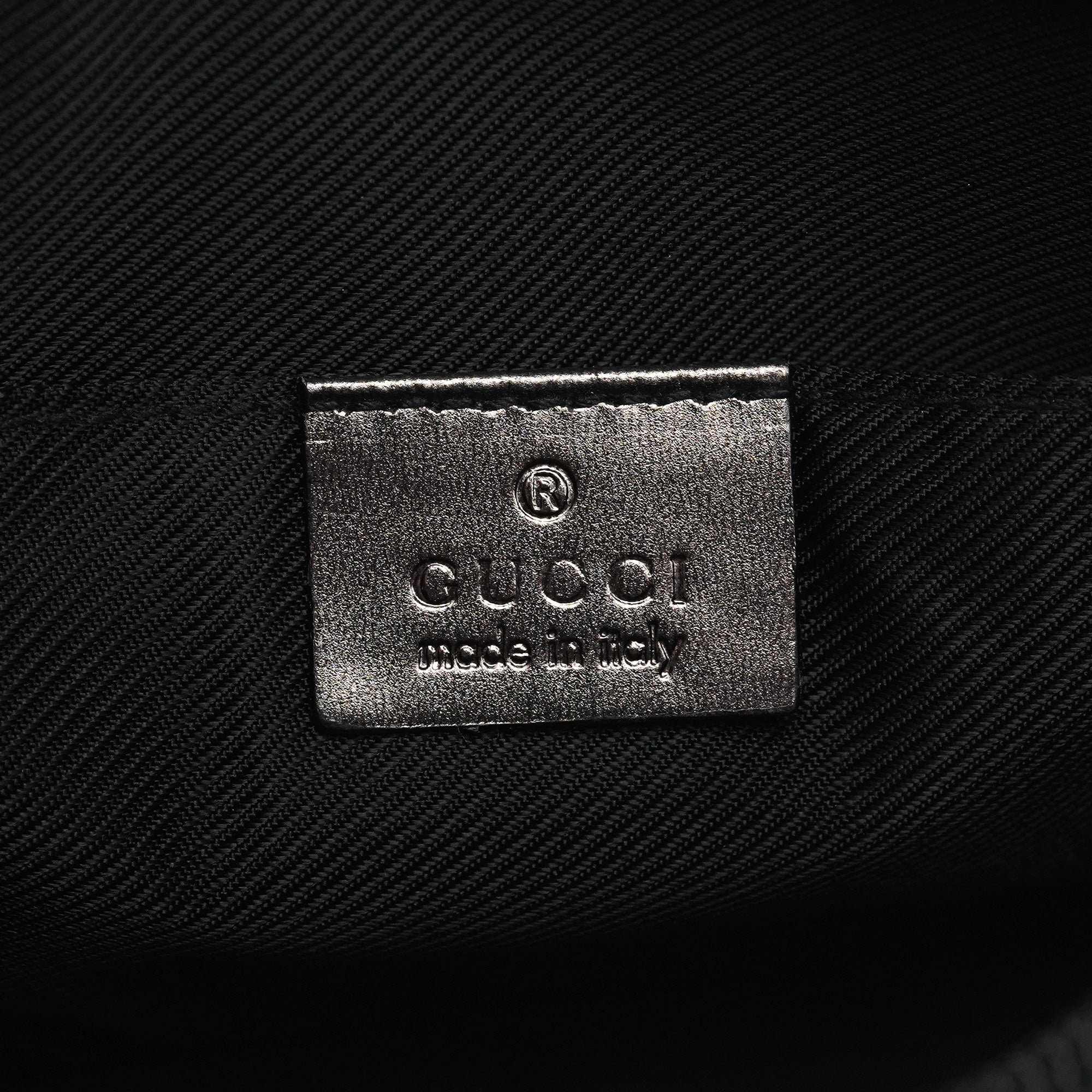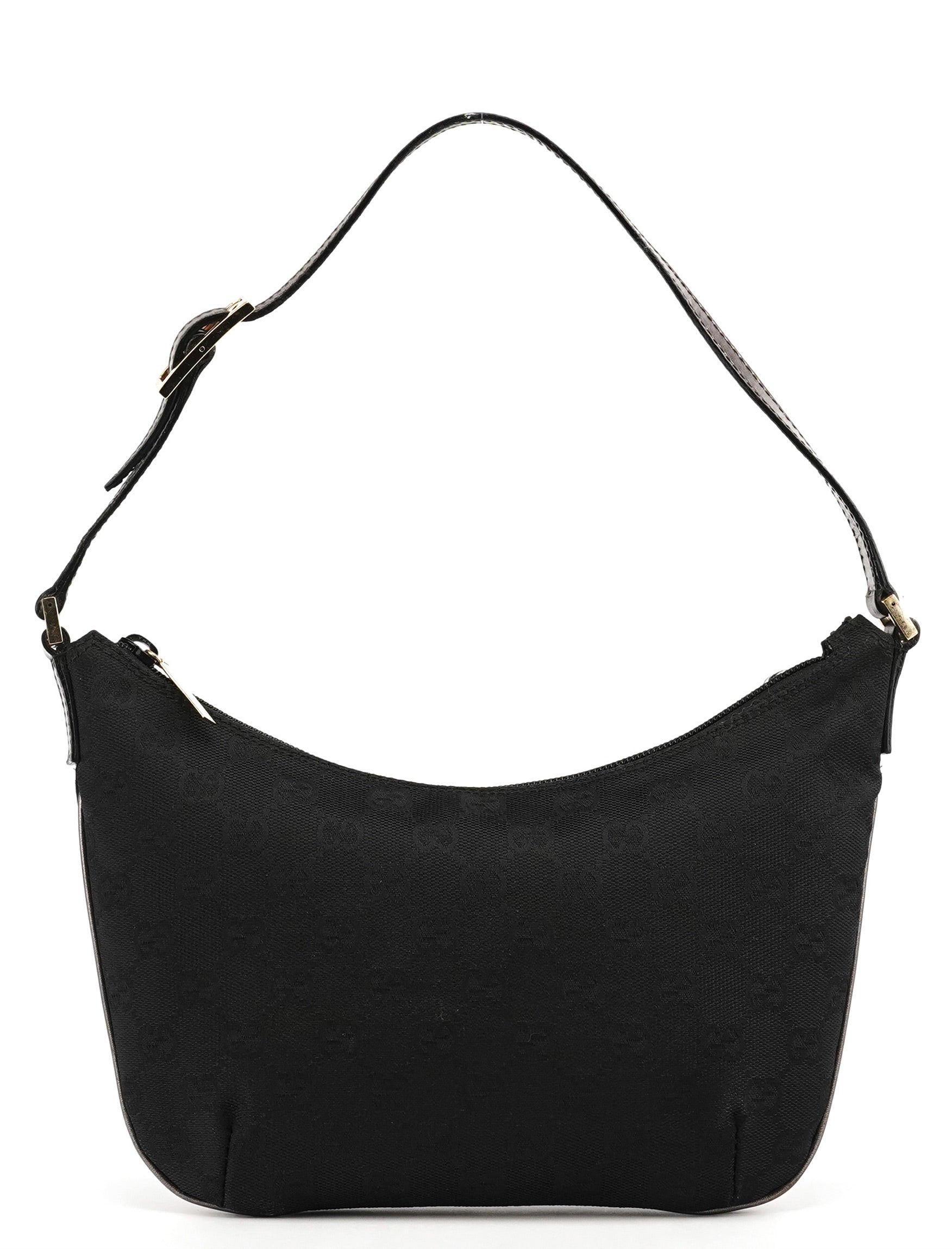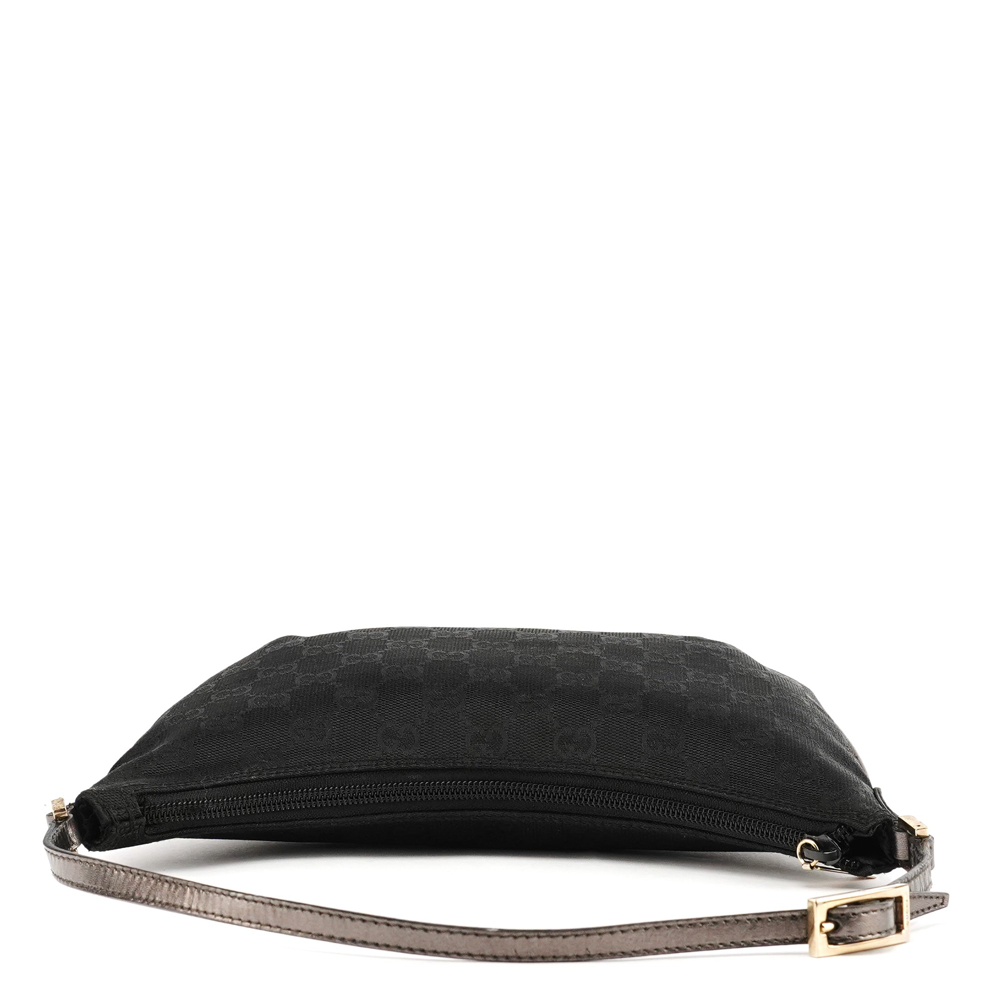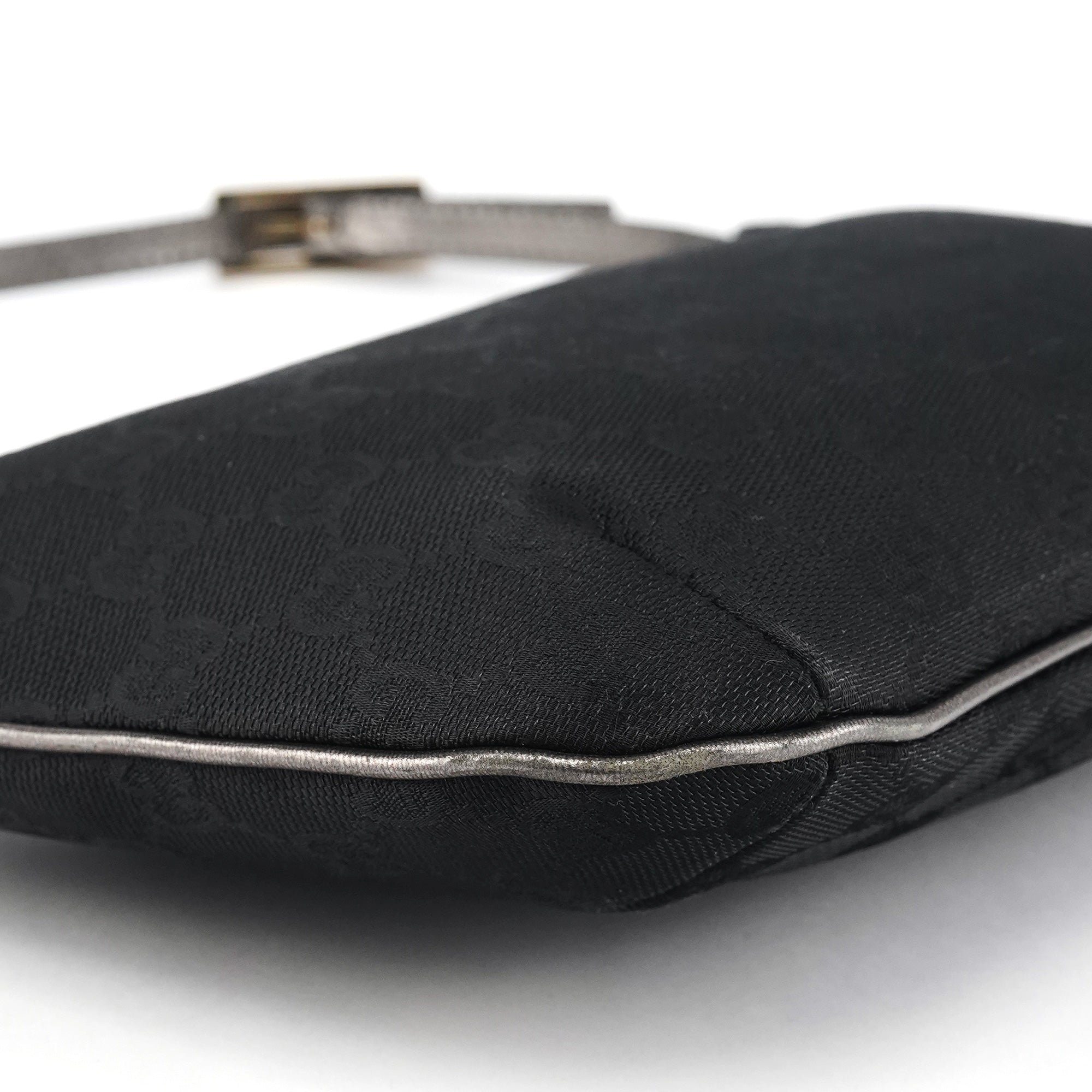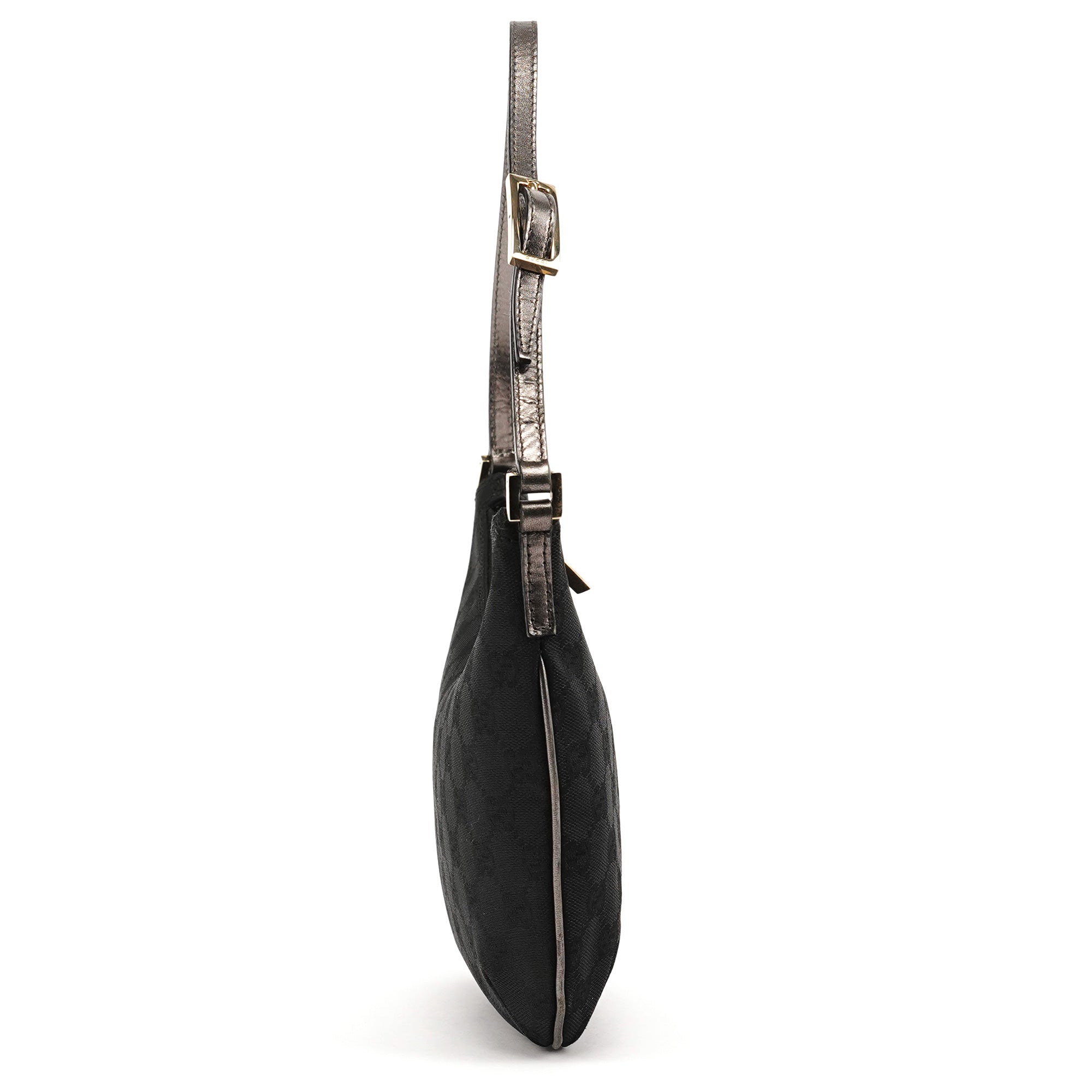 Designed in the late 1990s by Tom Ford, the Gucci GG shoulder bag is crafted from black monogram canvas with metallic leather trim and gold-tone hardware. The adjustable shoulder strap is detailed with a logo-engraved buckle, while the top zip opens to a black satin-lined interior. Sleek and minimalist, it captures the understated sensuality of Ford’s Gucci era.