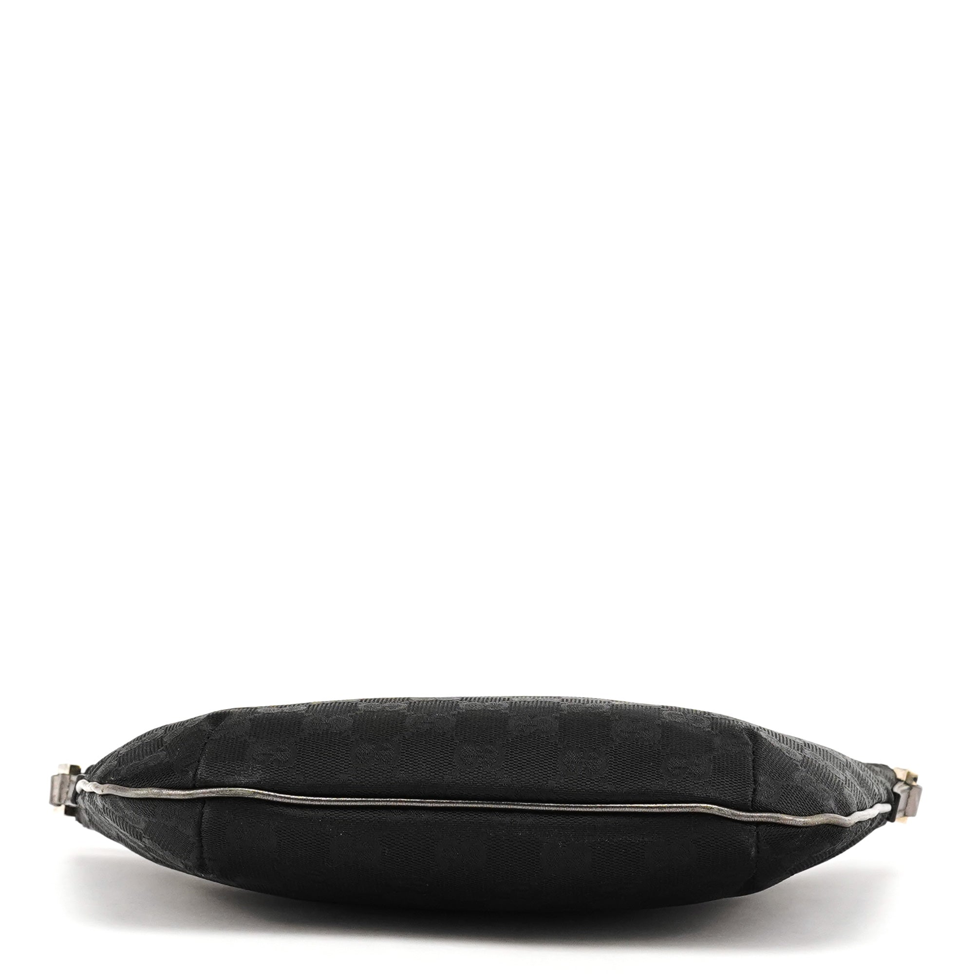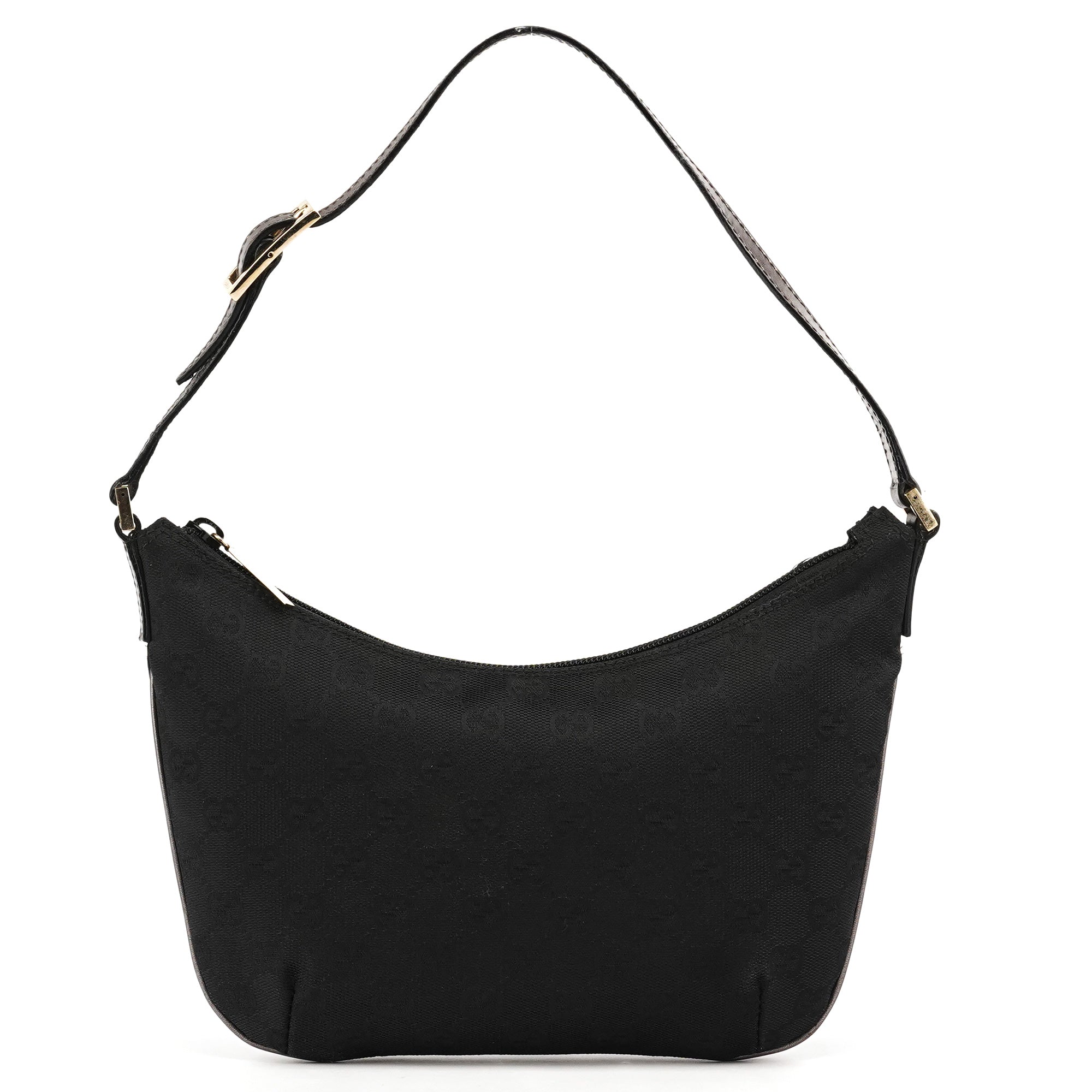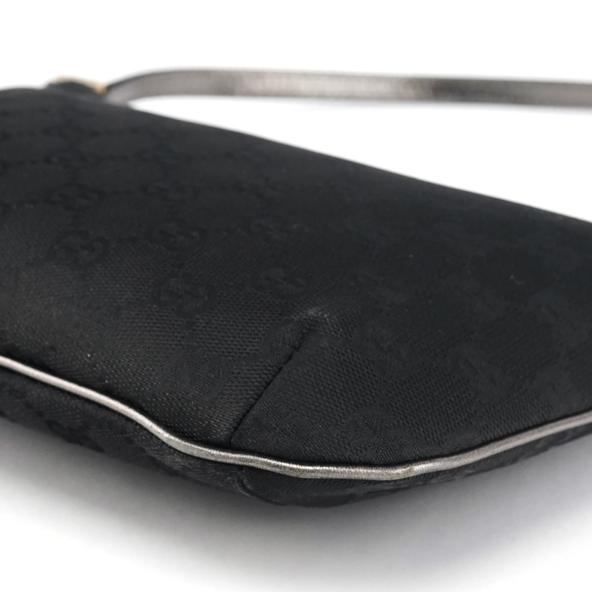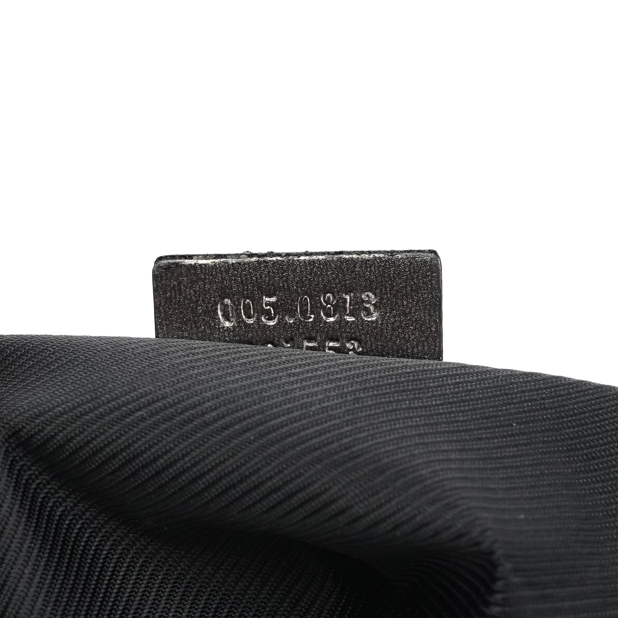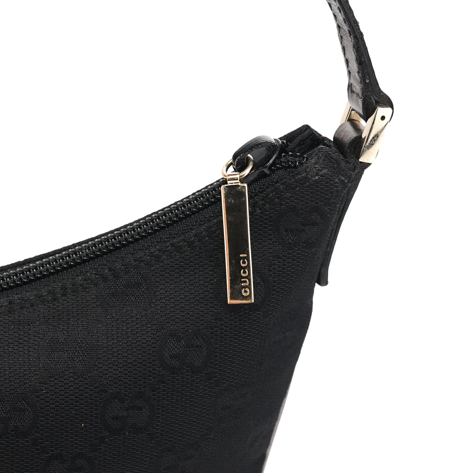 Designed in the late 1990s by Tom Ford, the Gucci GG shoulder bag is crafted from black monogram canvas with metallic leather trim and gold-tone hardware. The adjustable shoulder strap is detailed with a logo-engraved buckle, while the top zip opens to a black satin-lined interior. Sleek and minimalist, it captures the understated sensuality of Ford’s Gucci era.