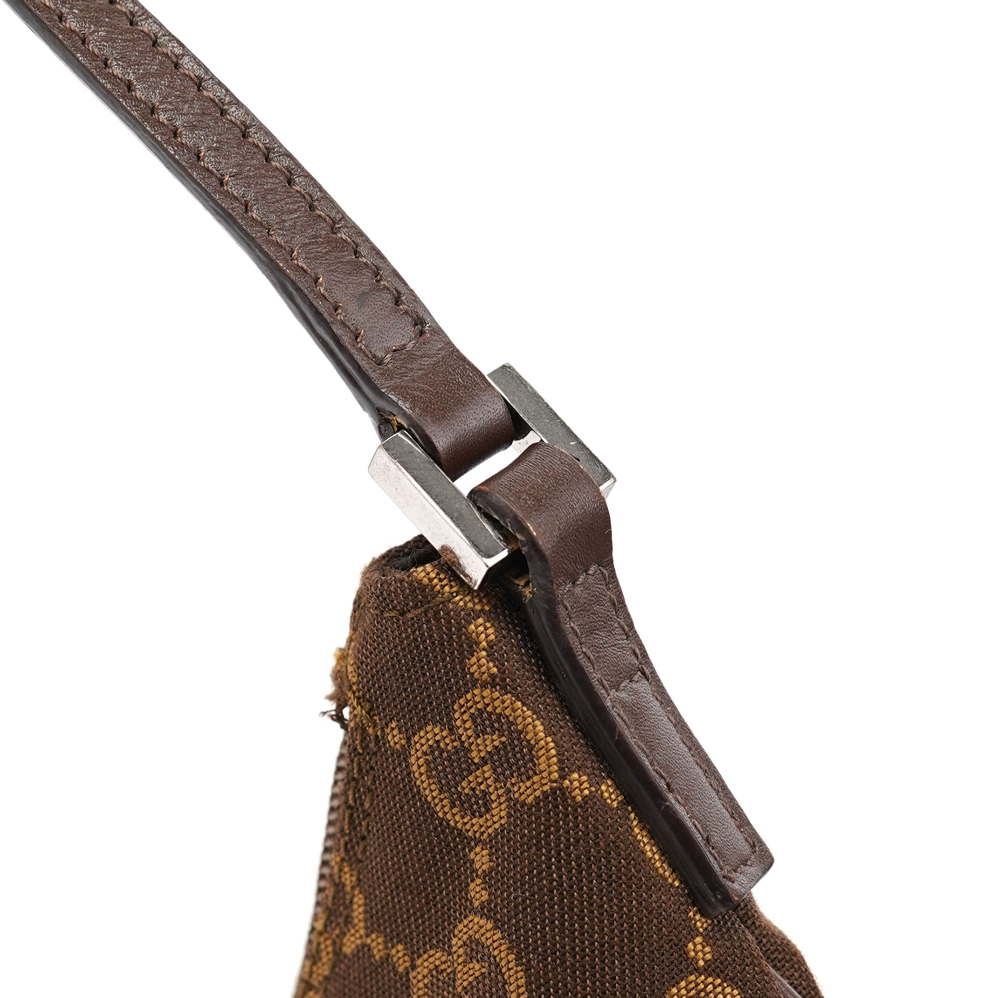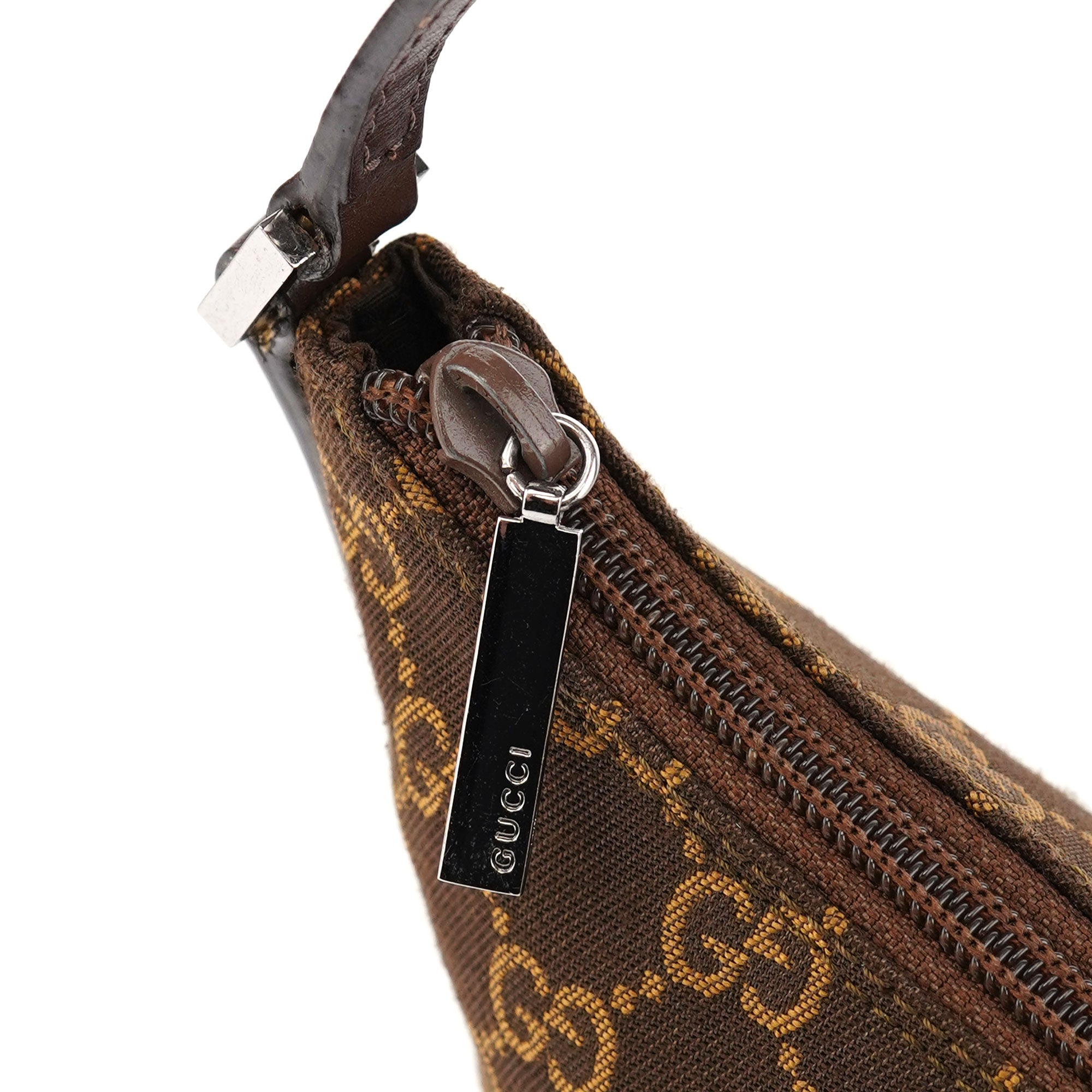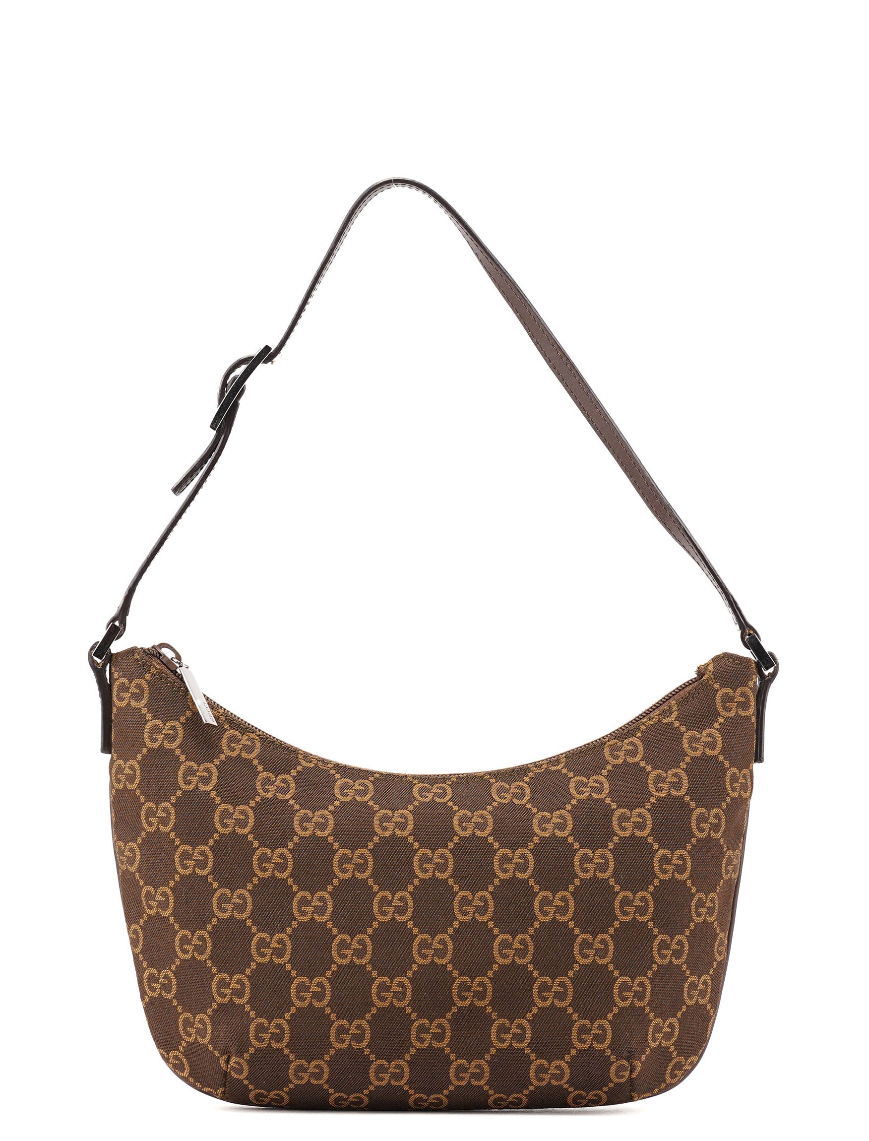 Designed by Tom Ford in the late 1990's, this Gucci GG shoulder bag is crafted from the iconic brown GG monogram canvas with tonal leather trim. Its silver-tone hardware adds a touch of elegance, while the satin-lined interior features a convenient pocket for organization.