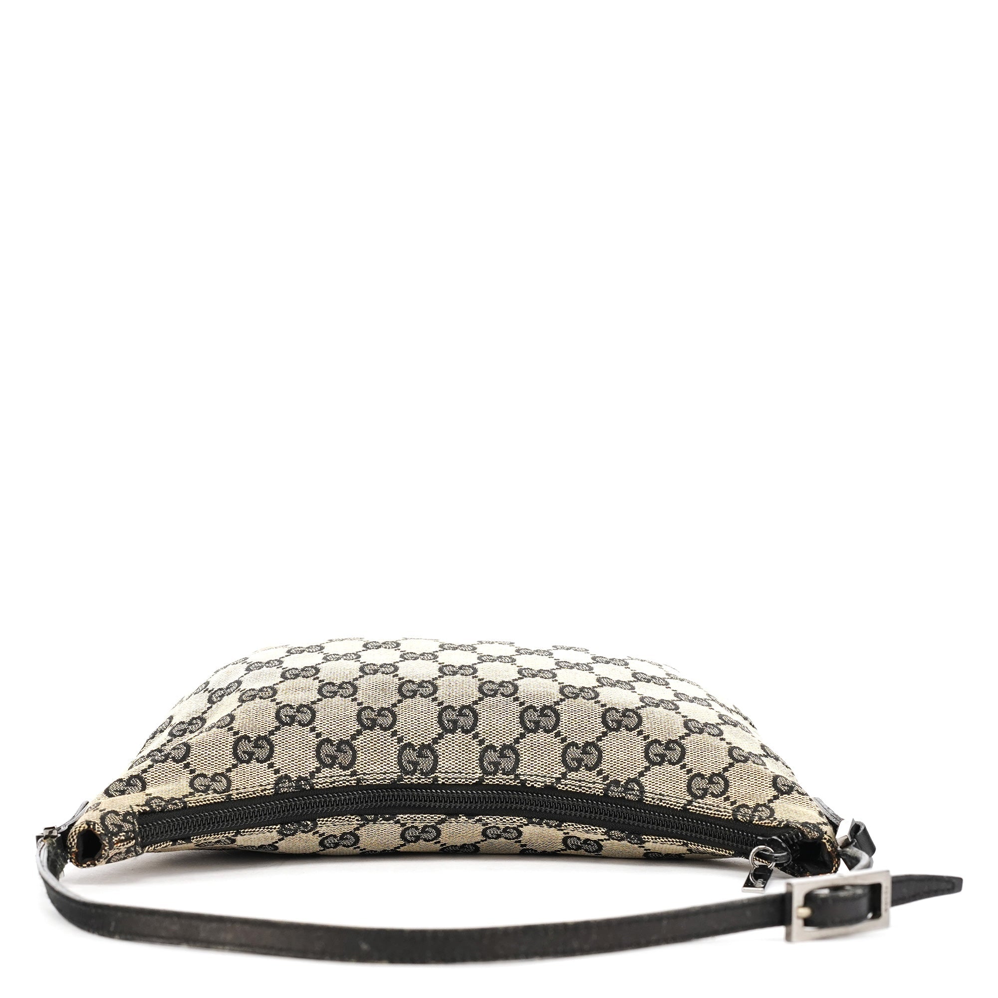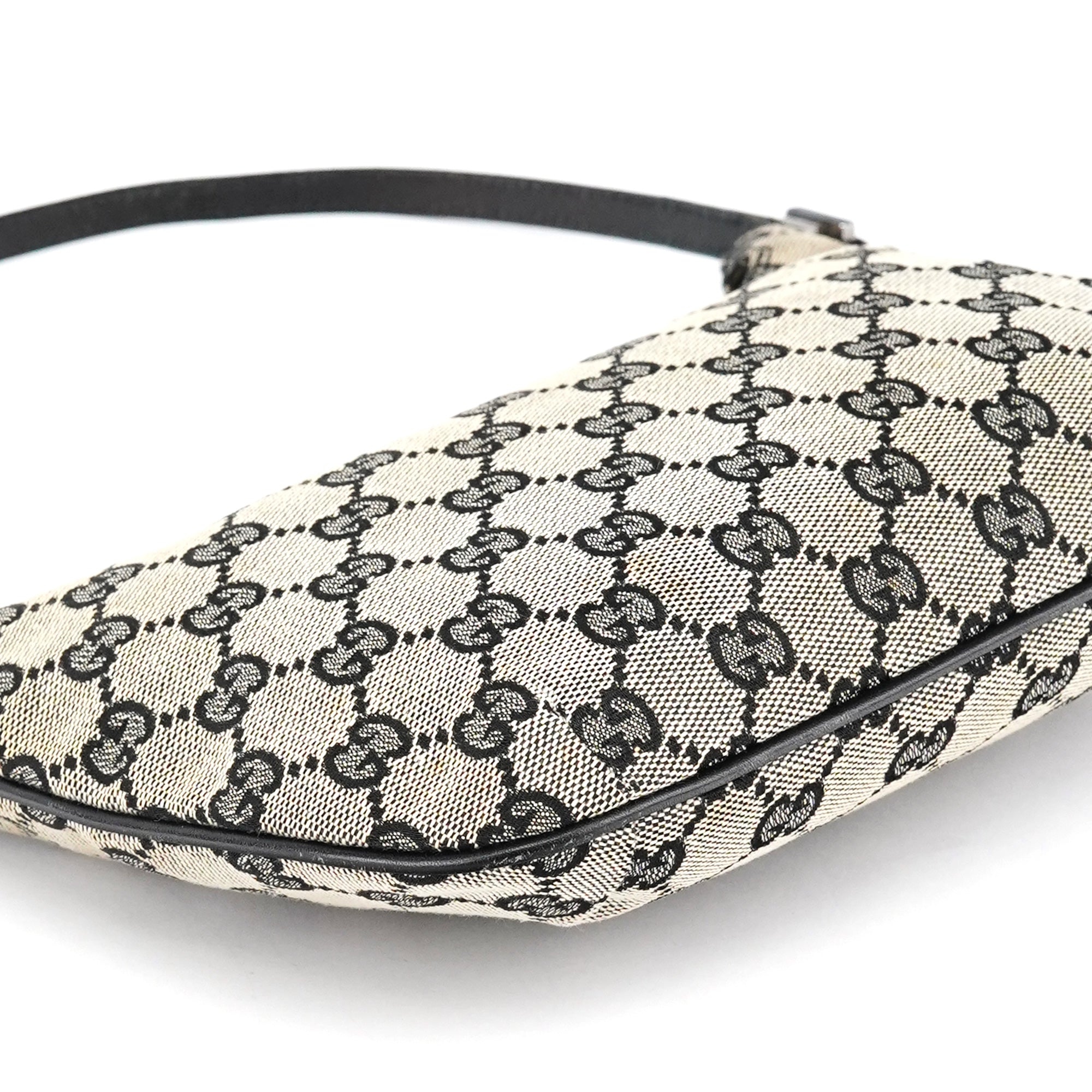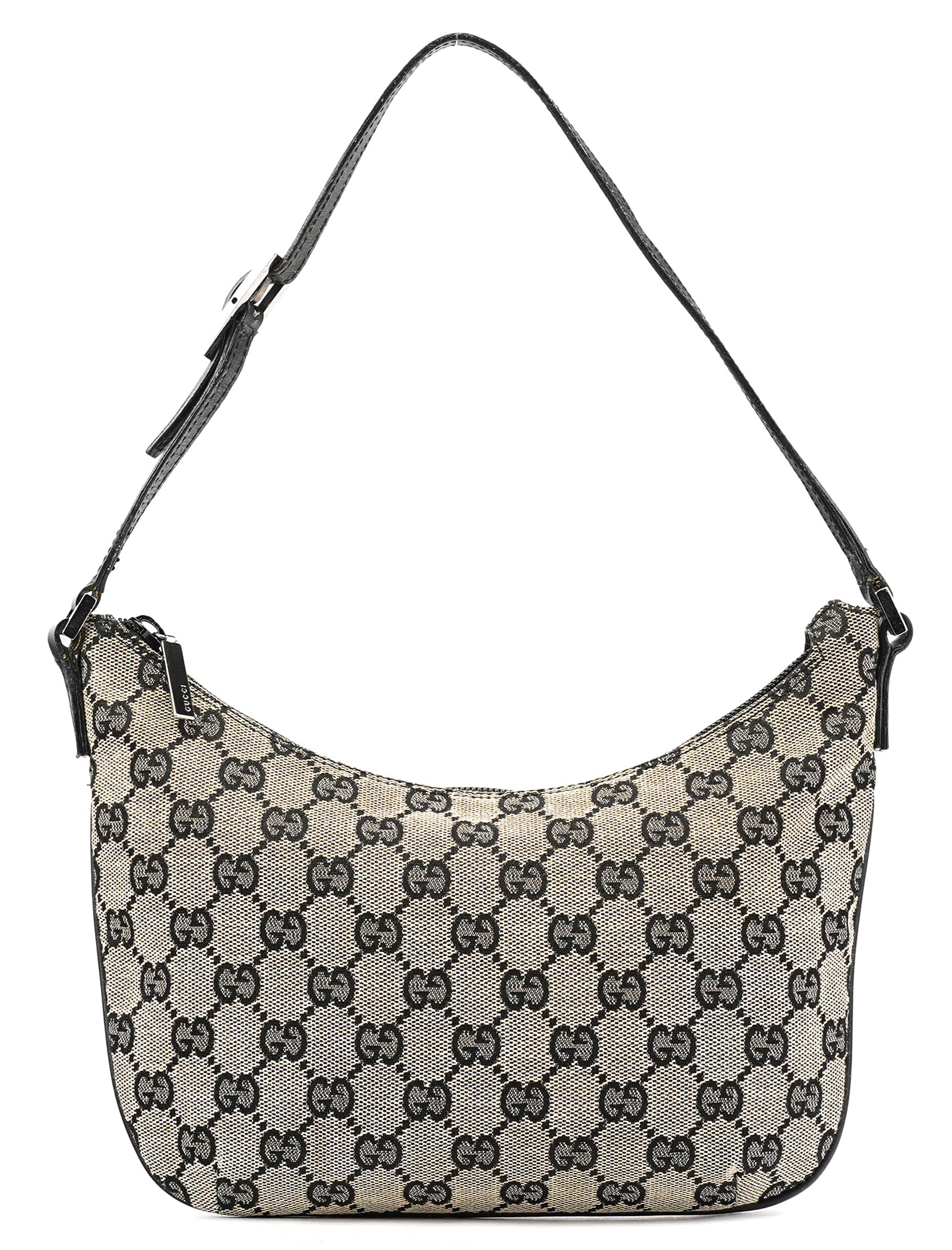 Designed by Tom Ford in the late 1990's, this Gucci GG shoulder bag is crafted from the iconic grey GG monogram canvas with tonal leather trim. Its silver-tone hardware adds a touch of elegance, while the satin-lined interior features a convenient pocket for organization.