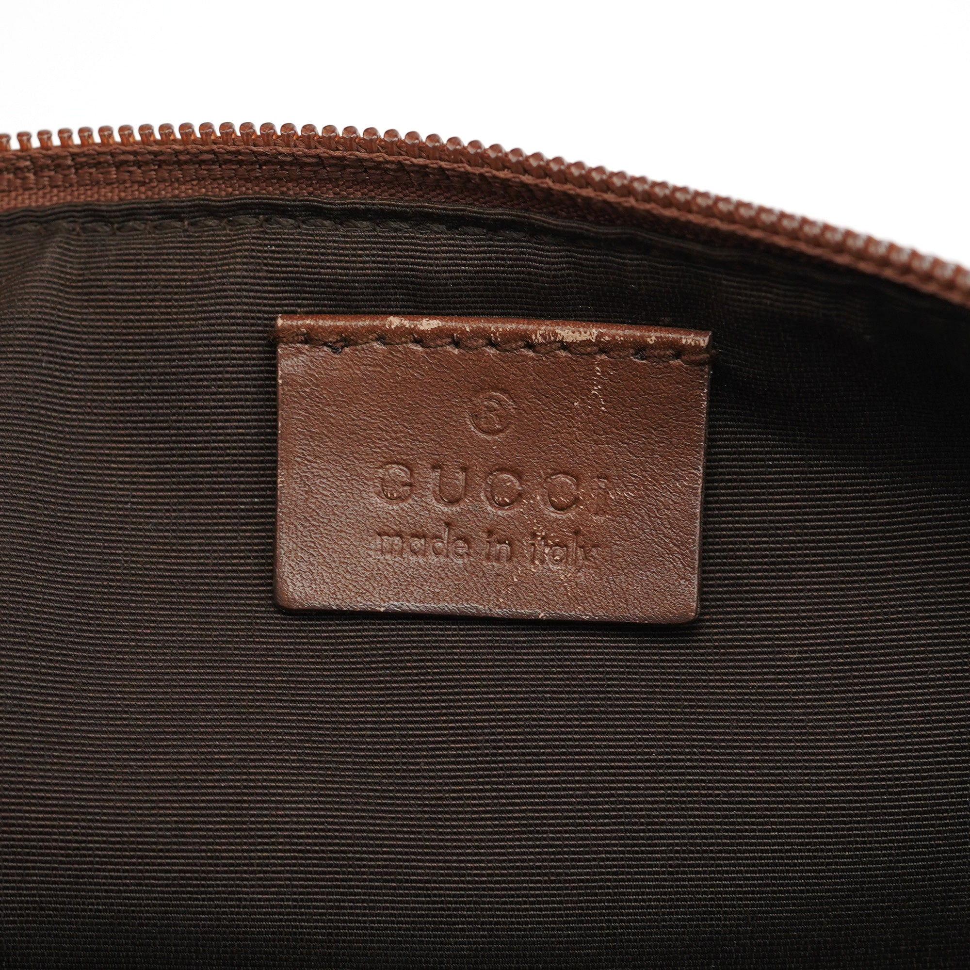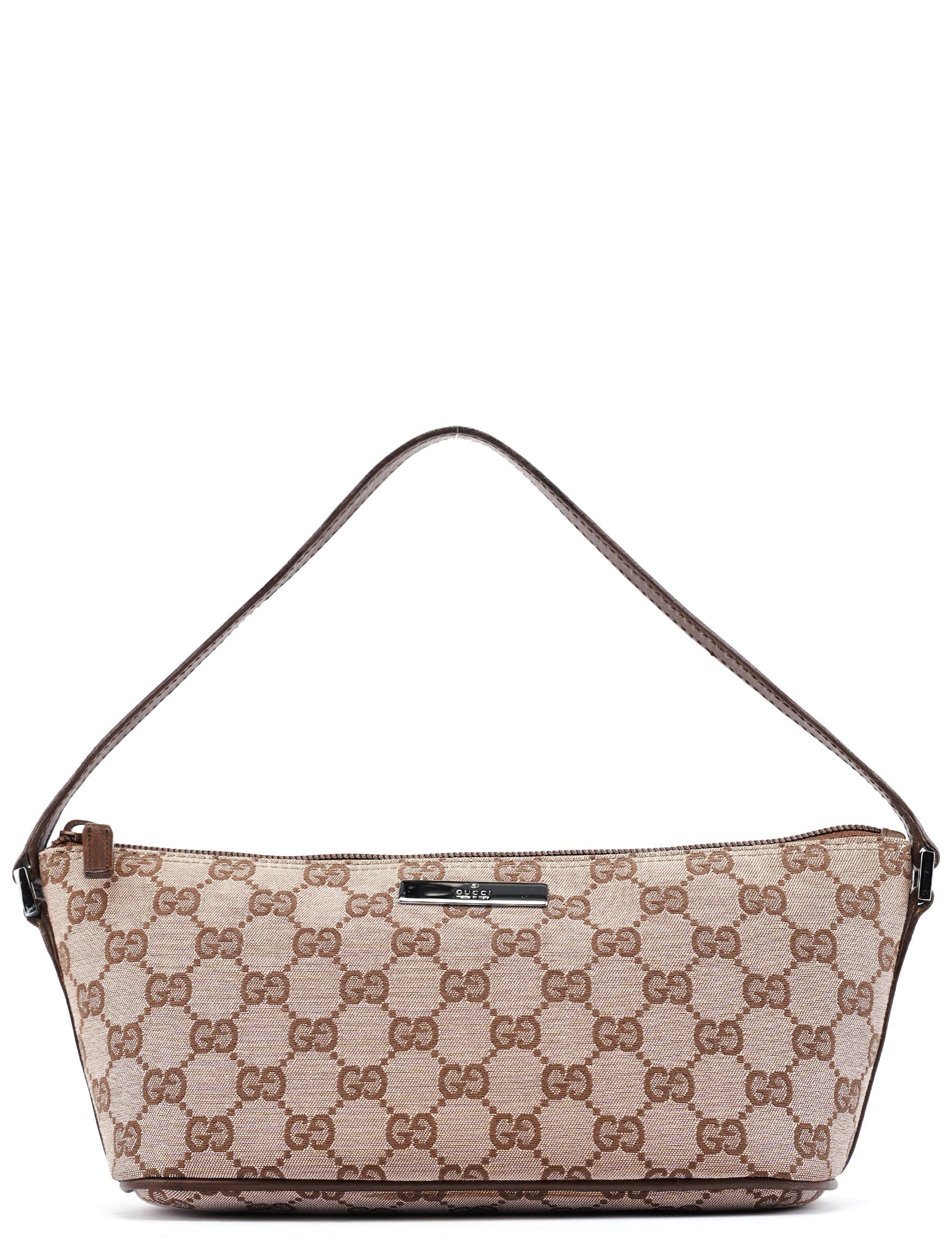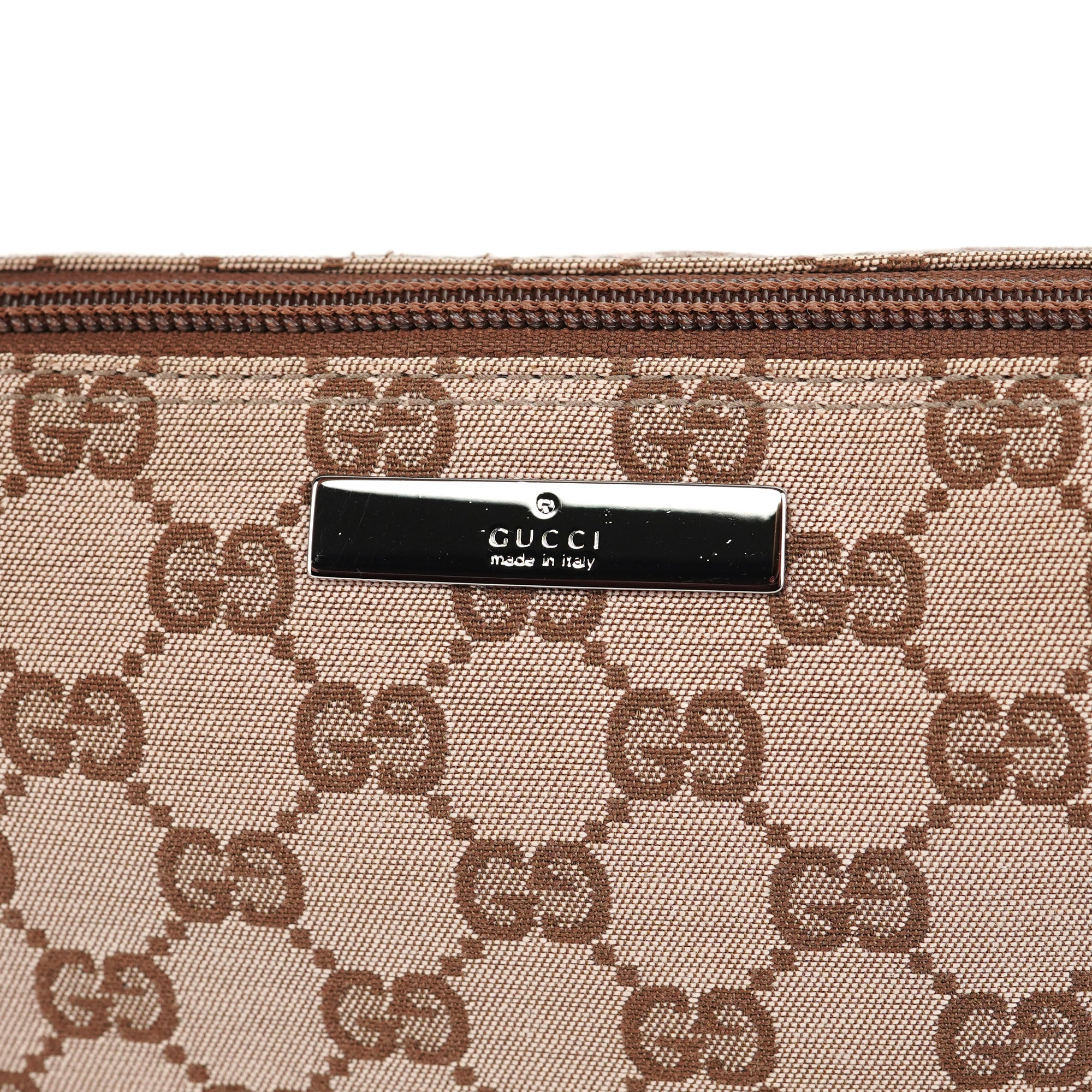 Designed in the late 1990's by Tom Ford, this vintage Gucci GG Boat Pochette features the house's signature GG monogram canvas in beige and brown with dark brown leather trim. The curved boat-shaped pouch includes a single strap, a top zip closure with silver-tone hardware, and the iconic Gucci logo plate on the front. The interior is lined in brown satin.