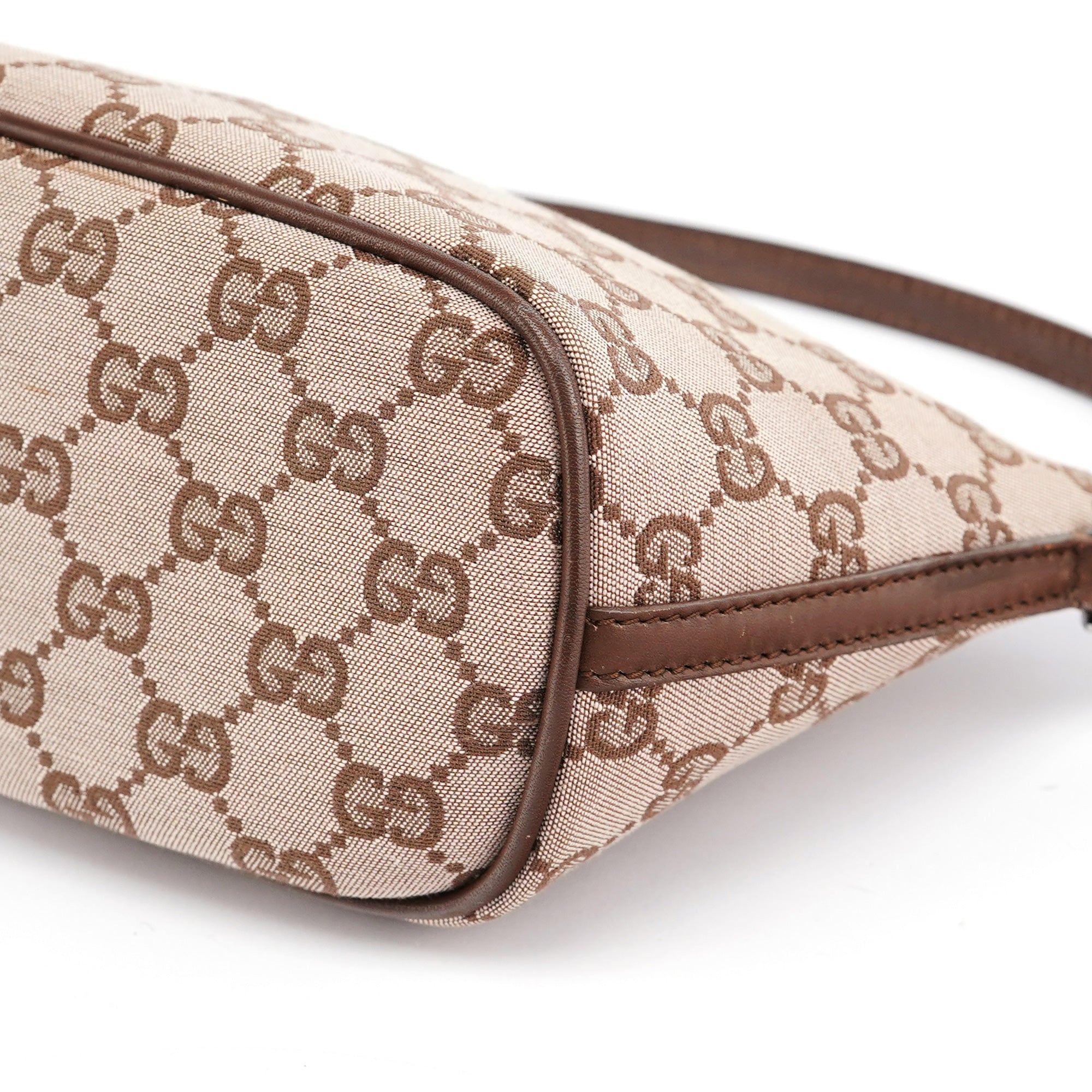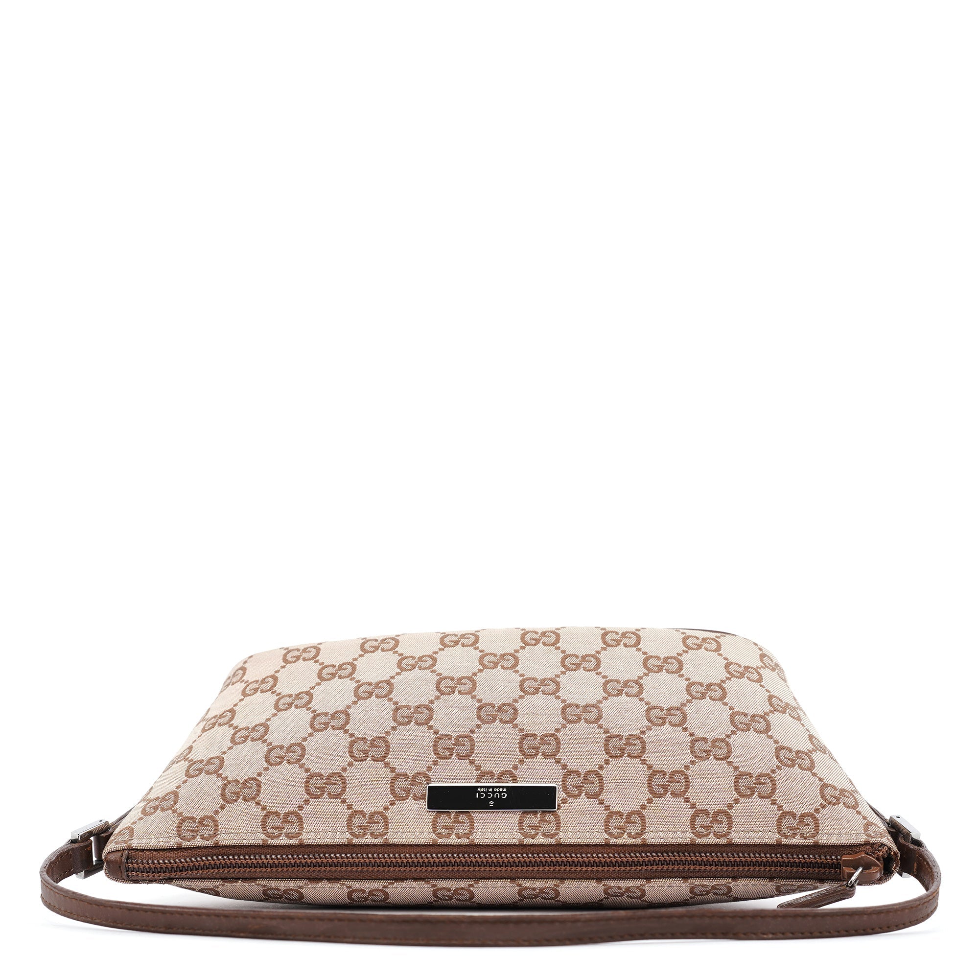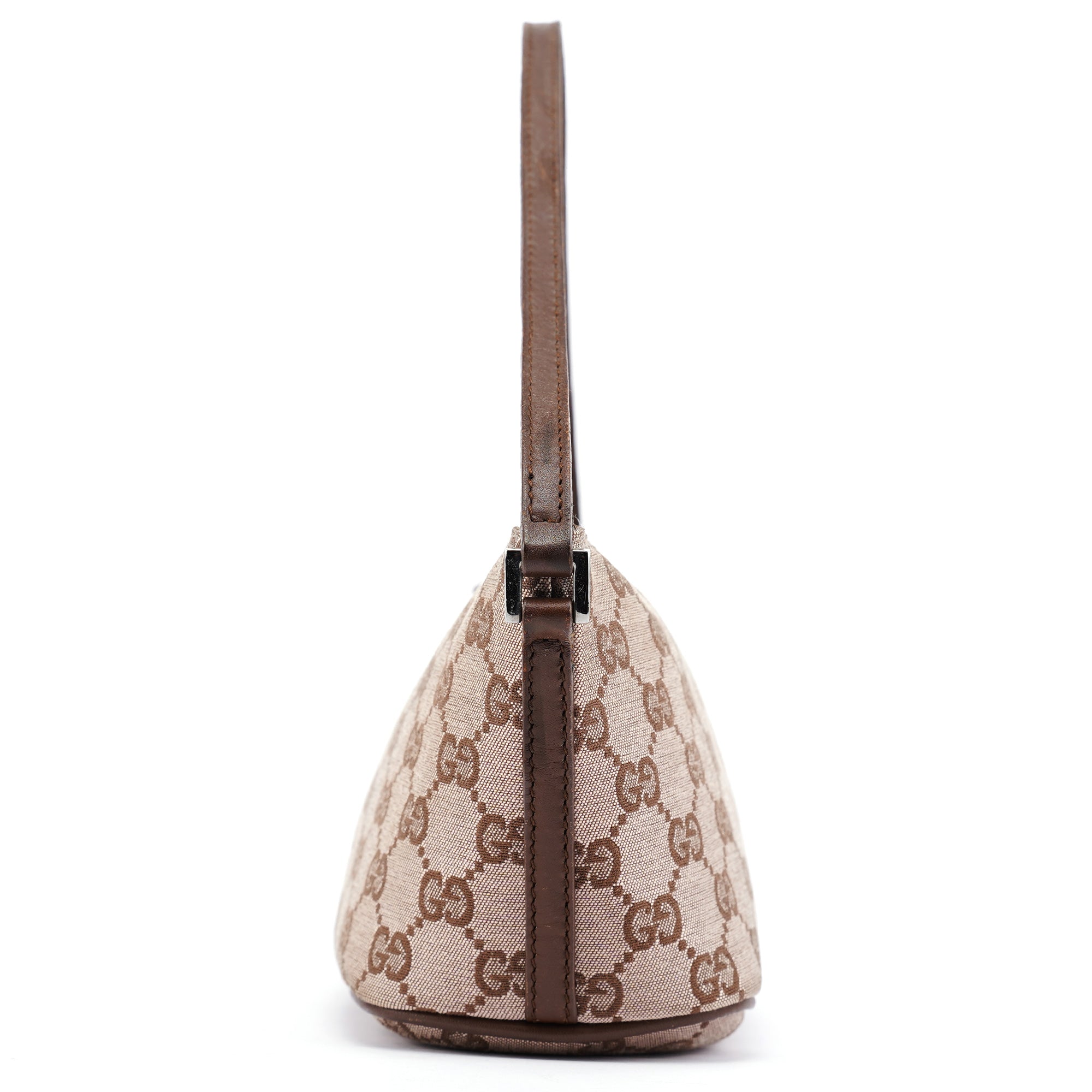 Designed in the late 1990's by Tom Ford, this vintage Gucci GG Boat Pochette features the house's signature GG monogram canvas in beige and brown with dark brown leather trim. The curved boat-shaped pouch includes a single strap, a top zip closure with silver-tone hardware, and the iconic Gucci logo plate on the front. The interior is lined in brown satin.