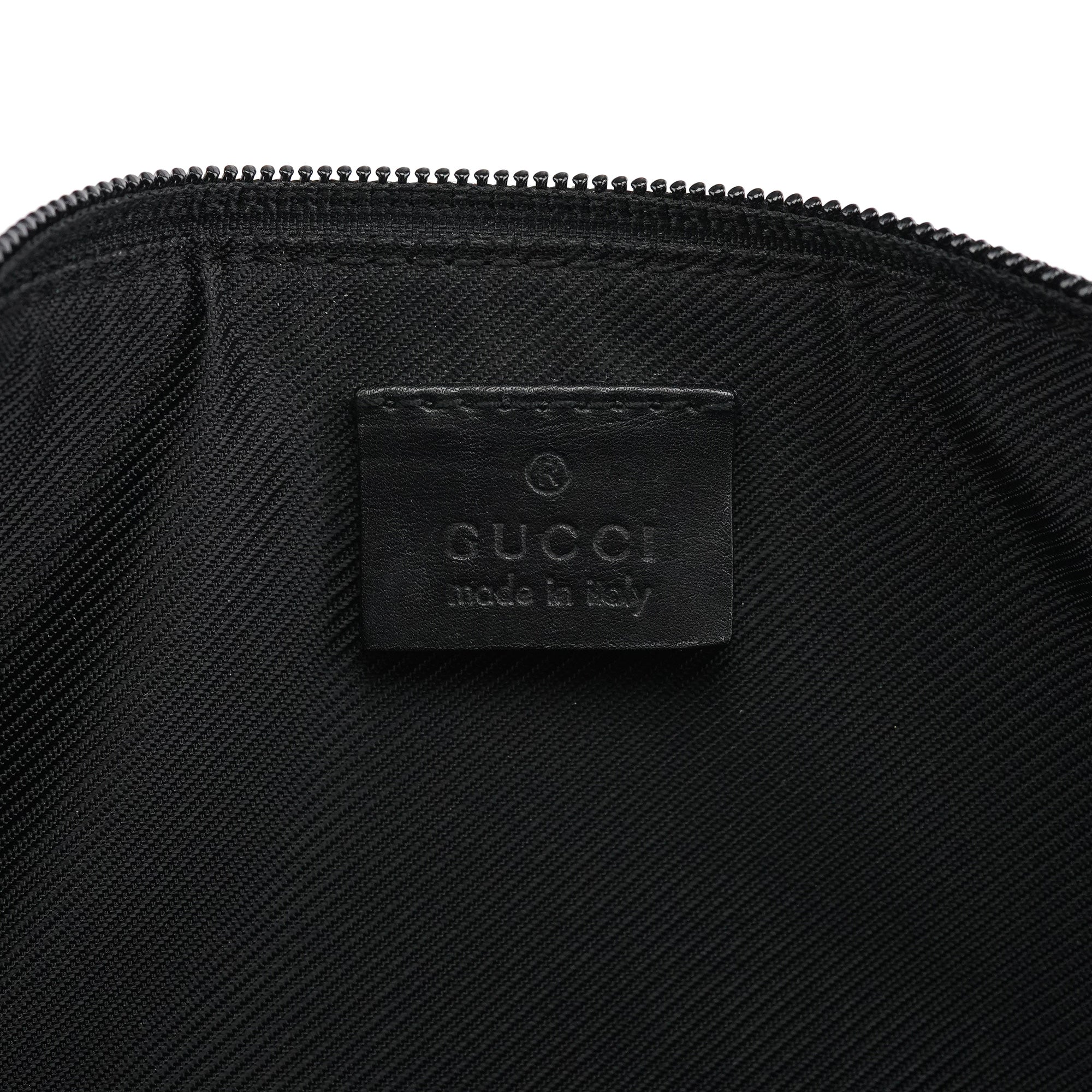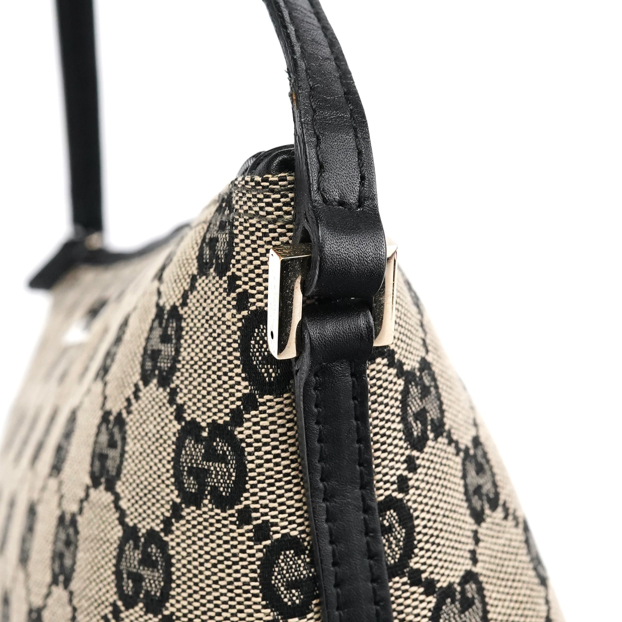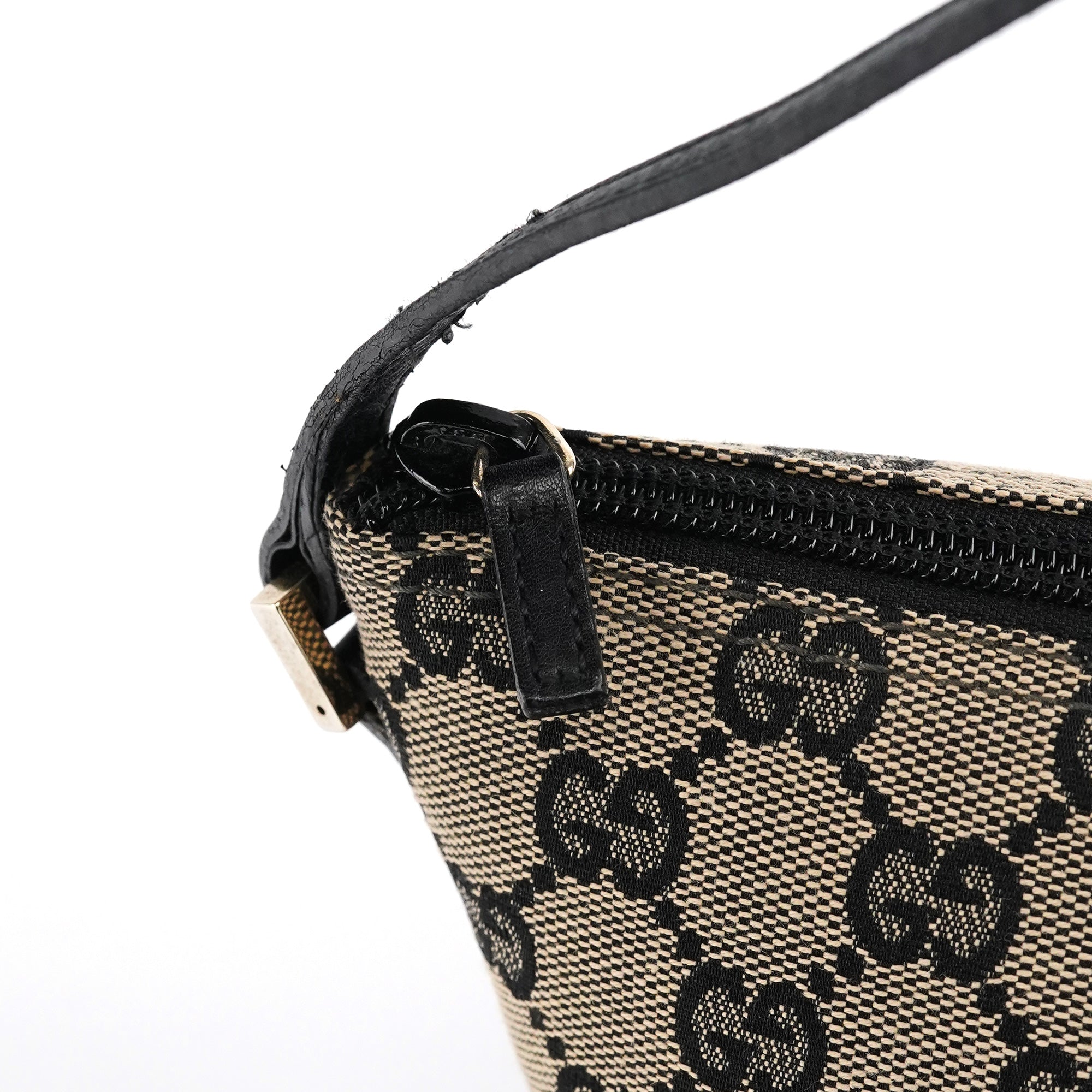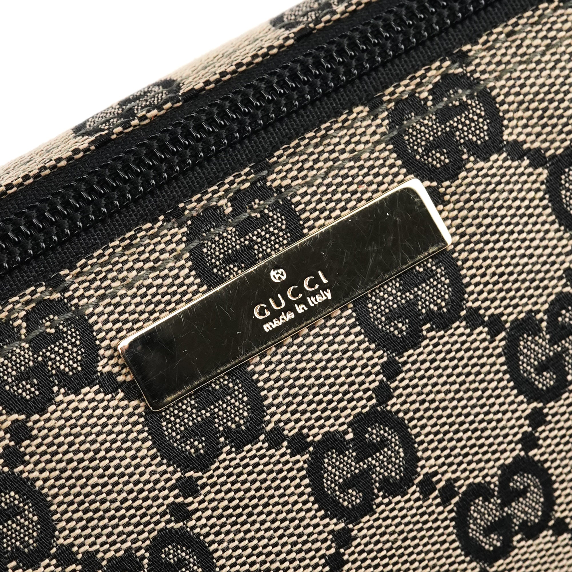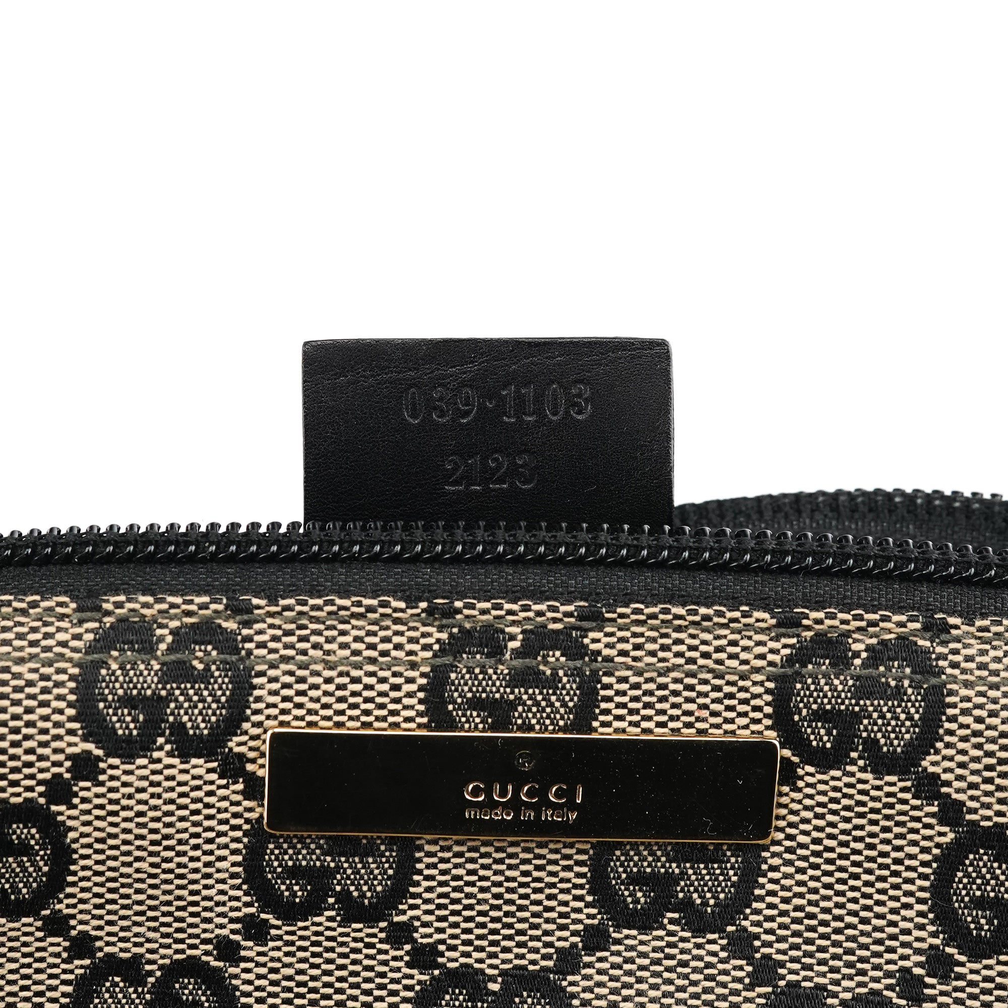Designed in the late 1990s by Tom Ford, this Gucci GG Boat Pochette features beige-grey GG canvas contrasted with black leather trim and silver-tone hardware. The slim, structured shape and minimalist silhouette capture the sleek, modern aesthetic of Ford’s era, while the zip-top interior keeps it practical for everyday essentials.