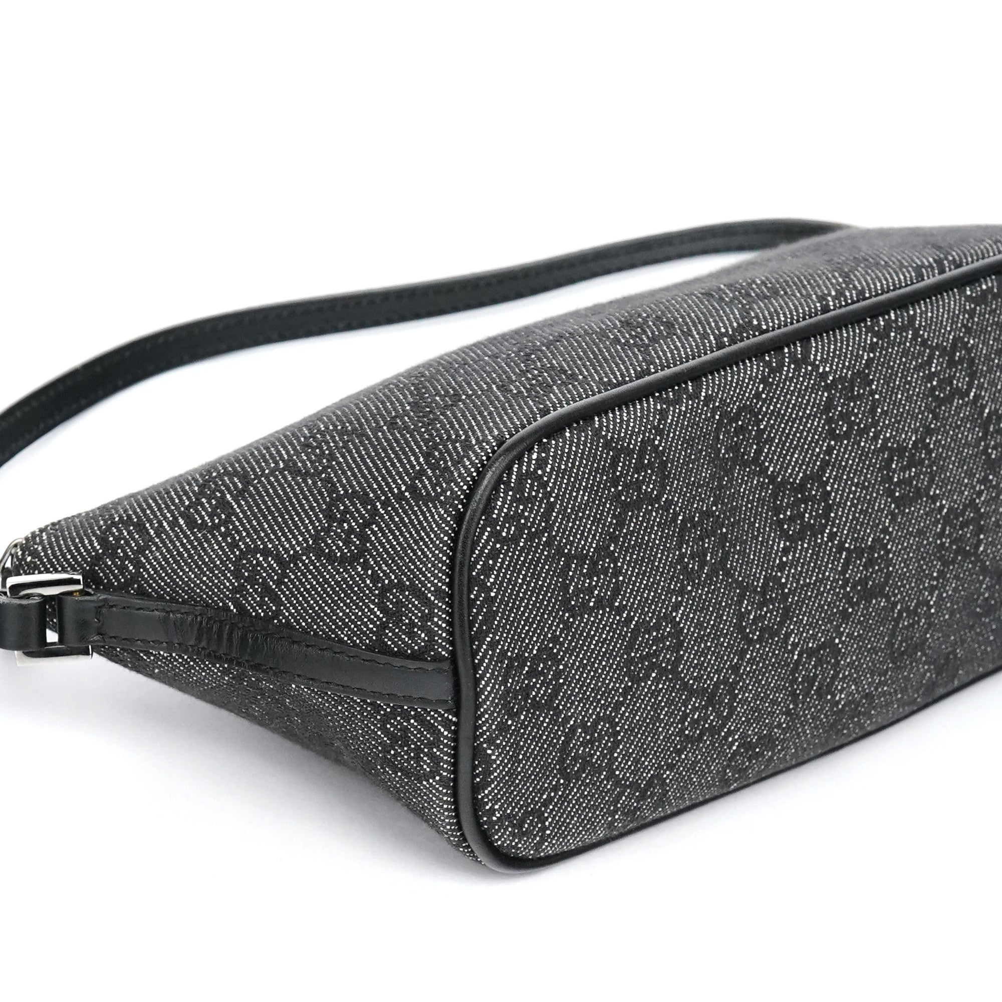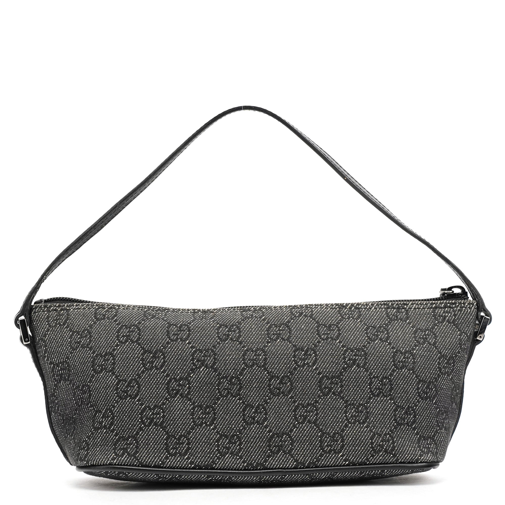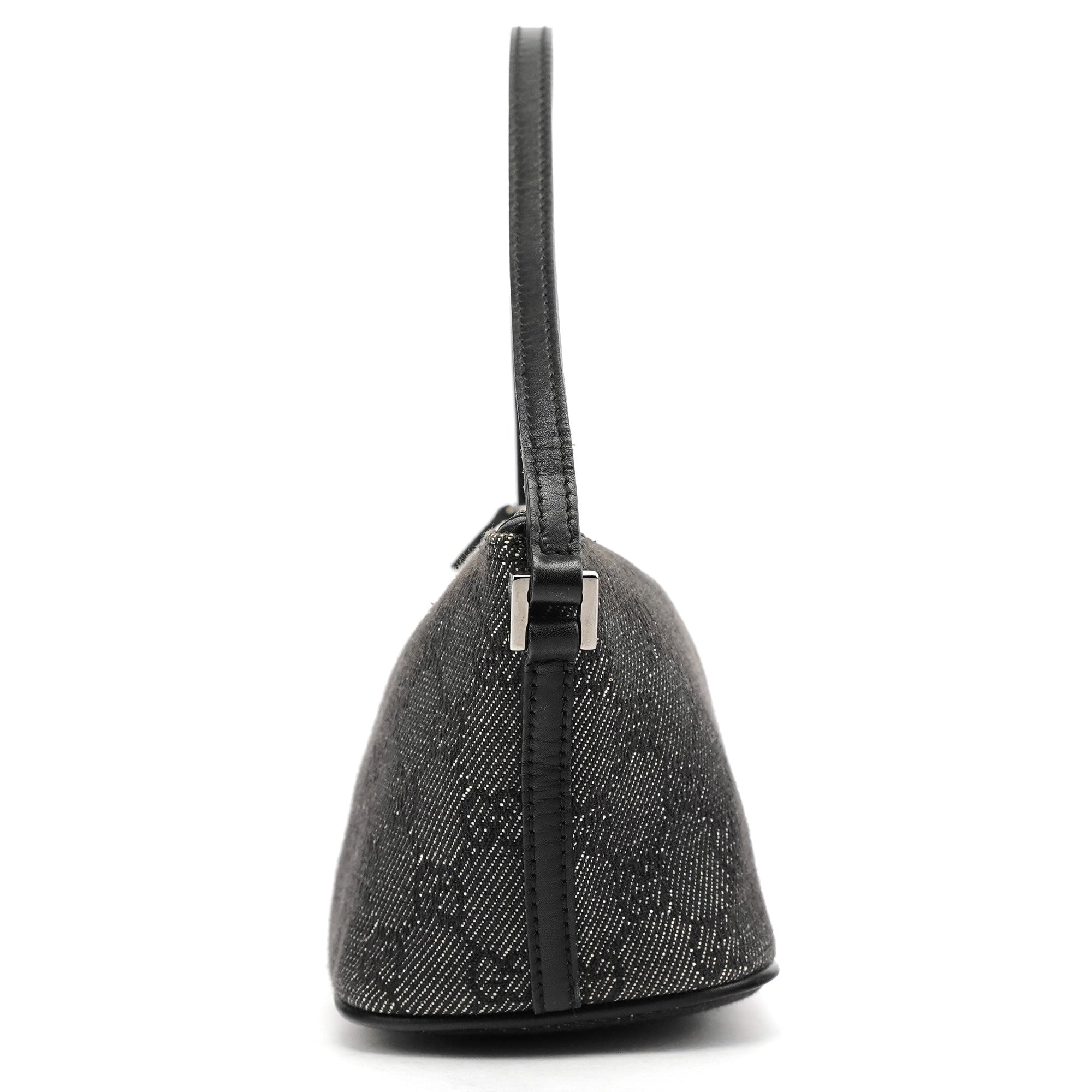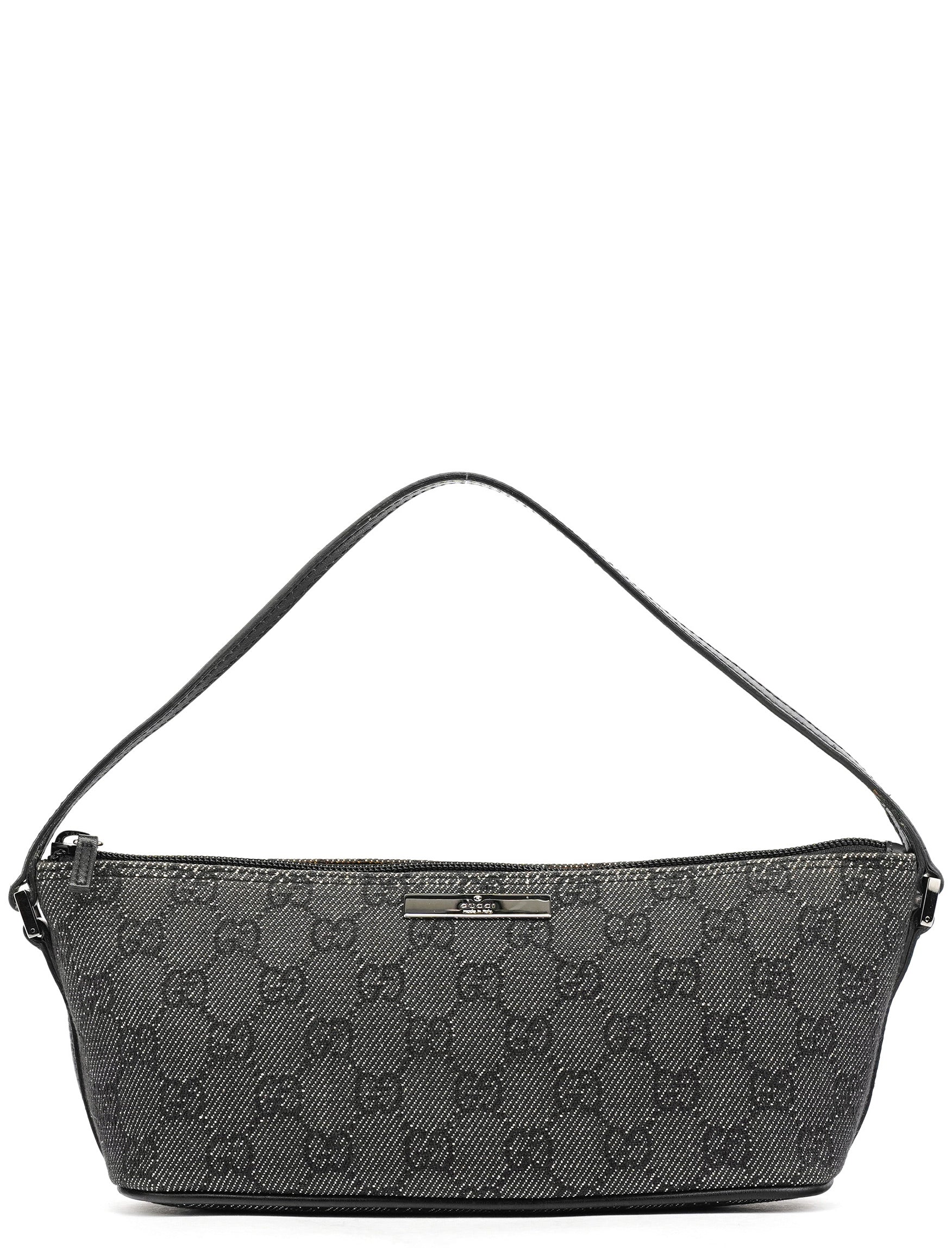 Designed in the late 1990's by Tom Ford, this vintage Gucci GG Boat Pochette features the signature GG denim in anthracite with black leather trim. The distinctive boat-shaped silhouette offers a single top handle for elegant carry, while silver-tone hardware accents the design. The bag secures with a top zipper closure and is lined with durable fabric.