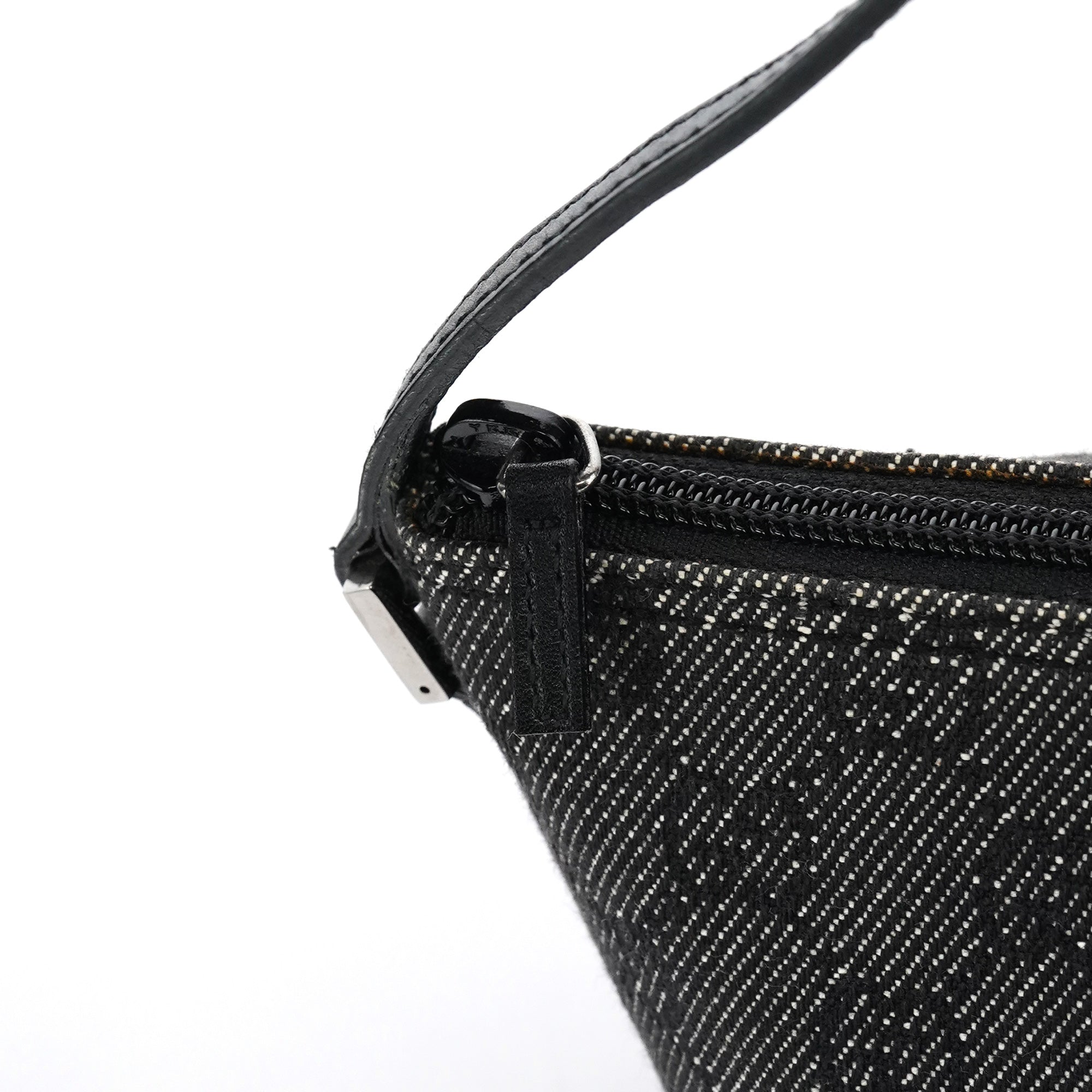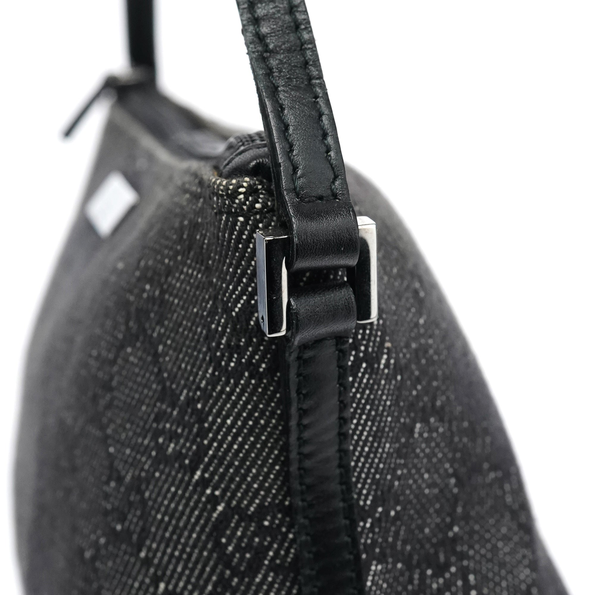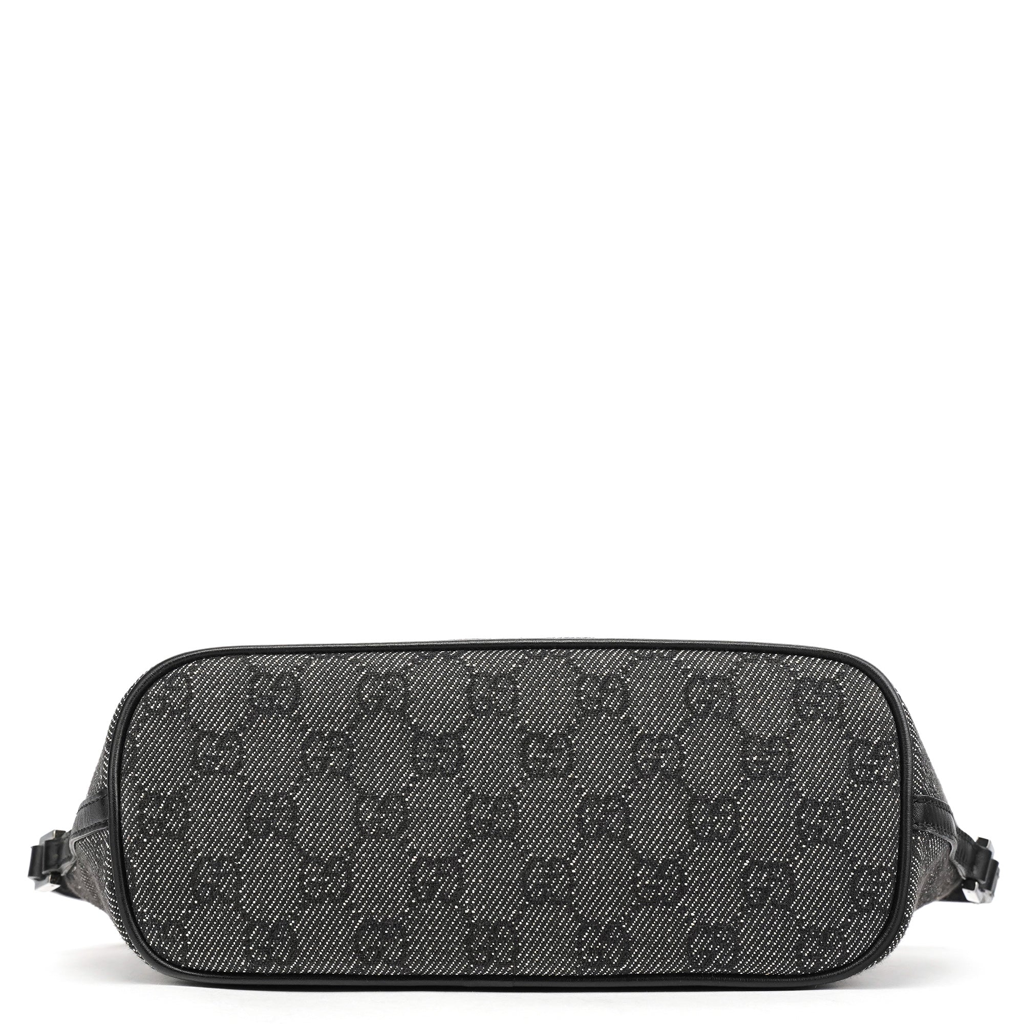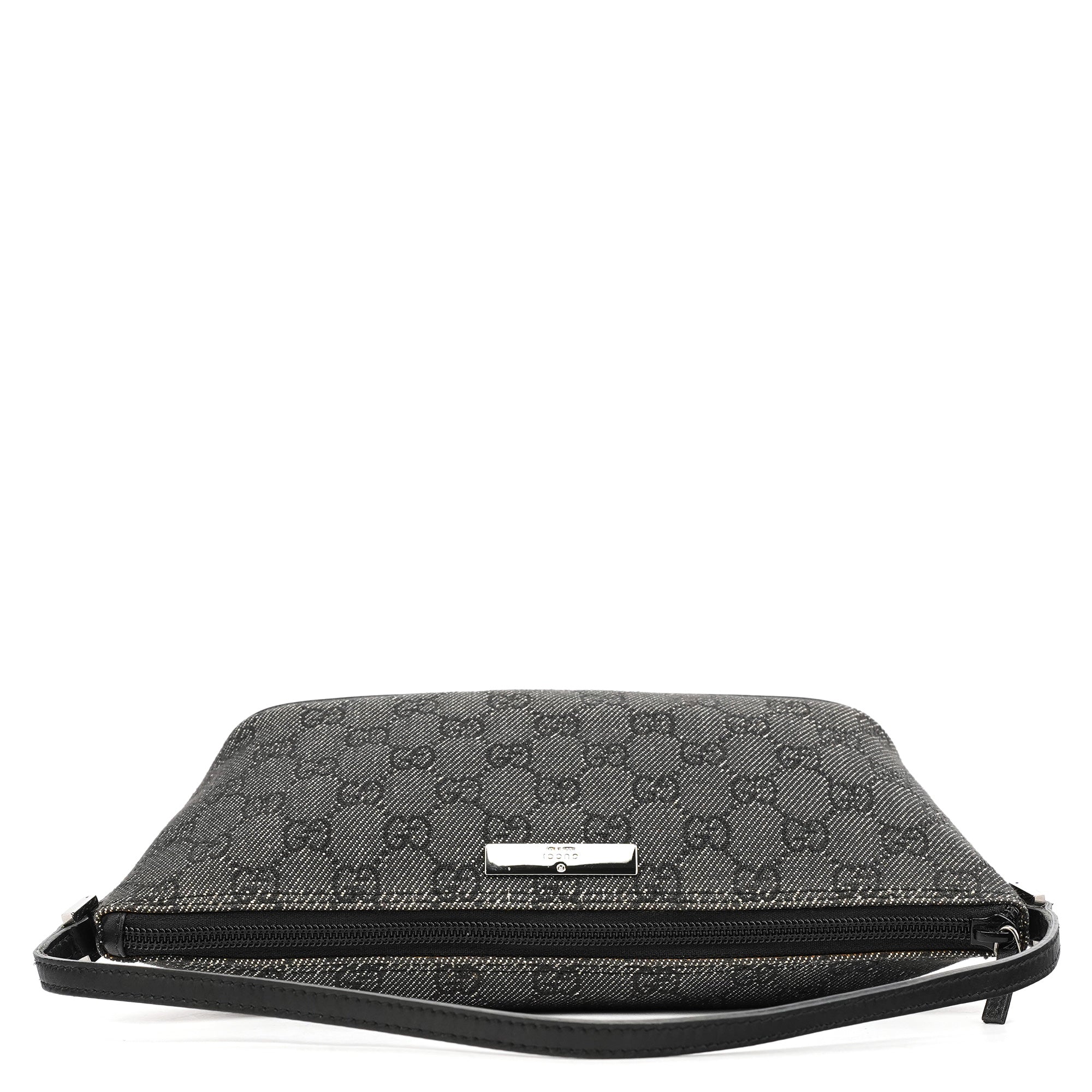 Designed in the late 1990's by Tom Ford, this vintage Gucci GG Boat Pochette features the signature GG denim in anthracite with black leather trim. The distinctive boat-shaped silhouette offers a single top handle for elegant carry, while silver-tone hardware accents the design. The bag secures with a top zipper closure and is lined with durable fabric.