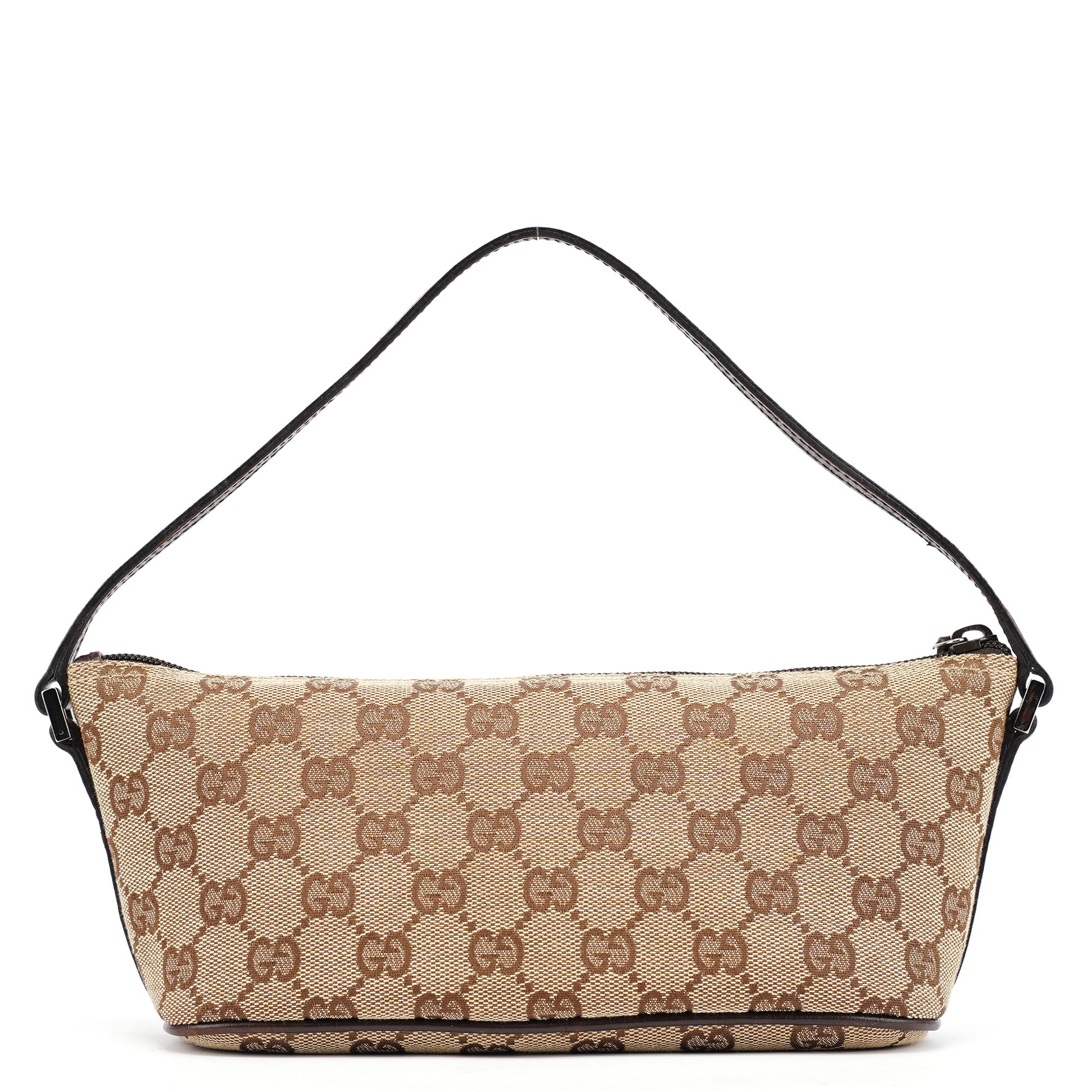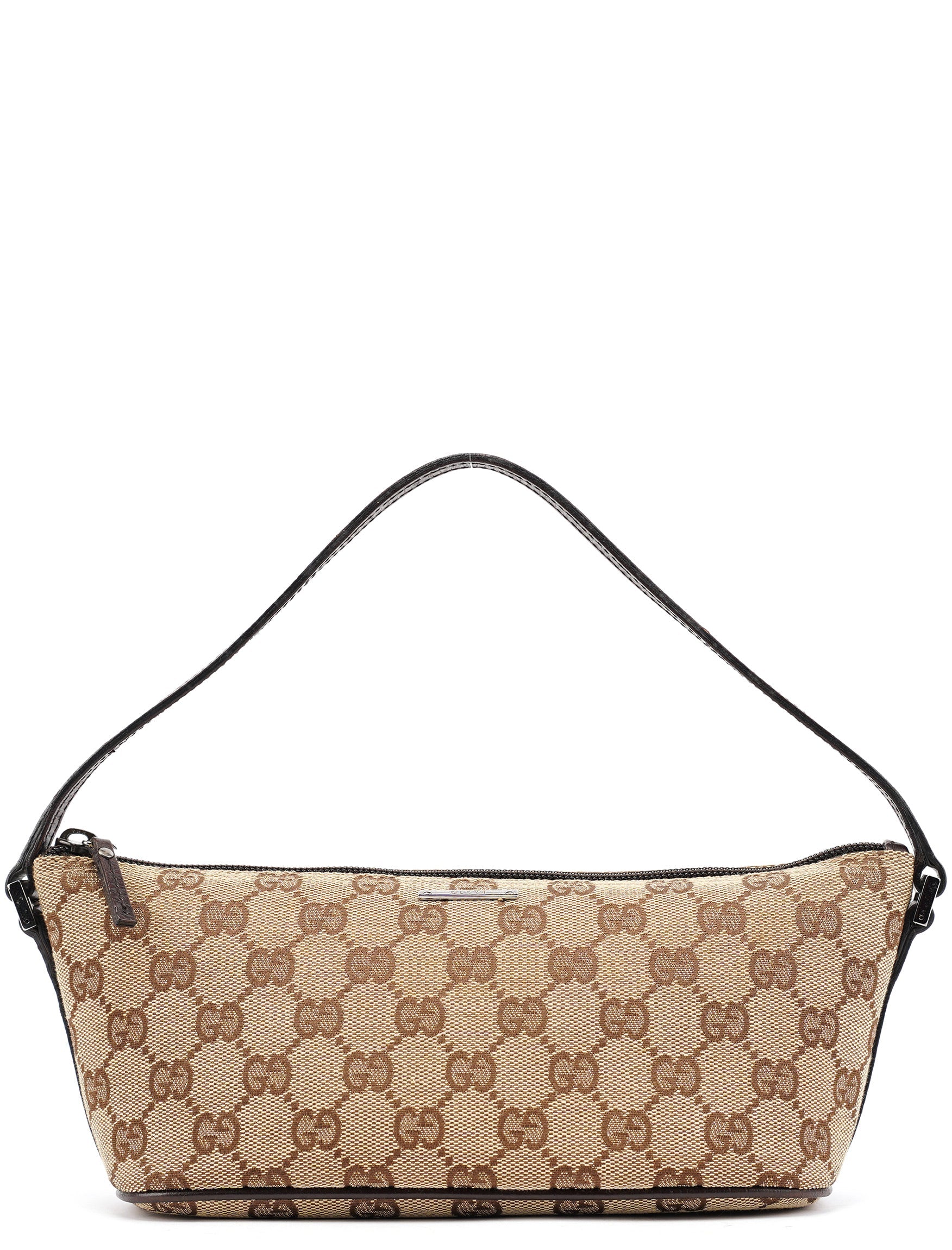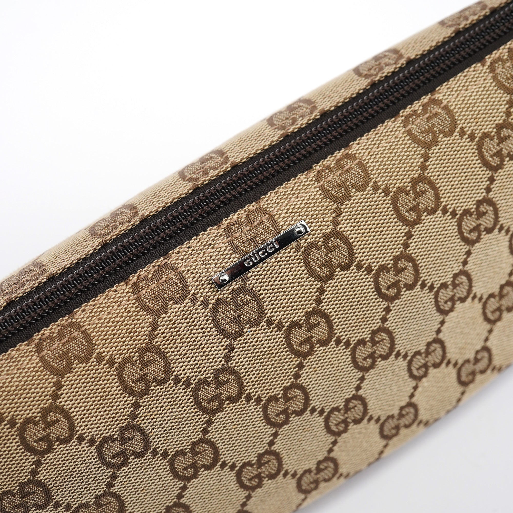 Designed in the early 2000s by Tom Ford, this vintage Gucci boat pochette showcases the classic GG monogram canvas in beige and brown tones. The compact elongated silhouette features a single leather strap, silver-tone hardware, and a zip-top closure. The streamlined design makes it perfect as a small hand bag or clutch, with the interior lined in signature satin fabric.