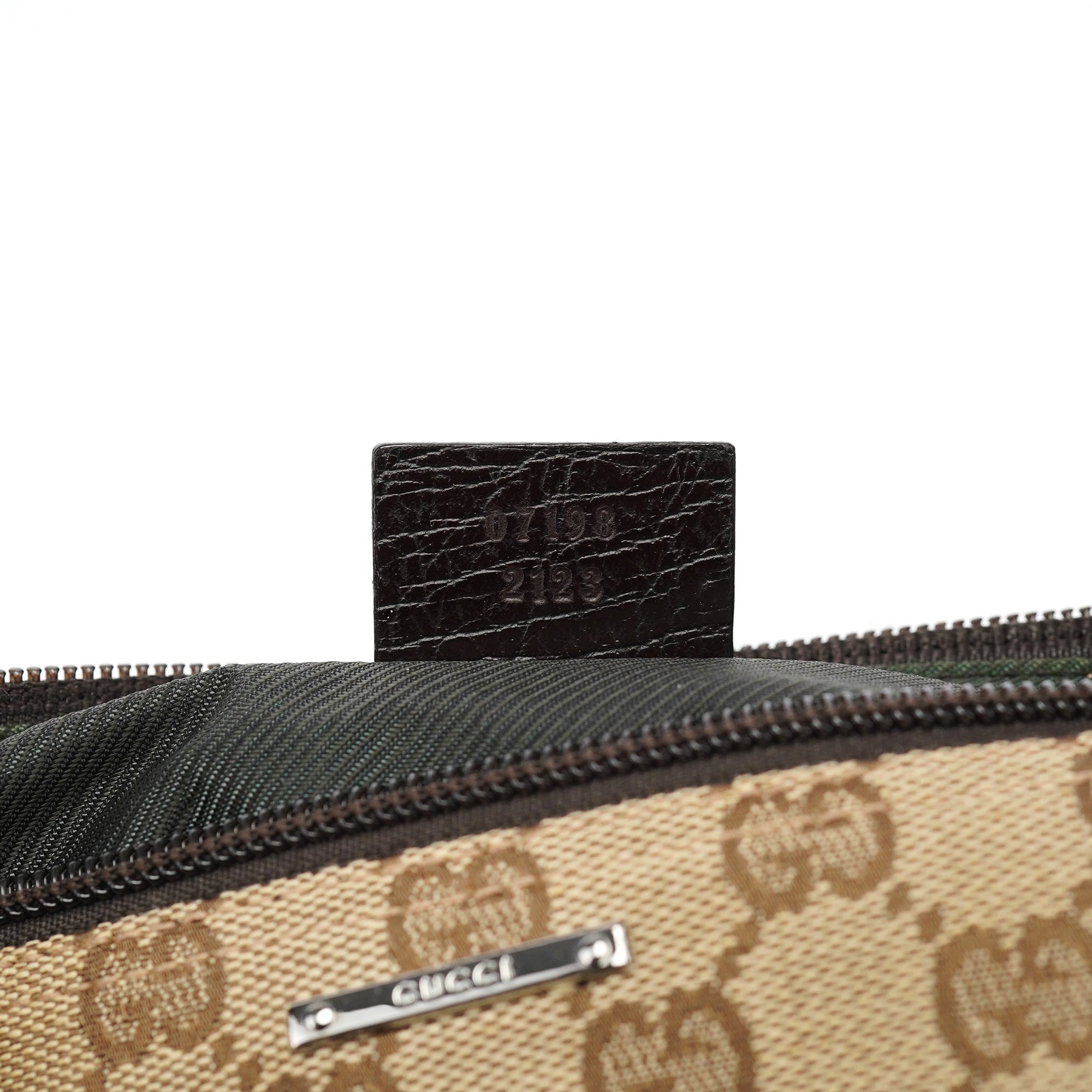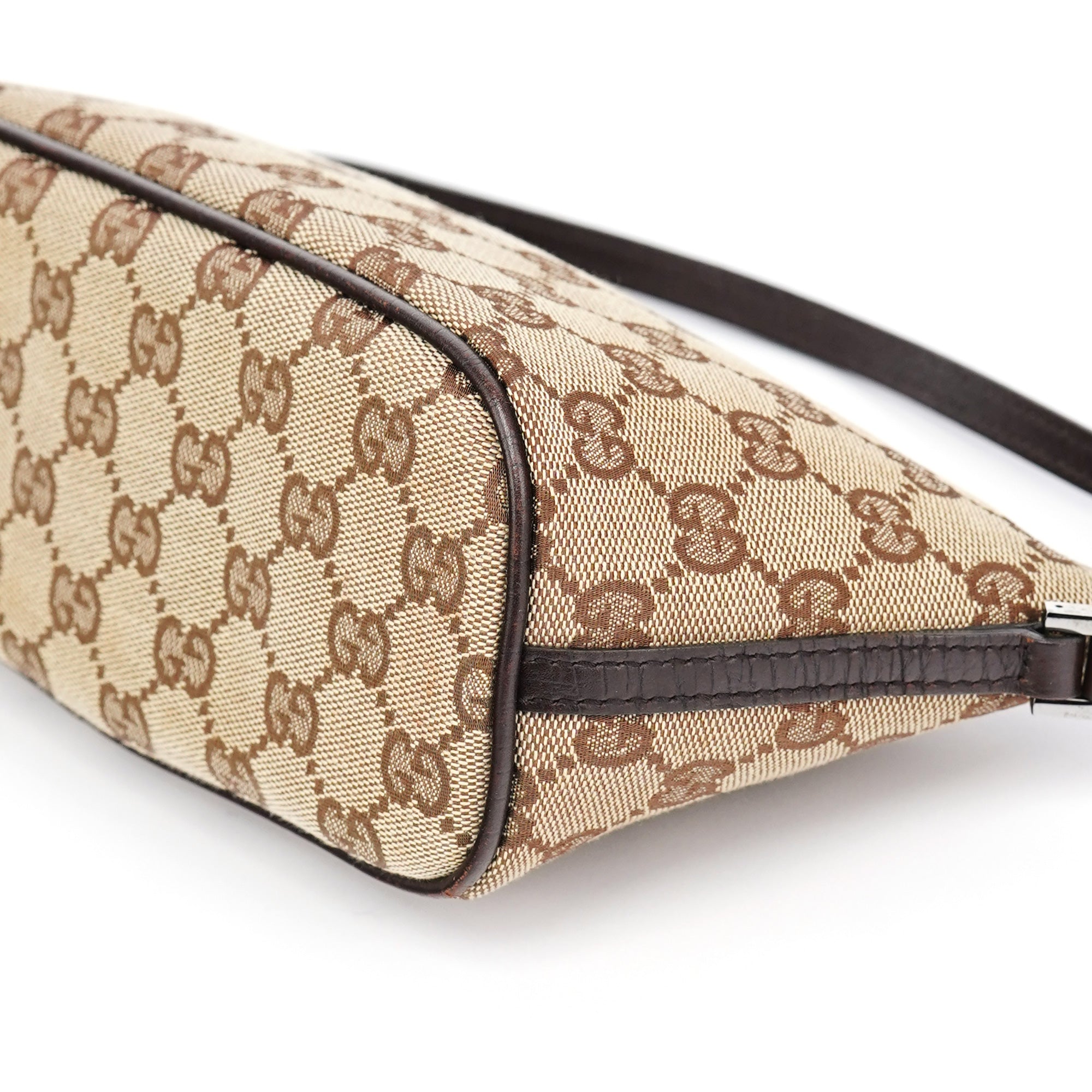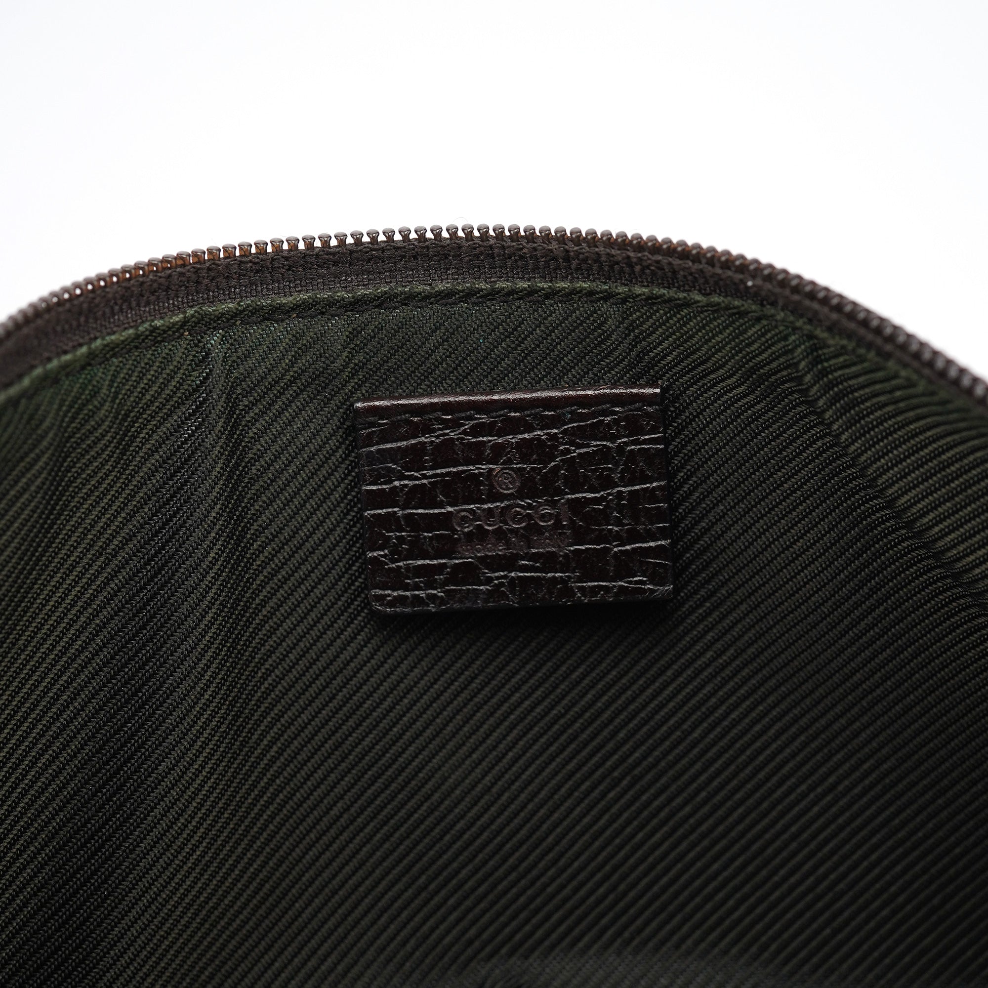 Designed in the early 2000s by Tom Ford, this vintage Gucci boat pochette showcases the classic GG monogram canvas in beige and brown tones. The compact elongated silhouette features a single leather strap, silver-tone hardware, and a zip-top closure. The streamlined design makes it perfect as a small hand bag or clutch, with the interior lined in signature satin fabric.