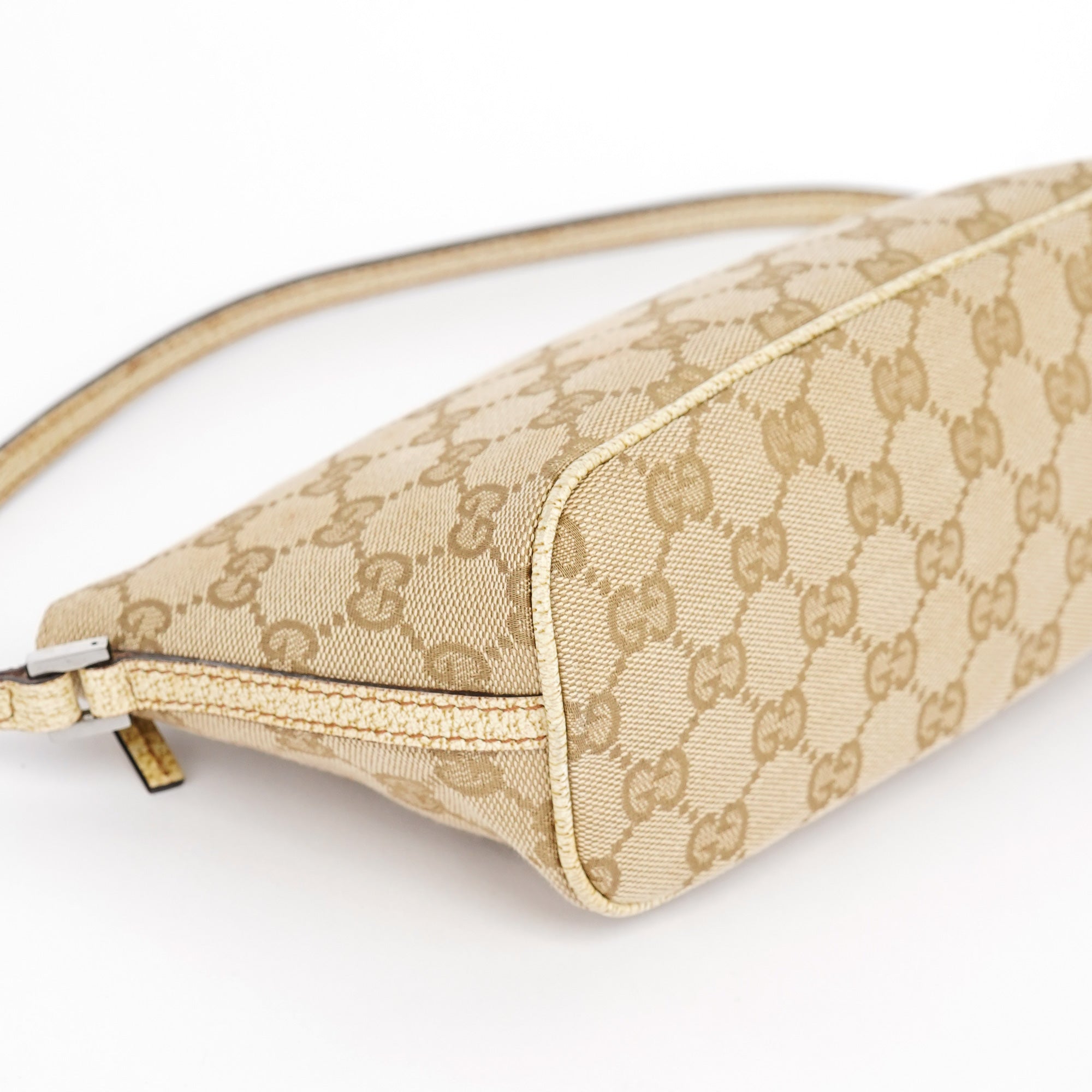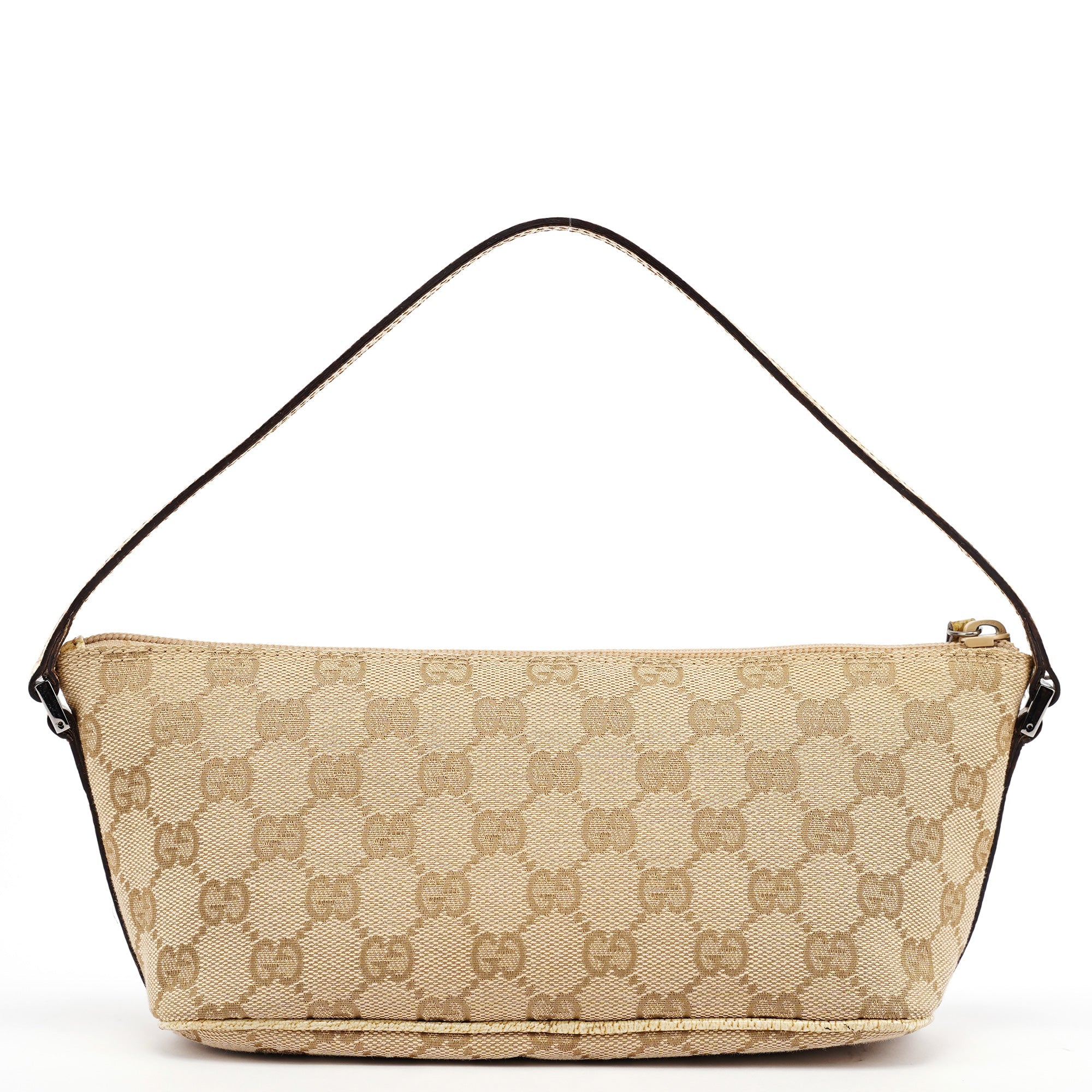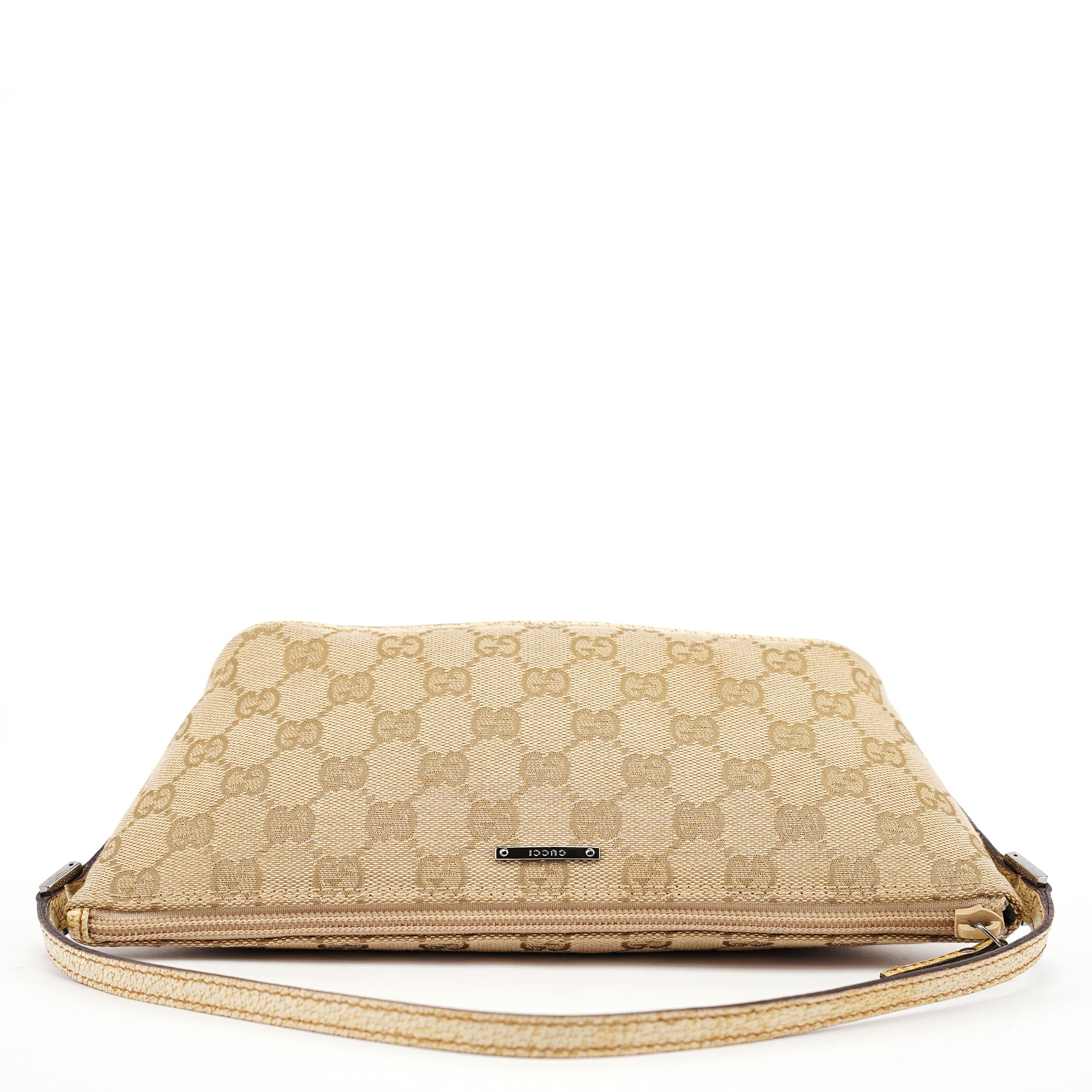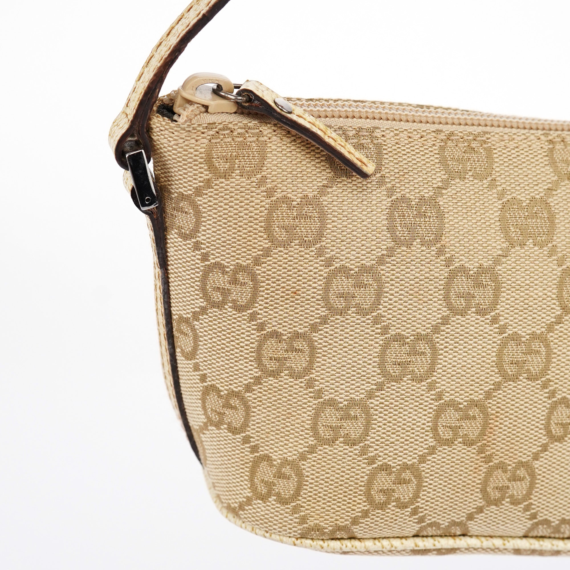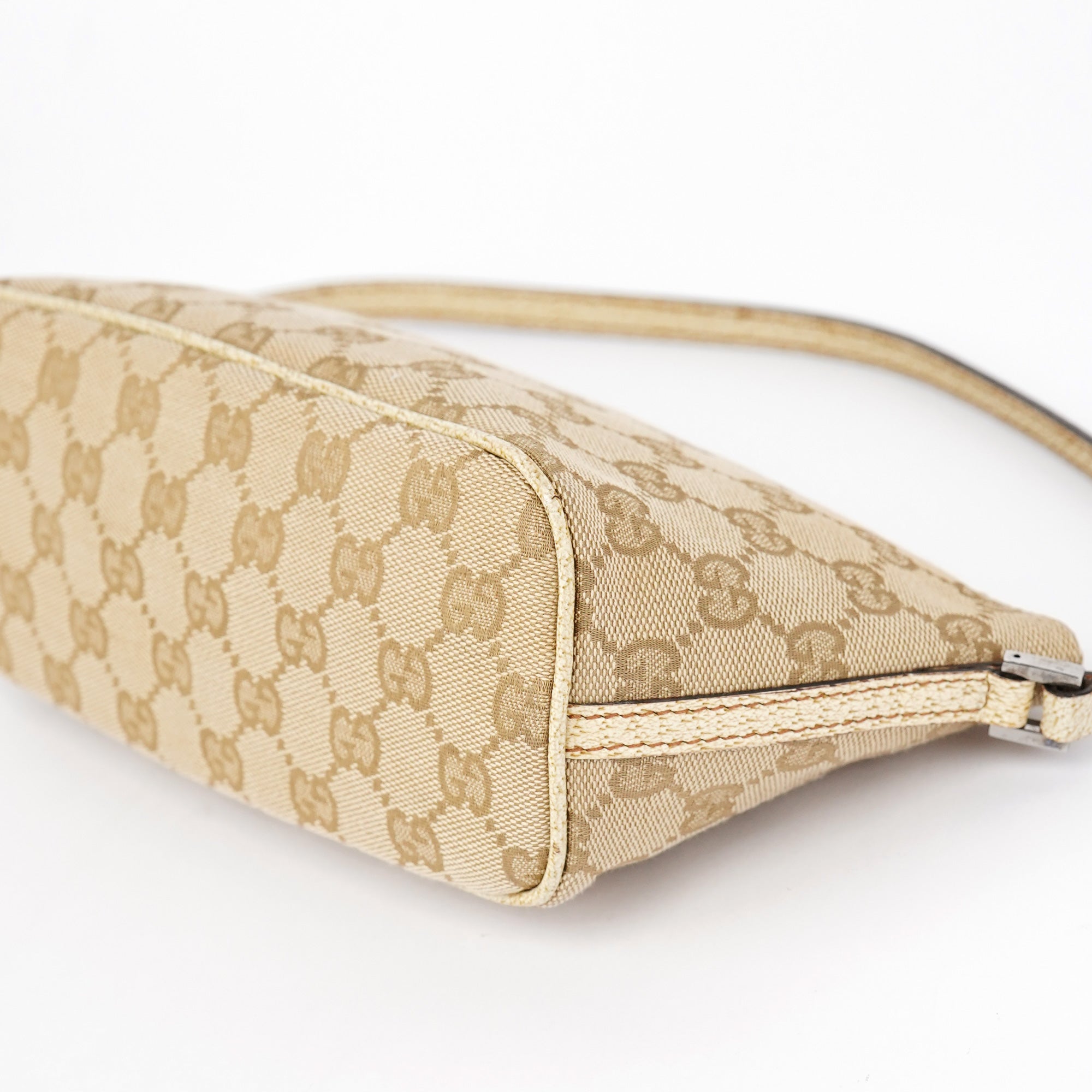 Designed in the early 2000s by Tom Ford, this Gucci GG Boat Pochette is crafted from beige GG canvas with tonal leather trim. It features a sleek rectangular silhouette with a top zip closure, a slim flat strap, and a fabric-lined interior with a discreet zip pocket.