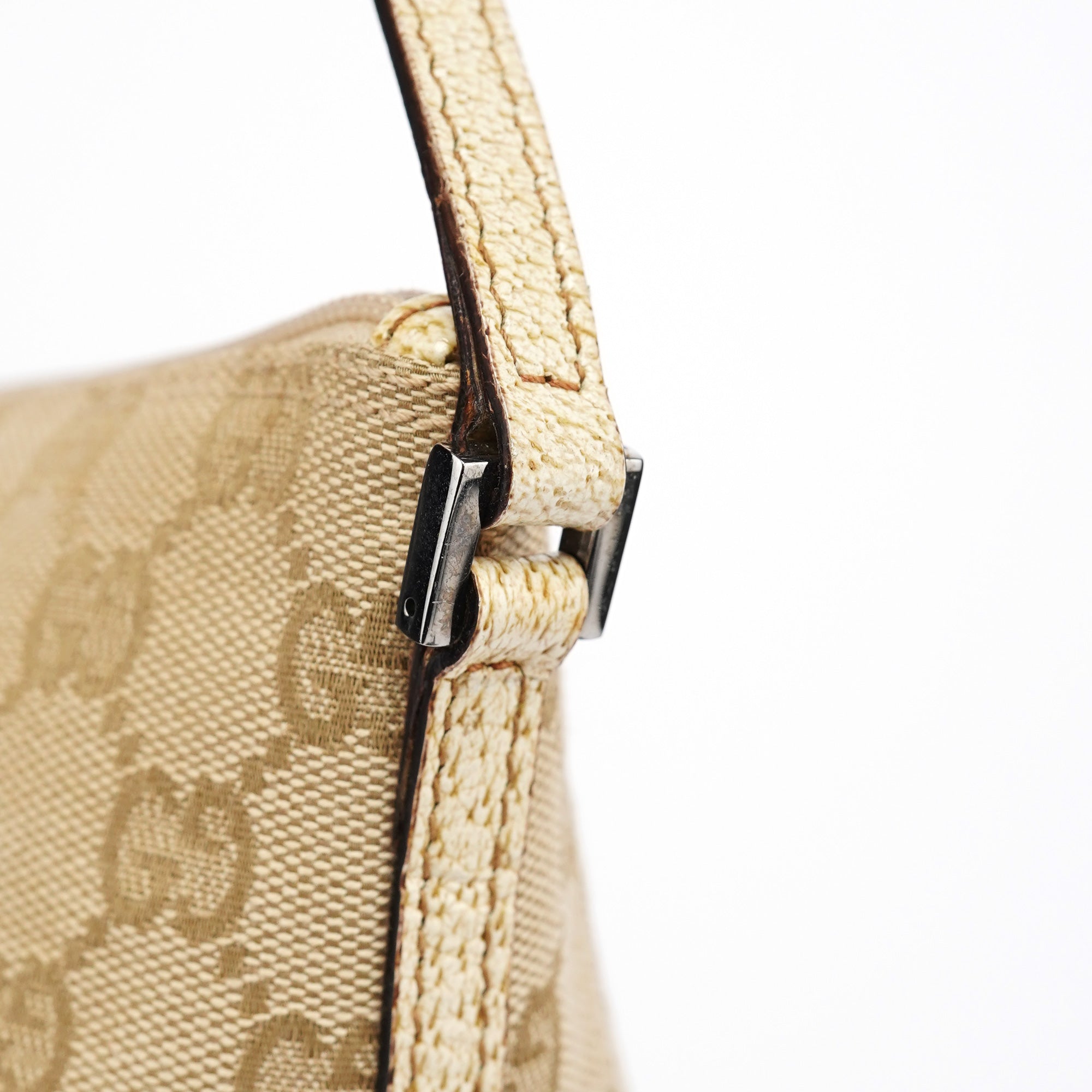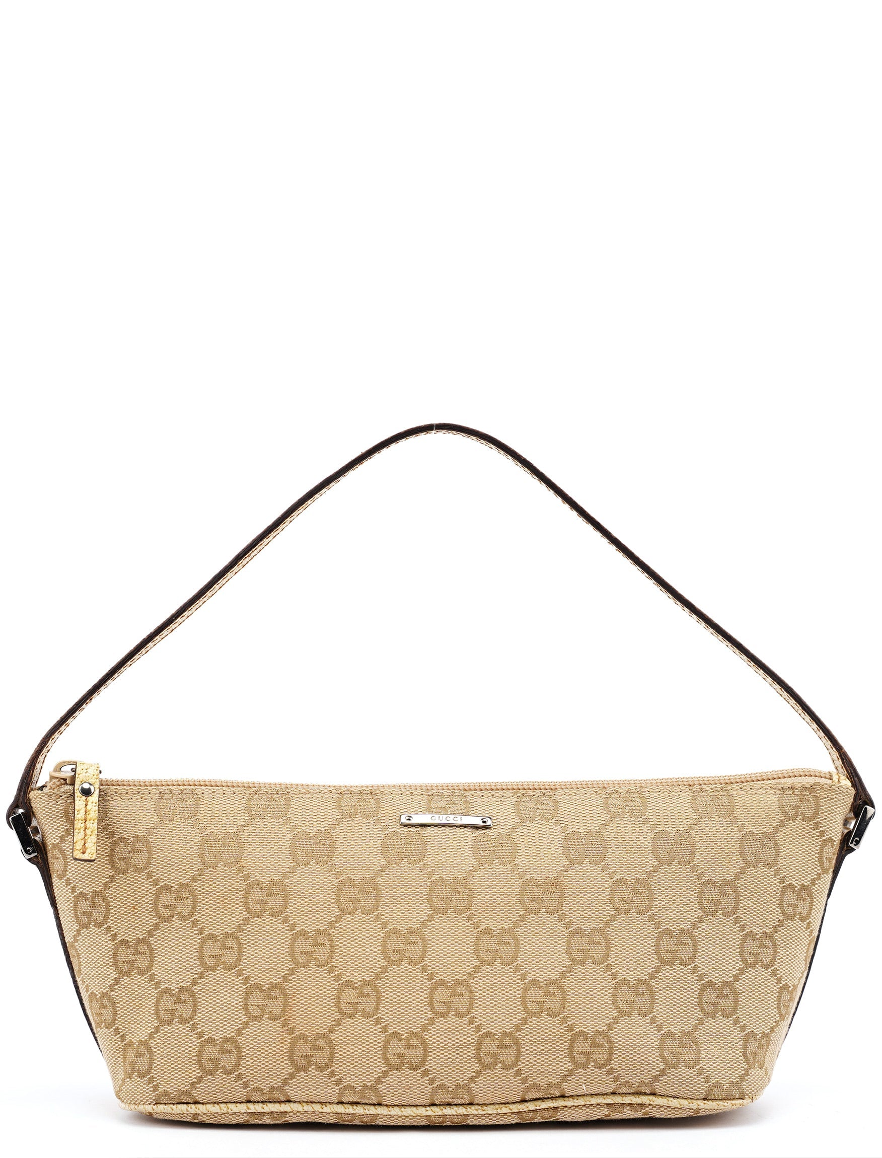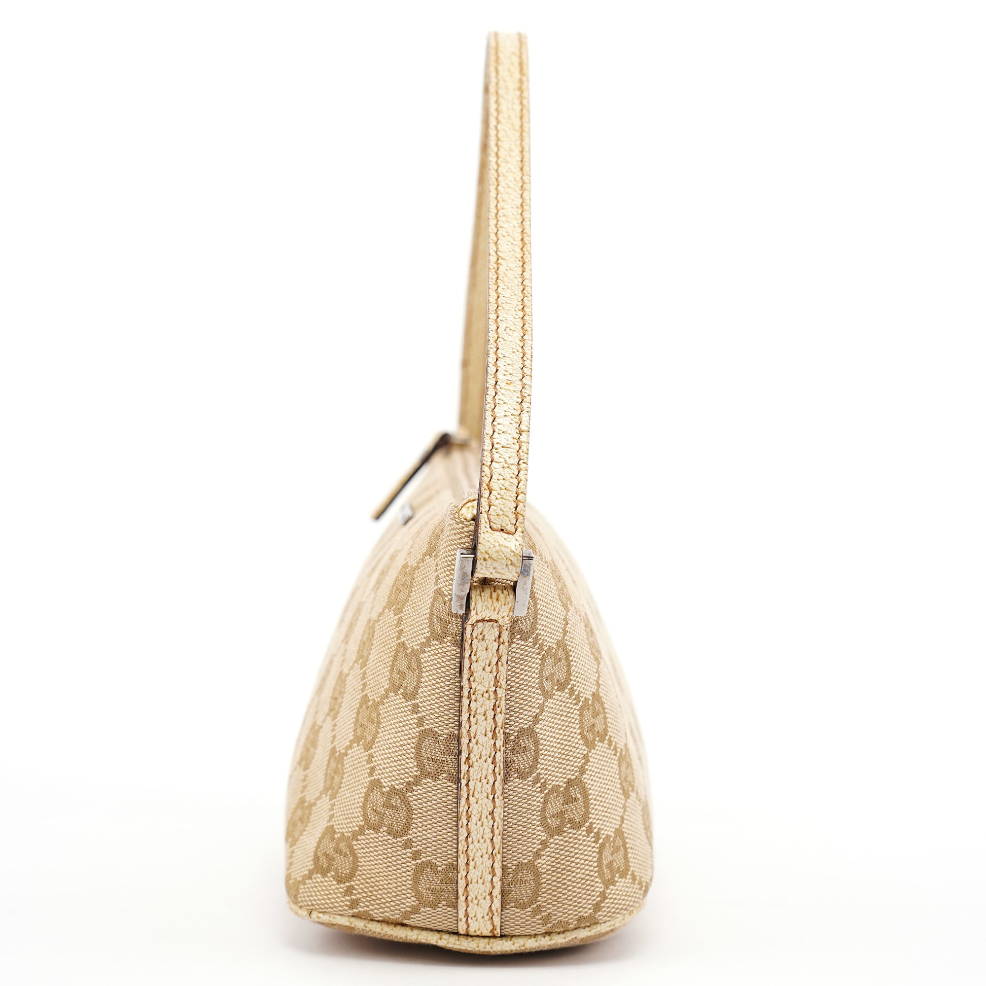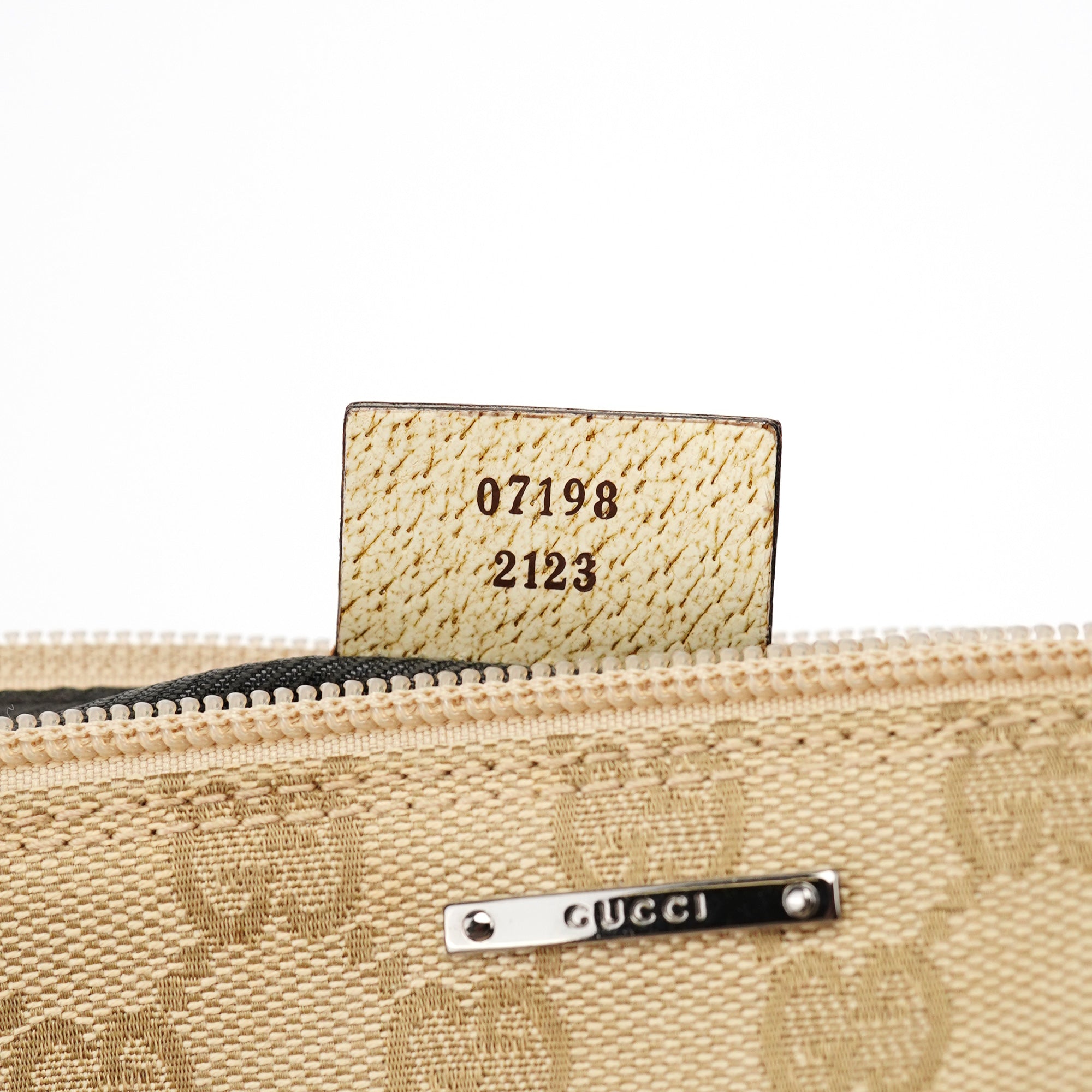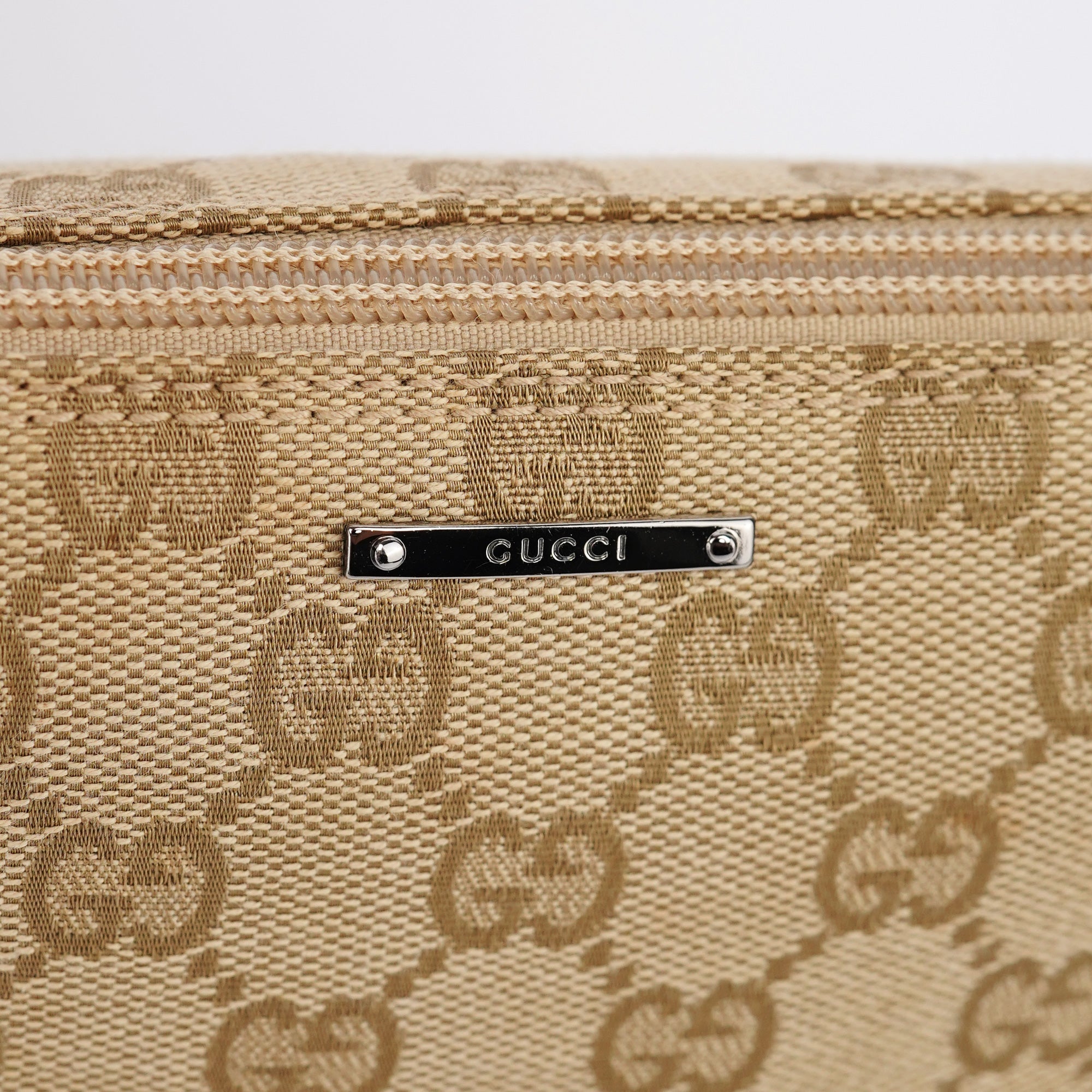 Designed in the early 2000s by Tom Ford, this Gucci GG Boat Pochette is crafted from beige GG canvas with tonal leather trim. It features a sleek rectangular silhouette with a top zip closure, a slim flat strap, and a fabric-lined interior with a discreet zip pocket.
