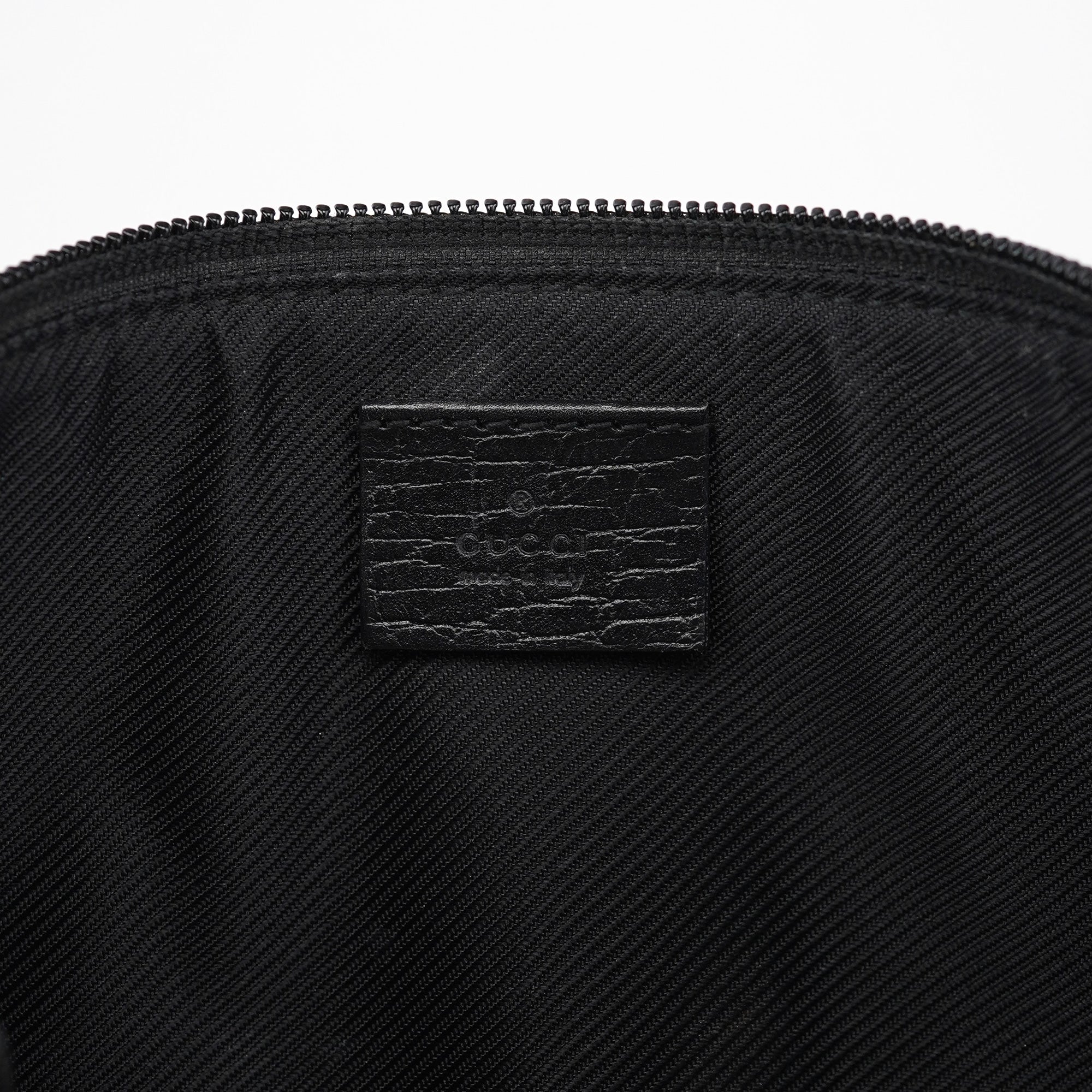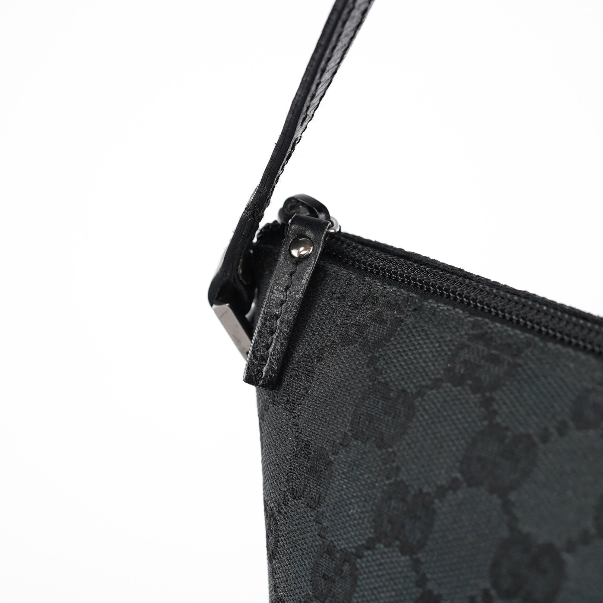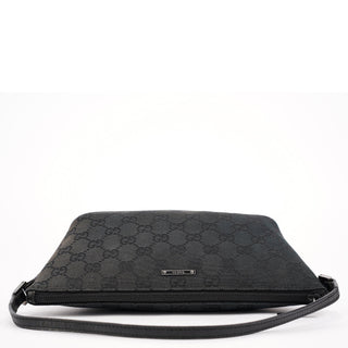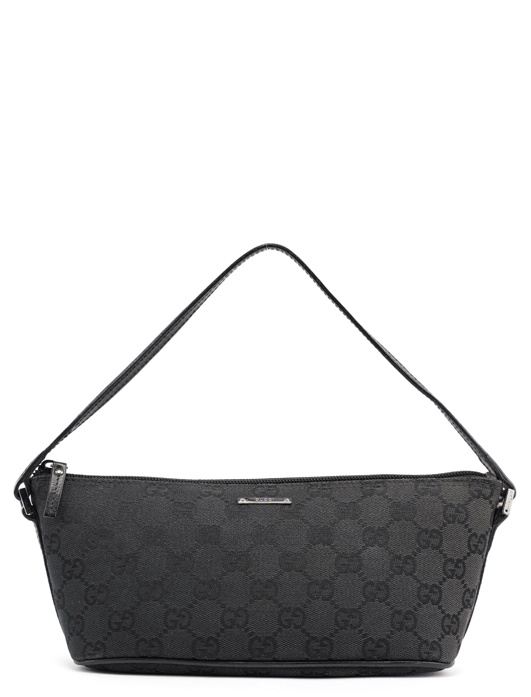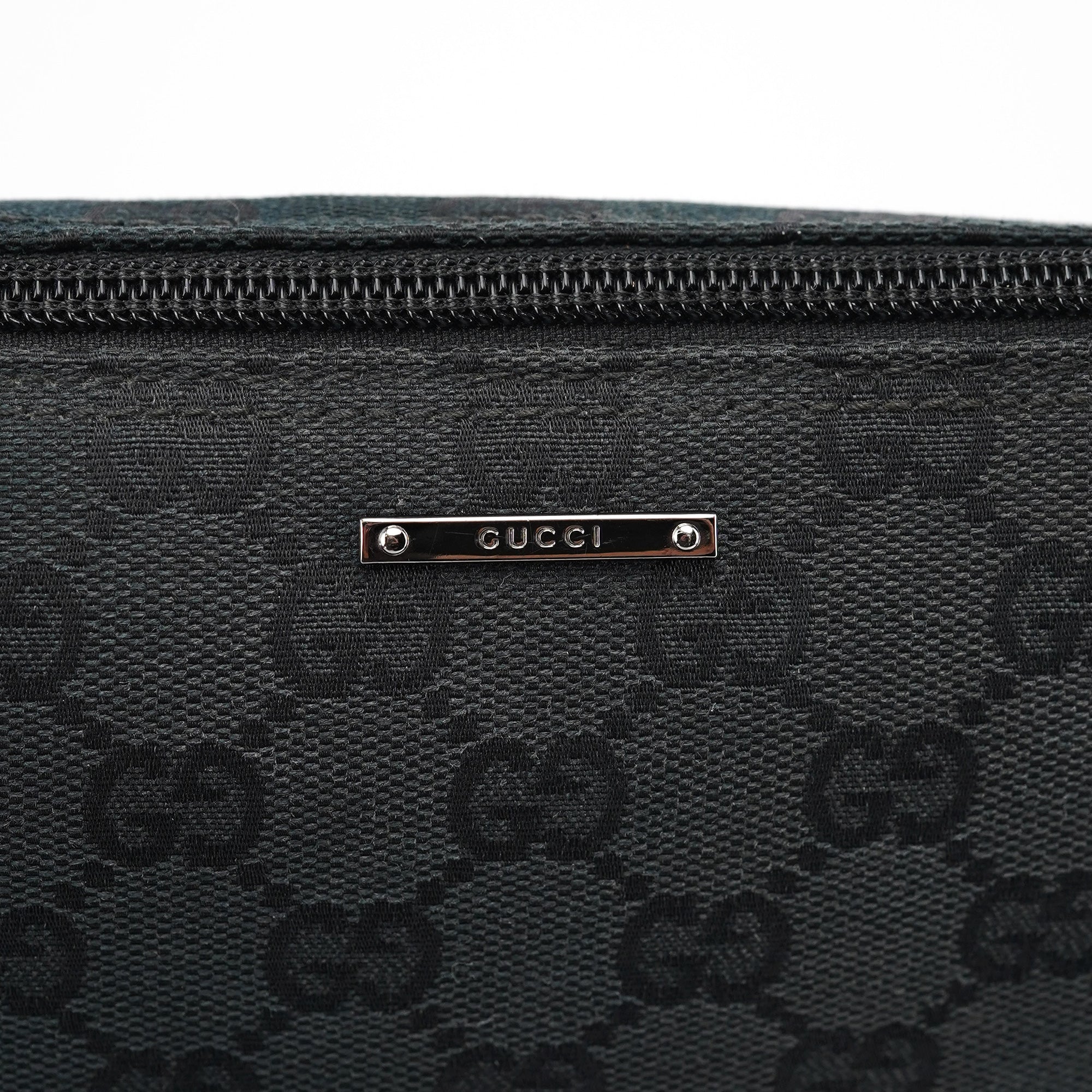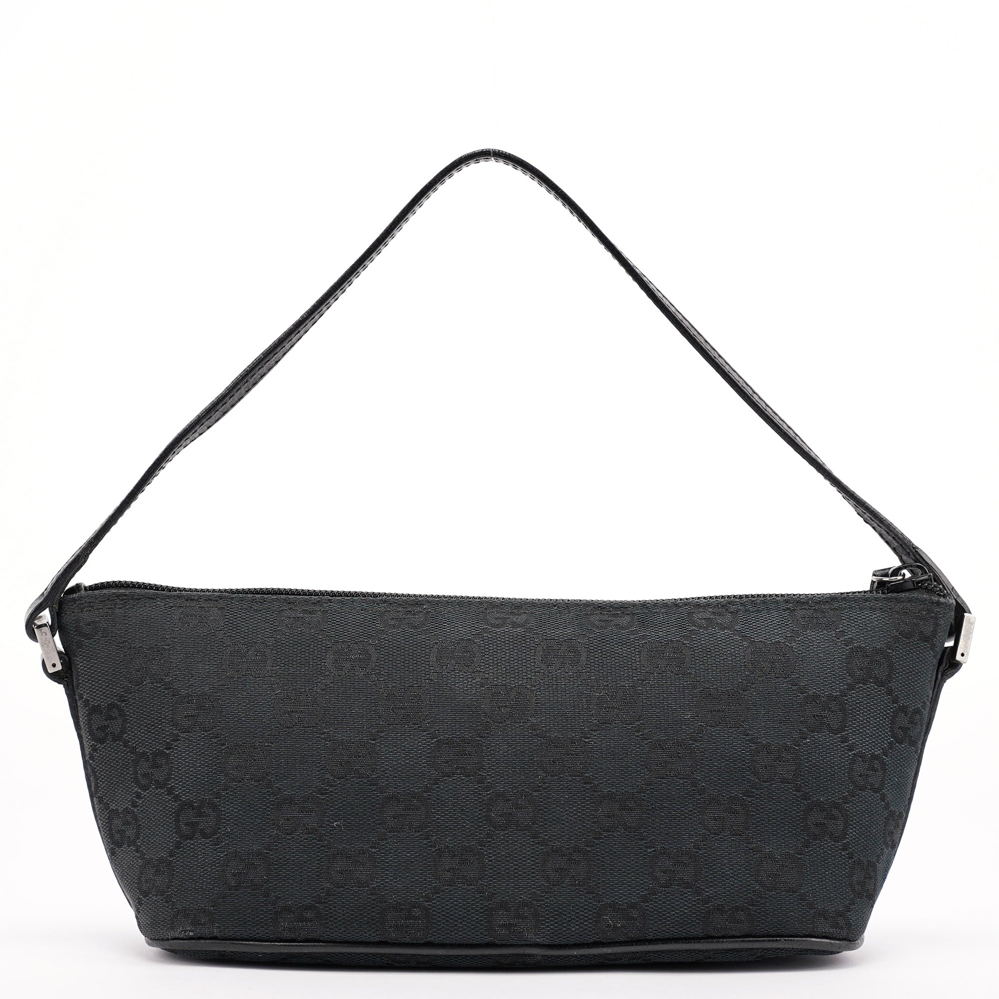 Designed in the early 2000s, this Gucci GG Boat Pochette is crafted from black GG canvas with a tonal black leather trim and silver-tone hardware. The slim silhouette features a top zipper closure, a flat leather shoulder strap, and a black logo tag at the front. The interior is lined in black fabric with one zip pocket.