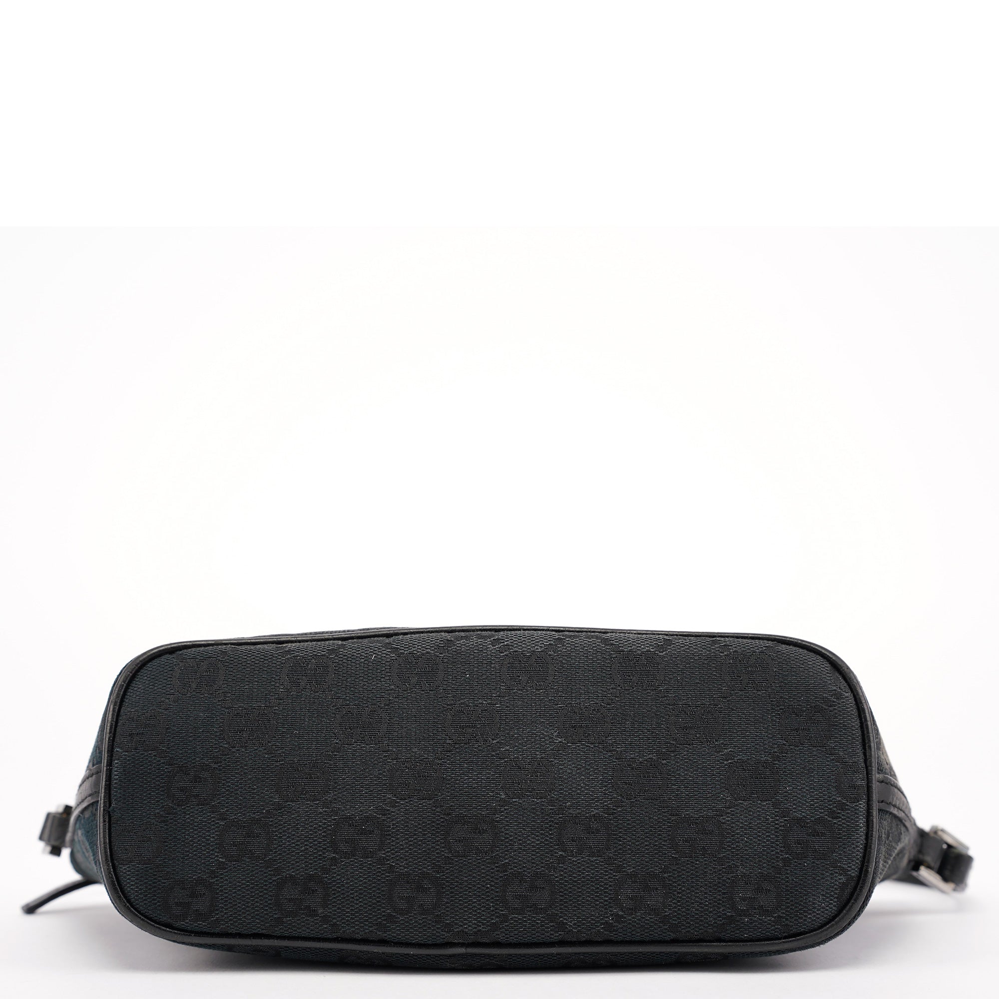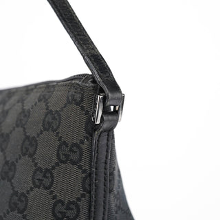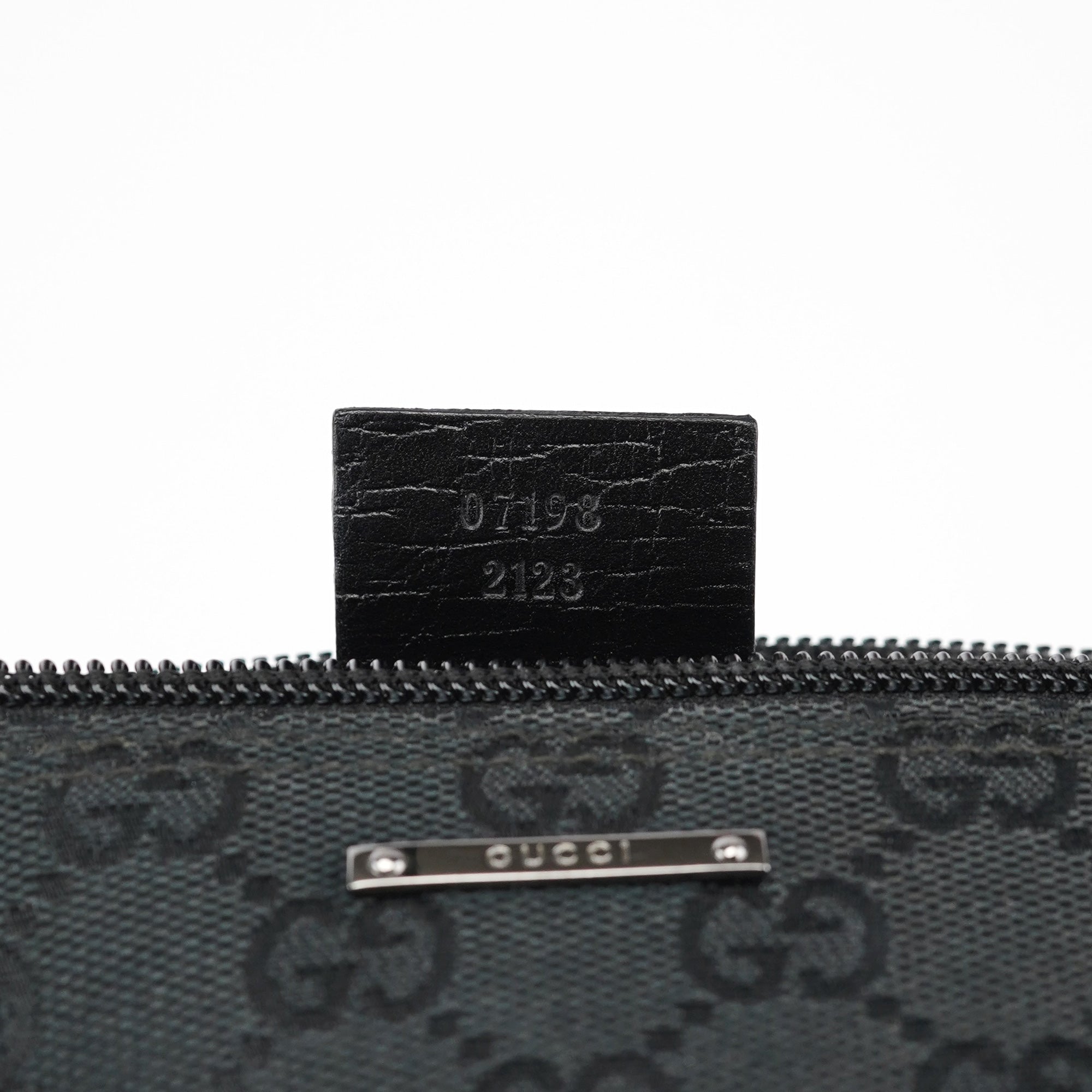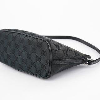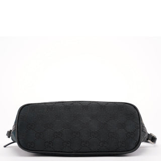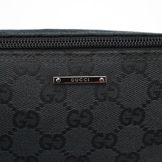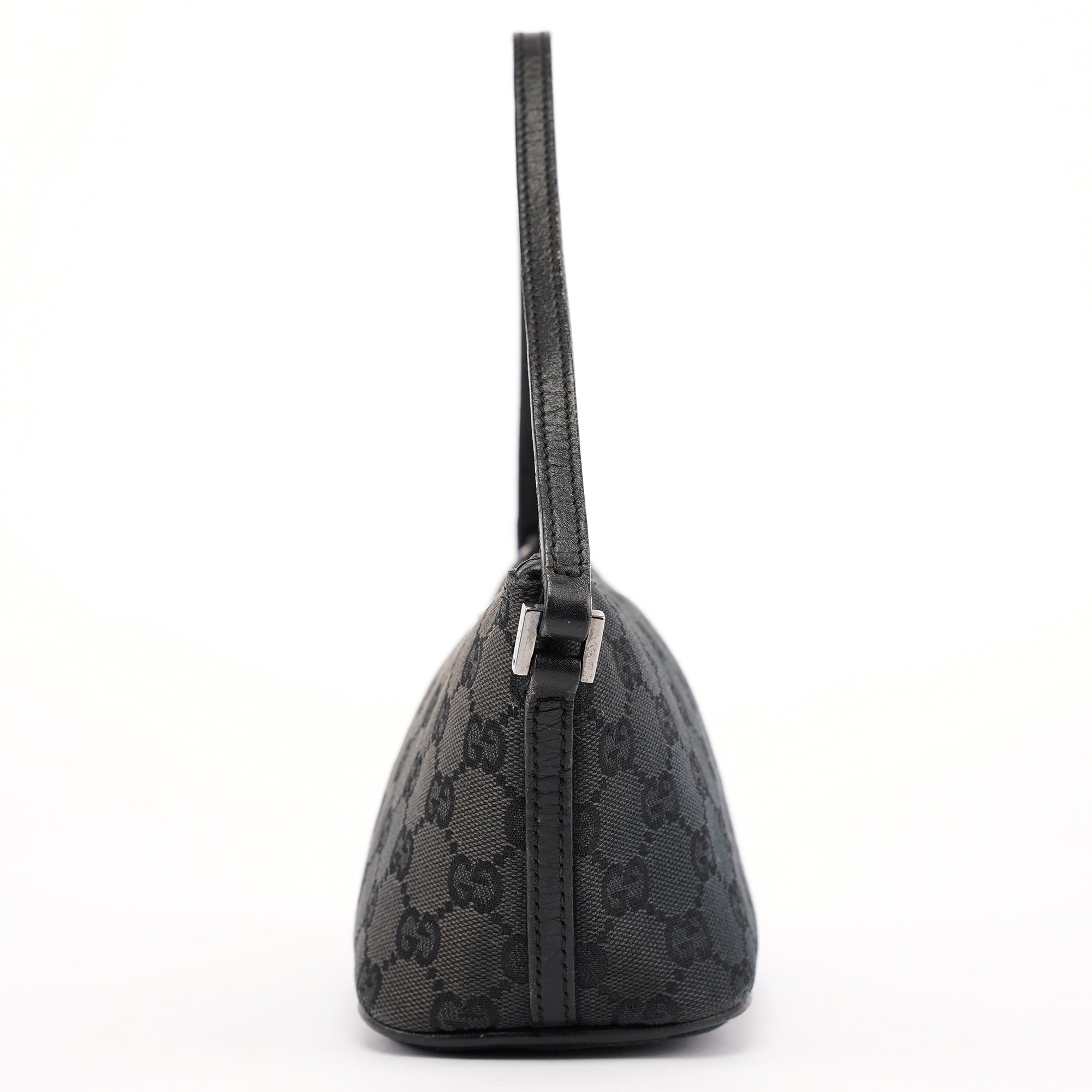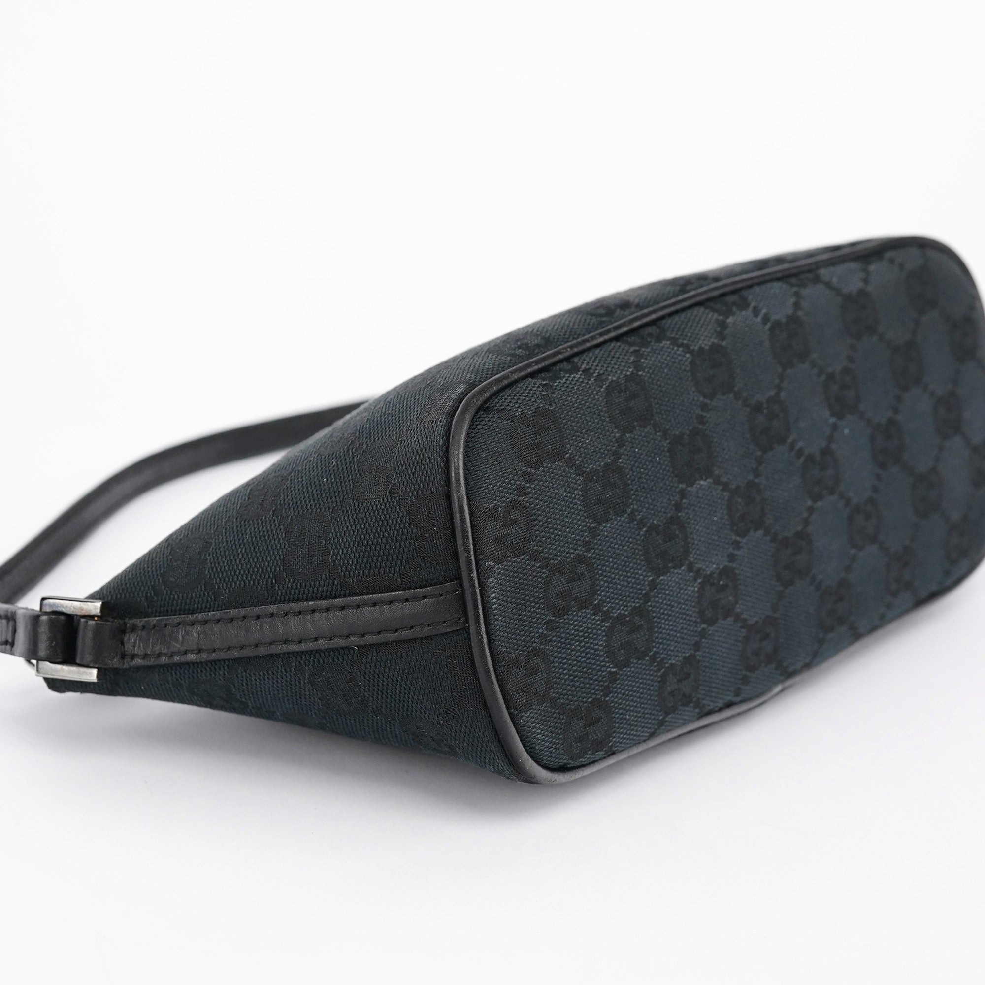 Designed in the early 2000s, this Gucci GG Boat Pochette is crafted from black GG canvas with a tonal black leather trim and silver-tone hardware. The slim silhouette features a top zipper closure, a flat leather shoulder strap, and a black logo tag at the front. The interior is lined in black fabric with one zip pocket.