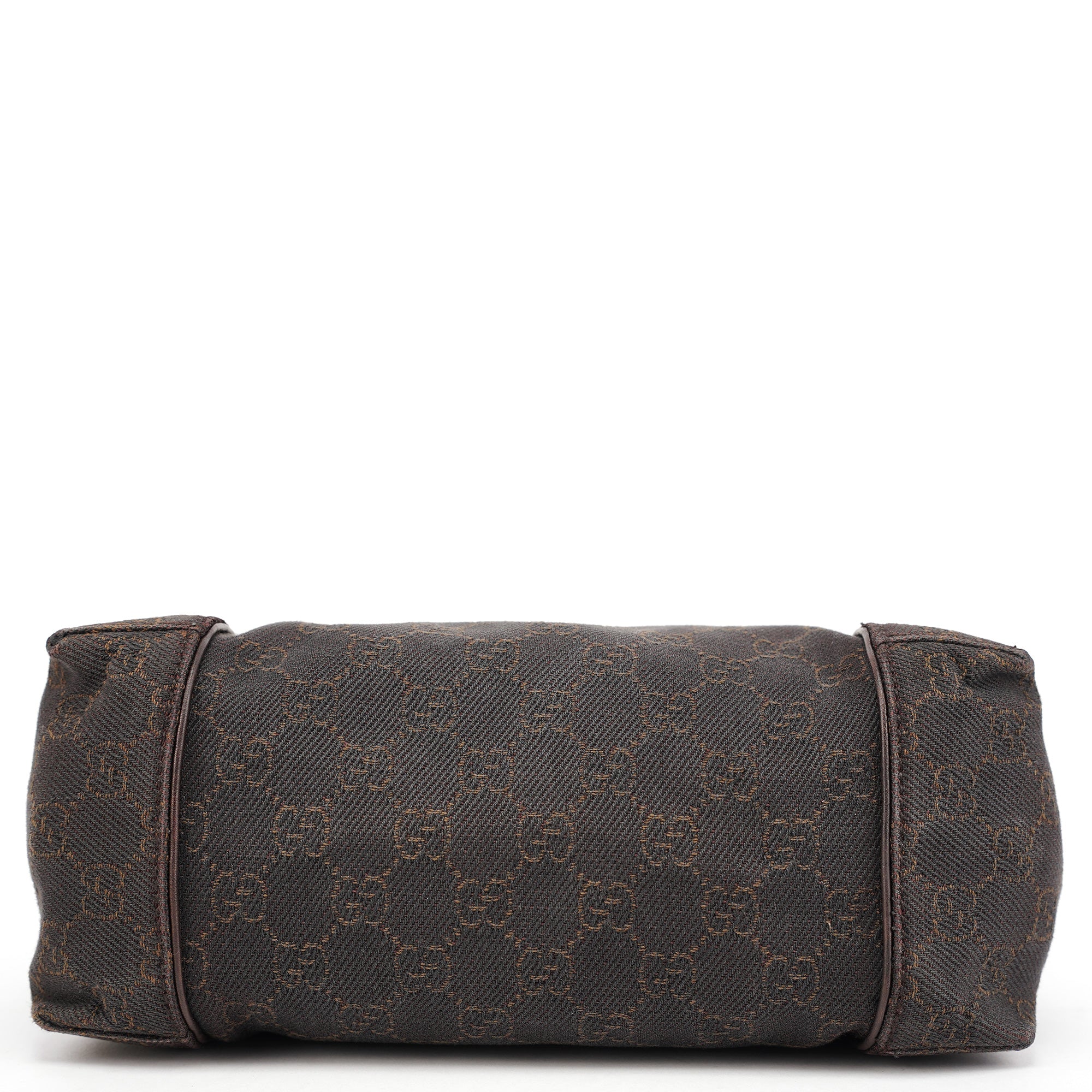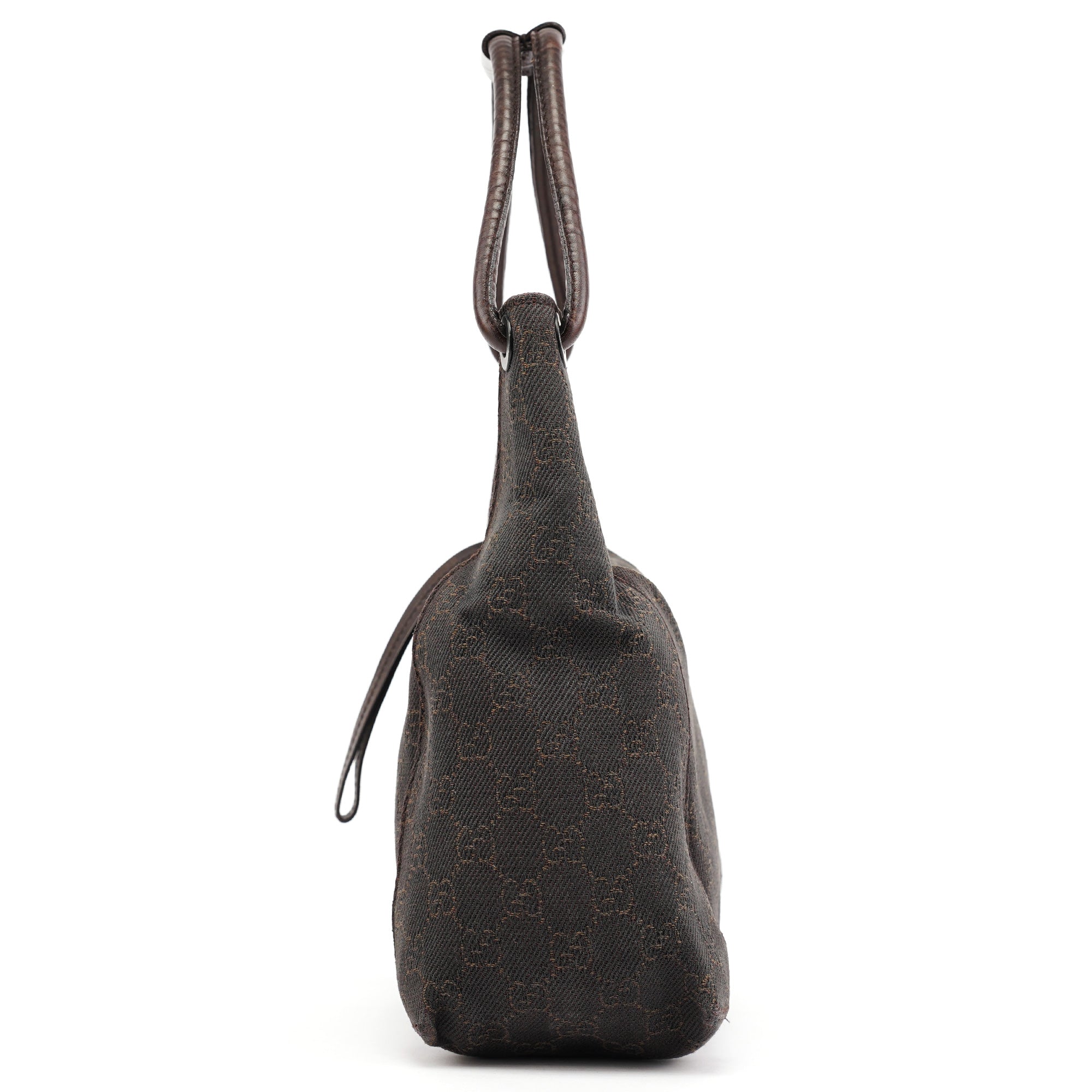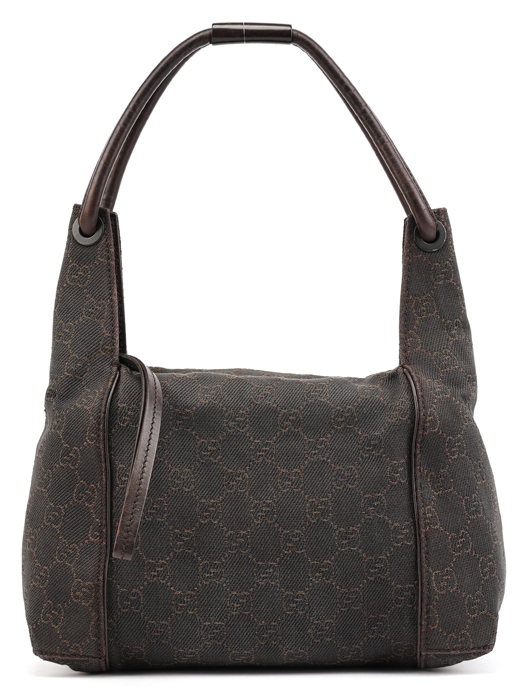 Designed in the early 2000s by Tom Ford, this Gucci shoulder bag is crafted in brown GG canvas with tonal leather trim and a structured, softly curved silhouette. It features dual top handles, a top zip closure, and a spacious fabric-lined interior with a single zip pocket.
