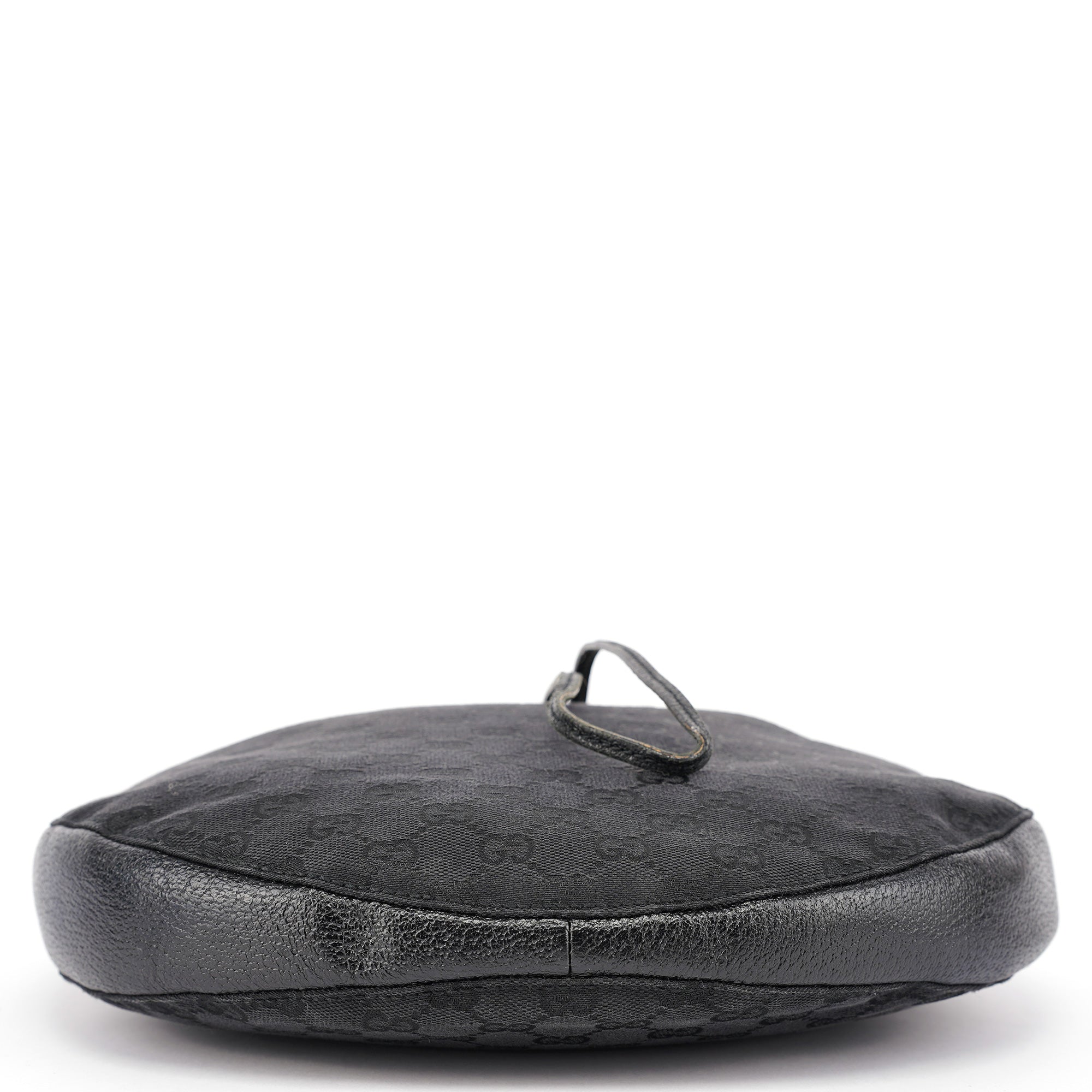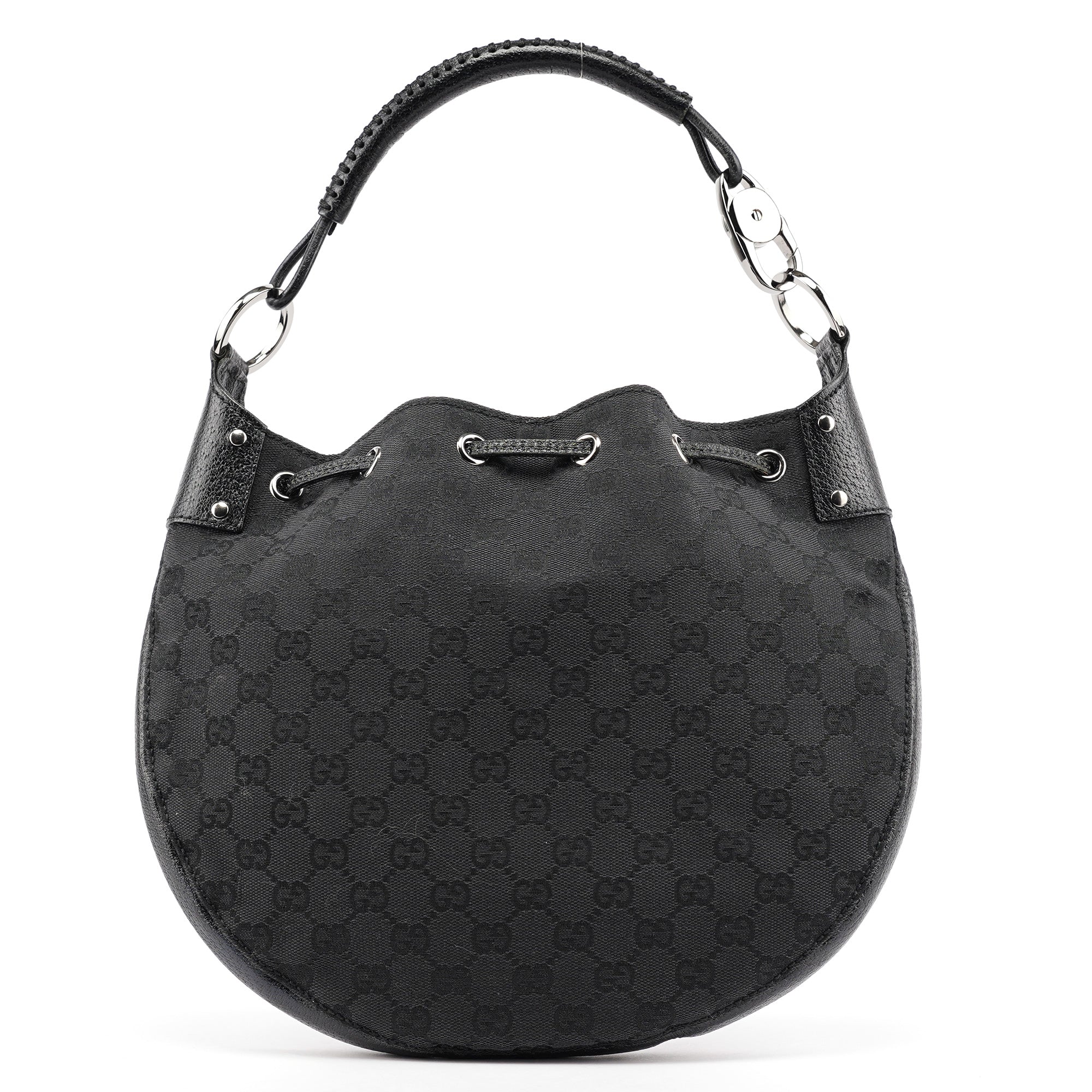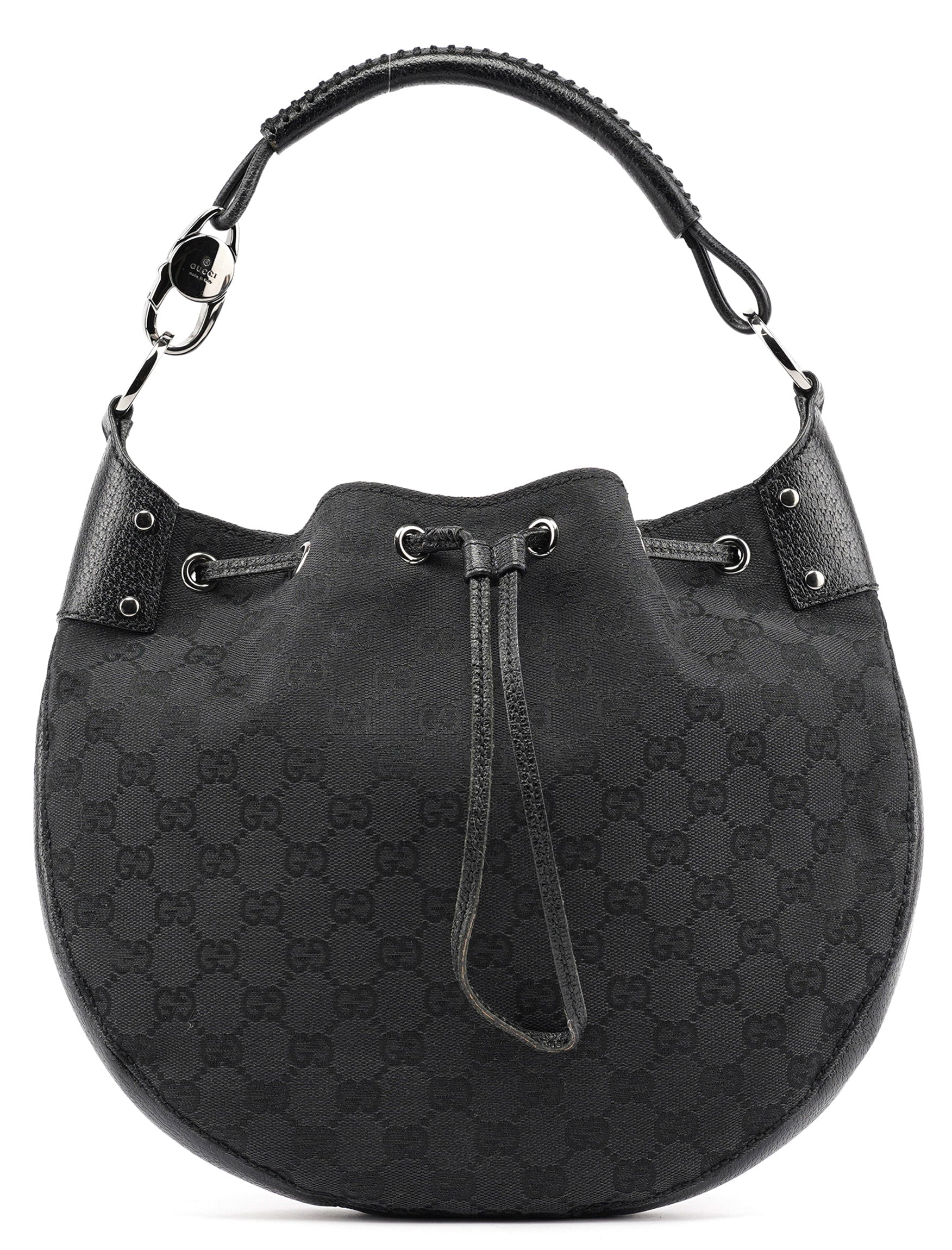 Designed in the early 2000s by Tom Ford, this Gucci GG round shoulder bag is crafted from black GG canvas with smooth leather trim and polished silver‑tone hardware. The structured circular silhouette features a convenient top zip closure and a matching leather shoulder strap. Inside is a fabric-lined compartment with a zip pocket.