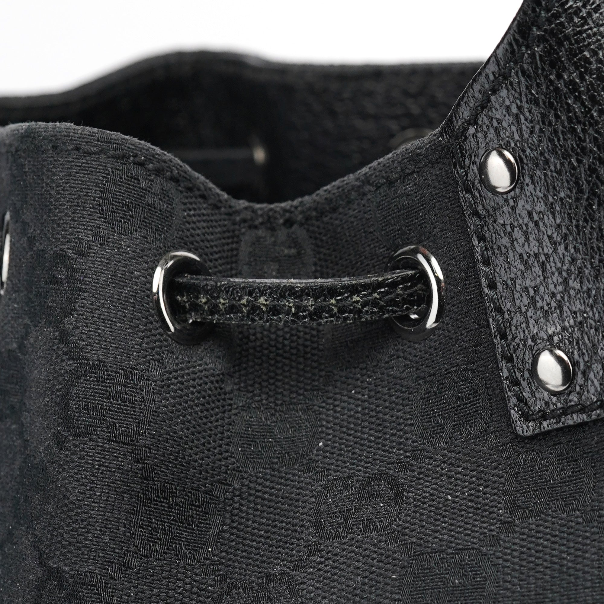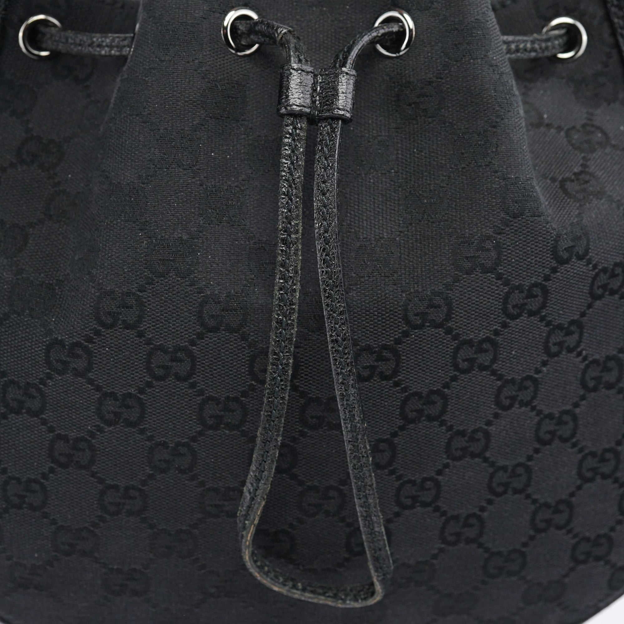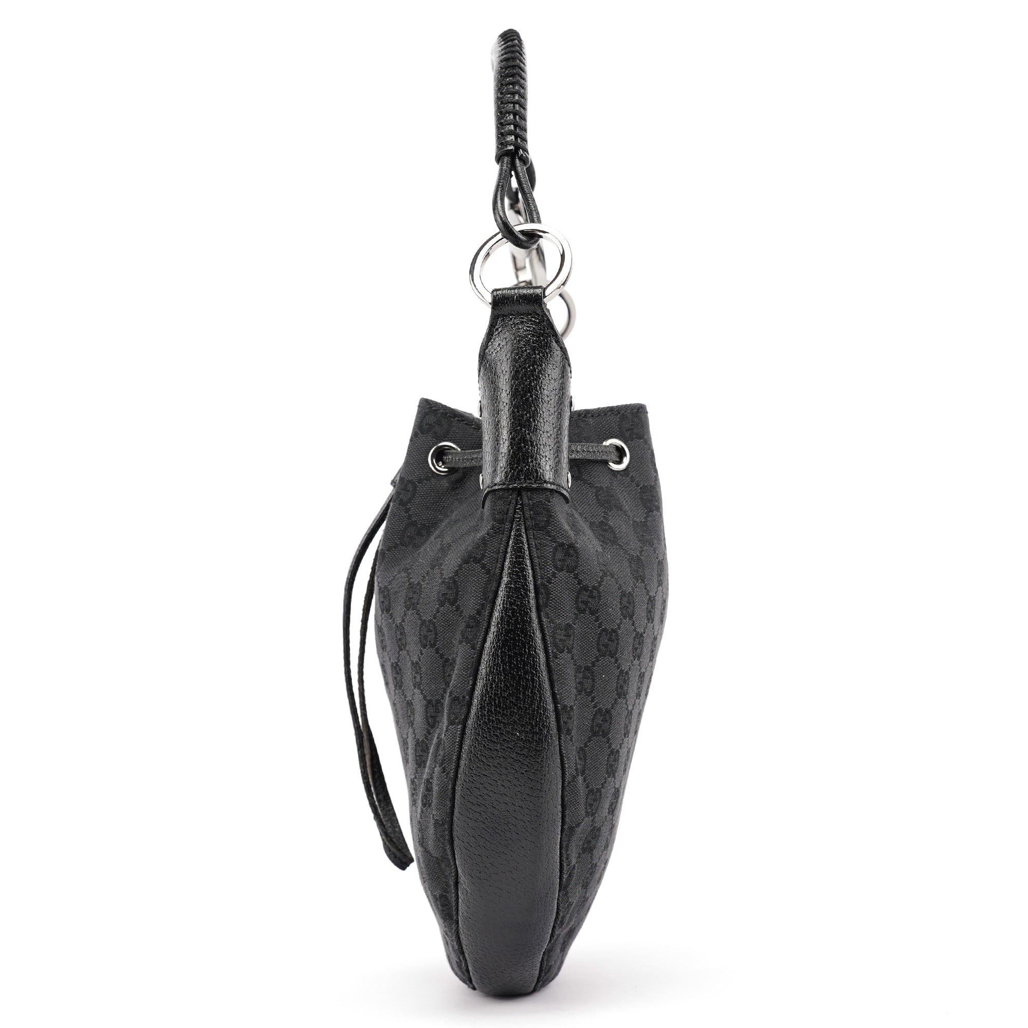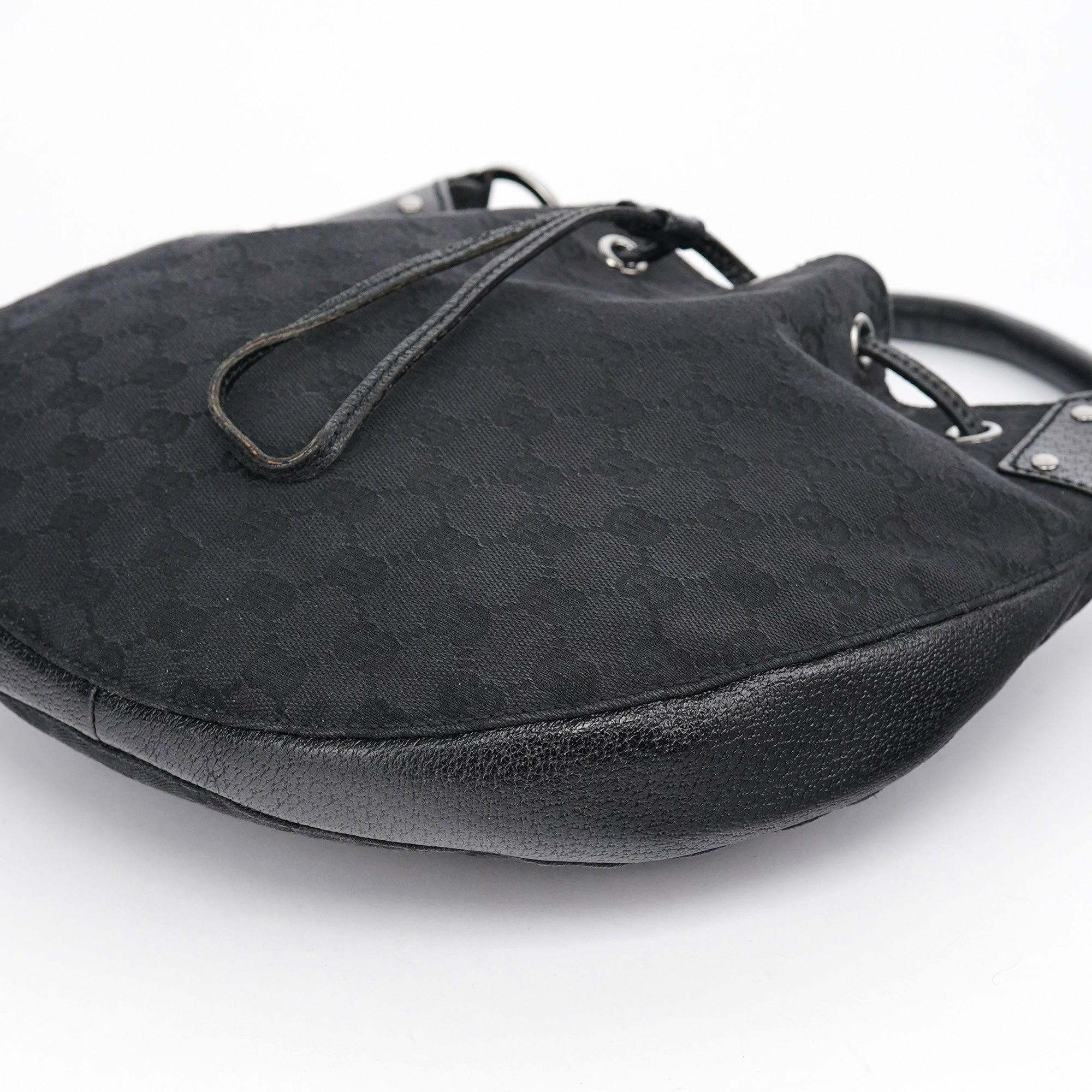 Designed in the early 2000s by Tom Ford, this Gucci GG round shoulder bag is crafted from black GG canvas with smooth leather trim and polished silver‑tone hardware. The structured circular silhouette features a convenient top zip closure and a matching leather shoulder strap. Inside is a fabric-lined compartment with a zip pocket.