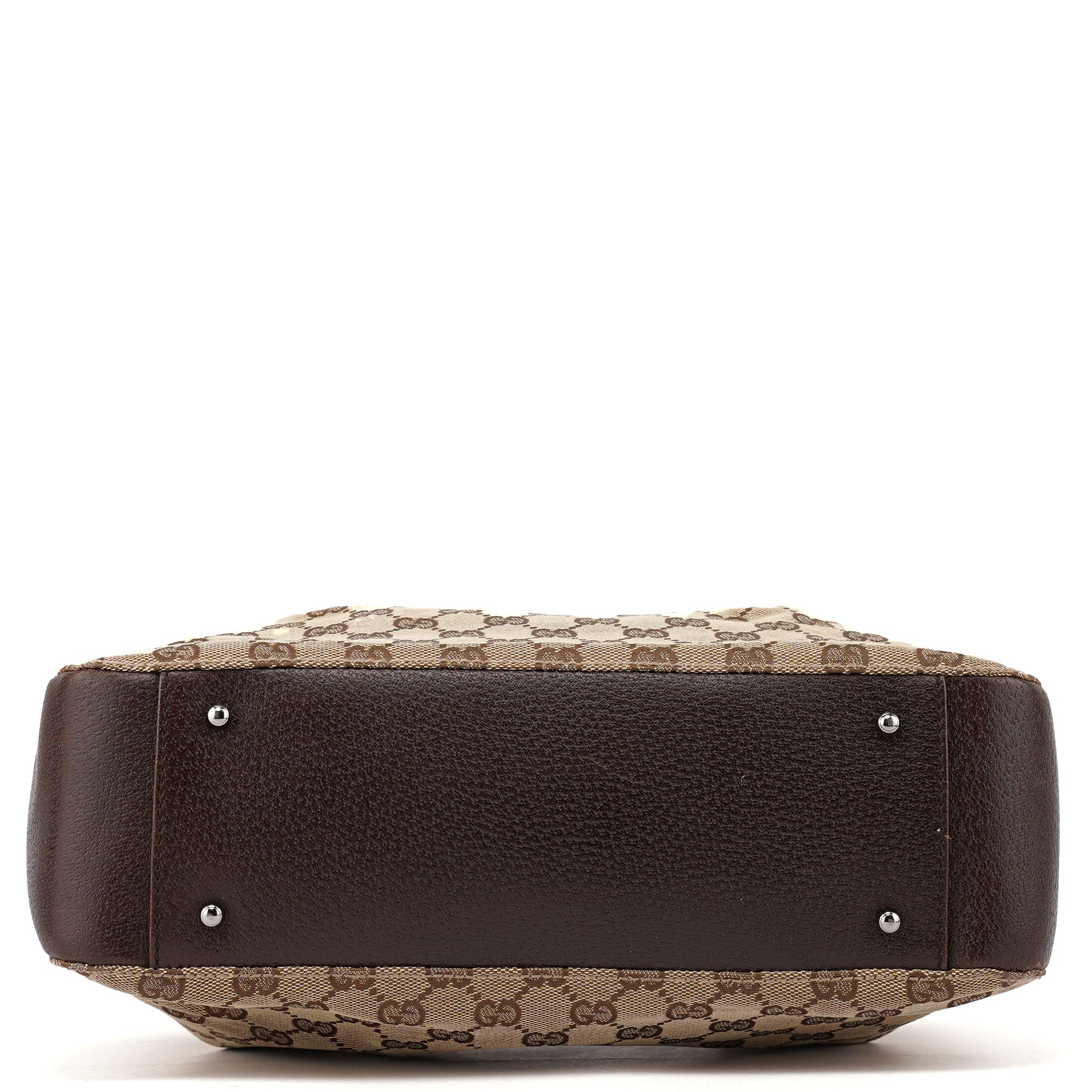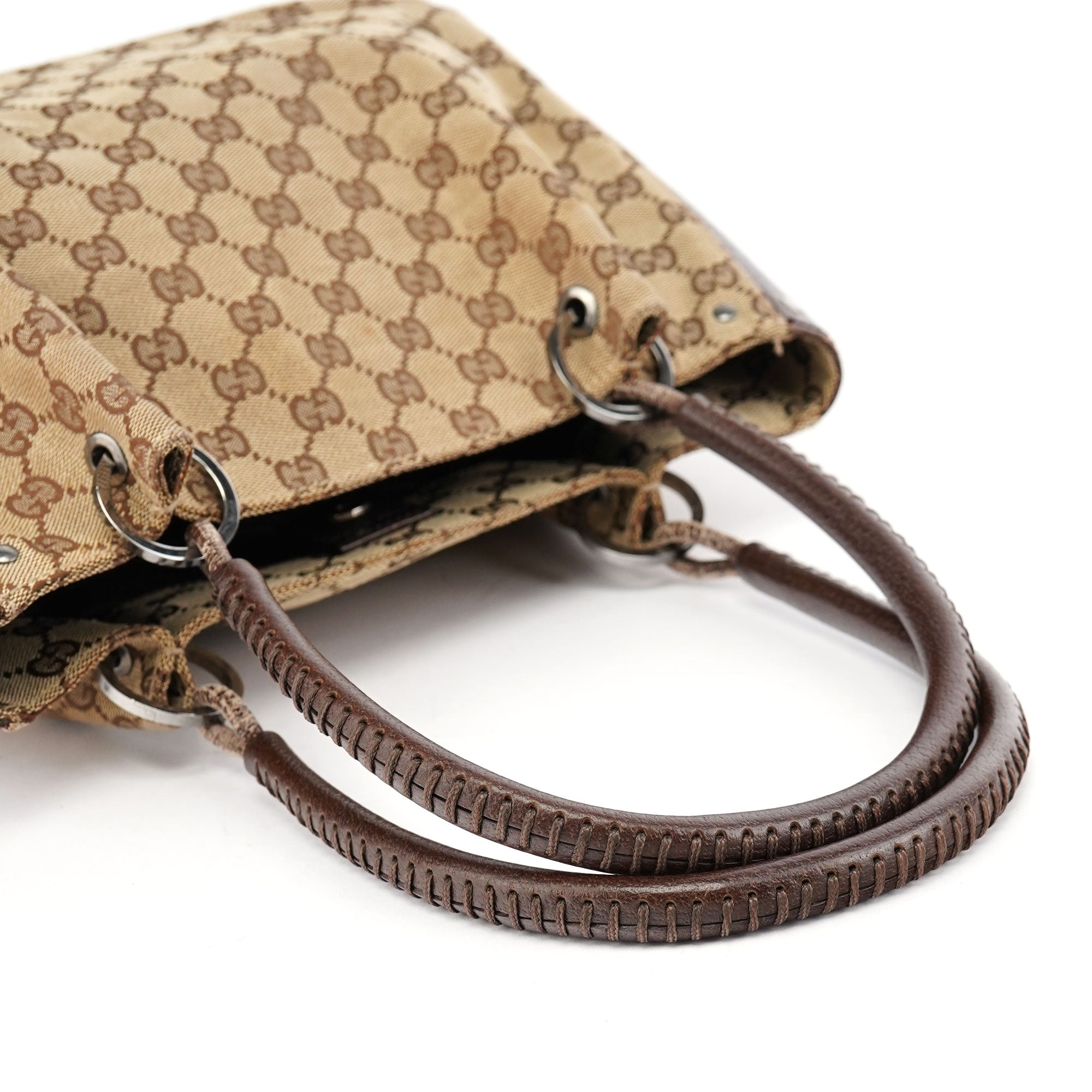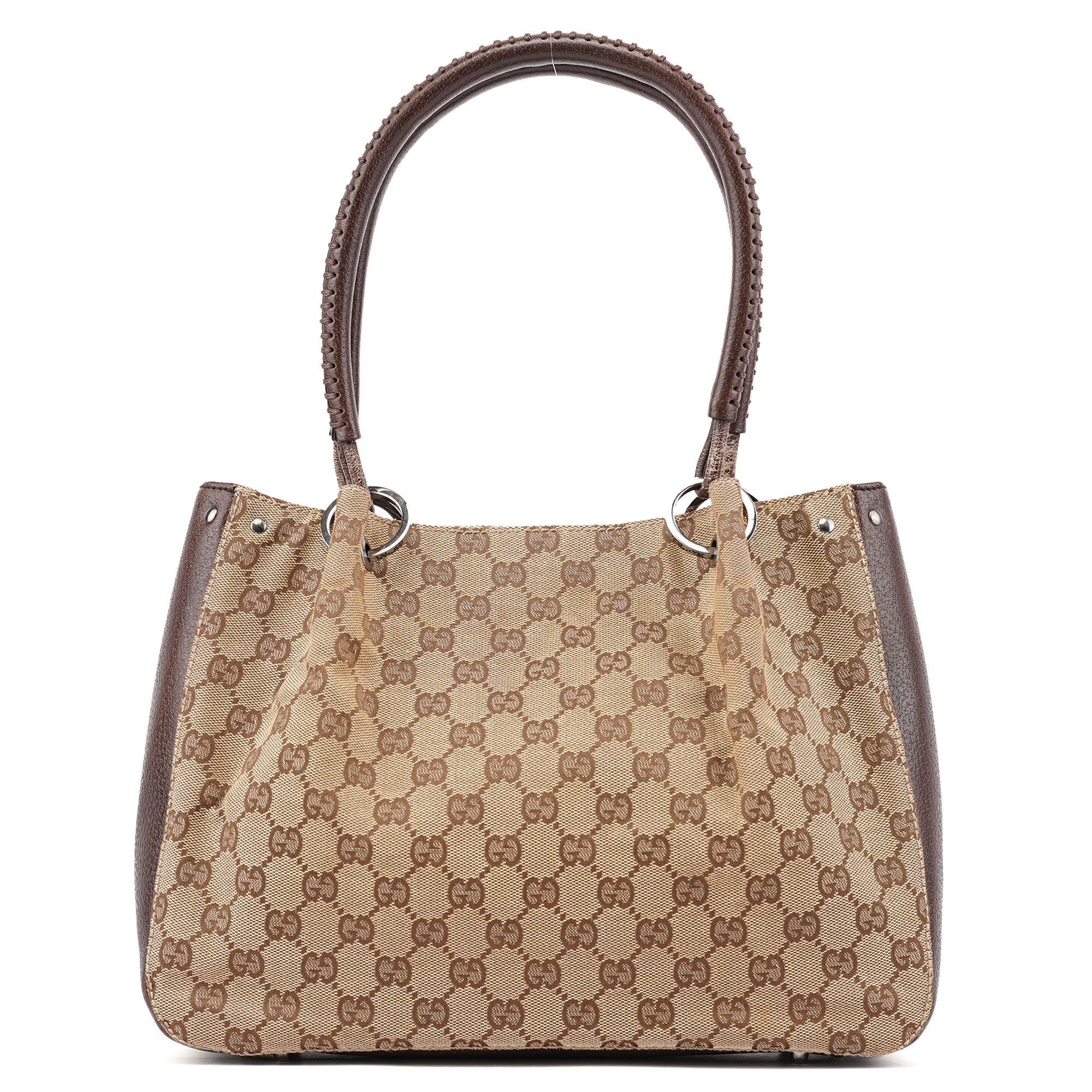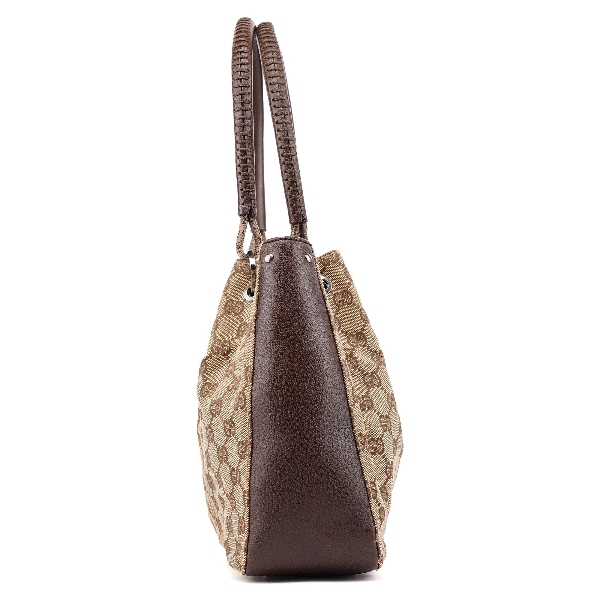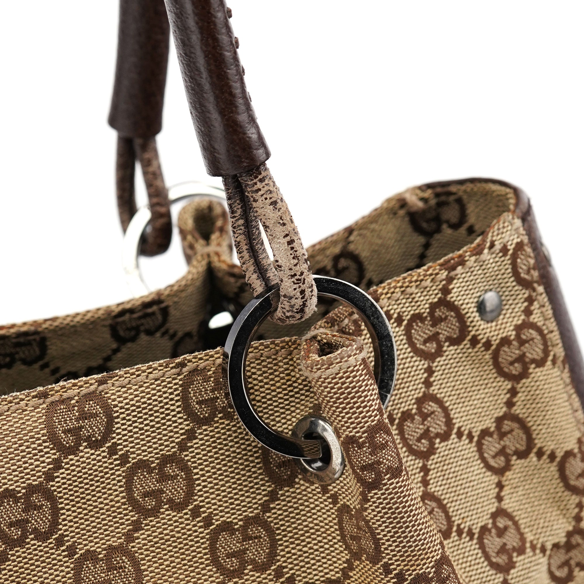 Designed in the early 2000s, this Gucci tote features GG monogram canvas with dark brown textured leather trim and dual top handles. The open-top design is finished with silver-tone rings and a fabric-lined interior with zip pocket.