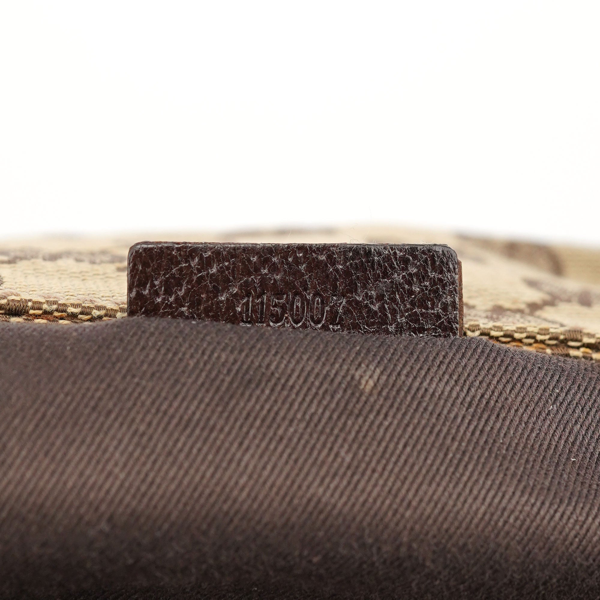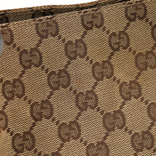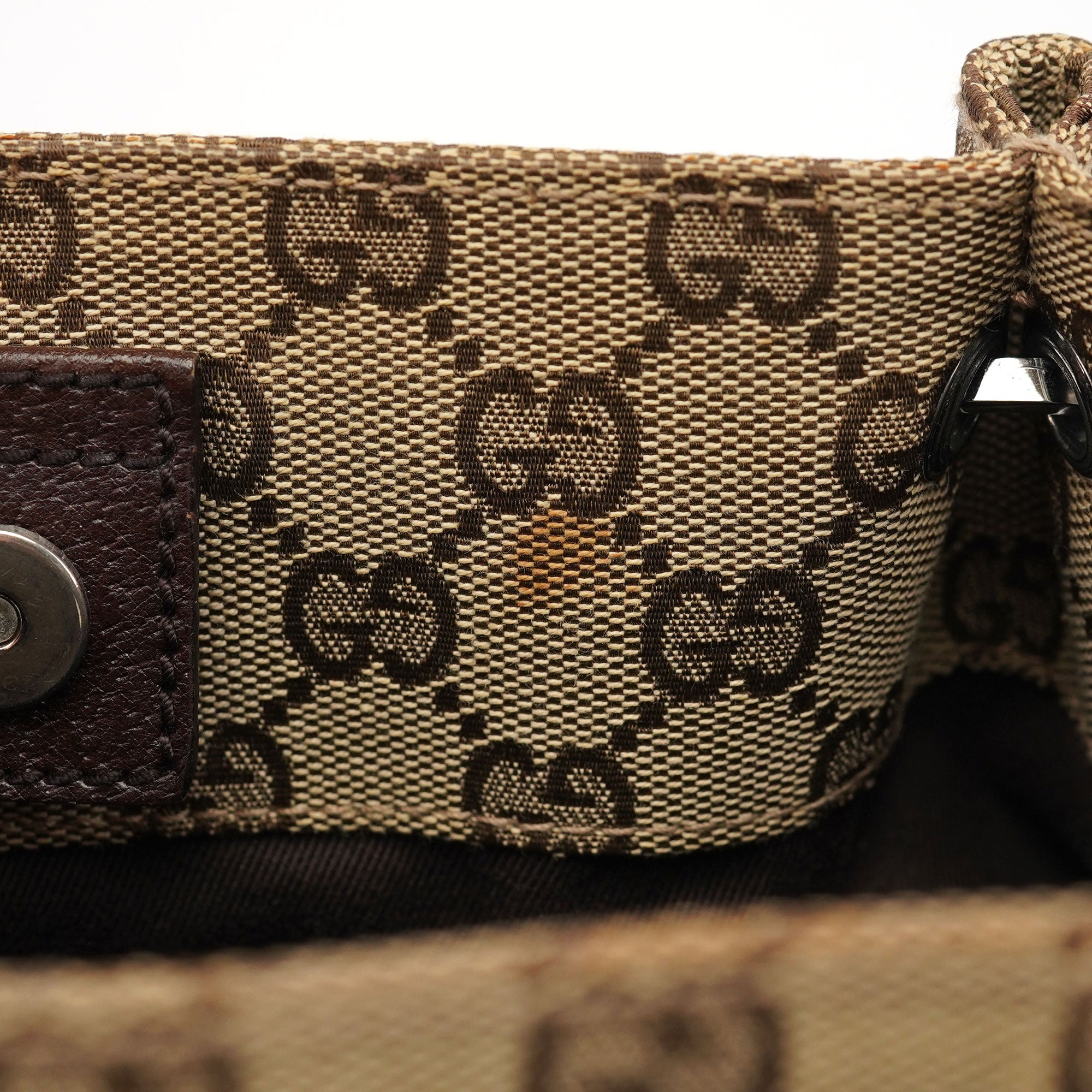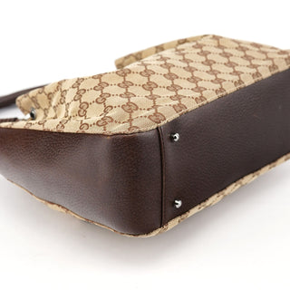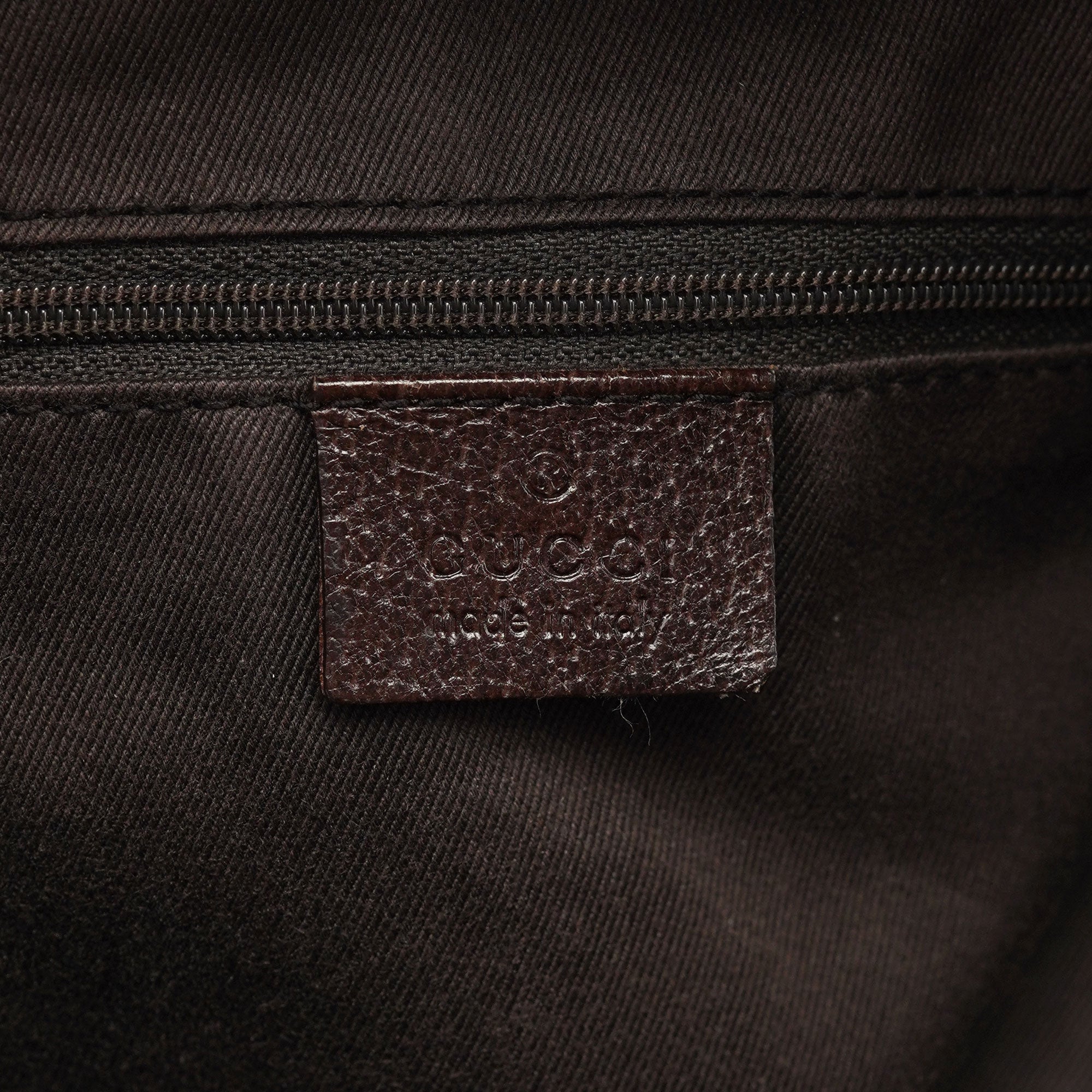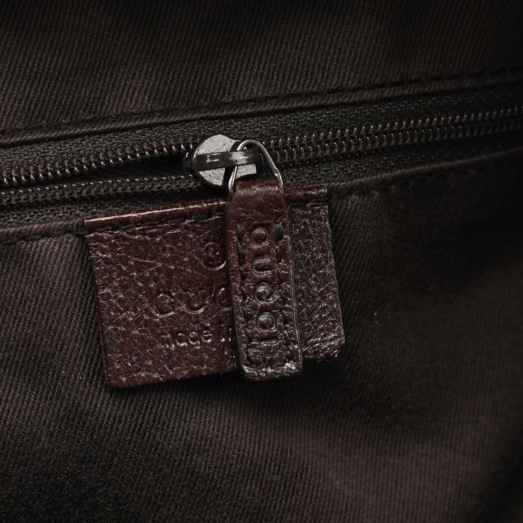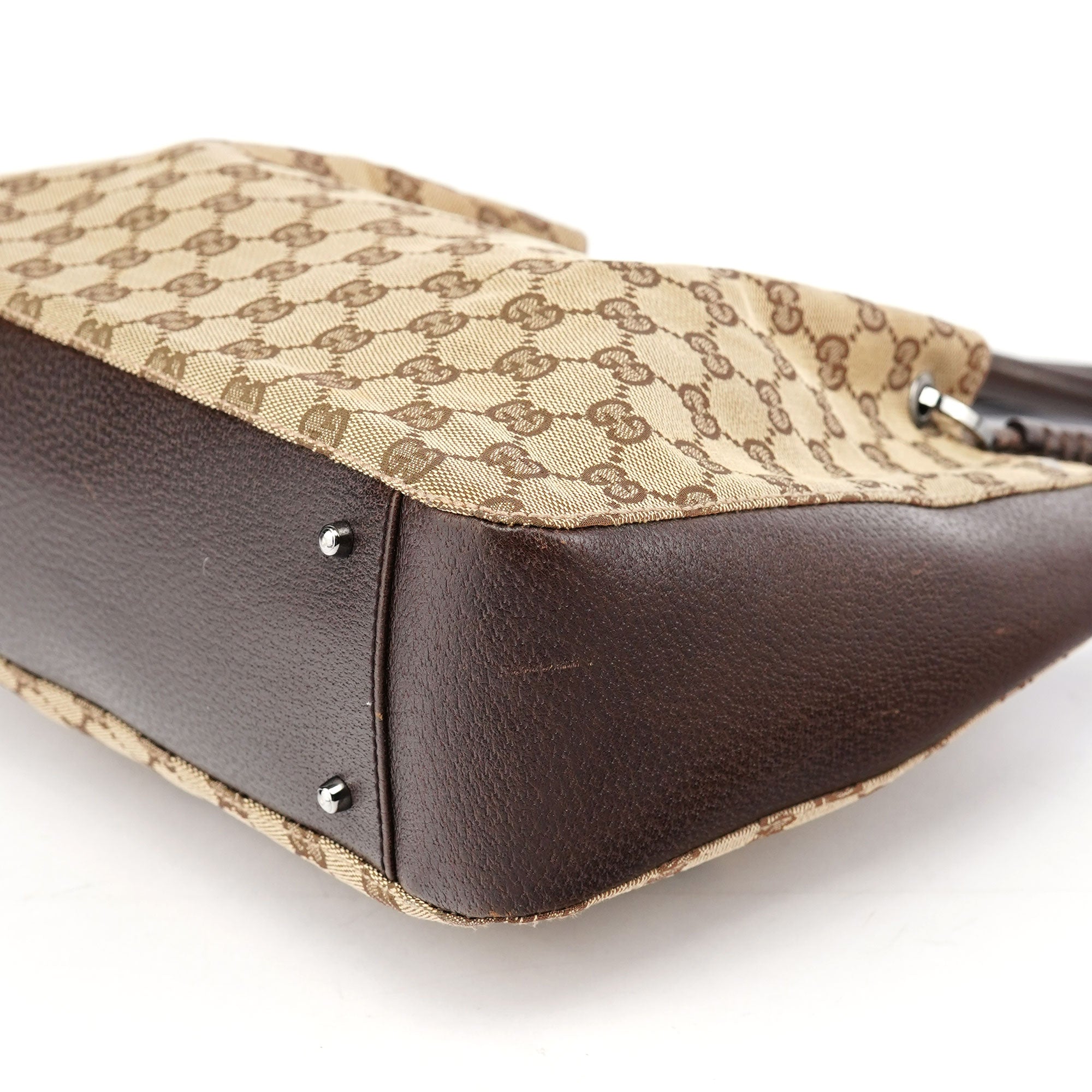 Designed in the early 2000s, this Gucci tote features GG monogram canvas with dark brown textured leather trim and dual top handles. The open-top design is finished with silver-tone rings and a fabric-lined interior with zip pocket.