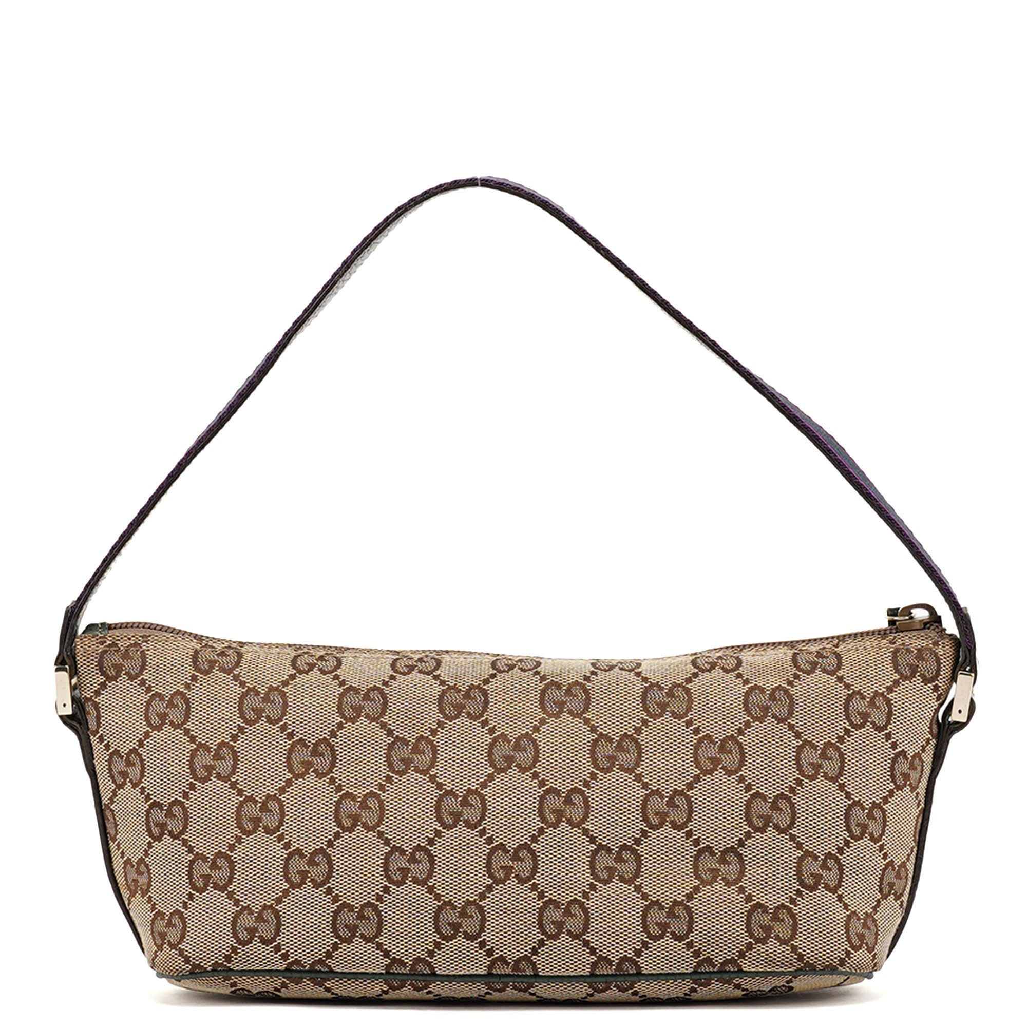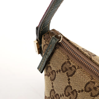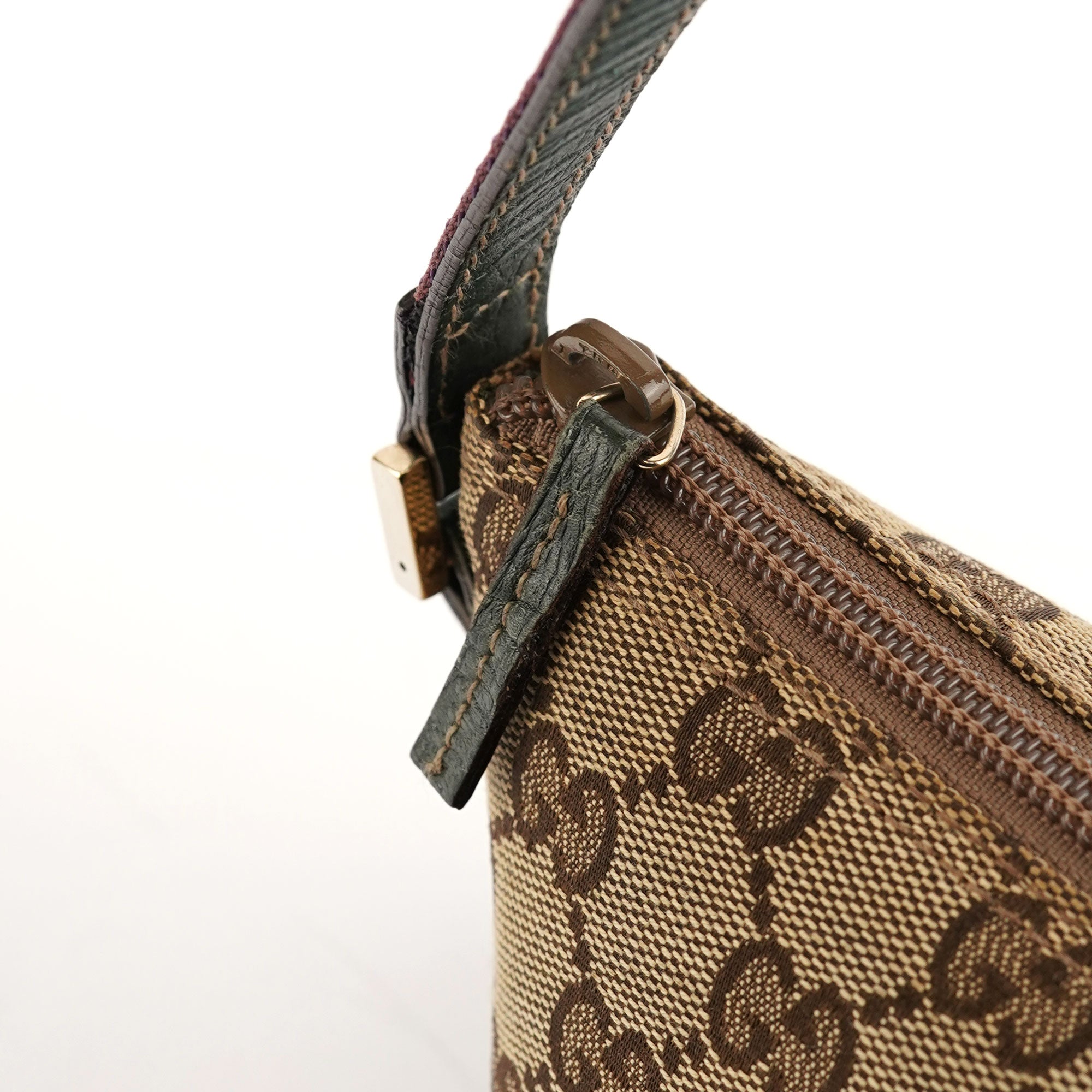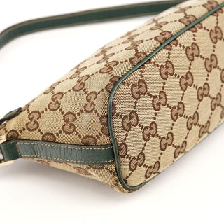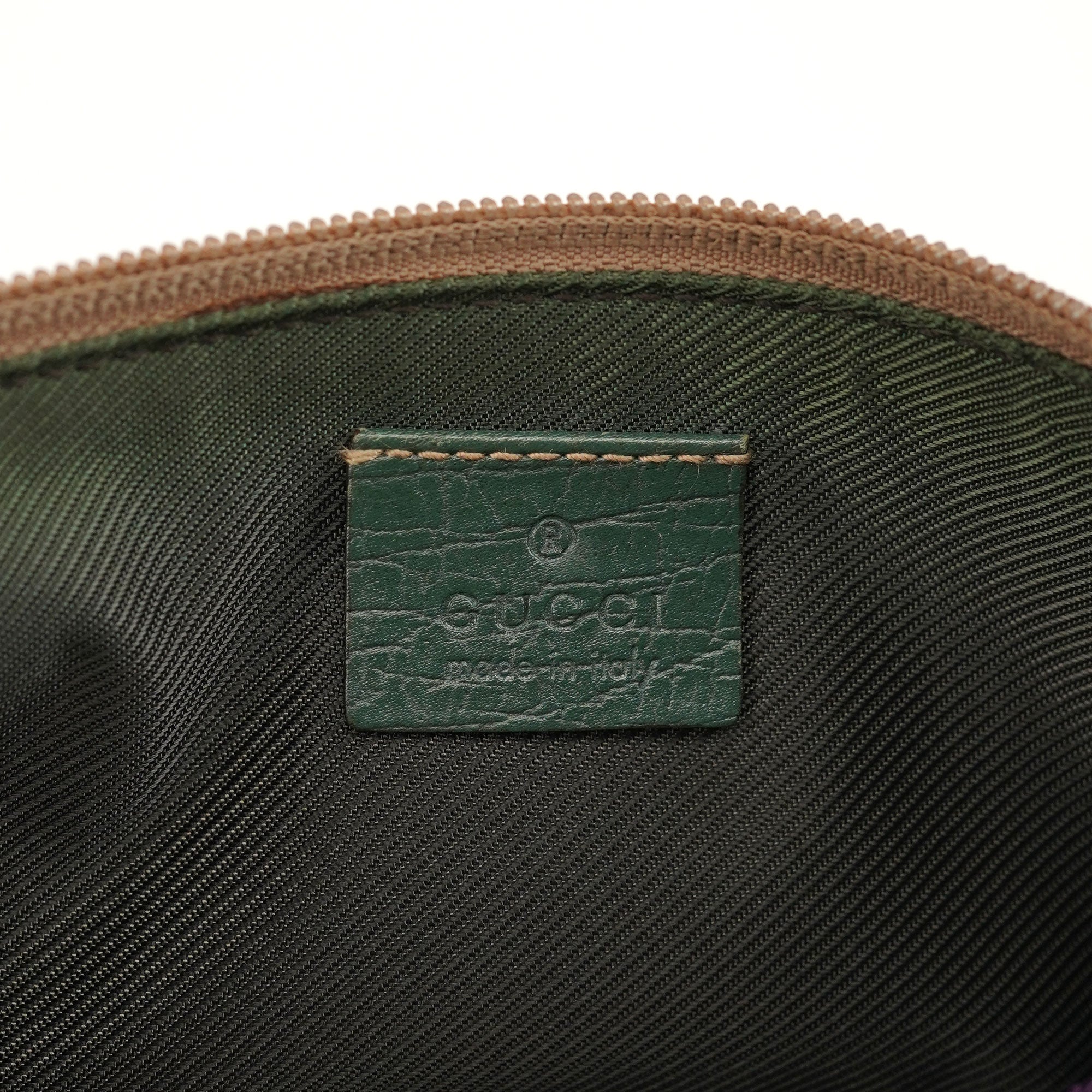 Explore timeless elegance with the Gucci GG Boat Pochette by Tom Ford, circa late 1990s. This exquisite piece combines beige GG canvas with green leather trim and silver-tone hardware. The handle is in cotton, showcasing the brand's colours green and purple. Its secure zip closure and satin-lined interior offers luxury and practicality, while the subtle Gucci plaque adds a touch of heritage.