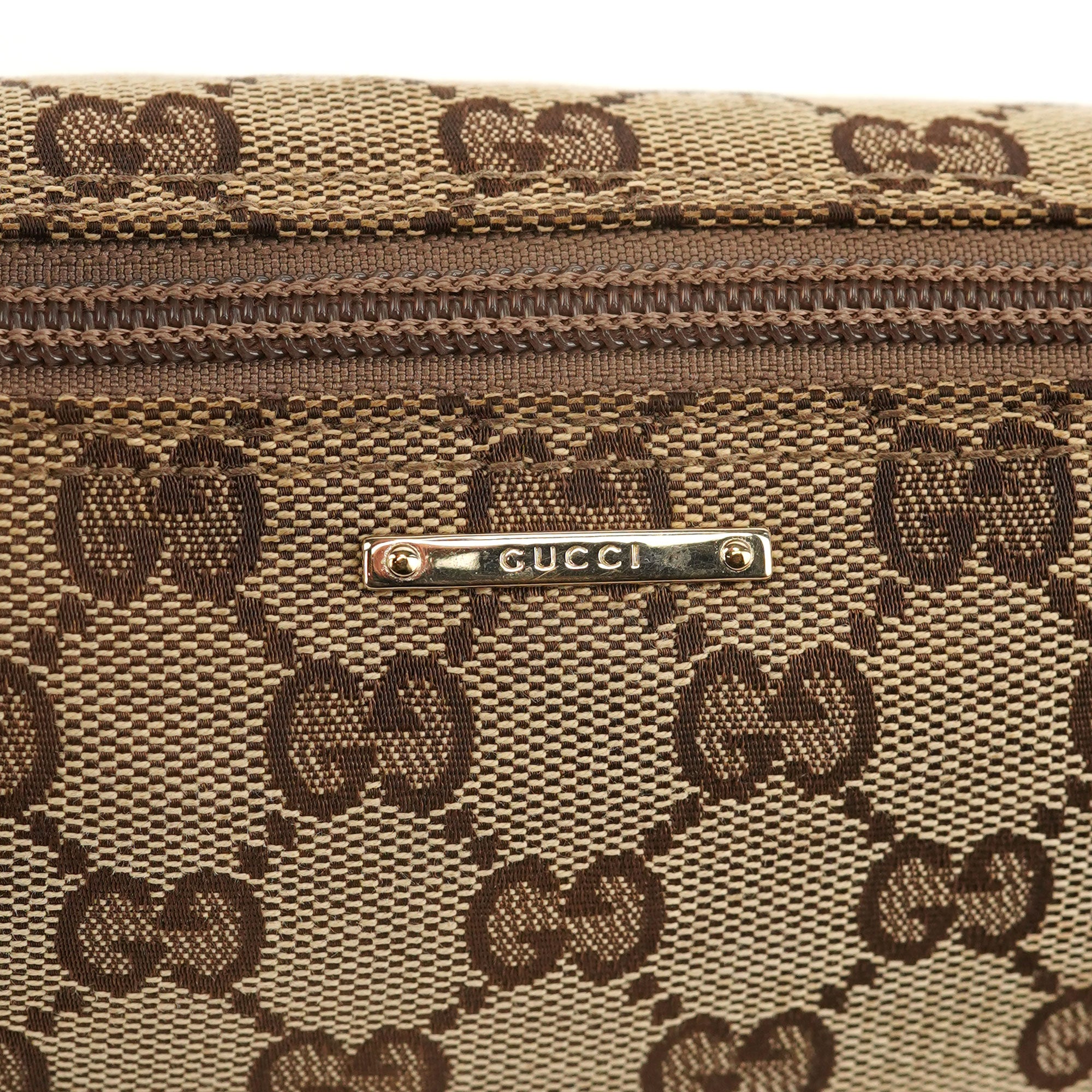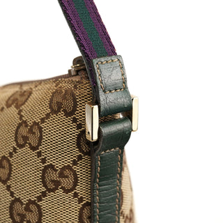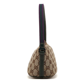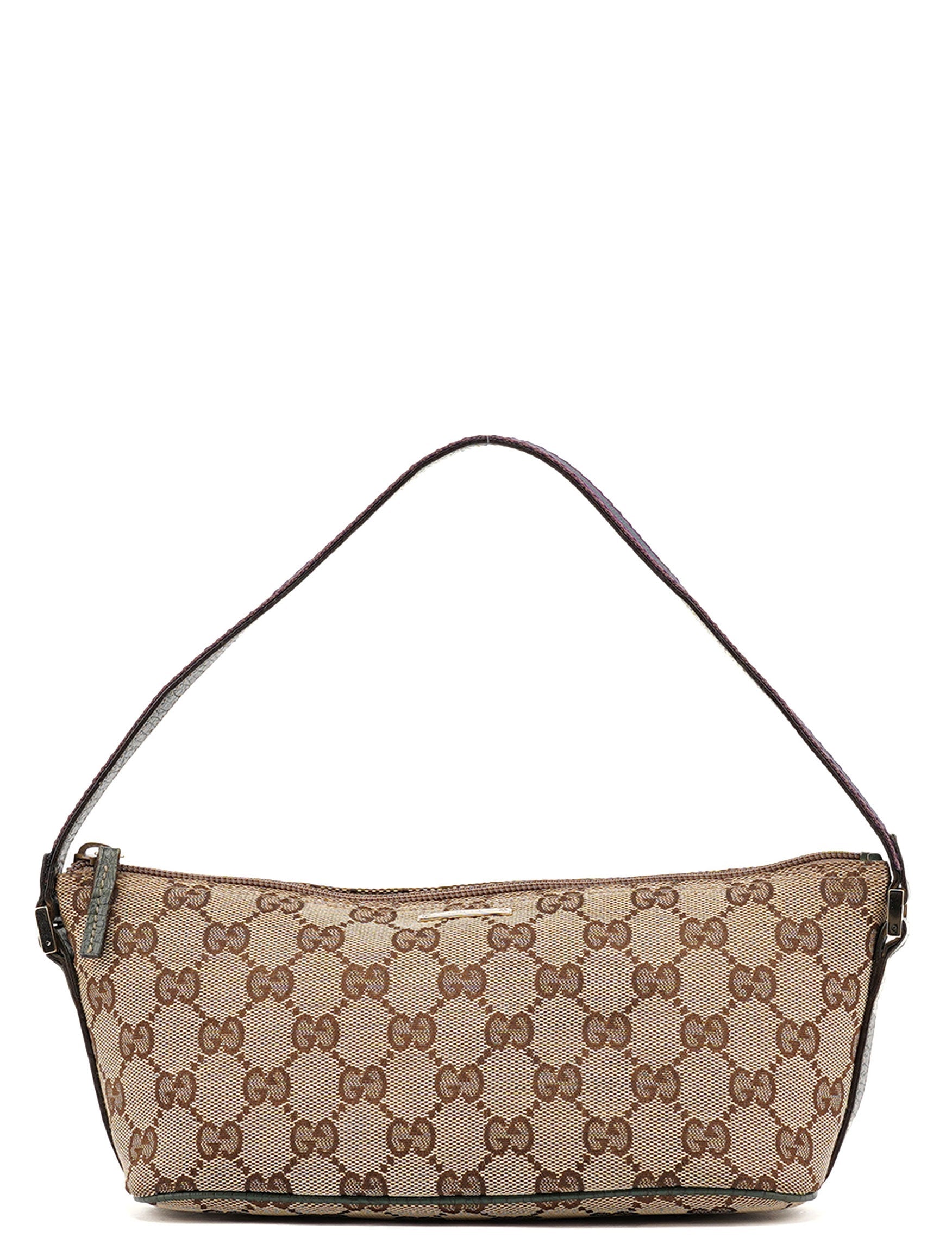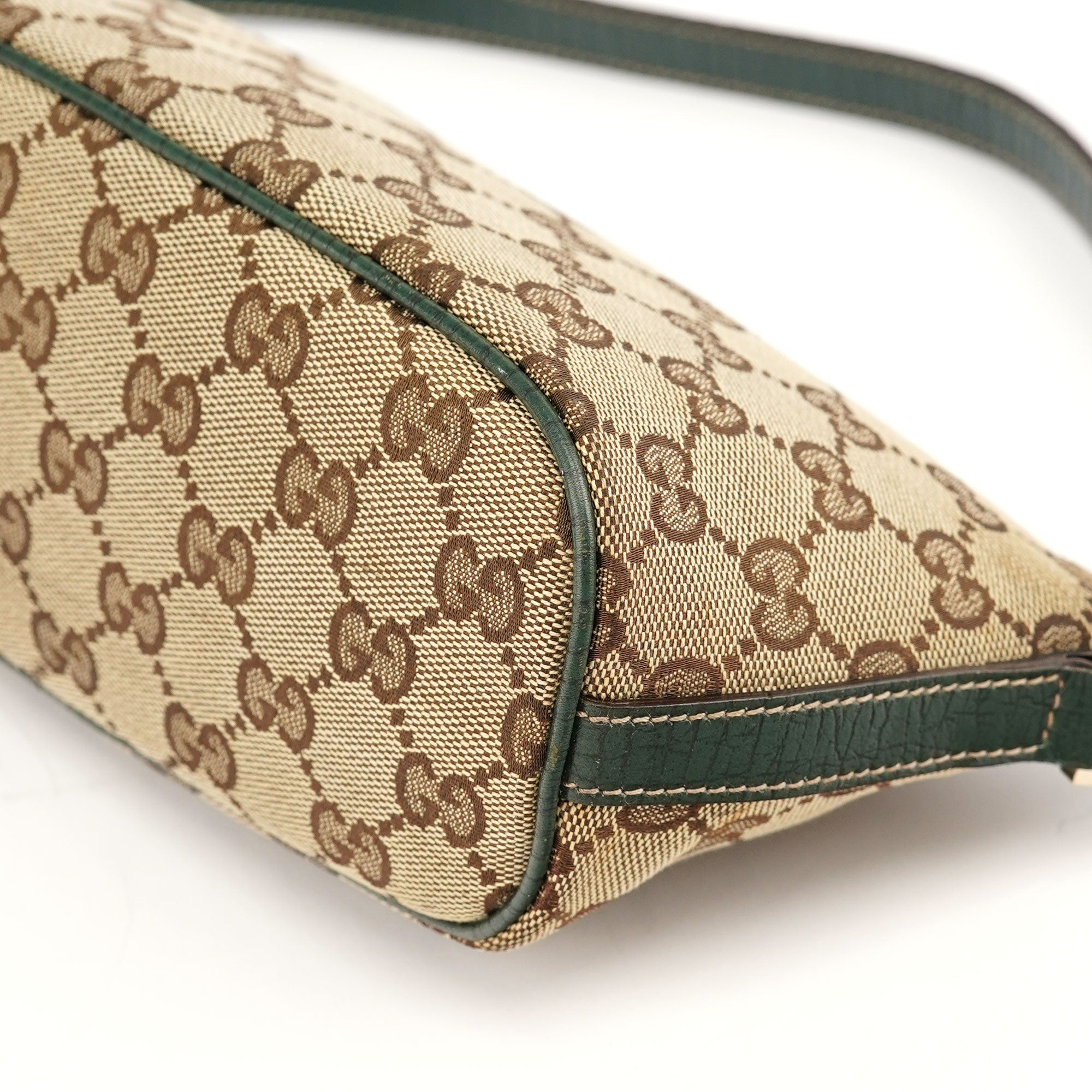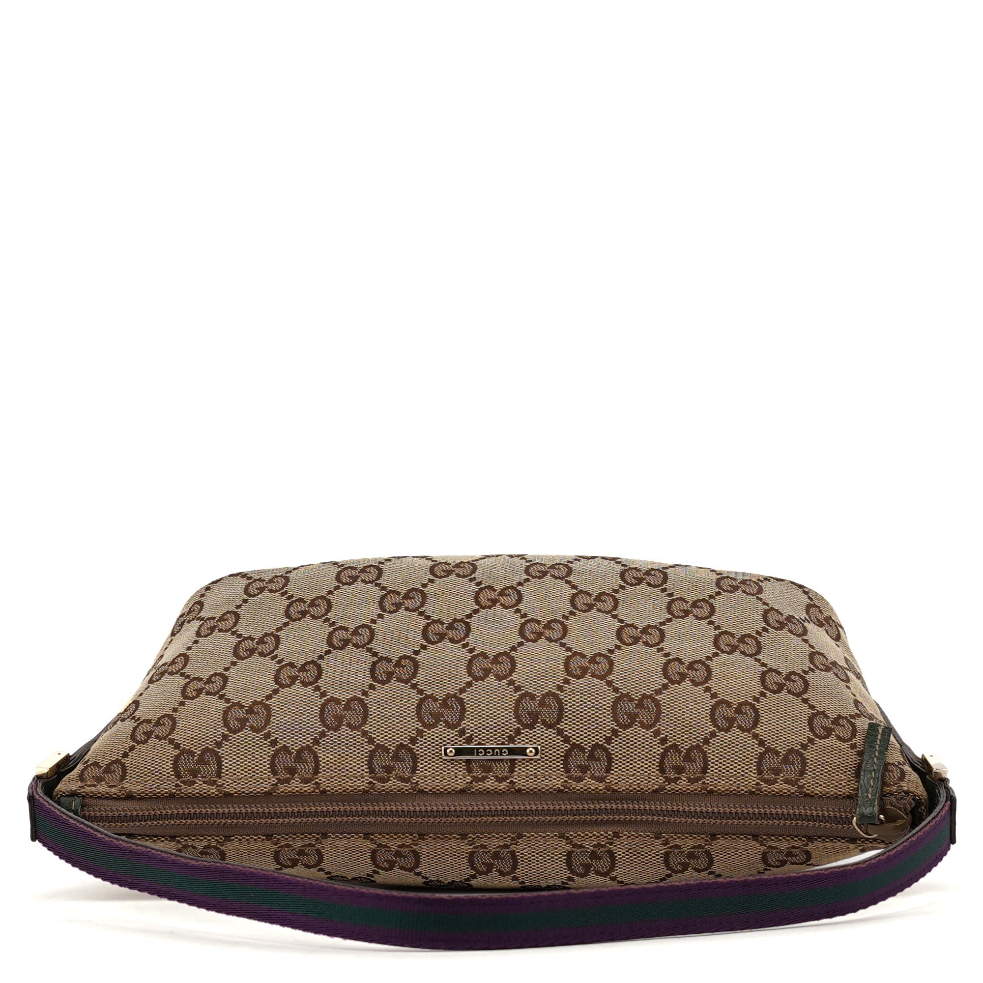 Explore timeless elegance with the Gucci GG Boat Pochette by Tom Ford, circa late 1990s. This exquisite piece combines beige GG canvas with green leather trim and silver-tone hardware. The handle is in cotton, showcasing the brand's colours green and purple. Its secure zip closure and satin-lined interior offers luxury and practicality, while the subtle Gucci plaque adds a touch of heritage.