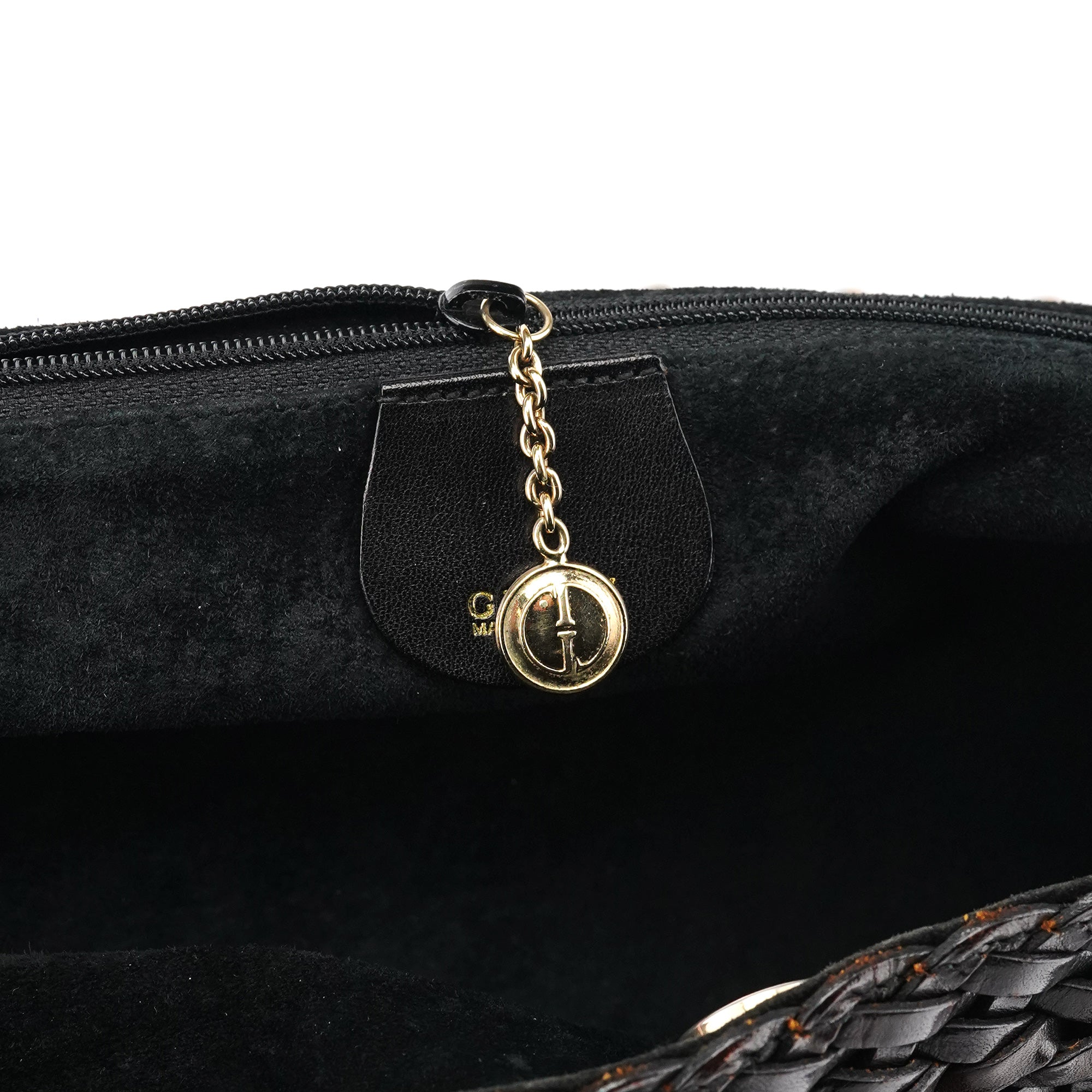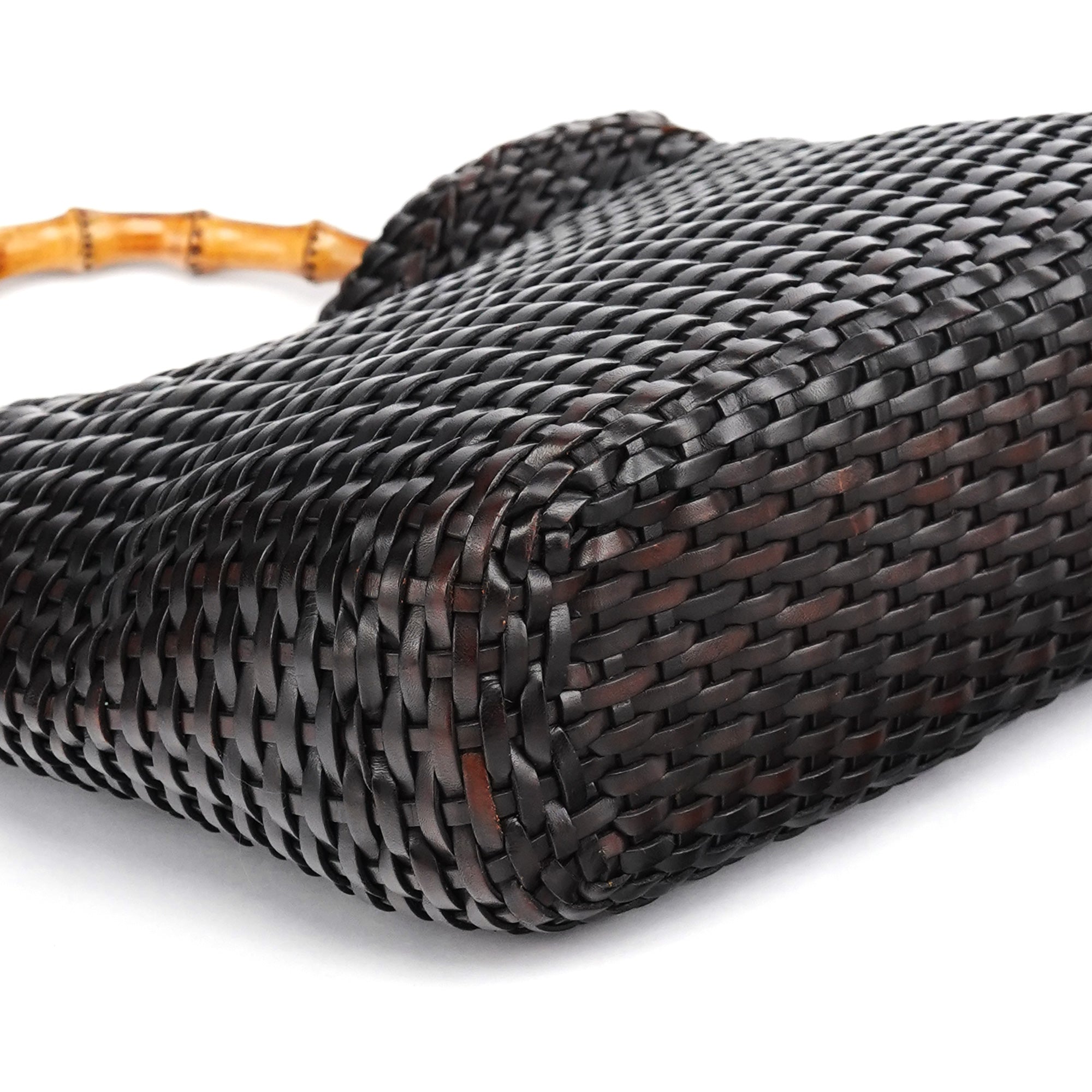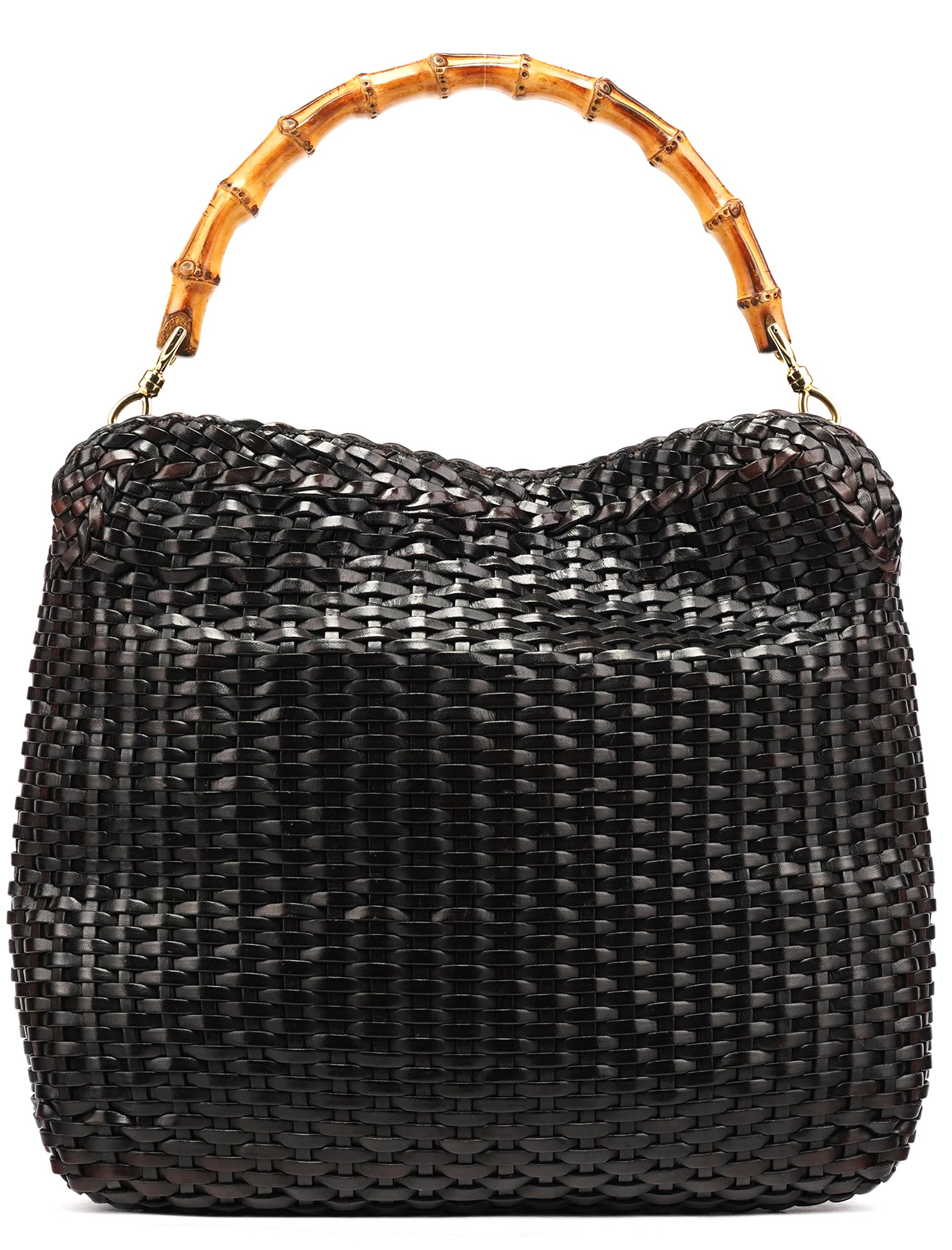 Designed in 1996 by Tom Ford, this Gucci Bamboo shoulder bag is crafted in black woven leather with the house’s signature curved bamboo top handle. The softly structured silhouette is finished with gold-tone ring attachments and a suede-lined interior with a zipped pocket.