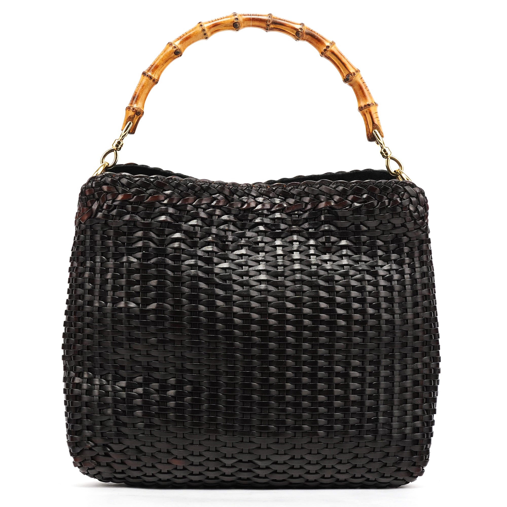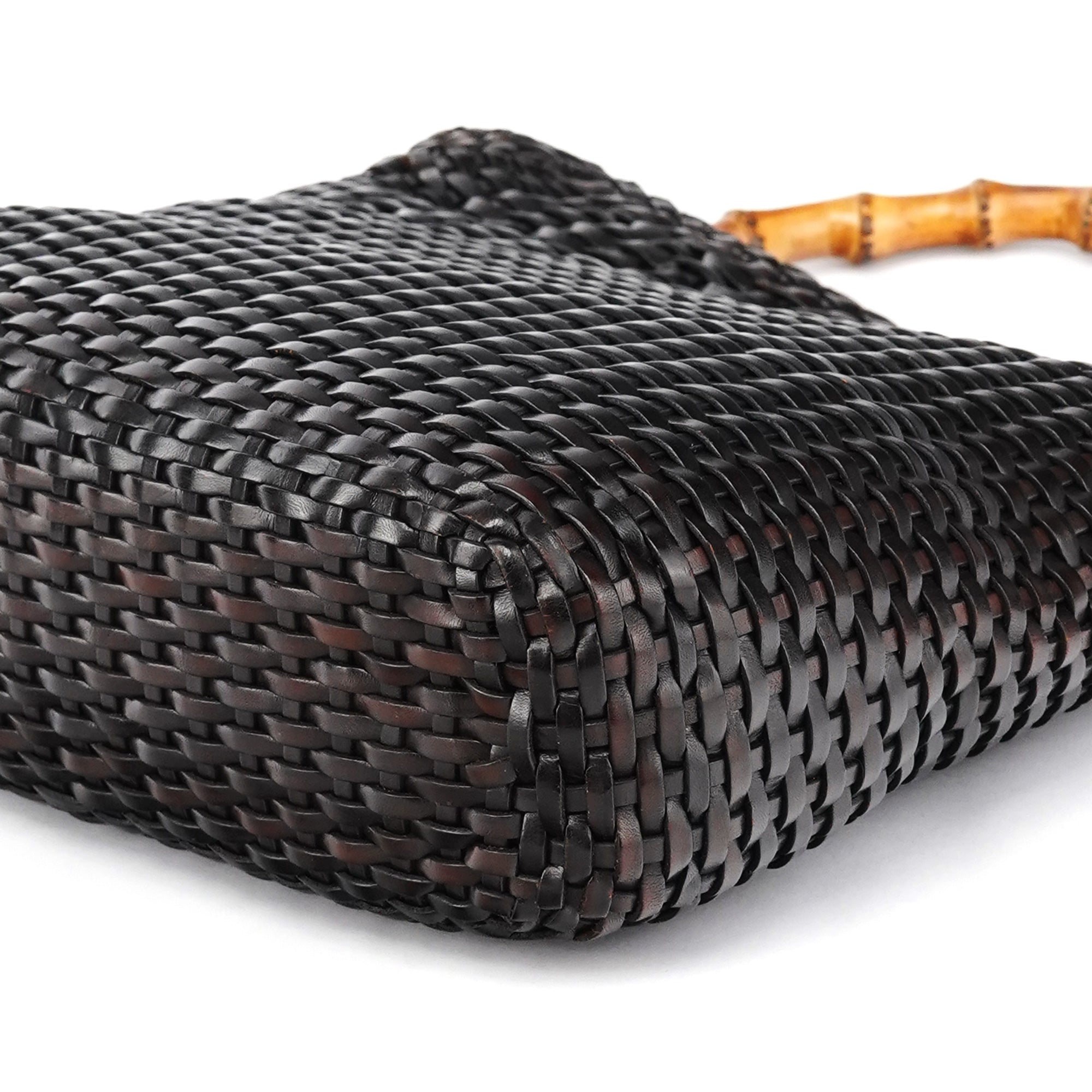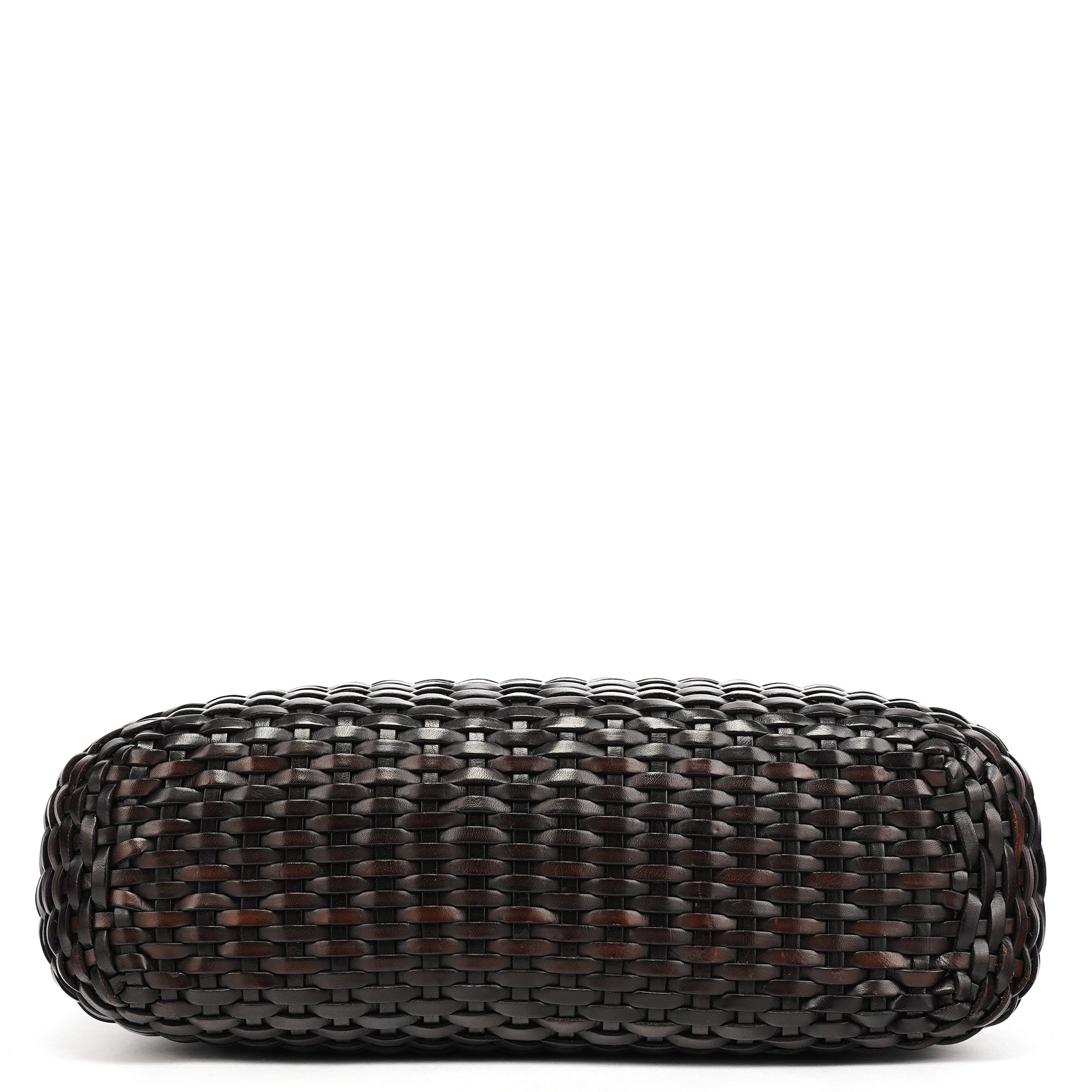 Designed in 1996 by Tom Ford, this Gucci Bamboo shoulder bag is crafted in black woven leather with the house’s signature curved bamboo top handle. The softly structured silhouette is finished with gold-tone ring attachments and a suede-lined interior with a zipped pocket.
